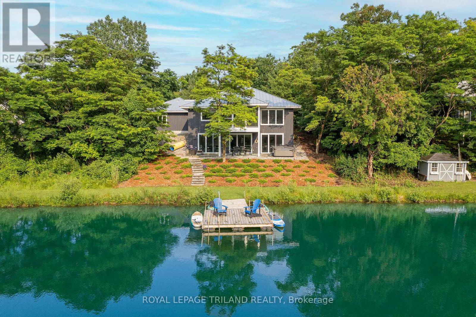 MUSKOKA IN GRAND BEND | WATERFRONT ON PRIVATE LAKE w/ SPECTACULAR VIEWS | FULLY FURNISHED TURNKEY PACAKAGE | STEPS TO SANDY BEACH ACCESS: Welcome to Wee Lake, Grand Bend's best kept secret featuring a crystal clear sparkling blue spring fed private lake for swimming, paddle boarding, fishing & kayaking + stellar skating & family hockey in the winter + access to the Ausable River for even better fishing! Fall in love with this young custom 4 bed/4bath walk-out bungalow, one of only 5 lakefront properties nestled into this secluded subdivision, which is a small & quiet single cul de sac community on the beachside of the HWY. With only 36 parcels total & lake access limited to Wee Lake residents (sharing 1/36 ownership of lake), this tranquil & peaceful naturally fed sparkling phenomenon is barely used. This stunning architecturally designed custom masterpiece fronts the lake w/ 134' of priceless linear water frontage. Providing exceptional main floor living framing-in nonstop lake views + a sprawling lower level walking out to your included hot tub & swimming/fishing dock just 50 ft from your poured concrete patio, this is a 10+! The layout is brilliant, w/ soaring main level ceilings inc. an impressive 20+ ft vault & 10 ft ceilings throughout rest of main, a stellar master suite w/ ensuite/walk-in, laundry w/ sink + 2nd laundry in lower, 2 more main level bedrooms (one w/ a 1/2 bath ensuite/ ideal for home office), 2 sunrooms (guest sleepers), 2 gas fireplaces, lower level walk-out w/ bed & full bath + wall to wall windows - simply perfect. Imagine sipping your morning coffee while the kids or grandkids swim off your private dock w/ the dogs enjoying their fenced in yard / dog run. As an ideal family get away, short term rental money maker, or principal residence in the booming beach town of Grand Bend, this is a winner, just to steps to one of our most secluded area beach access points, the Pinedale Rd beach path. Turnkey package including furniture & appliances! (id:51300)