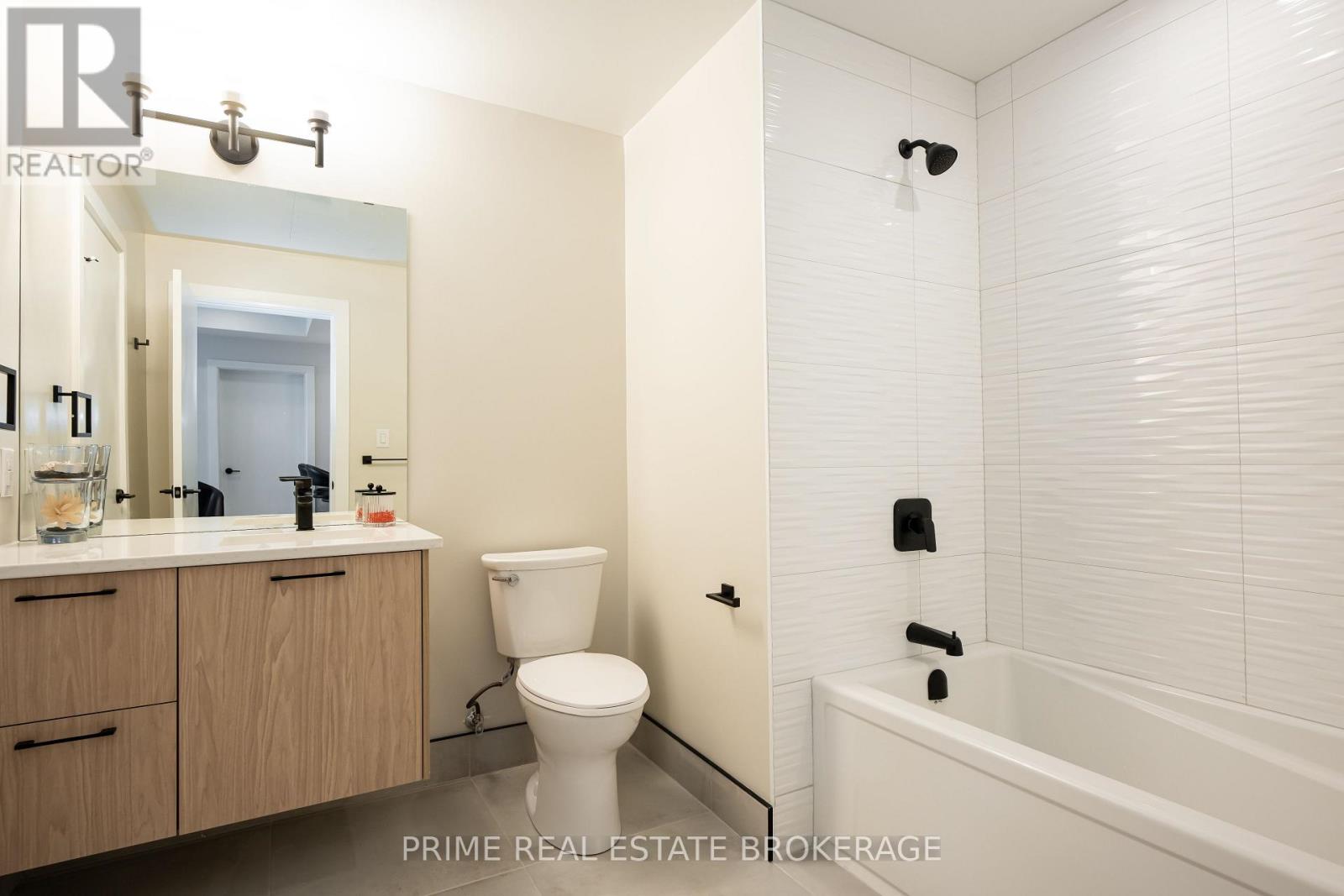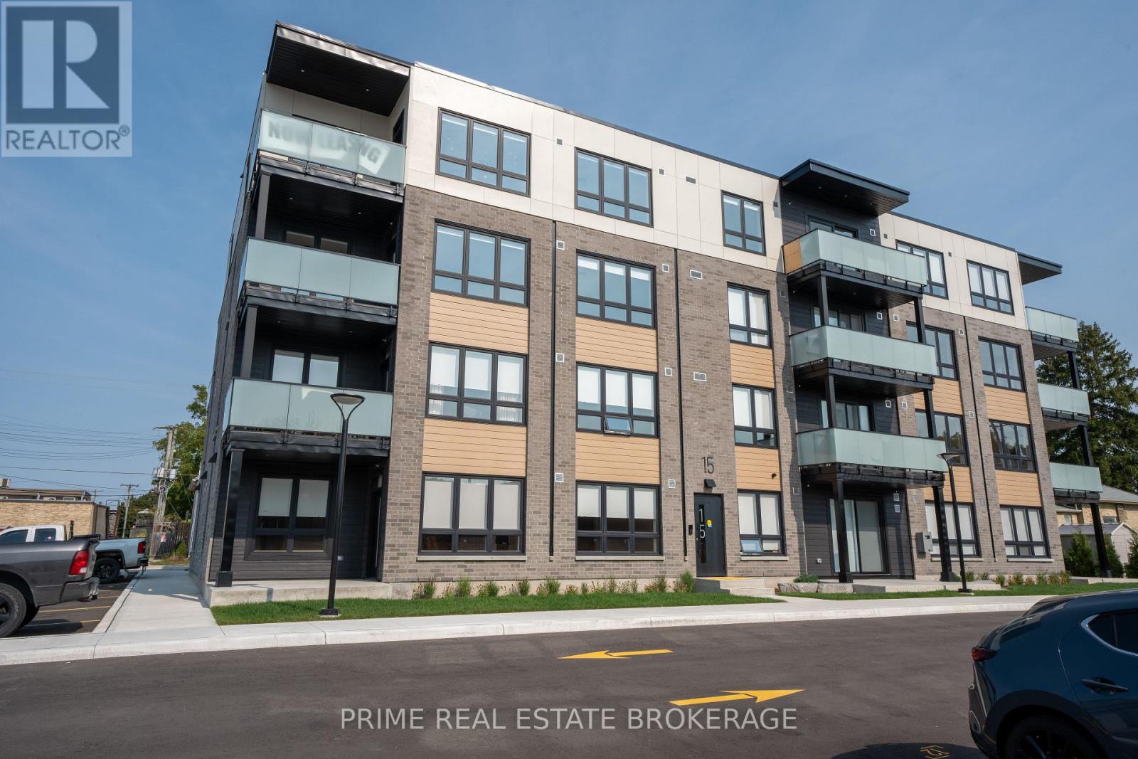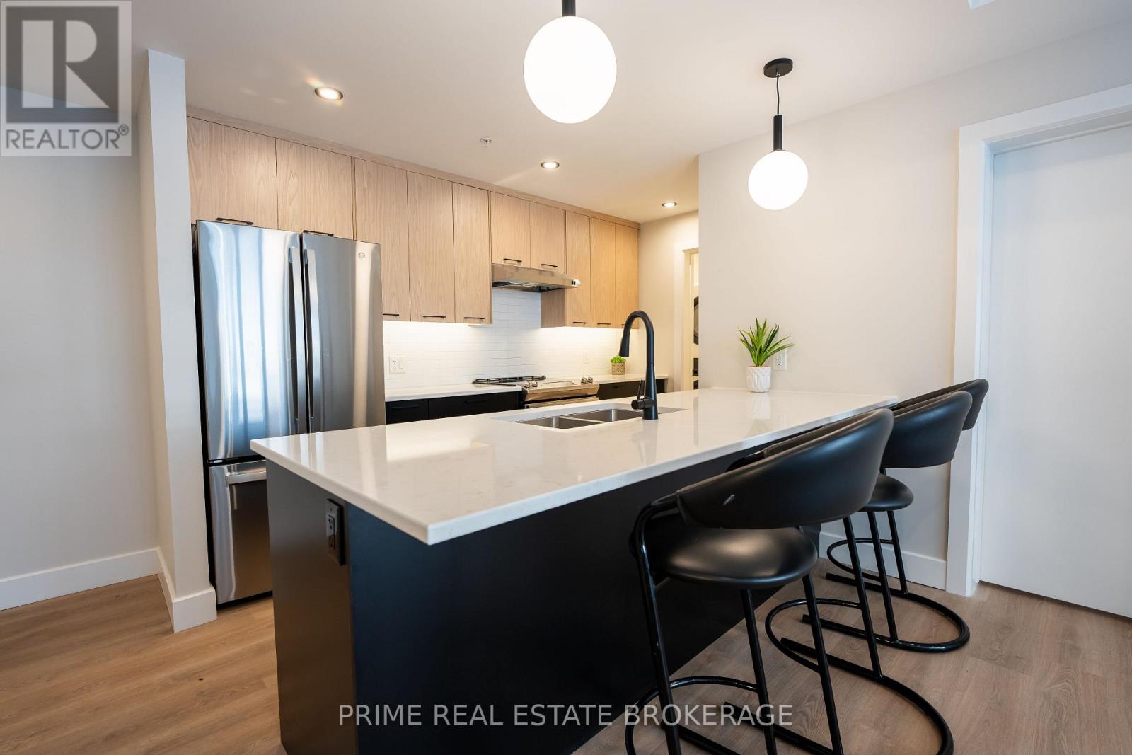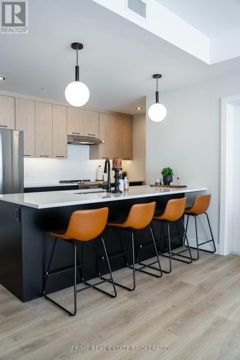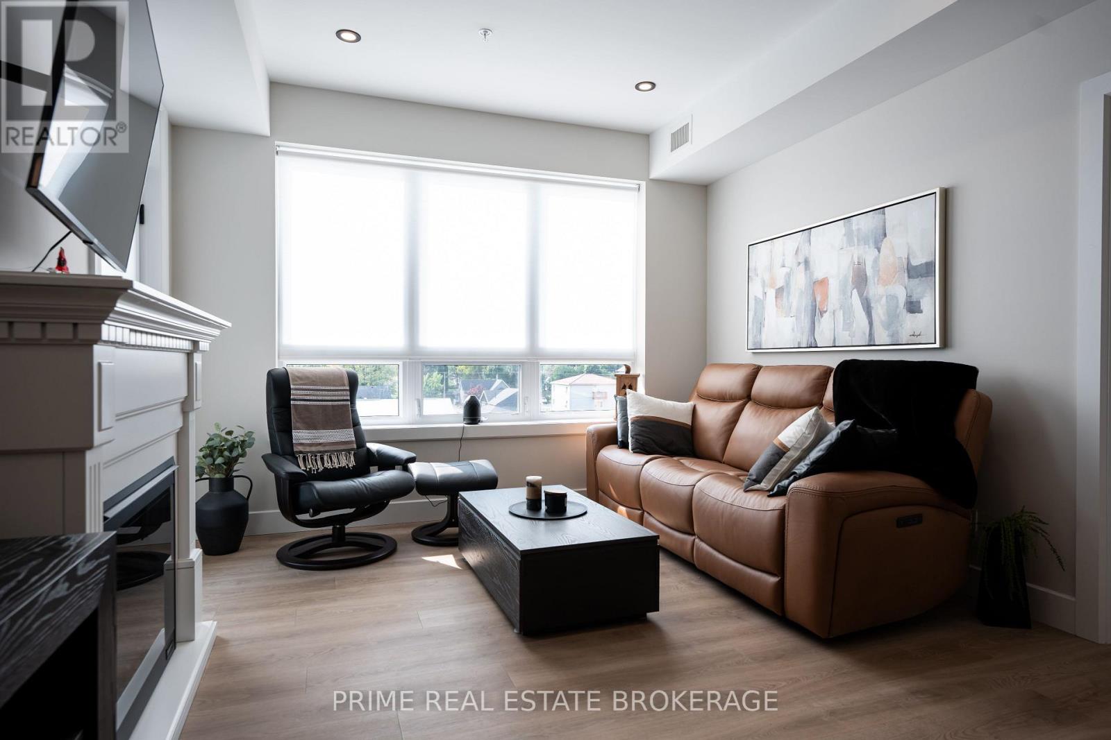 Available January 1, 2026! This barrier-free, 2 bedroom main floor suite at James Street Commons is an aesthetically pleasing, well-designed property located just one block from the vibrant MainStreet core with shopping, dining and the hospital nearby, and a quick 35 minute commute to London or Stratford. Conveniently located yet situated on a quiet residential street with 24/7 secure access, the interior boasts luxurious finishes, oversized windows and 9 foot ceiling that provide for an elegant, yet bright and comfortable space to call home. The stylish open concept kitchen/dining area features stainless steel appliances, quartz countertops, two-tone cabinetry, subway tile backsplash, and an island. An in-suite laundry room is a bonus, while a large primary bedroom with a spacious walk-in closet, and a second bedroom share a 3 pc washroom with a tiled shower. A private covered patio is perfect for relaxing during the warmer months. (id:51300)