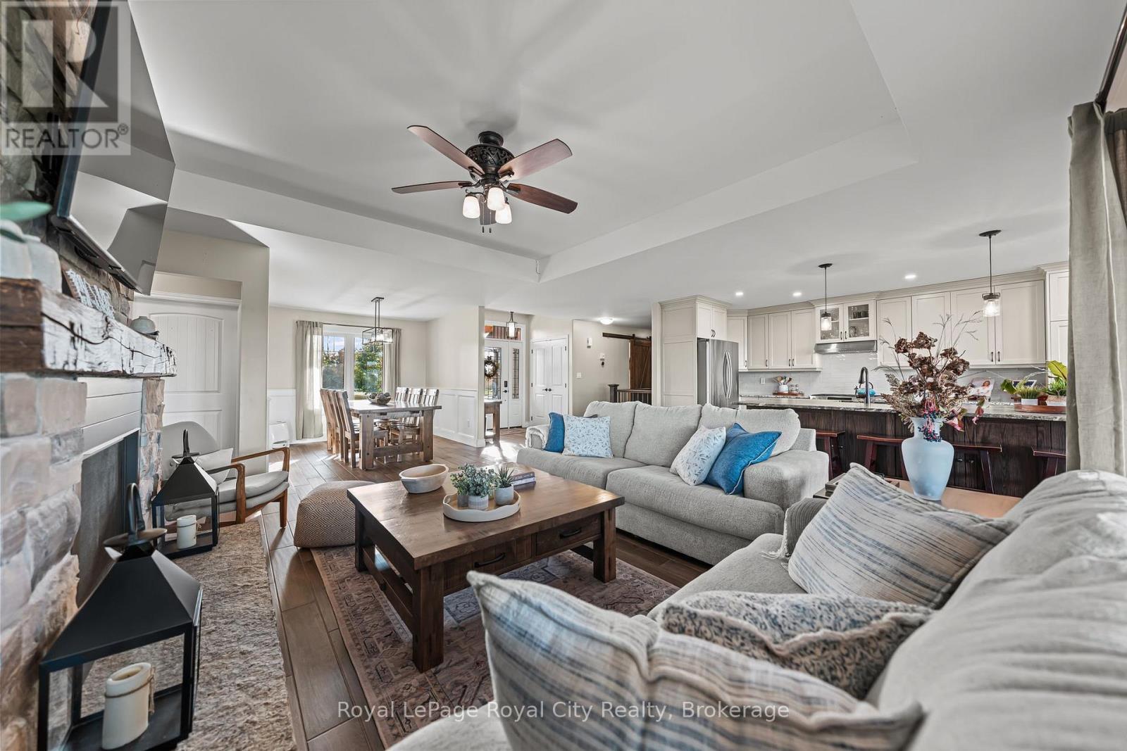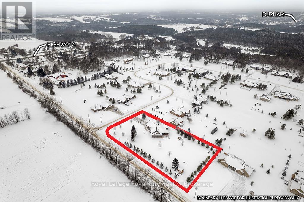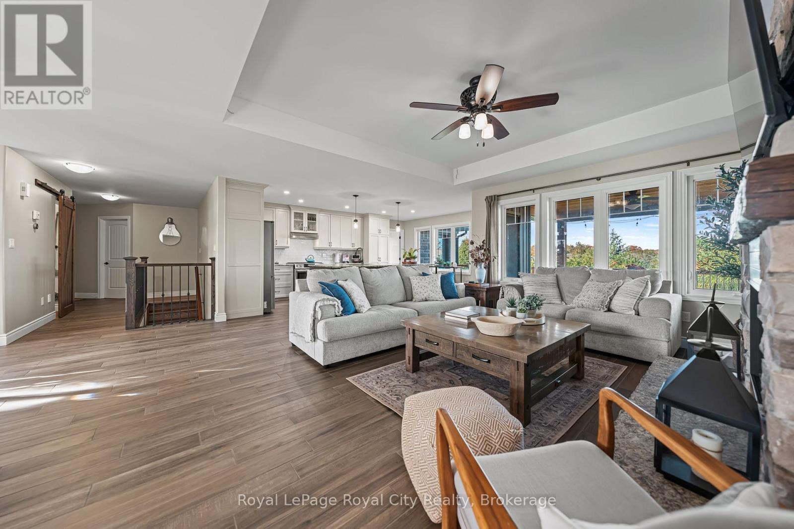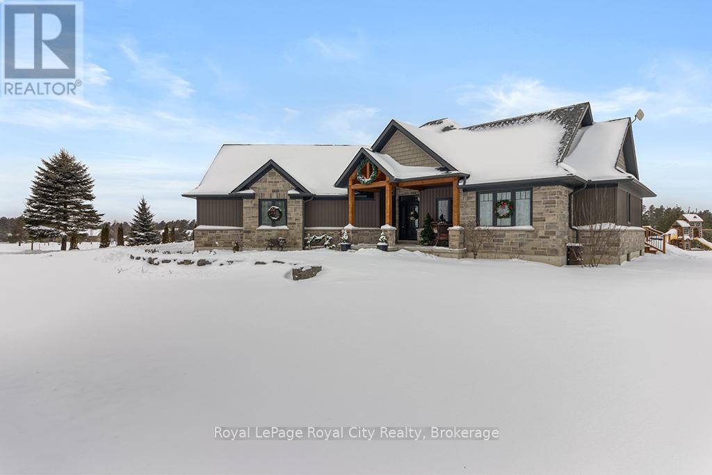 Rustic Lodge Charm Meets Modern Living. Welcome to this striking custom-built bungalow, set on a picturesque 1.15-acre lot in the sought-after Marshall Heights subdivision, where peaceful country living blends seamlessly with a welcoming sense of community. Timber beams frame the inviting front porch and lead into a spacious foyer, setting the tone for a home designed for both everyday comfort and effortless entertaining. The great room is the heart of the home, anchored by a spectacular stone fireplace that creates the perfect backdrop for cozy evenings and memorable gatherings. The chef-inspired kitchen is a true showpiece, featuring an oversized island, beautifully crafted cabinetry and thoughtful details that make everything from casual breakfasts to holiday hosting a joy. Entertain with ease in the formal dining room or take the celebration outdoors to the expansive deck, complete with a partially covered area ideal for dining, relaxing, or watching sporting events. The private primary suite is tucked into its own wing offering a walk-in closet, spa-like ensuite and direct access to the deck. Two additional bedrooms and a full bath are thoughtfully placed in the opposite wing, providing comfort and privacy for family or guests. Practicality meets style with a powder room, main-floor laundry, and an oversized double garage with inside entry. The fully finished lower level expands your living space with three more generous bedrooms, a family room, full bathroom, ample storage and a cold cellar. Outside, the expansive beautifully landscaped yard offers endless possibilities. A large shed, RV/boat parking and plenty of room for a pool or future workshop make it ideal for hobbyists and outdoor enthusiasts alike. Perfectly located between Durham and Mount Forest, you'll enjoy easy access to year-round recreation including hiking, ATVing, skiing, and snowmobiling, all just minutes away. This is more than a home, iIt's the lifestyle you've been dreaming of. (id:51300)
