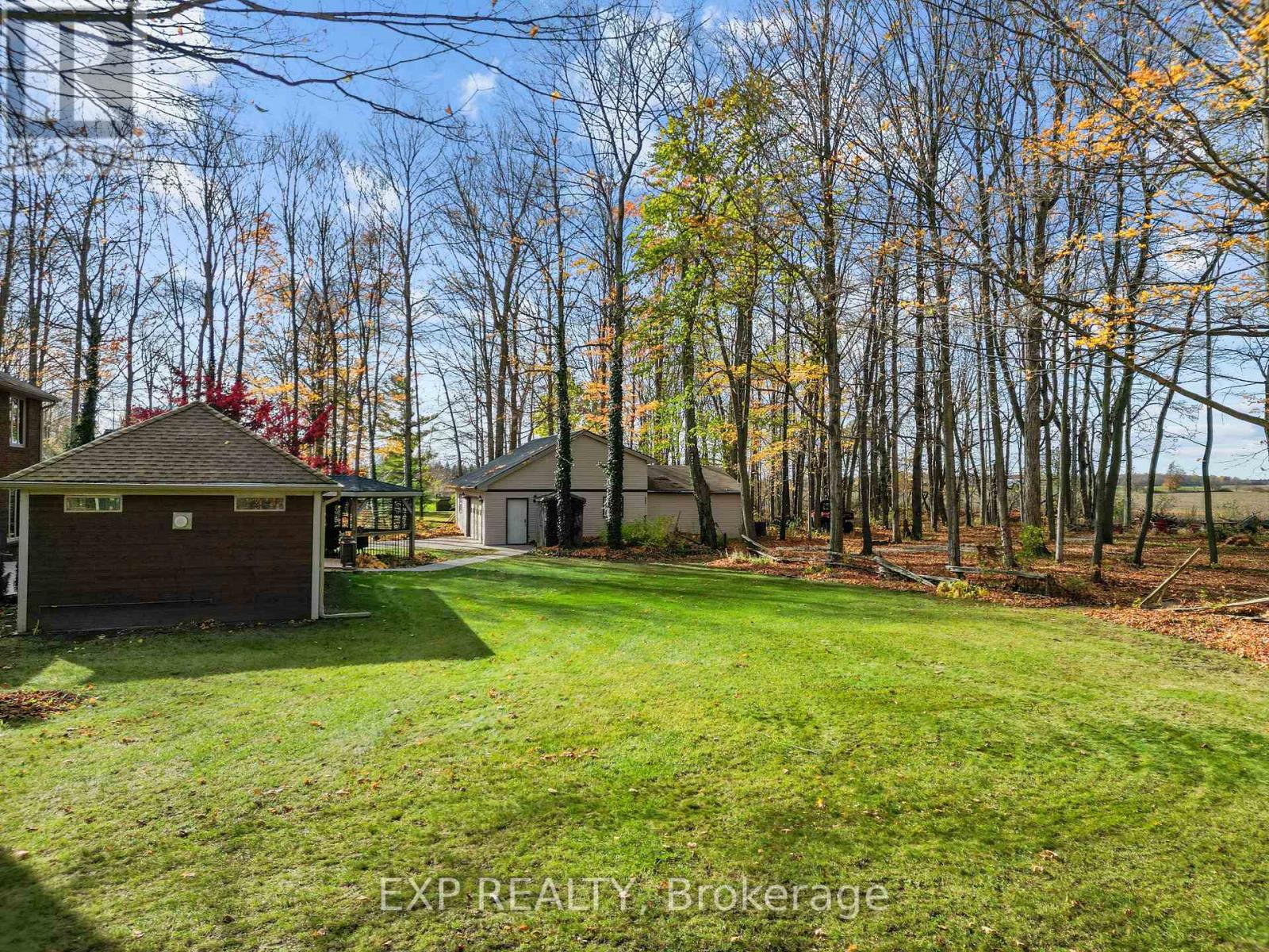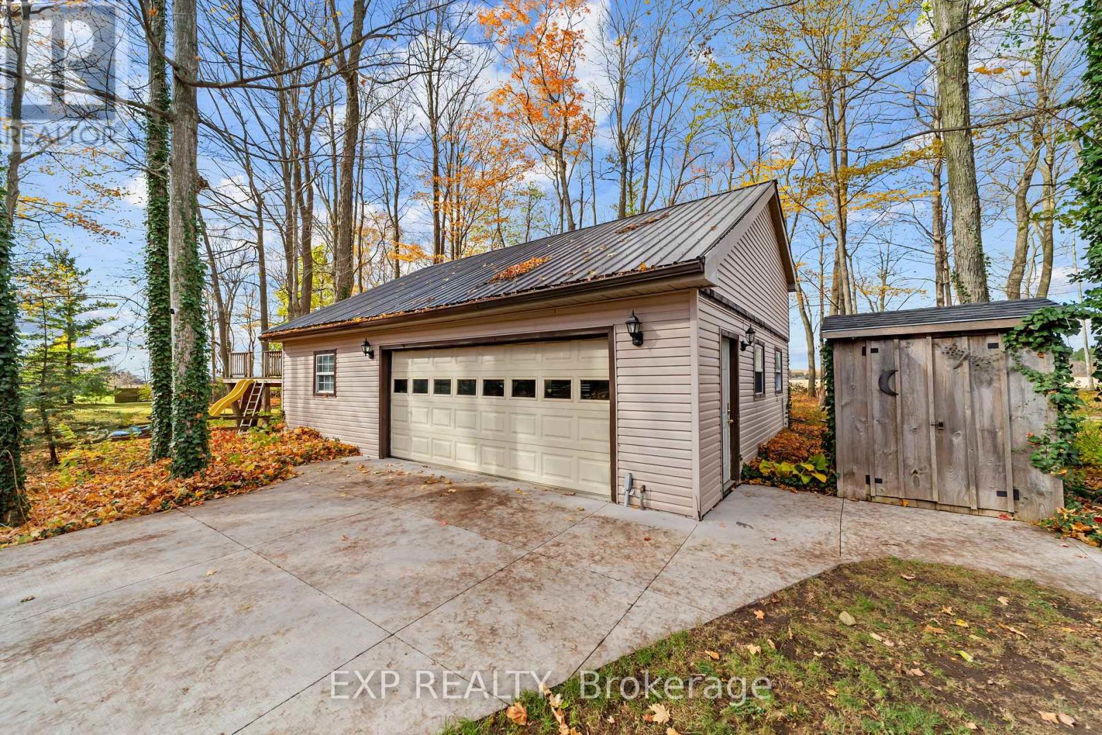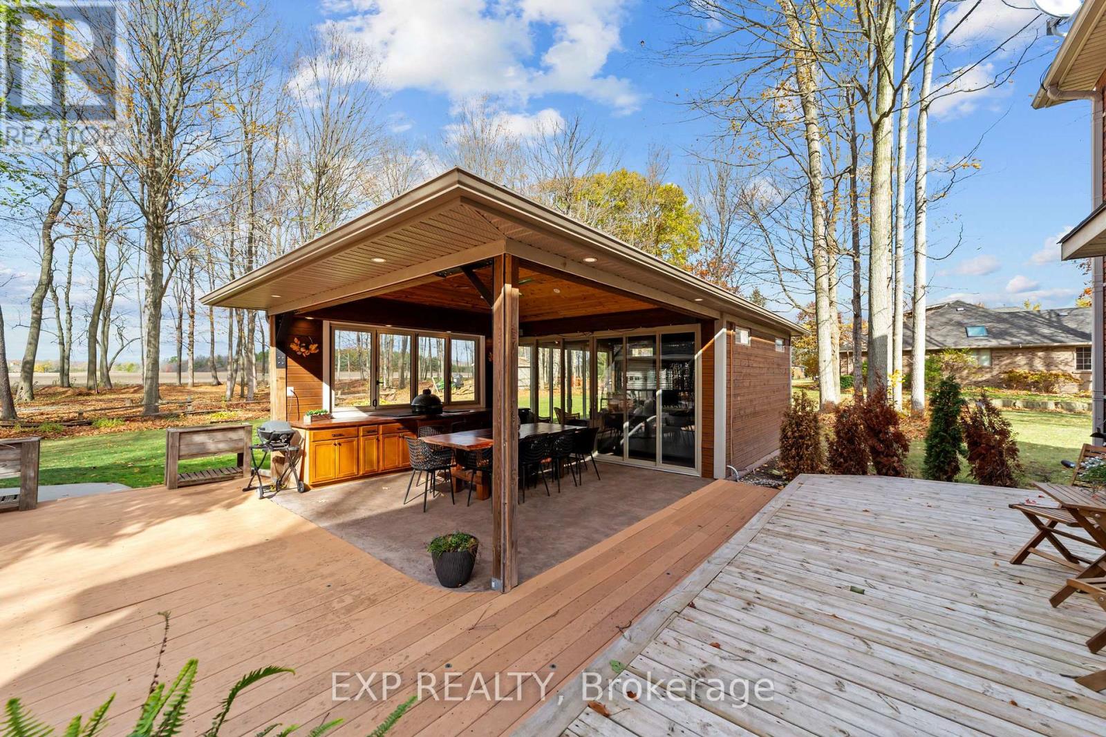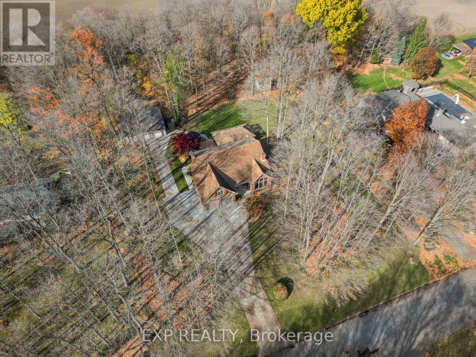 Set on a sprawling private 1.3-acre lot in Ilderton's coveted Coldstream community, this property stands out for its incredible detached shop and resort-style outdoor living. The 26x33 workshop with an additional 24x24 rear bay features a loft with vaulted ceilings designed for a car lift (included), 100-amp service, natural gas furnace, and high-speed internet-ideal for hobbyists, entrepreneurs, or car enthusiasts. Just steps away, the backyard transforms into an entertainer's paradise: a semi-enclosed hot tub area off the back door leads to a covered outdoor kitchen complete with a built-in Big Green Egg set into a custom wood countertop. A fully enclosed area with sliding glass doors, cedar walls, and stamped concrete floors provides the perfect four-season hangout for family and friends. Surrounded by mature trees and backing onto farmland, this home blends the serenity of country life with the convenience of being minutes from London and the 402. Inside you'll find granite counters in the kitchen with a built-in wall oven, and a spacious open-concept living room with a fireplace and built-ins. The main floor also offers a stunning dining room with two-story ceilings, a fireplace, and custom stained-glass doors that match the grand front entry. The second level features a loft-style den, large primary with ensuite, and two additional bedrooms. The lower level is fully finished with a walk-up entrance, games room, and secondary living area. The long concrete drive is perfect for larger families-space, privacy, and lifestyle all in one. (id:51300)