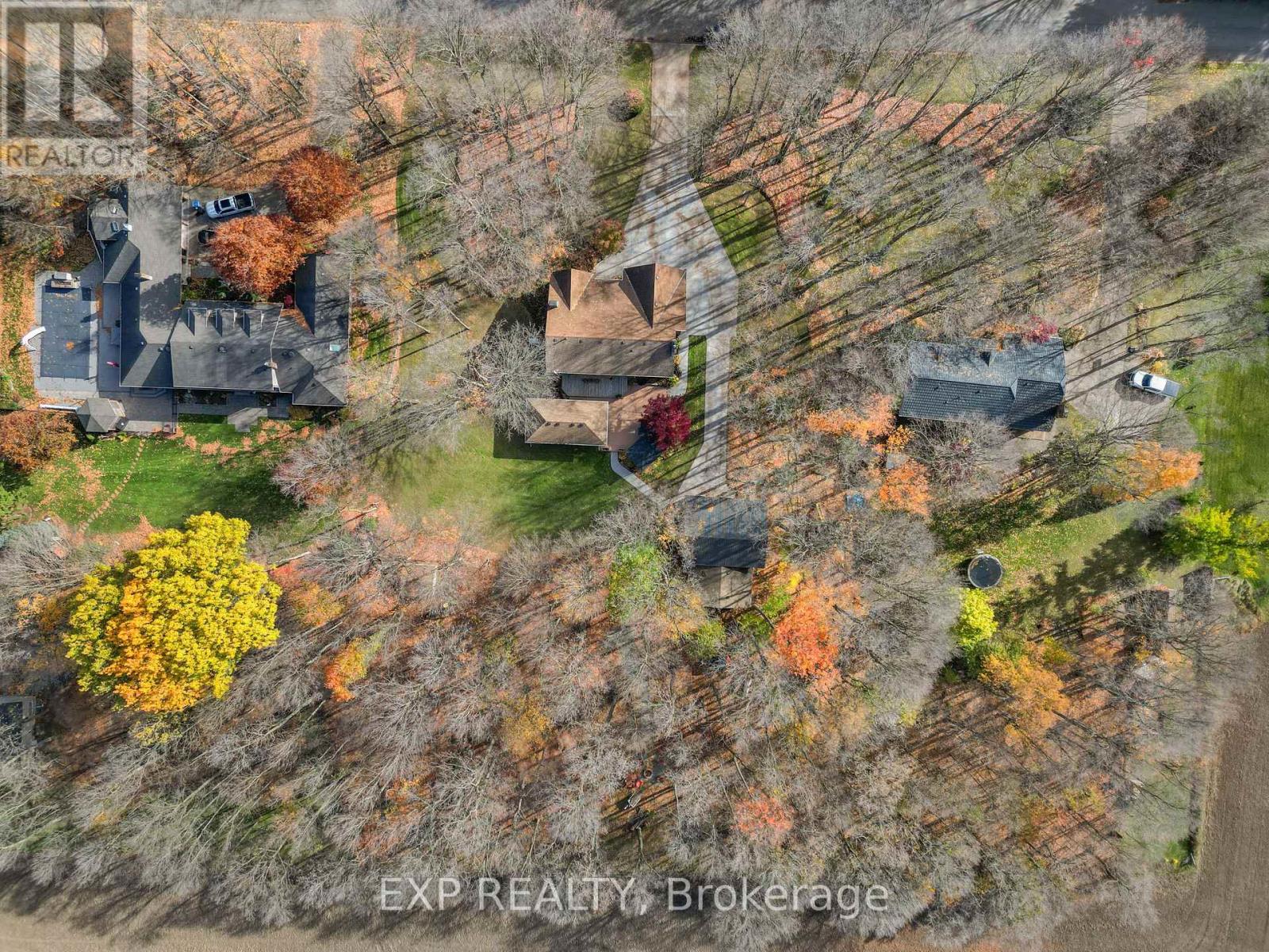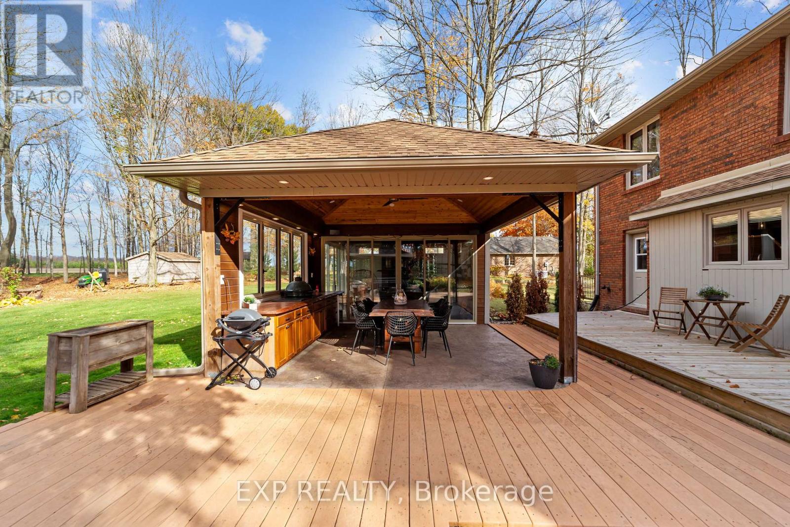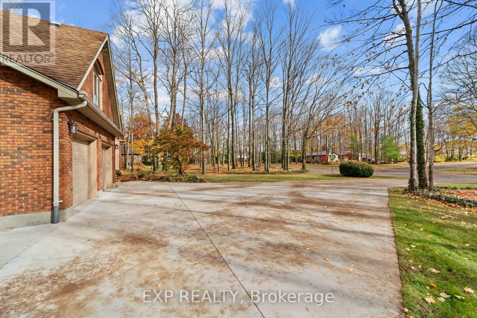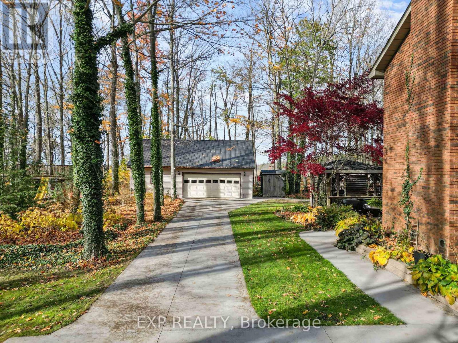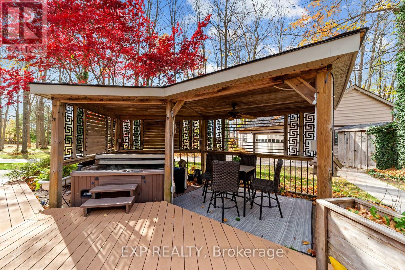 Set on a sprawling private 1.3-acre lot in Ilderton's coveted Coldstream community, this property stands out for its incredible detached shop and resort-style outdoor living. The 26x33 workshop with an additional 24x24 rear bay features a loft with vaulted ceilings designed for a car lift (included), 100-amp service, natural gas furnace, and high-speed internet-ideal for hobbyists, entrepreneurs, or car enthusiasts. Just steps away, the backyard transforms into an entertainer's paradise: a semi-enclosed hot tub area off the back door leads to a covered outdoor kitchen complete with a built-in Big Green Egg set into a custom wood countertop. A fully enclosed area with sliding glass doors, cedar walls, and stamped concrete floors provides the perfect four-season hangout for family and friends. Surrounded by mature trees and backing onto farmland, this home blends the serenity of country life with the convenience of being minutes from London and the 402. Inside you'll find granite counters in the kitchen with a built-in wall oven, and a spacious open-concept living room with a fireplace and built-ins. The main floor also offers a stunning dining room with two-story ceilings, a fireplace, and custom stained-glass doors that match the grand front entry. The second level features a loft-style den, large primary with ensuite, and two additional bedrooms. The lower level is fully finished with a walk-up entrance, games room, and secondary living area. The long concrete drive is perfect for larger families-space, privacy, and lifestyle all in one. (id:51300)