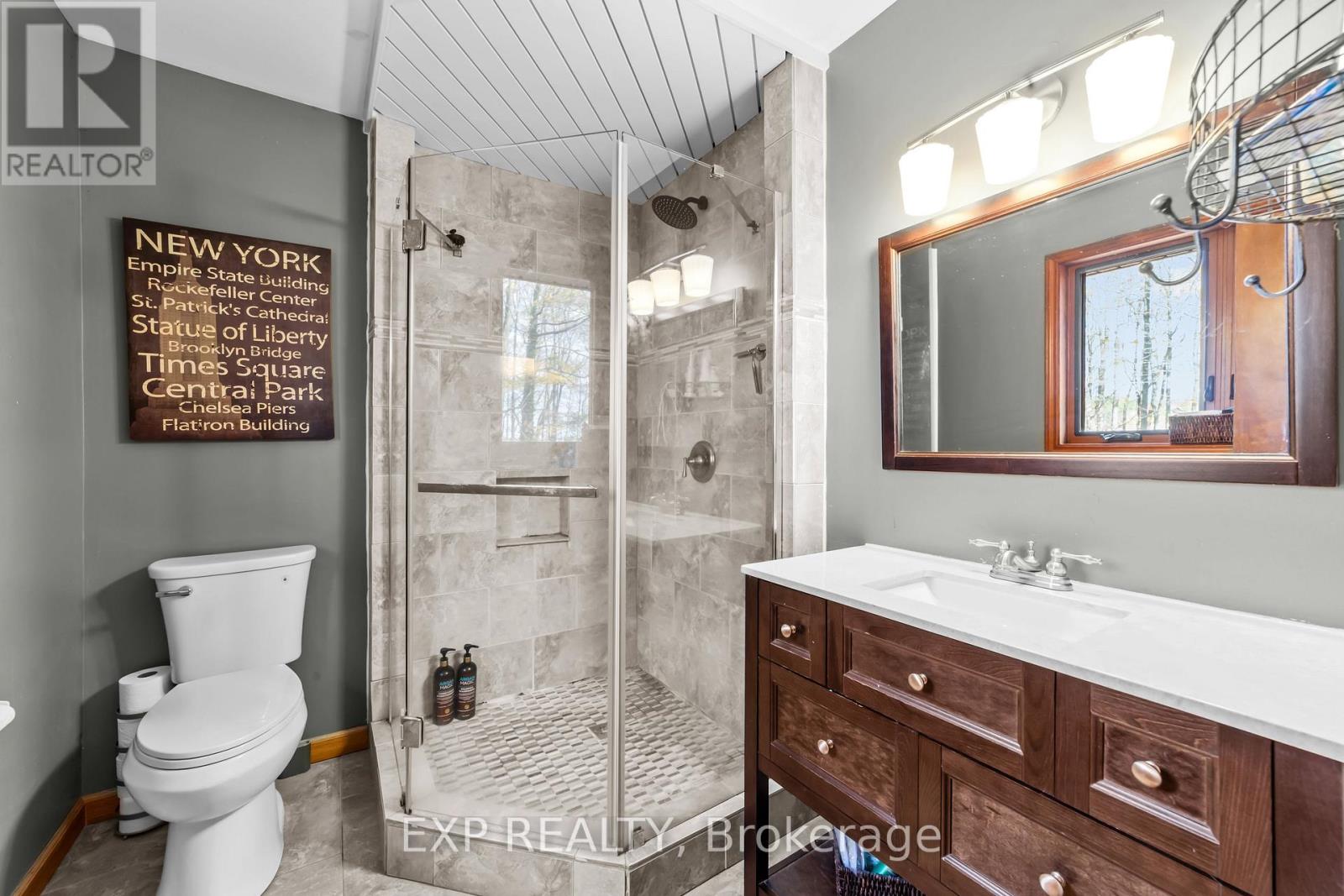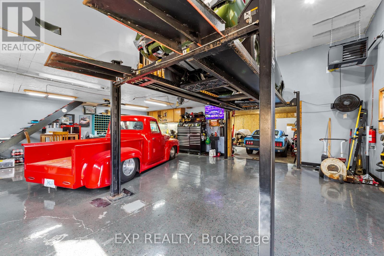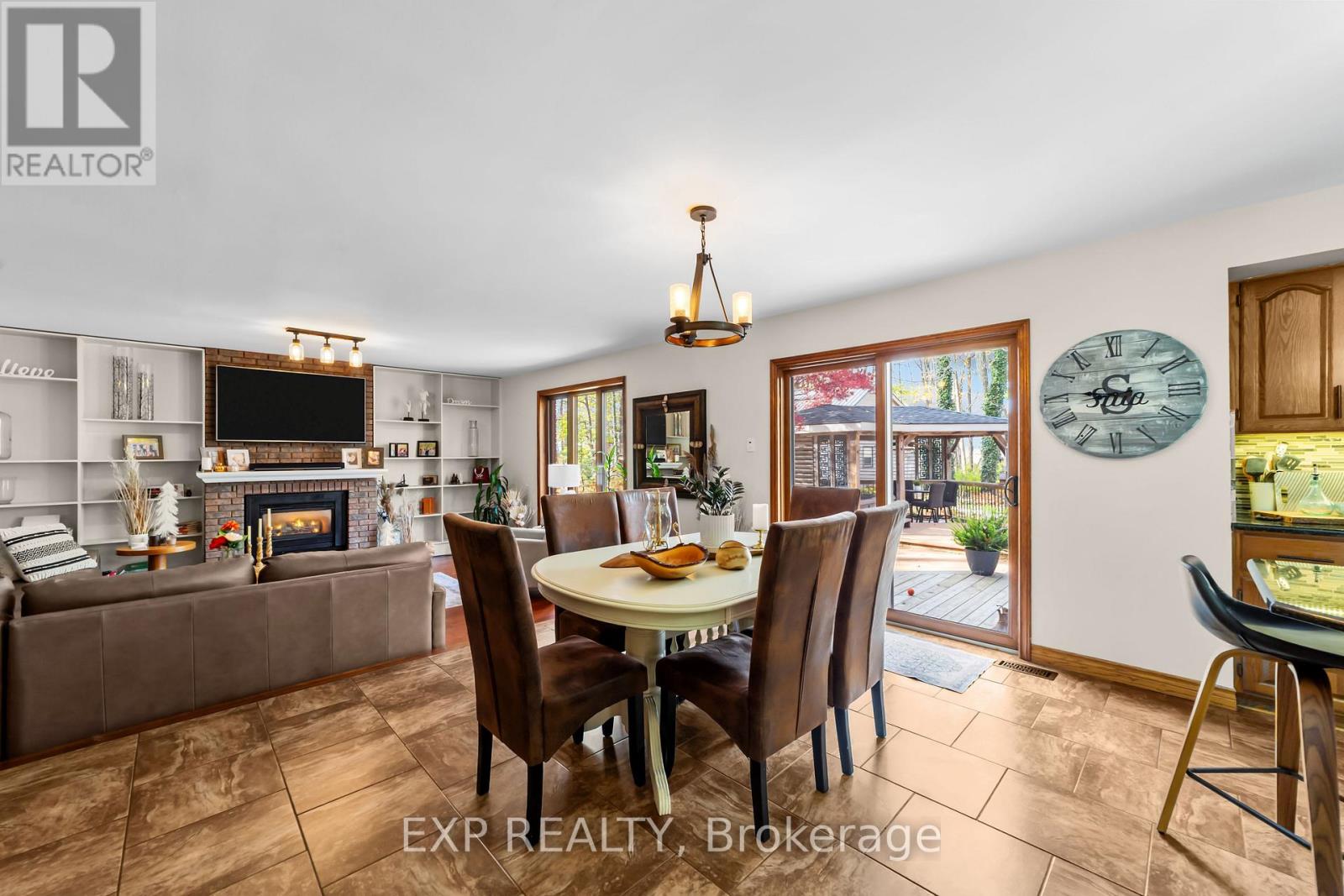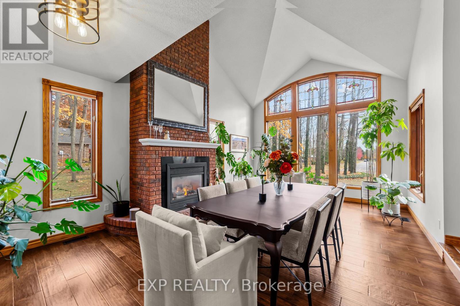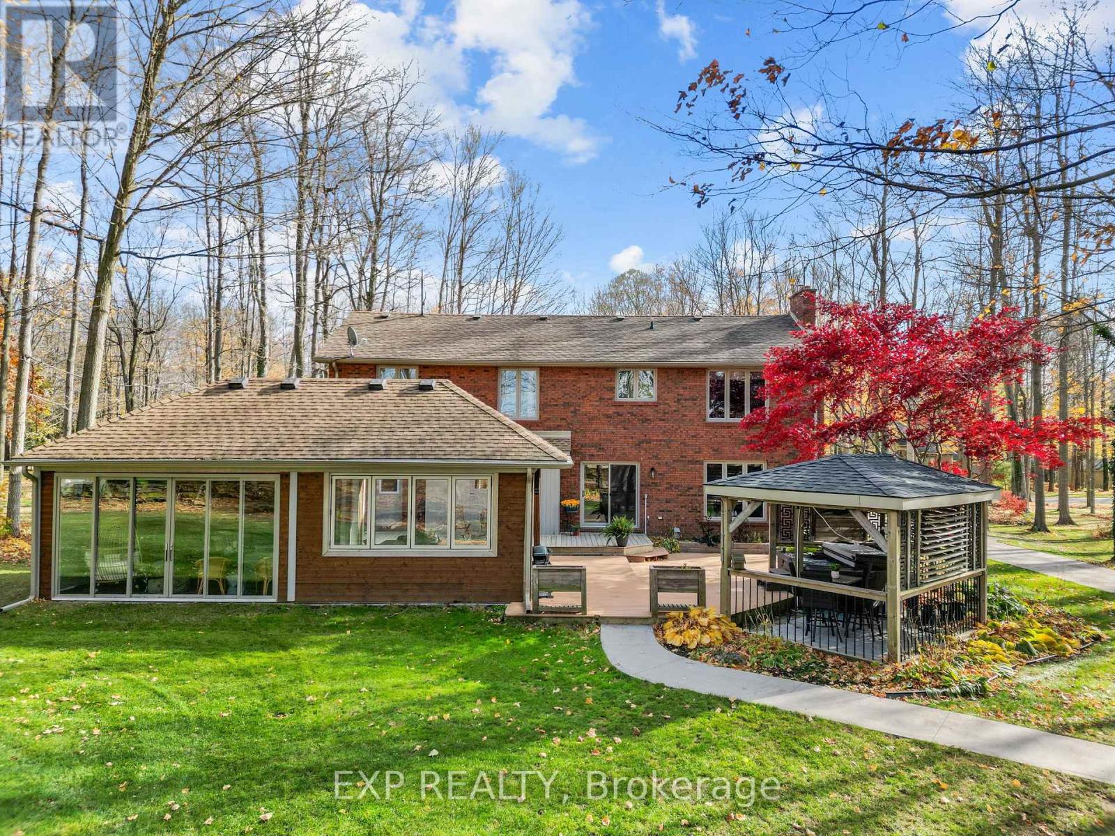 Set on a sprawling private 1.3-acre lot in Ilderton's coveted Coldstream community, this property stands out for its incredible detached shop and resort-style outdoor living. The 26x33 workshop with an additional 24x24 rear bay features a loft with vaulted ceilings designed for a car lift (included), 100-amp service, natural gas furnace, and high-speed internet-ideal for hobbyists, entrepreneurs, or car enthusiasts. Just steps away, the backyard transforms into an entertainer's paradise: a semi-enclosed hot tub area off the back door leads to a covered outdoor kitchen complete with a built-in Big Green Egg set into a custom wood countertop. A fully enclosed area with sliding glass doors, cedar walls, and stamped concrete floors provides the perfect four-season hangout for family and friends. Surrounded by mature trees and backing onto farmland, this home blends the serenity of country life with the convenience of being minutes from London and the 402. Inside you'll find granite counters in the kitchen with a built-in wall oven, and a spacious open-concept living room with a fireplace and built-ins. The main floor also offers a stunning dining room with two-story ceilings, a fireplace, and custom stained-glass doors that match the grand front entry. The second level features a loft-style den, large primary with ensuite, and two additional bedrooms. The lower level is fully finished with a walk-up entrance, games room, and secondary living area. The long concrete drive is perfect for larger families-space, privacy, and lifestyle all in one. (id:51300)