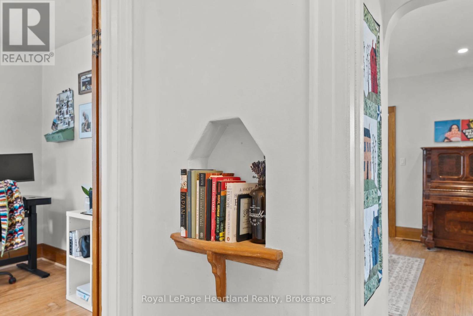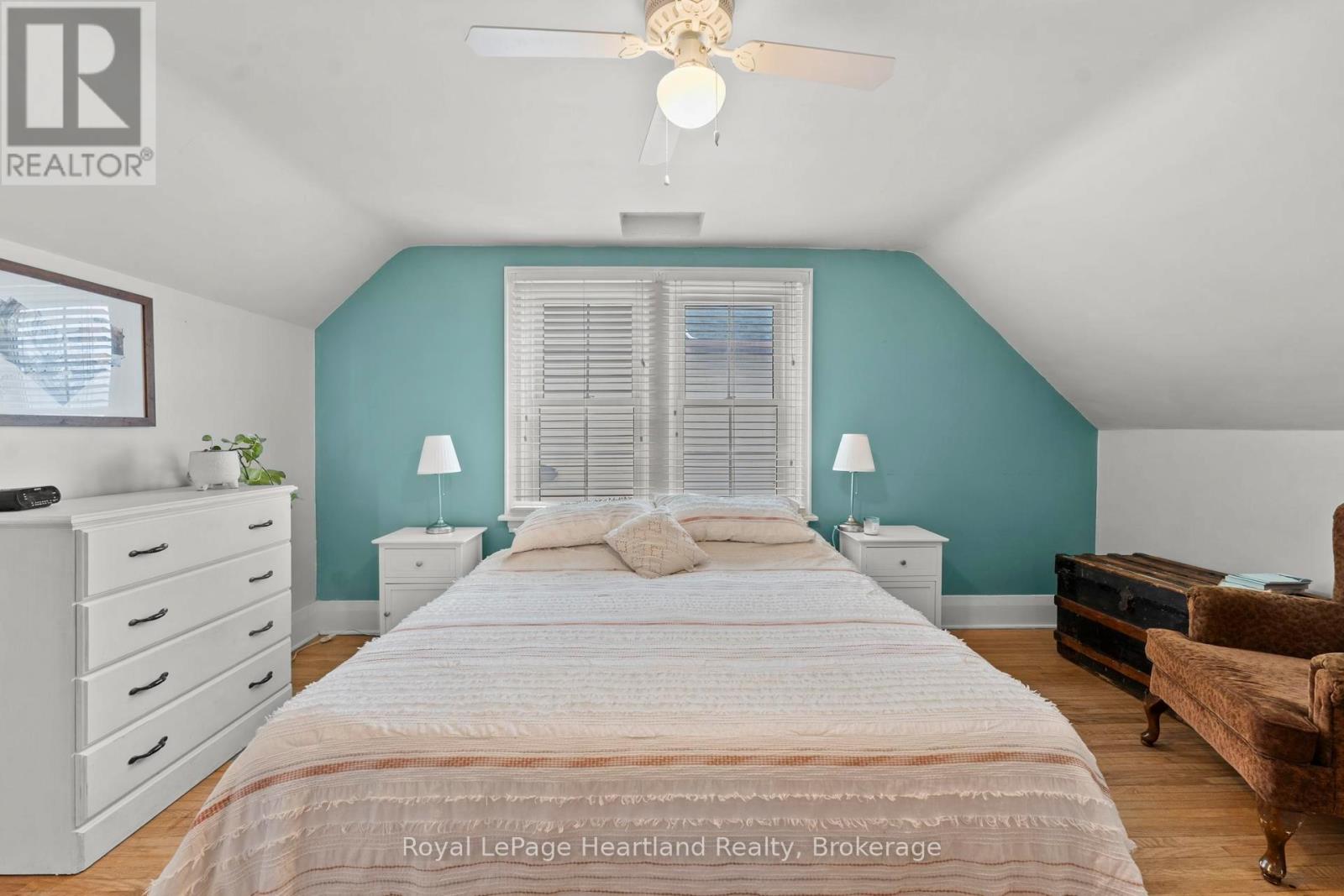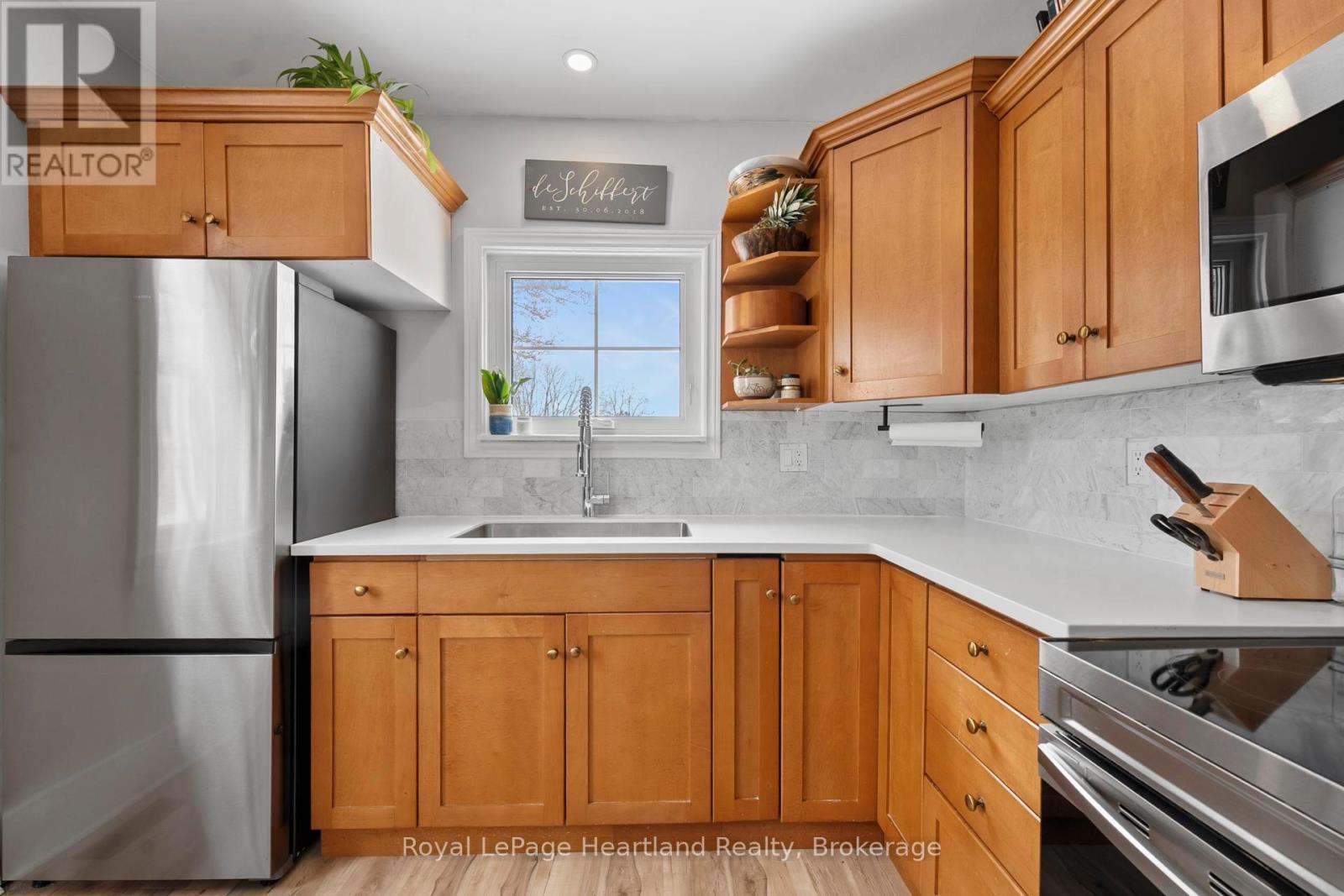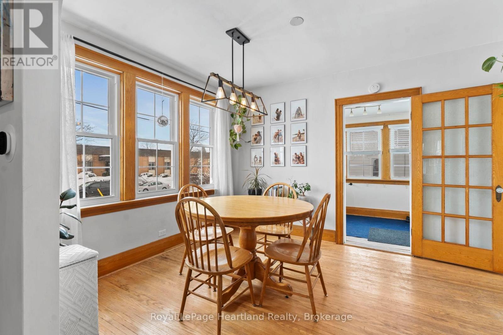 Welcome to 108 Albert Street, Clinton - a three-bedroom brick home with stunning Tudor style architecture. This home features the charm of a 1942 build, with modern updates throughout for comfortable living. Original flooring, trim and doors paired with updated windows, electrical, plumbing and a beautifully renovated custom kitchen with new appliances - this home is a unique gem in the heart of Huron County. The main floor features a sizeable entryway/coatroom and an open-concept dining and living space, with ample natural light. You will also find a bedroom and full bathroom for convenient main floor living. Upstairs, there are two more sizeable bedrooms with ample closet space, and a balcony off the second bedroom. The full, partially finished basement has been recently renovated (2025), providing another living space/rec-room, or office to suit your needs. The basement offers ample storage space and many mechanical upgrades, such as a new hot water heater. The home's exterior is just as impressive, featuring beautifully landscaped gardens, a detached garage and two driveways for ample parking. The large backyard features a newly poured pad for backyard hangouts, a blooming magnolia tree in the spring and a new fence. Located in the quaint town of Clinton, just 15 minutes from Lake Huron and an hour from London, this home is ready for its next owners. Don't hesitate to check this one out! (id:51300)