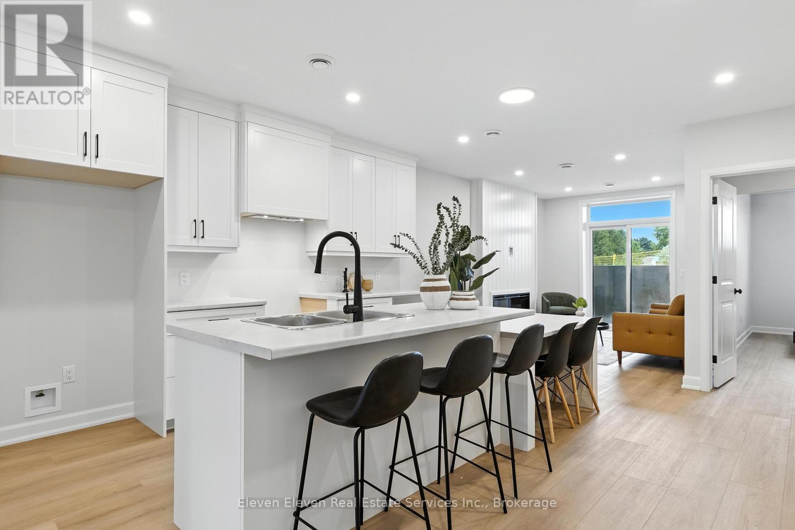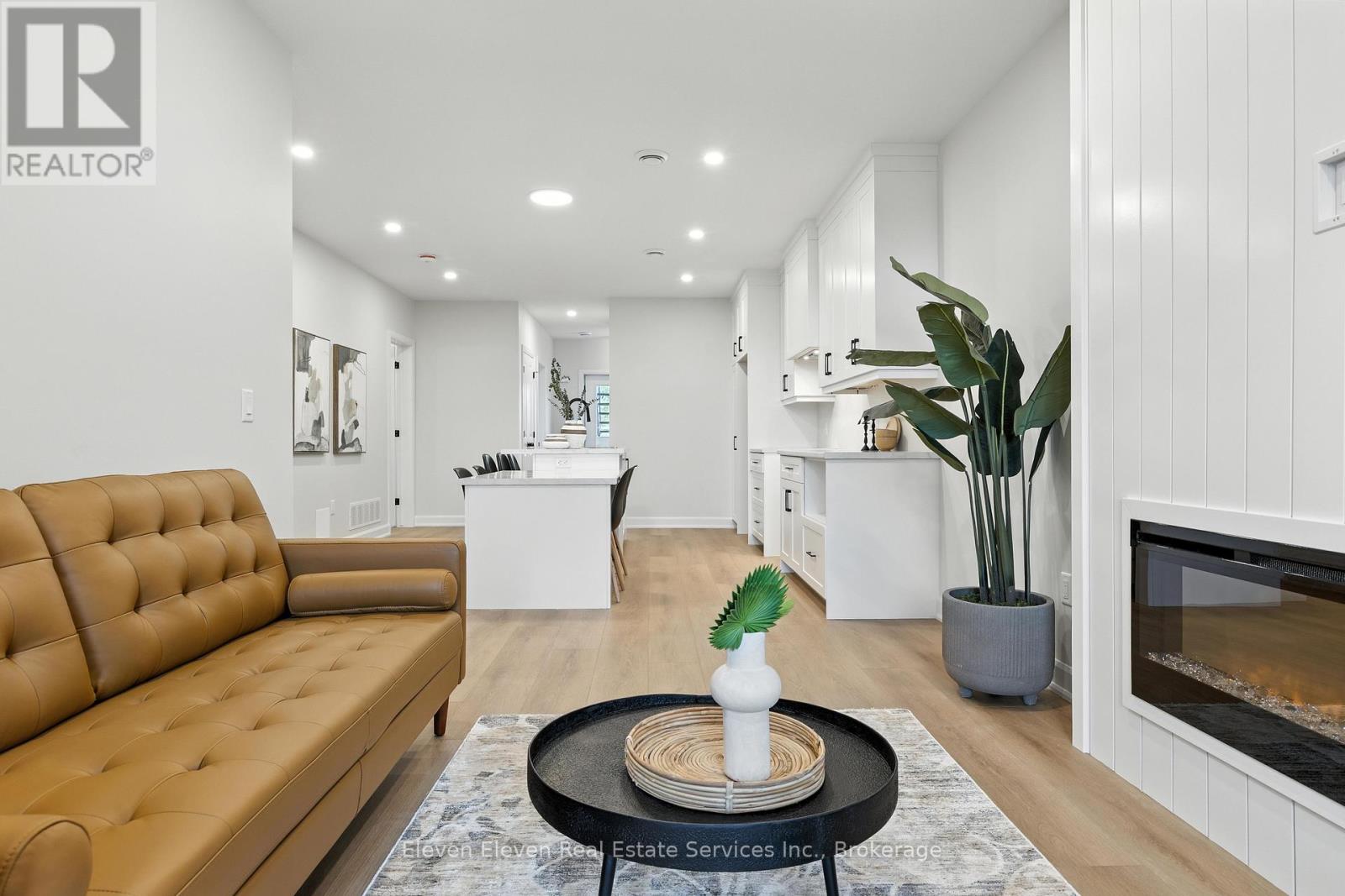 This stylish 1,024 sq ft 2-bedroom, 2-bathroom stacked townhome offers modern open-concept living with custom kitchen cabinetry, a large island, and an inviting living area with an electric fireplace. The primary suite features a walk-in closet and 3-piece ensuite, while the second full bathroom provides added convenience for guests or family. Enjoy your own private sunken patio with walk-up, designated parking, and quality finishes throughout. Located in a newly developed complex with stone and wood-look siding, plus sleek black windows for a modern touch. Comfort and style meet in this beautiful home! (id:51300)