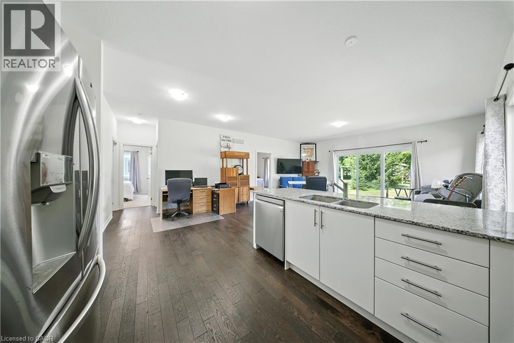 Welcome to 142 Ellen Street in charming Atwood. This beautifully maintained bungalow offers the perfect blend of modern finishes, open-concept living, and small-town tranquility, just minutes from Listowel and an easy commute to Kitchener-Waterloo. Step inside to a bright, spacious main floor featuring hardwood flooring, large windows, and a seamless flow between the kitchen, dining, and living areas. The kitchen boasts crisp white cabinetry, stainless steel appliances, granite countertops, and a generous island that is perfect for entertaining or casual family meals. The primary suite offers a peaceful retreat with a private ensuite featuring dual sinks and a walk-in shower. Additional bedrooms are well-sized and versatile, ideal for family, guests, or a home office. The large basement provides endless possibilities for customization, with large windows allowing for plenty of natural light. Enjoy the outdoors with a deep backyard, perfect for gardening or play. The property backs onto open green space, offering added privacy and scenic views. With an attached double garage, ample driveway parking, and move-in-ready condition, this home is perfect for families, downsizers, or anyone looking for peaceful living without sacrificing convenience. (id:51300)
