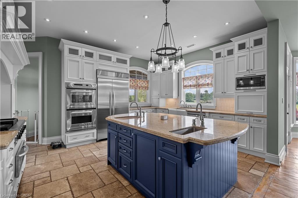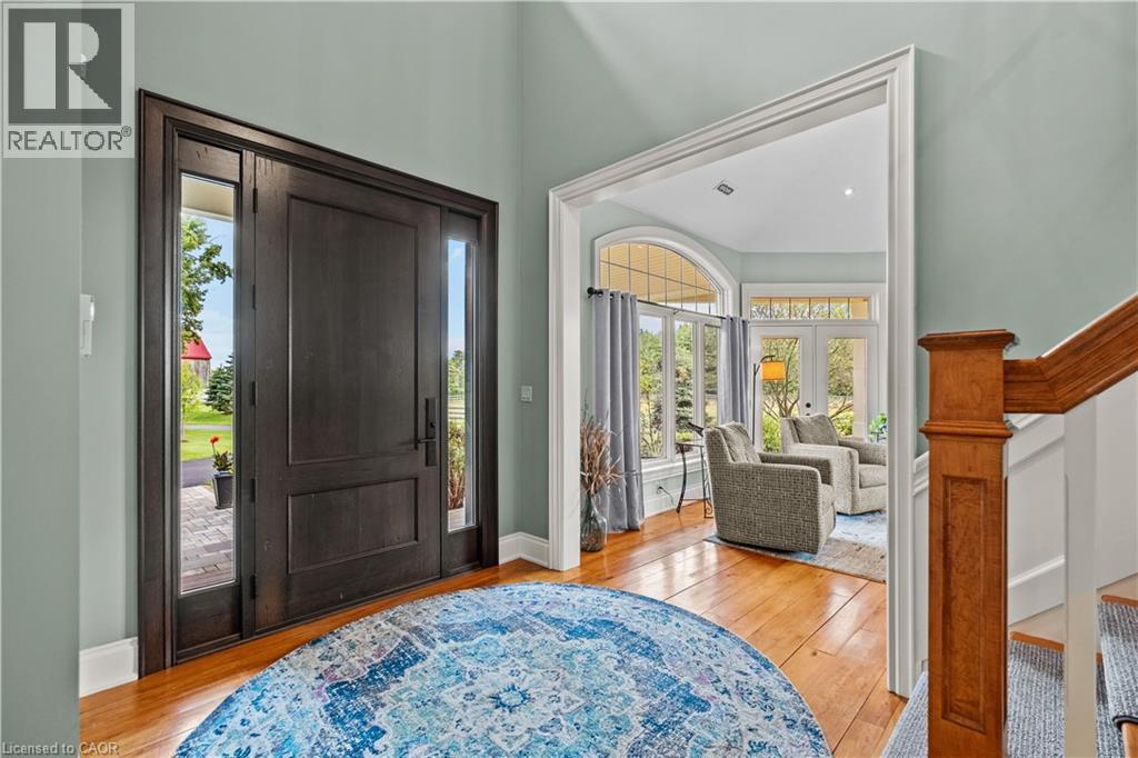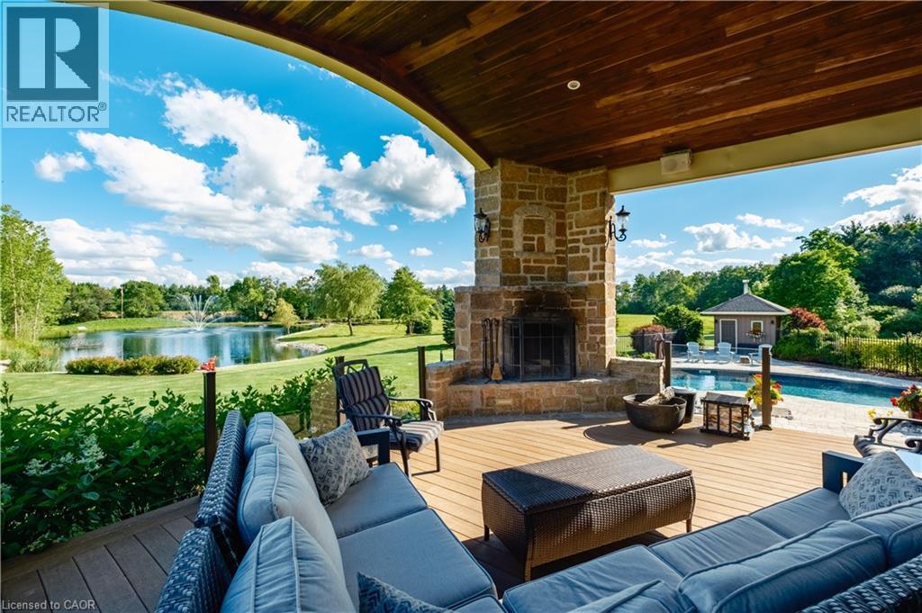 Scenic Flamborough is a part of southwestern Ontario known for farms and horse ranches. Located between Cambridge and Hamilton is this completely private, calendar book property on 90 acres. The home is set back from the main road with mature natural beauty as a buffer. A manicured tree line separates the driveway from the paddocks leading up to the home with approximately 15 acres of cultivable land, pastures, and gardens. The barn is suited for horses, complete with hydro, running water, four stalls, tack room, and massive hay loft. Attached to it is an oversized 3 bay garage providing space for utility vehicle storage and a workshop. In the centre of the property is a beautiful two story home at over 6800 square feet of finished space including the basement, with in-floor heating throughout the entire home and subdivided triple car garage. The board and batten/stone skirt exterior, wrap around porch, large windows, and soaring ceilings give the home its luxury farmhouse feel. It offers capacity for living and entertaining with 3 bedrooms plus a spa like primary suite, 6 bathrooms, beautiful living room with stunning fireplace, gourmet kitchen with butler pantry, and oversized dining room open to the nook and family room also featuring an elegant stone fireplace with timber mantel. The main floor office and laundry offer convenience. The basement was designed with recreation in mind offering a games room, wet bar and home theatre with surround sound and projection system. The basement level is also directly accessible from the garage via the second staircase. Relaxation extends to the outdoors with a backyard heated saltwater pool, 20' x 30' Muskoka room and wood burning stone fireplace and chimney. The views are gorgeous in every direction; to the south it overlooks a private acre pond complete with beach and aerating fountain, and behind it over 74 acres of forest with a 4 km network of trails for walking and riding. A truly stunning property! (id:51300)
