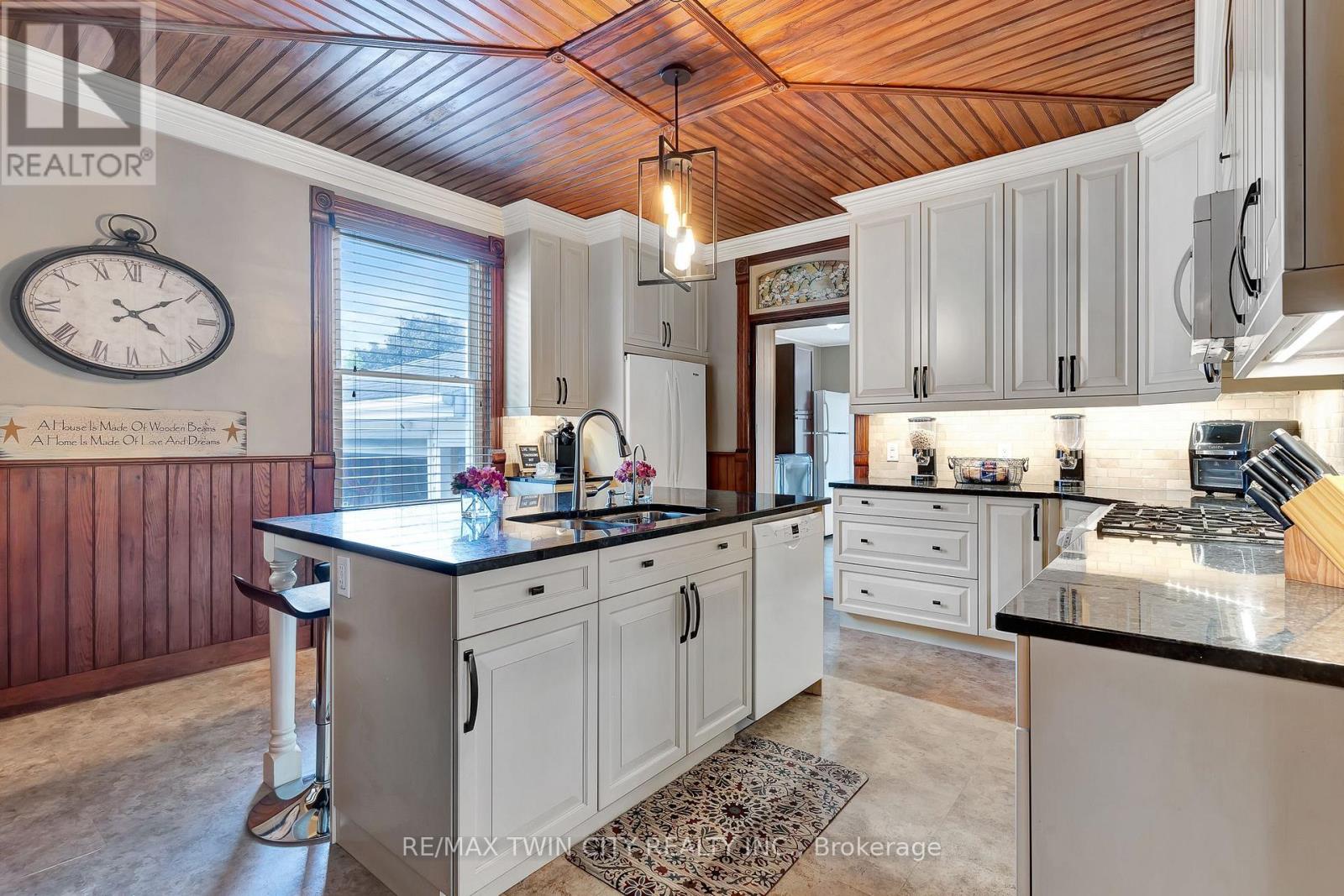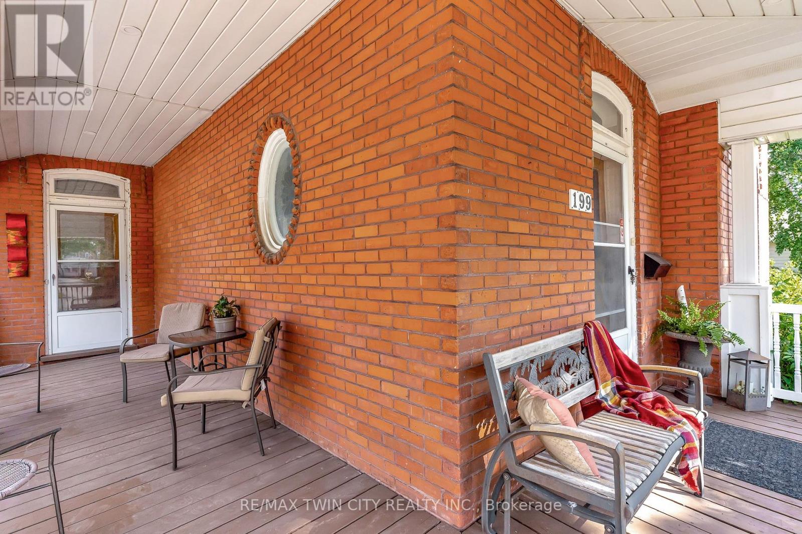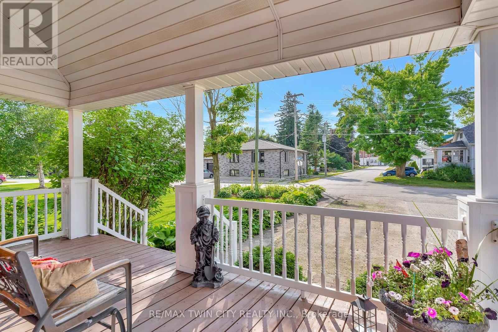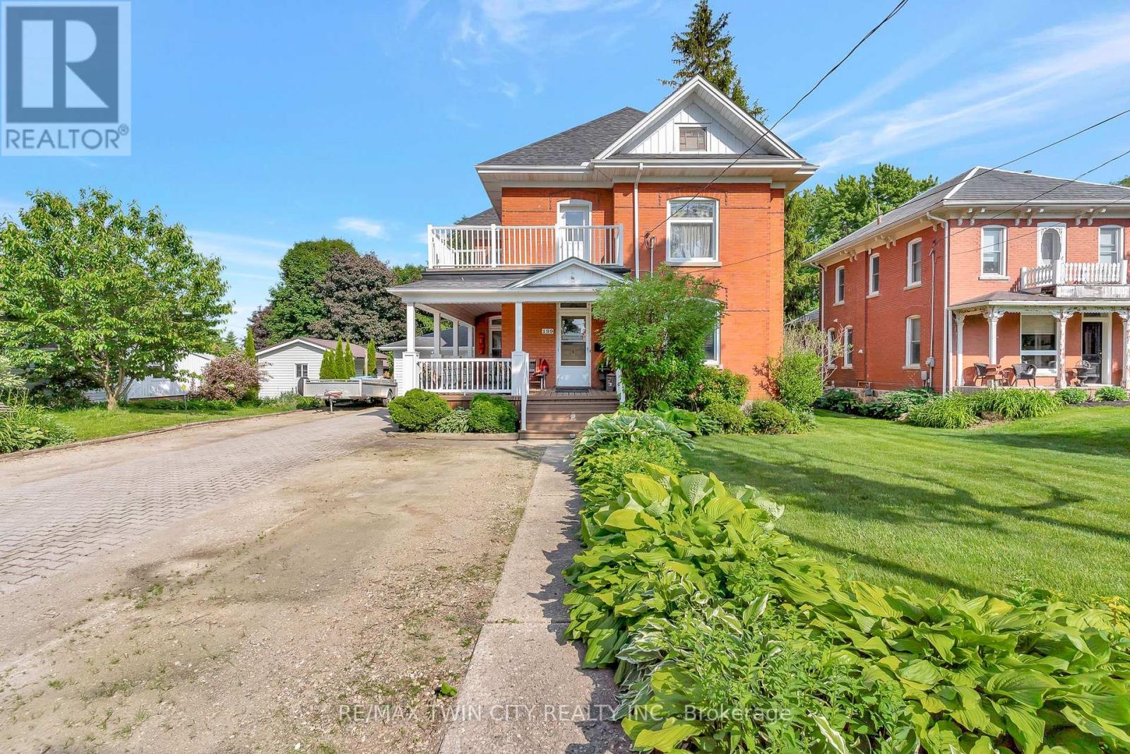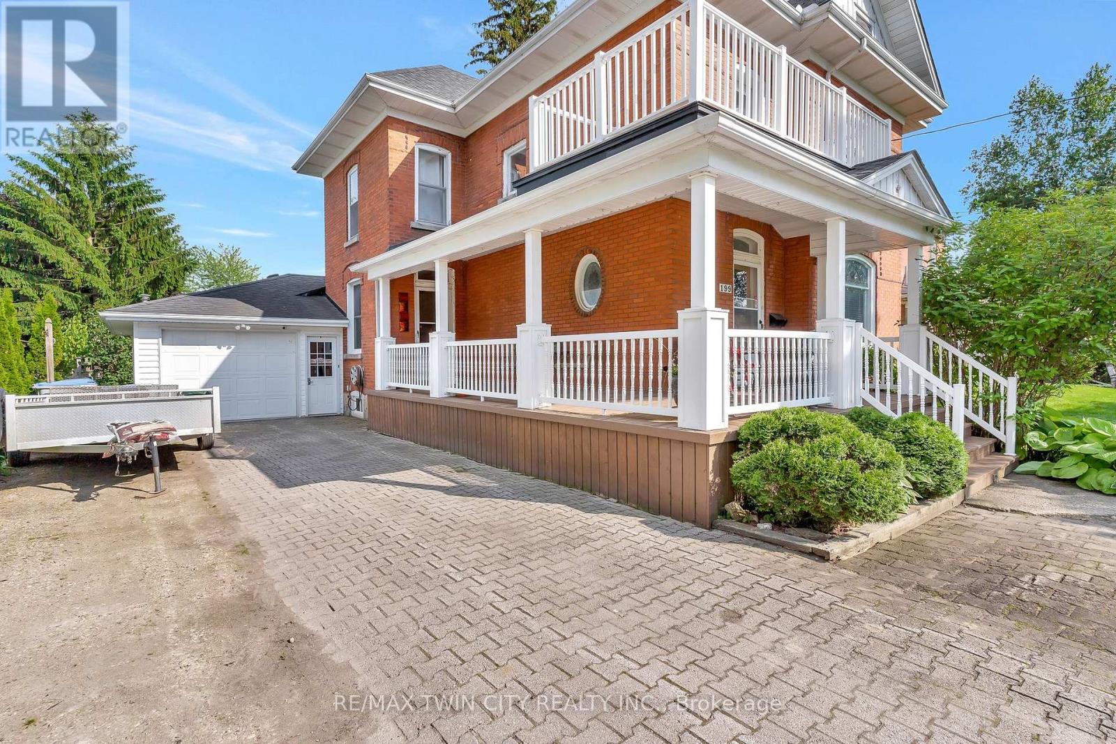 Welcome to 199 Ellen St, a charming century home overflowing with character located in the quiet family friendly town of Atwood, just a 45 min drive to Kitchener/Waterloo. This 5 bed, 2 bath, 2.5 story has beautiful curb appeal with an inviting wrap-around porch, solid red brick, lush landscaping, and a stone driveway to fit 6+ cars. Inside, the timeless appeal is seamlessly blended with modern upgrades from the elegant detail of the wood trim, some original stained glass windows and hardwood throughout to the classically renovated kitchen and bathrooms. The large entryway takes you to a cozy living room with large windows to let in plenty of natural light, and a gas fireplace where you will love to relax after a long day. From here you can separate the large formal dining room with traditional pocket doors. You will also find a den/office on this main level which is big enough to use to create a 6th bedroom on the main floor. Down the hall from the foyer is the gorgeous, modern-meets-rustic kitchen, with custom cream cabinetry and island, black granite countertops, gas stove and wood paneled ceiling, combining tradition and luxury. From here you can head through the mudroom where you'll find main floor laundry and a modern updated 3 pce bath. The oversized sliders will lead you to the peace and tranquility of the huge, treed backyard where you can enjoy the stunning gardens or relax on the private, well designed deck with a bar, or under the canopy where you can cool off under the fan. Store your toys and tools in the custom crafted shed. Upstairs there is an exquisitely designed electric fireplace with white shiplap, another fully updated 4 pce bathroom and 5 spacious bedrooms with one leading to your upper balcony, a great place to enjoy a morning coffee. If you're looking for more space or extra storage, there's a staircase to an attic with 500 sq feet to make your own. A perfect place to raise your children, close to community center/pool, schools and more! (id:51300)