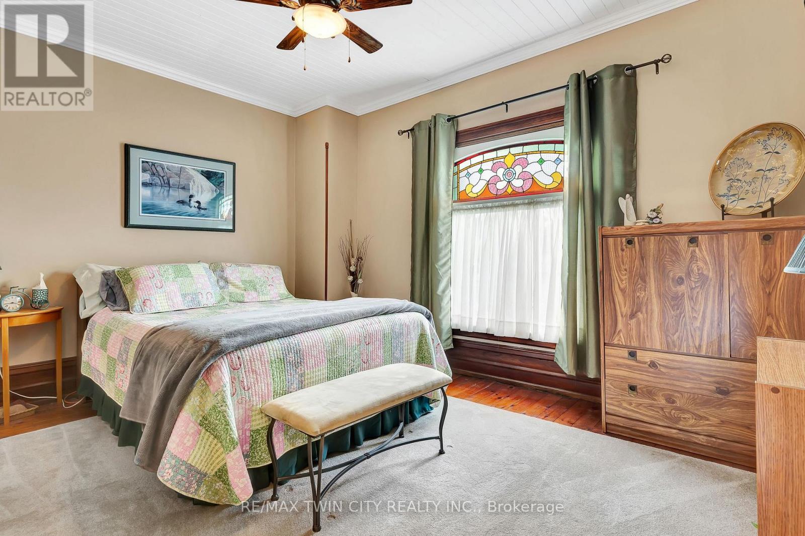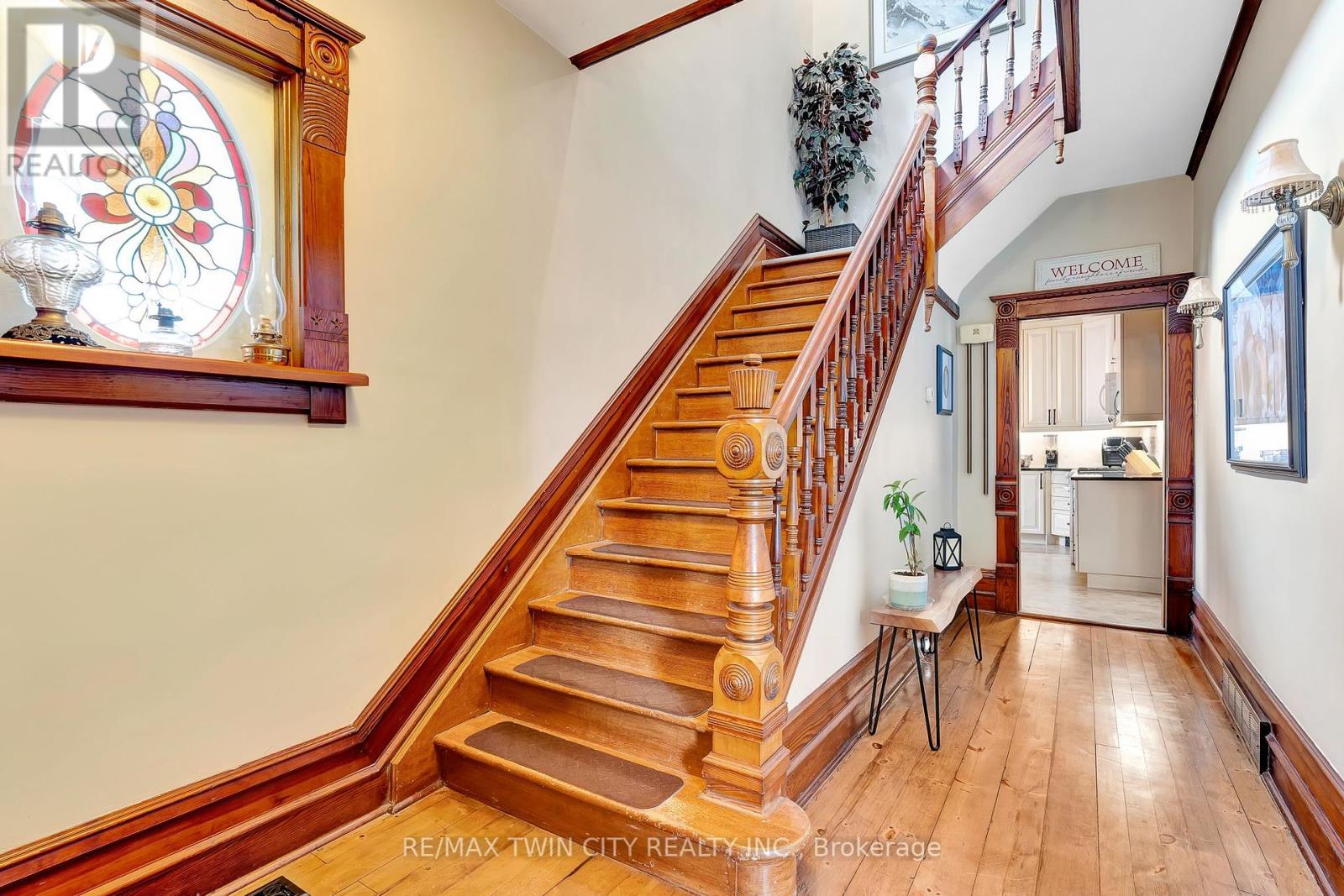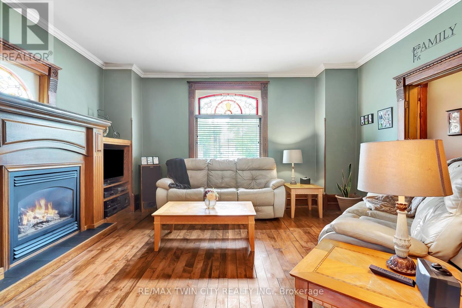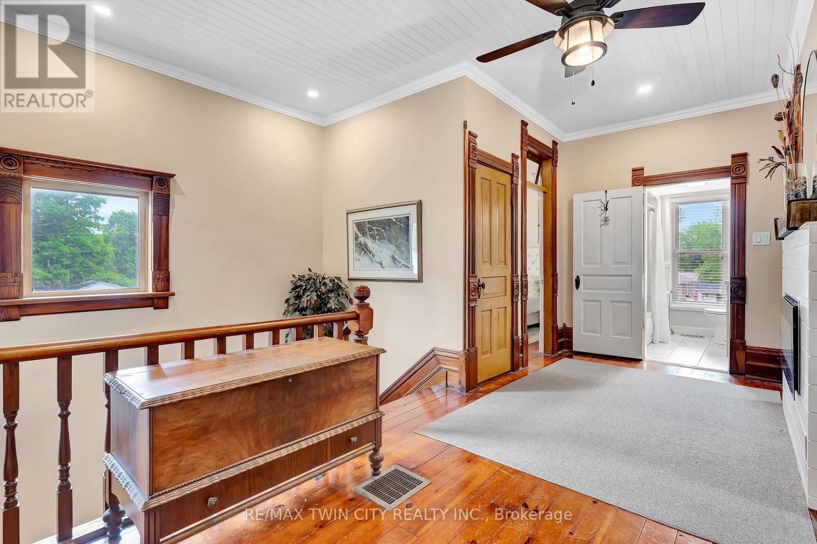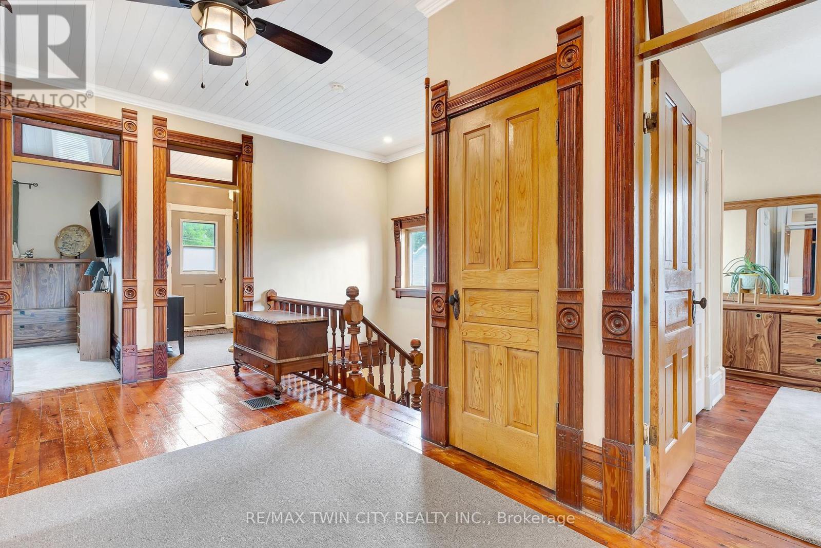 Welcome to 199 Ellen St, a charming century home overflowing with character located in the quiet family friendly town of Atwood, just a 45 min drive to Kitchener/Waterloo. This 5 bed, 2 bath, 2.5 story has beautiful curb appeal with an inviting wrap-around porch, solid red brick, lush landscaping, and a stone driveway to fit 6+ cars. Inside, the timeless appeal is seamlessly blended with modern upgrades from the elegant detail of the wood trim, some original stained glass windows and hardwood throughout to the classically renovated kitchen and bathrooms. The large entryway takes you to a cozy living room with large windows to let in plenty of natural light, and a gas fireplace where you will love to relax after a long day. From here you can separate the large formal dining room with traditional pocket doors. You will also find a den/office on this main level which is big enough to use to create a 6th bedroom on the main floor. Down the hall from the foyer is the gorgeous, modern-meets-rustic kitchen, with custom cream cabinetry and island, black granite countertops, gas stove and wood paneled ceiling, combining tradition and luxury. From here you can head through the mudroom where you'll find main floor laundry and a modern updated 3 pce bath. The oversized sliders will lead you to the peace and tranquility of the huge, treed backyard where you can enjoy the stunning gardens or relax on the private, well designed deck with a bar, or under the canopy where you can cool off under the fan. Store your toys and tools in the custom crafted shed. Upstairs there is an exquisitely designed electric fireplace with white shiplap, another fully updated 4 pce bathroom and 5 spacious bedrooms with one leading to your upper balcony, a great place to enjoy a morning coffee. If you're looking for more space or extra storage, there's a staircase to an attic with 500 sq feet to make your own. A perfect place to raise your children, close to community center/pool, schools and more! (id:51300)