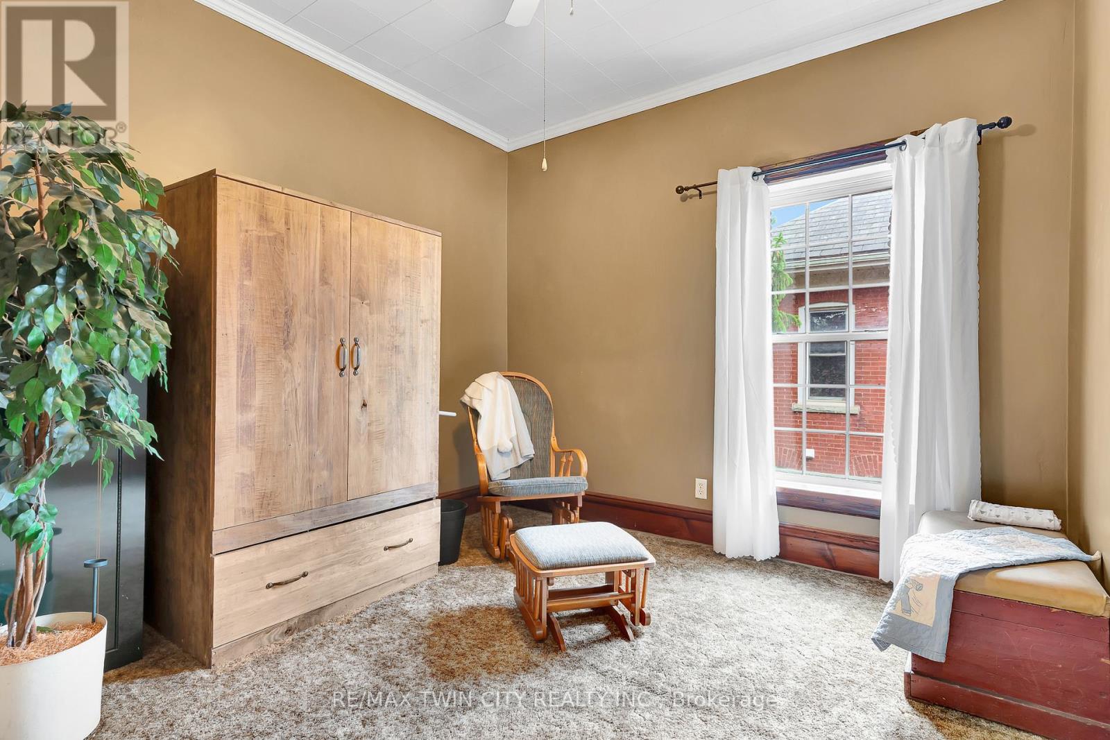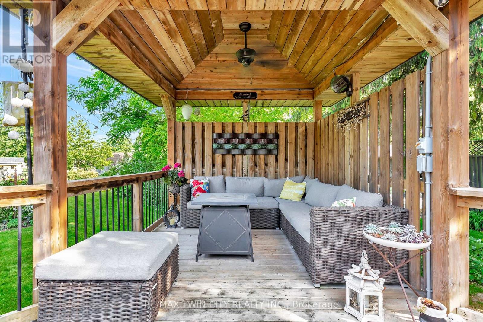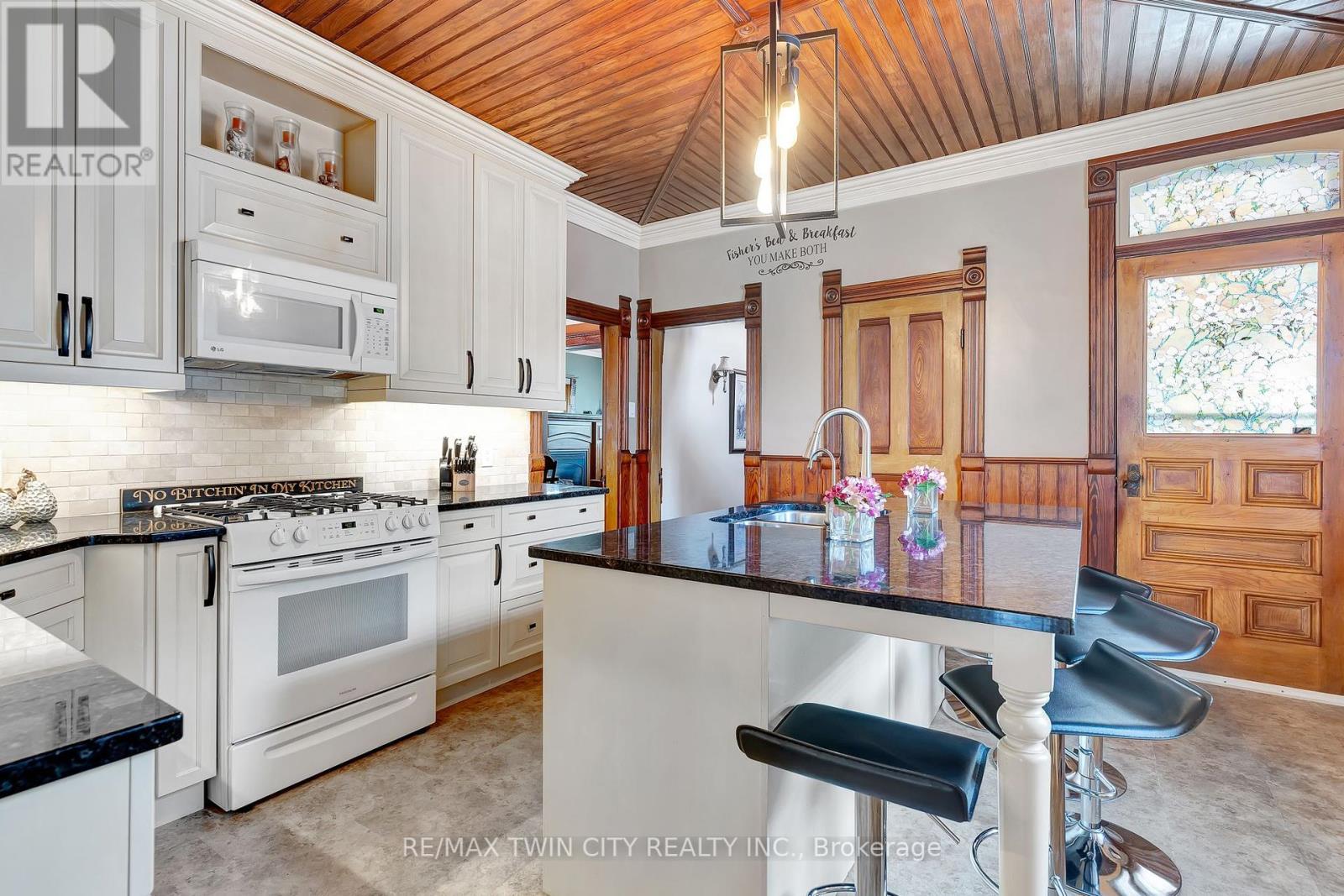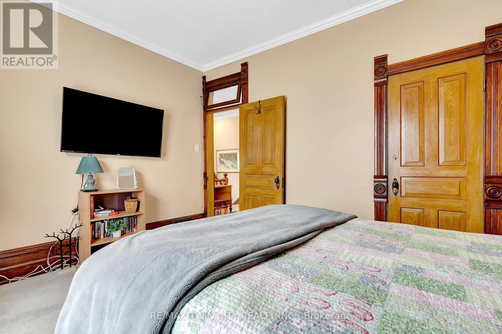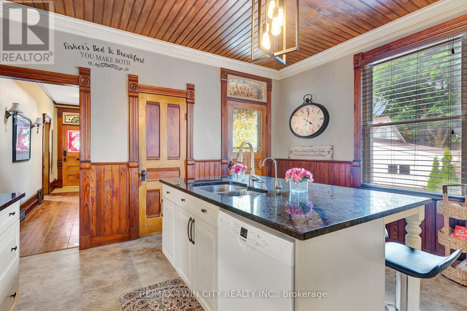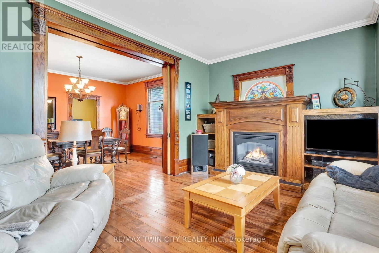 Welcome to 199 Ellen St, a charming century home overflowing with character located in the quiet family friendly town of Atwood, just a 45 min drive to Kitchener/Waterloo. This 5 bed, 2 bath, 2.5 story has beautiful curb appeal with an inviting wrap-around porch, solid red brick, lush landscaping, and a stone driveway to fit 6+ cars. Inside, the timeless appeal is seamlessly blended with modern upgrades from the elegant detail of the wood trim, some original stained glass windows and hardwood throughout to the classically renovated kitchen and bathrooms. The large entryway takes you to a cozy living room with large windows to let in plenty of natural light, and a gas fireplace where you will love to relax after a long day. From here you can separate the large formal dining room with traditional pocket doors. You will also find a den/office on this main level which is big enough to use to create a 6th bedroom on the main floor. Down the hall from the foyer is the gorgeous, modern-meets-rustic kitchen, with custom cream cabinetry and island, black granite countertops, gas stove and wood paneled ceiling, combining tradition and luxury. From here you can head through the mudroom where you'll find main floor laundry and a modern updated 3 pce bath. The oversized sliders will lead you to the peace and tranquility of the huge, treed backyard where you can enjoy the stunning gardens or relax on the private, well designed deck with a bar, or under the canopy where you can cool off under the fan. Store your toys and tools in the custom crafted shed. Upstairs there is an exquisitely designed electric fireplace with white shiplap, another fully updated 4 pce bathroom and 5 spacious bedrooms with one leading to your upper balcony, a great place to enjoy a morning coffee. If you're looking for more space or extra storage, there's a staircase to an attic with 500 sq feet to make your own. A perfect place to raise your children, close to community center/pool, schools and more! (id:51300)