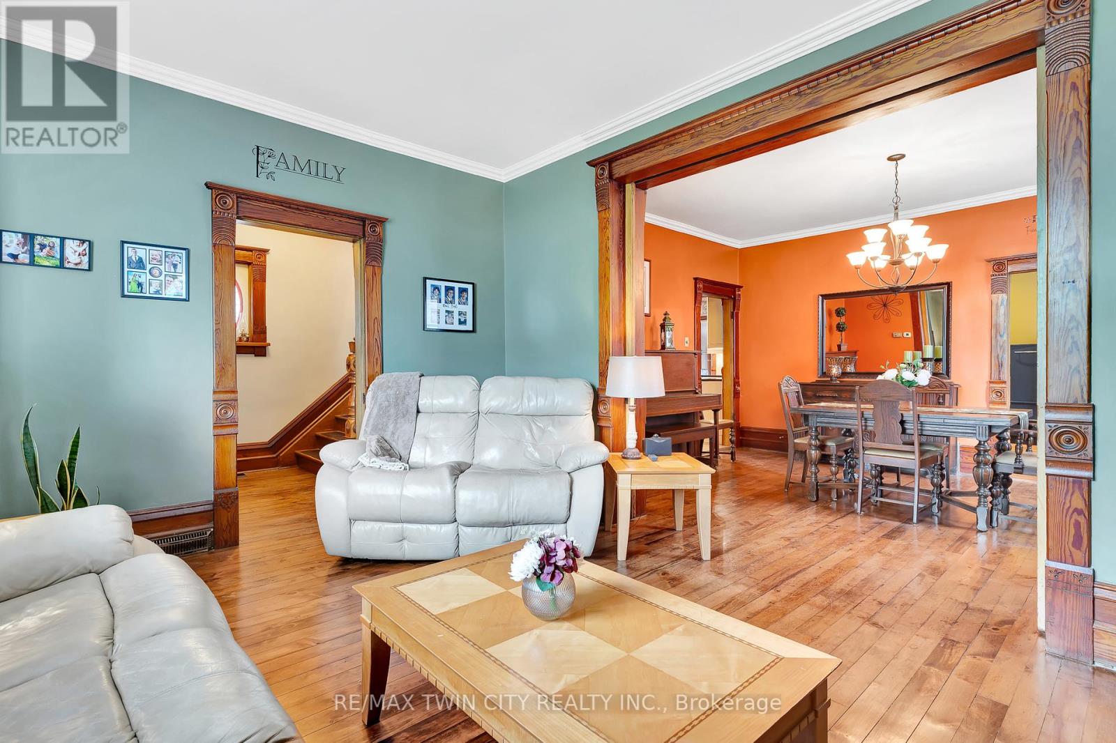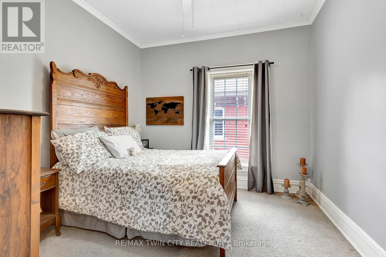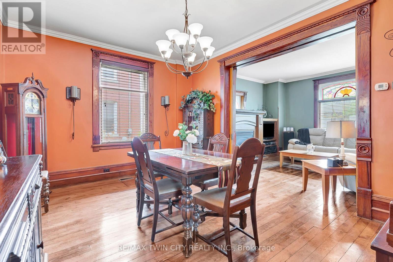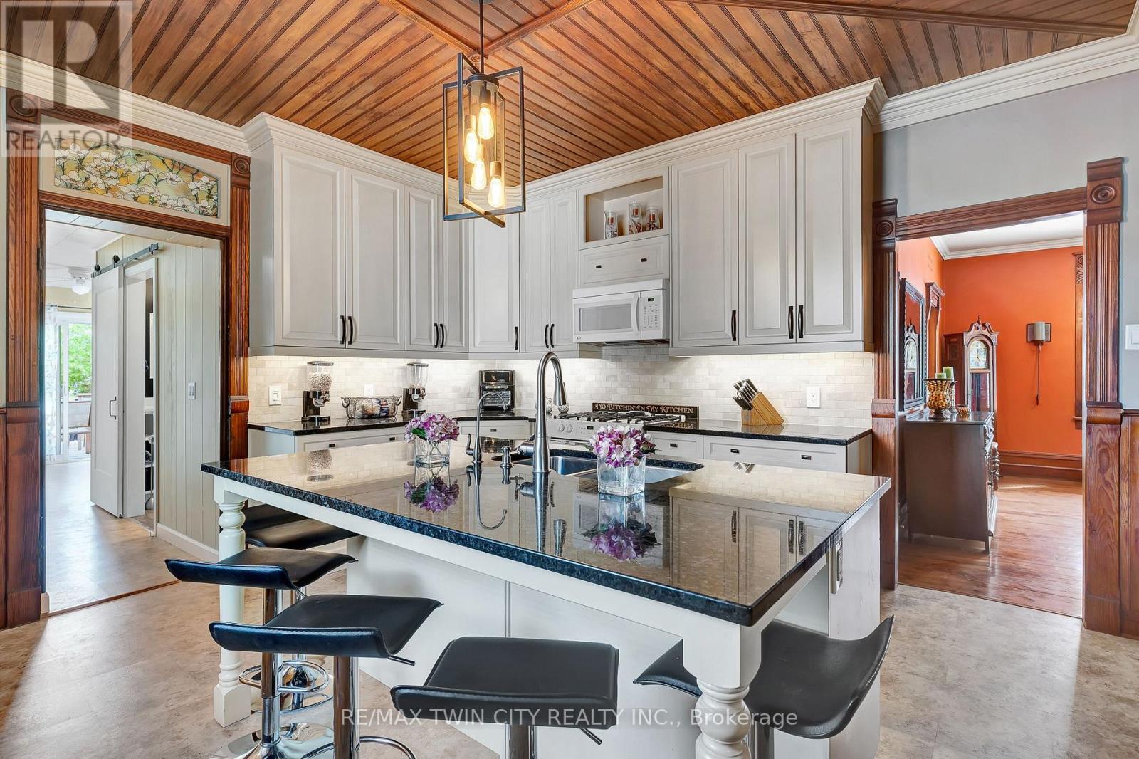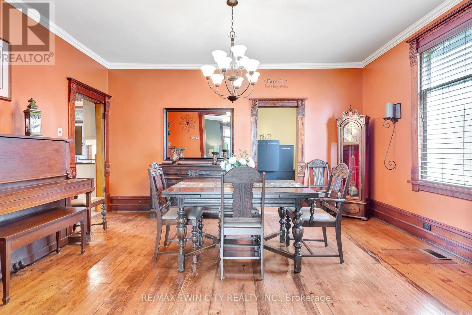 Welcome to 199 Ellen St, a charming century home overflowing with character located in the quiet family friendly town of Atwood, just a 45 min drive to Kitchener/Waterloo. This 5 bed, 2 bath, 2.5 story has beautiful curb appeal with an inviting wrap-around porch, solid red brick, lush landscaping, and a stone driveway to fit 6+ cars. Inside, the timeless appeal is seamlessly blended with modern upgrades from the elegant detail of the wood trim, some original stained glass windows and hardwood throughout to the classically renovated kitchen and bathrooms. The large entryway takes you to a cozy living room with large windows to let in plenty of natural light, and a gas fireplace where you will love to relax after a long day. From here you can separate the large formal dining room with traditional pocket doors. You will also find a den/office on this main level which is big enough to use to create a 6th bedroom on the main floor. Down the hall from the foyer is the gorgeous, modern-meets-rustic kitchen, with custom cream cabinetry and island, black granite countertops, gas stove and wood paneled ceiling, combining tradition and luxury. From here you can head through the mudroom where you'll find main floor laundry and a modern updated 3 pce bath. The oversized sliders will lead you to the peace and tranquility of the huge, treed backyard where you can enjoy the stunning gardens or relax on the private, well designed deck with a bar, or under the canopy where you can cool off under the fan. Store your toys and tools in the custom crafted shed. Upstairs there is an exquisitely designed electric fireplace with white shiplap, another fully updated 4 pce bathroom and 5 spacious bedrooms with one leading to your upper balcony, a great place to enjoy a morning coffee. If you're looking for more space or extra storage, there's a staircase to an attic with 500 sq feet to make your own. A perfect place to raise your children, close to community center/pool, schools and more! (id:51300)