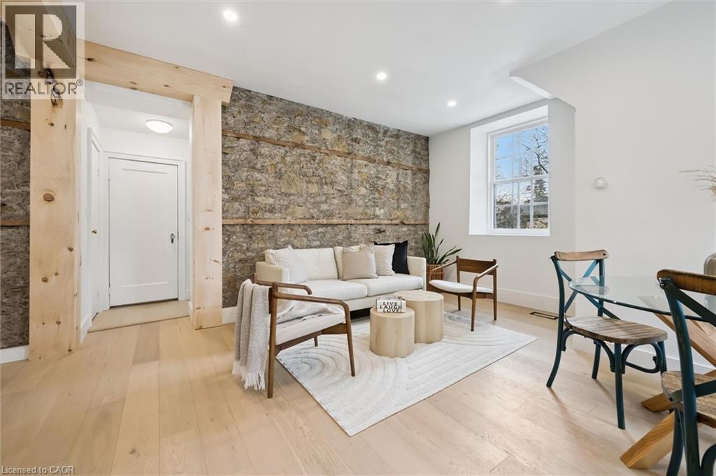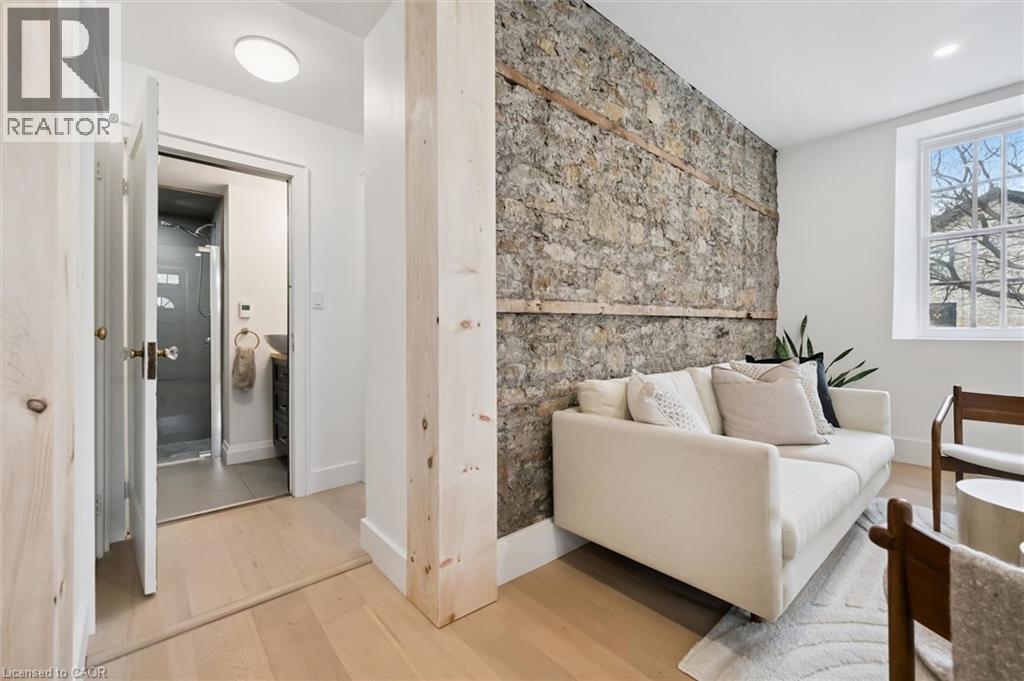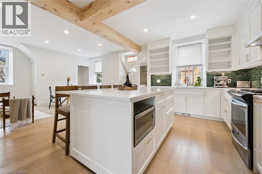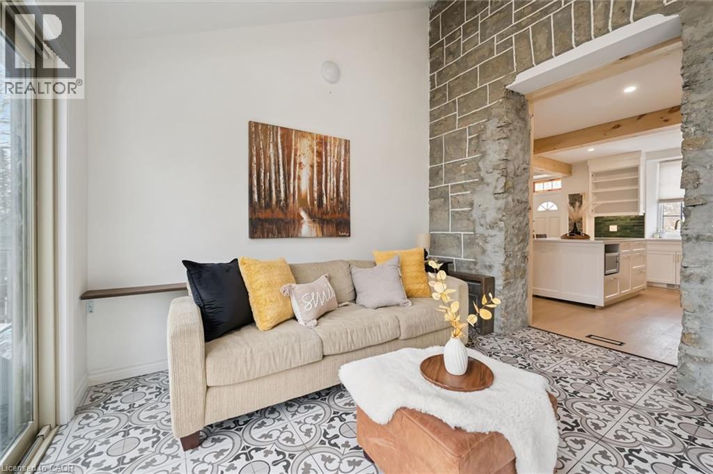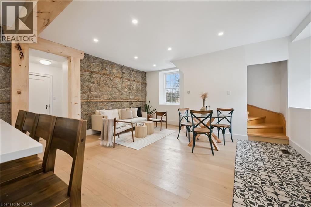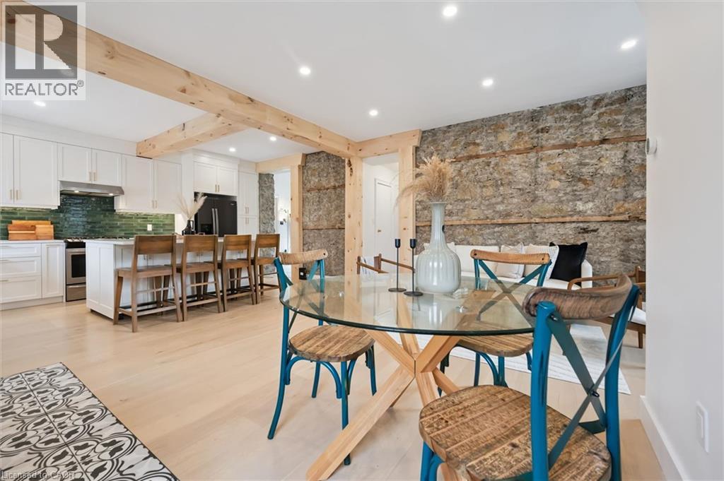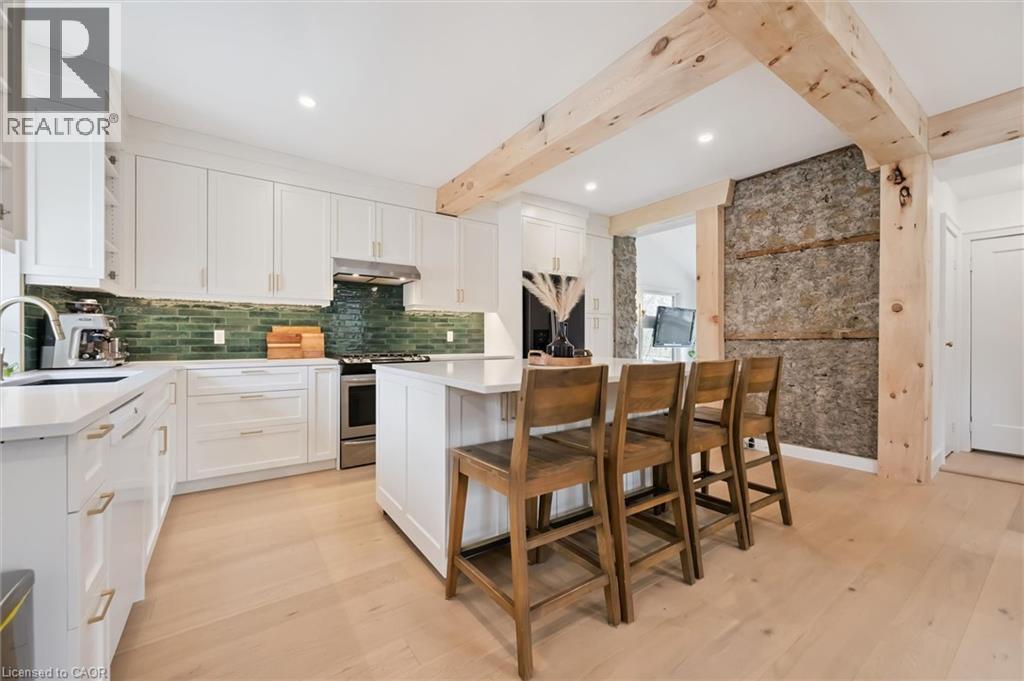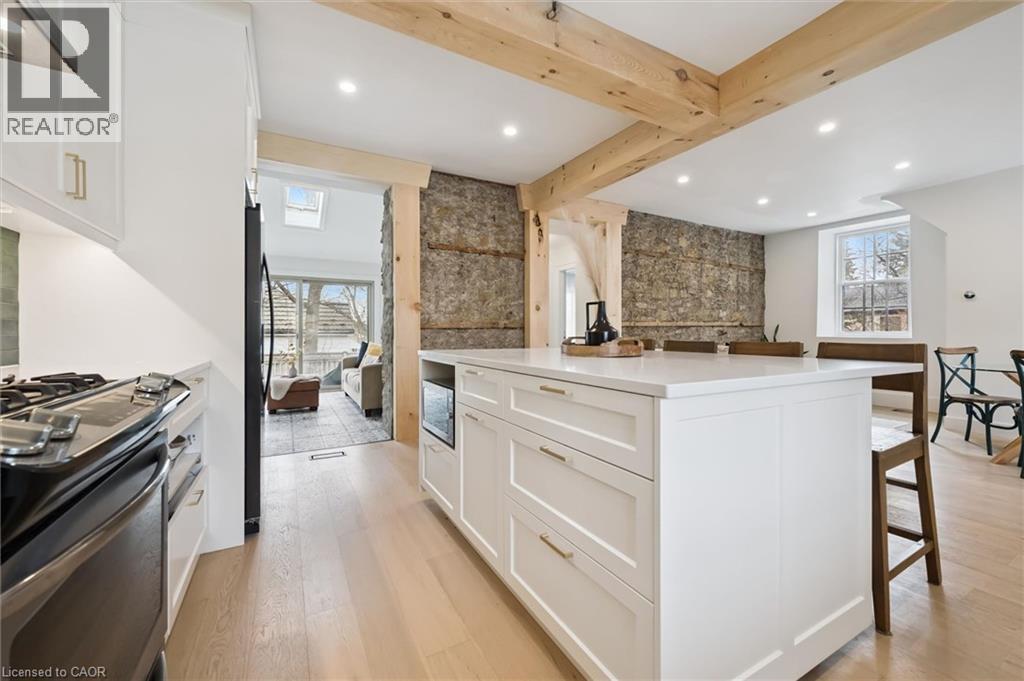 Stunning stone 4 bedroom home with character and charm. This charming 4 bedroom home has been lovingly renovated with a massive, open concept main floor living space. Beamed ceilings, exposed stone walls, new bright white chef's kitchen with quartz countertops and massive island. From the moment you step inside you'll recognize the attention to detail and the love that went into this home. Gleaming neutral hardwood, gorgeous gem toned backsplash, stainless appliances, and so much space! The high ceilings and large windows make this floor inviting and airy. The den, with abundant windows sits just off the kitchen, and a convenient main floor bedroom and newly renovated 3 piece bath with tiled shower and heated floors round out this level. Each end of the home has its own staircase, one to the oversized primary bedroom (with walk in closet) and one to the children's wing. One bedroom upstairs is connected to the primary, perfect for a nursery or office. The second floor bathroom features a clawfoot tub. The backyard is an oasis, with perennial gardens, newer deck and is fully fenced with mature trees, and a private pond. Along the side of the home a concrete pad was poured to double as extra parking and a mini basketball court. The single car garage has been insulated and drywalled and is connected to the home by an interior door. This home is truly the perfect blend of historic elegance with warmth and character, and modern conveniences. (id:51300)