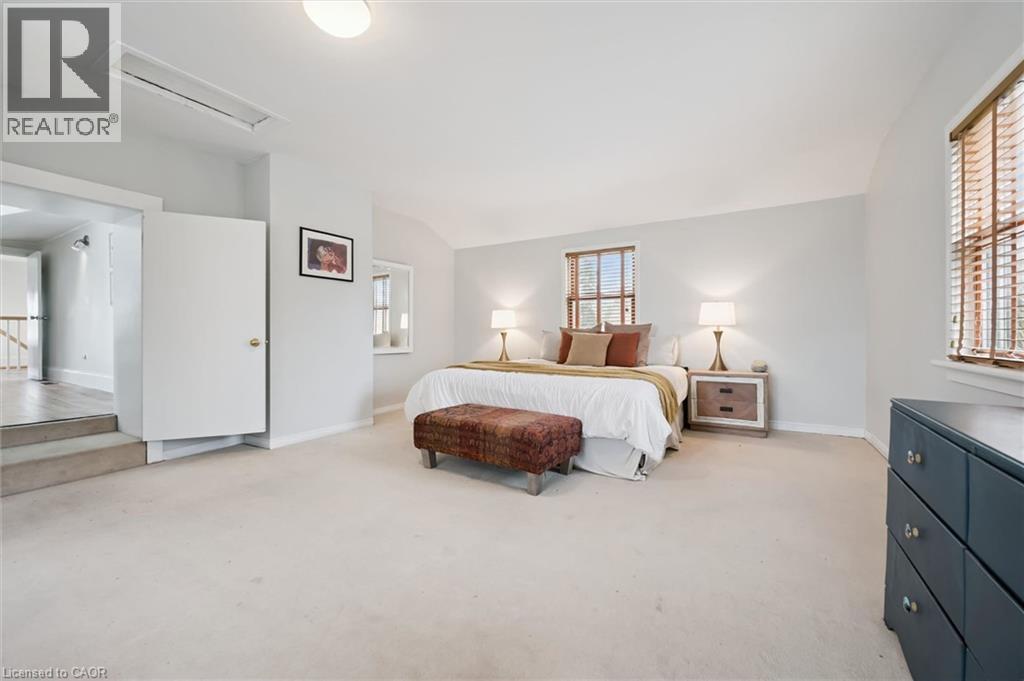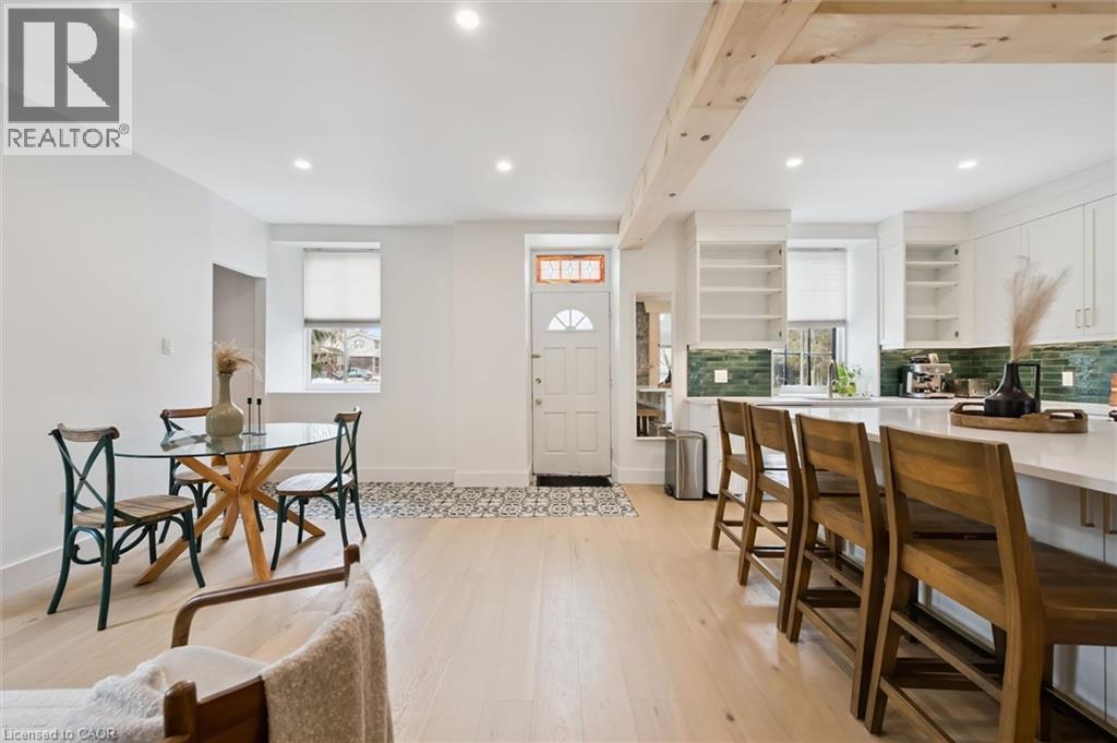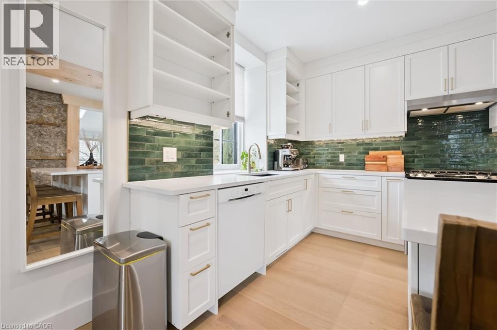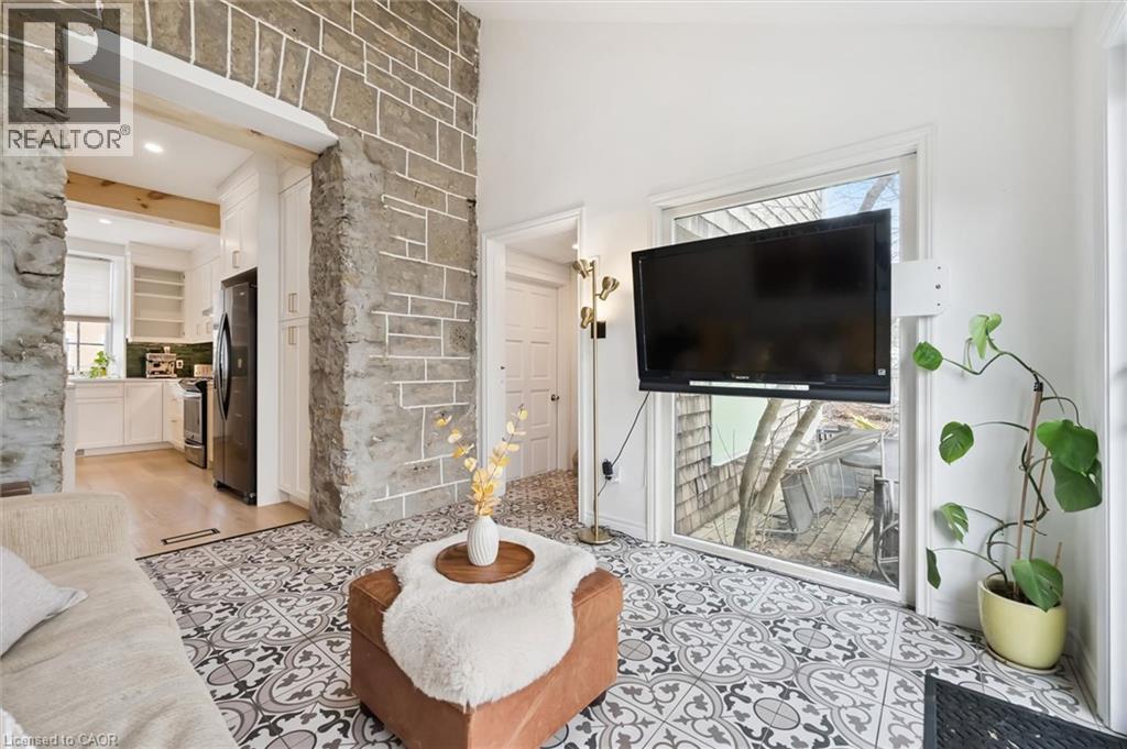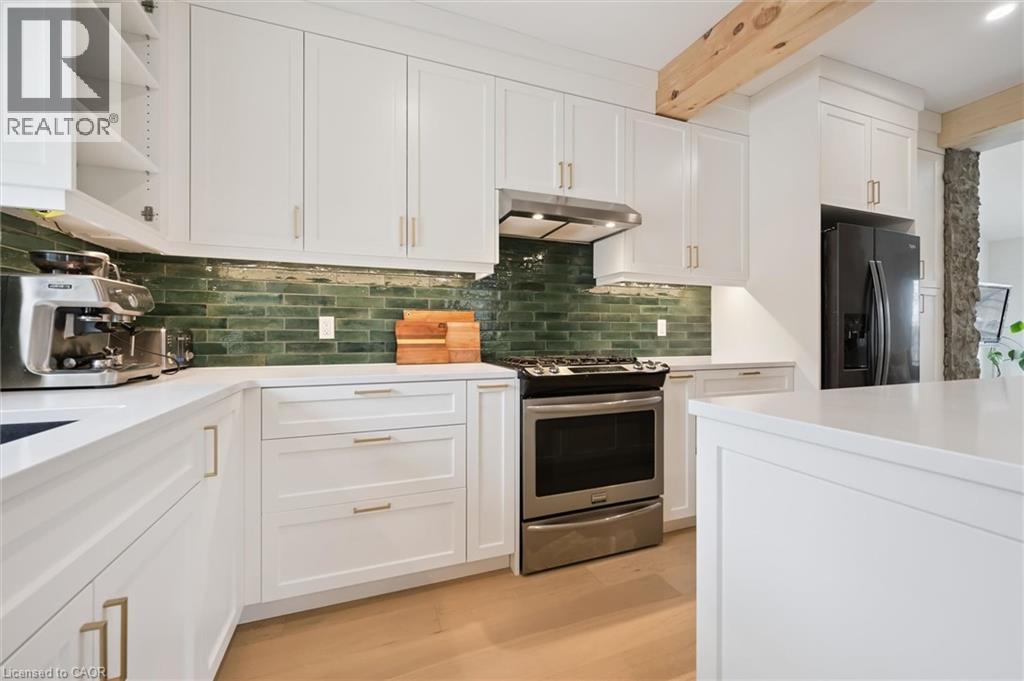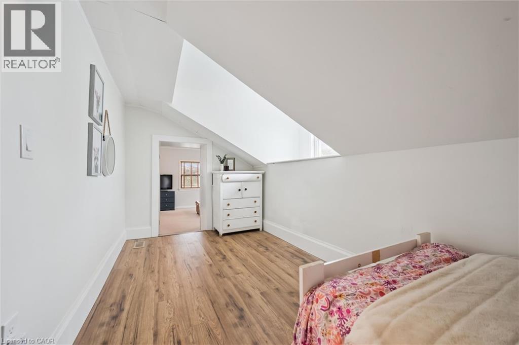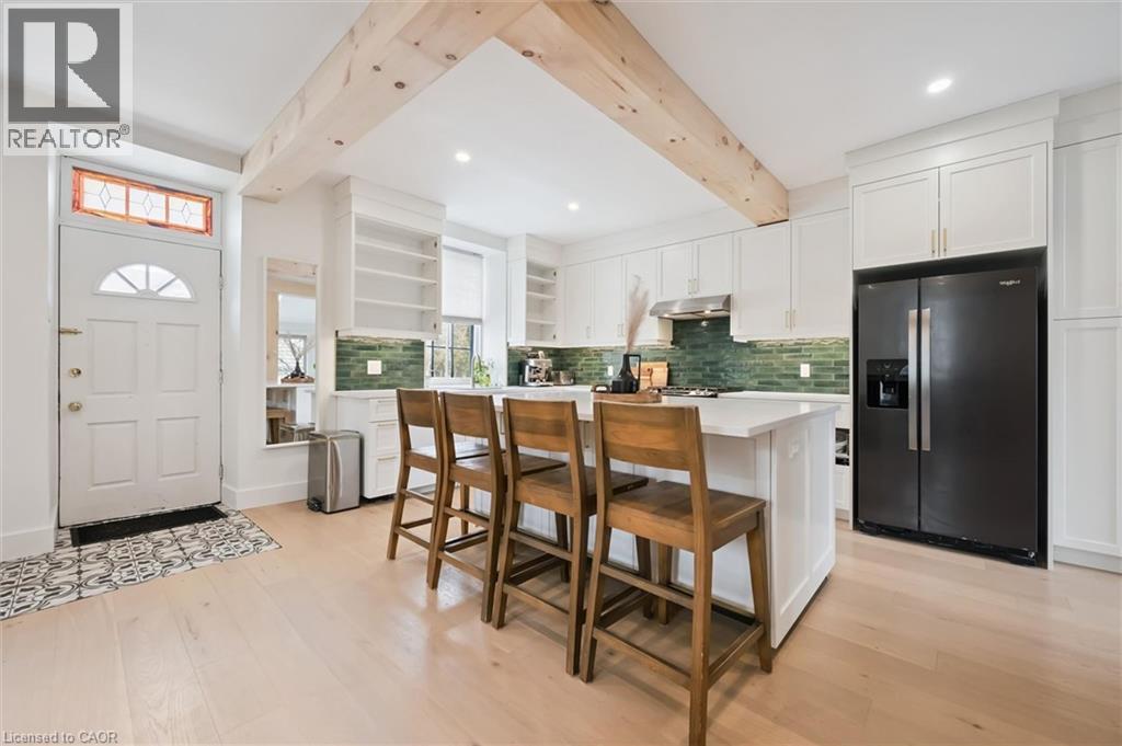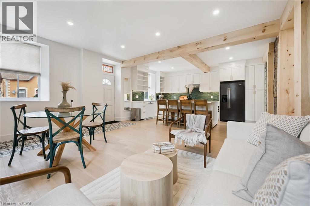 Stunning stone 4 bedroom home with character and charm. This charming 4 bedroom home has been lovingly renovated with a massive, open concept main floor living space. Beamed ceilings, exposed stone walls, new bright white chef's kitchen with quartz countertops and massive island. From the moment you step inside you'll recognize the attention to detail and the love that went into this home. Gleaming neutral hardwood, gorgeous gem toned backsplash, stainless appliances, and so much space! The high ceilings and large windows make this floor inviting and airy. The den, with abundant windows sits just off the kitchen, and a convenient main floor bedroom and newly renovated 3 piece bath with tiled shower and heated floors round out this level. Each end of the home has its own staircase, one to the oversized primary bedroom (with walk in closet) and one to the children's wing. One bedroom upstairs is connected to the primary, perfect for a nursery or office. The second floor bathroom features a clawfoot tub. The backyard is an oasis, with perennial gardens, newer deck and is fully fenced with mature trees, and a private pond. Along the side of the home a concrete pad was poured to double as extra parking and a mini basketball court. The single car garage has been insulated and drywalled and is connected to the home by an interior door. This home is truly the perfect blend of historic elegance with warmth and character, and modern conveniences. (id:51300)