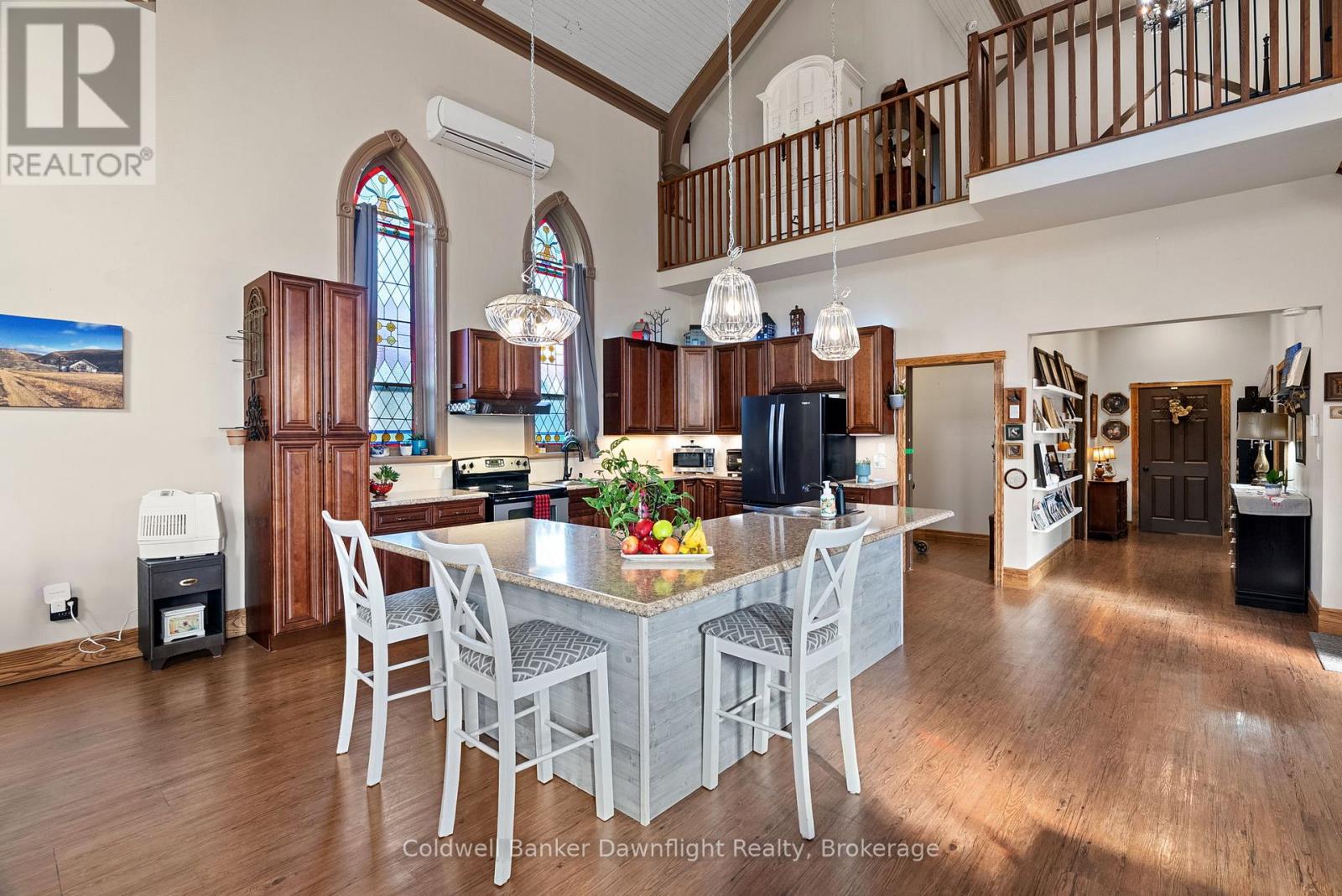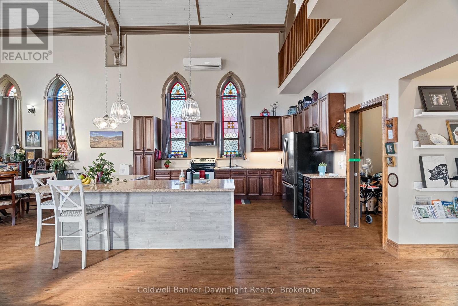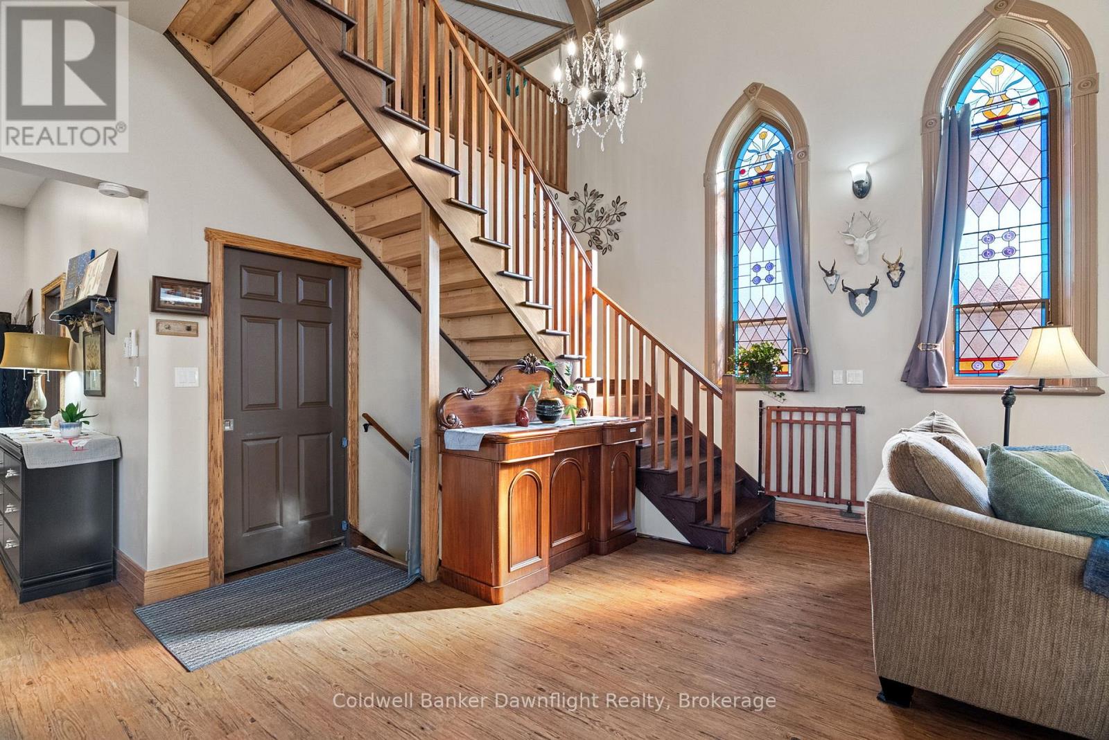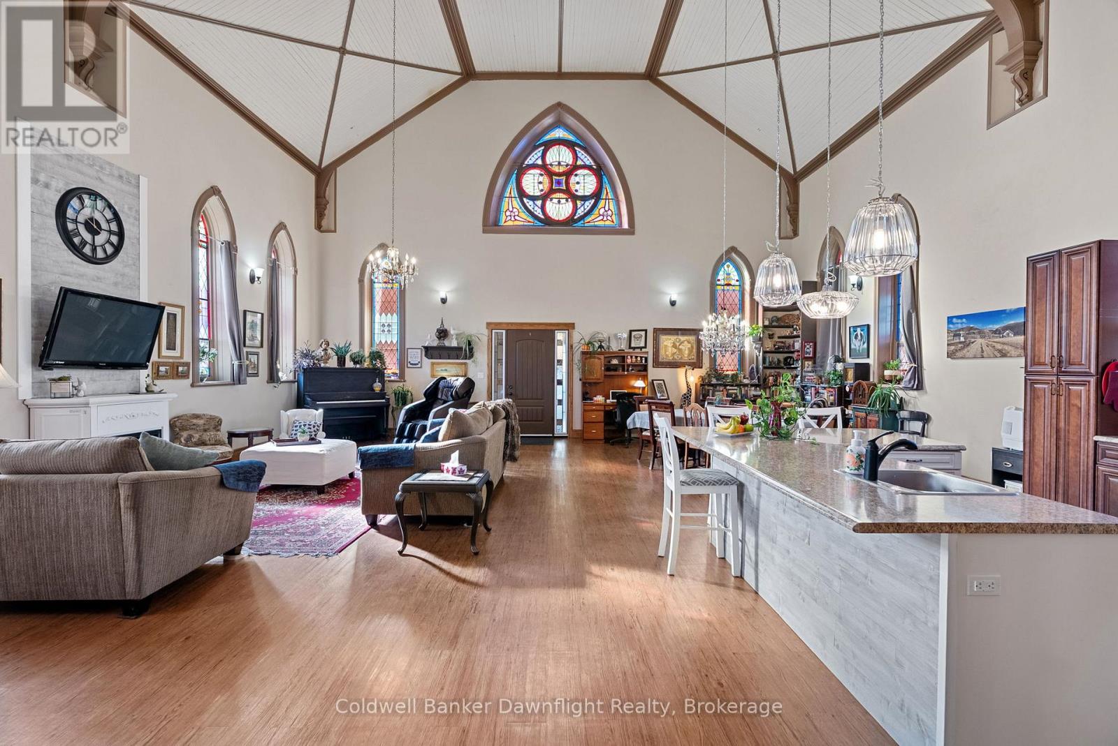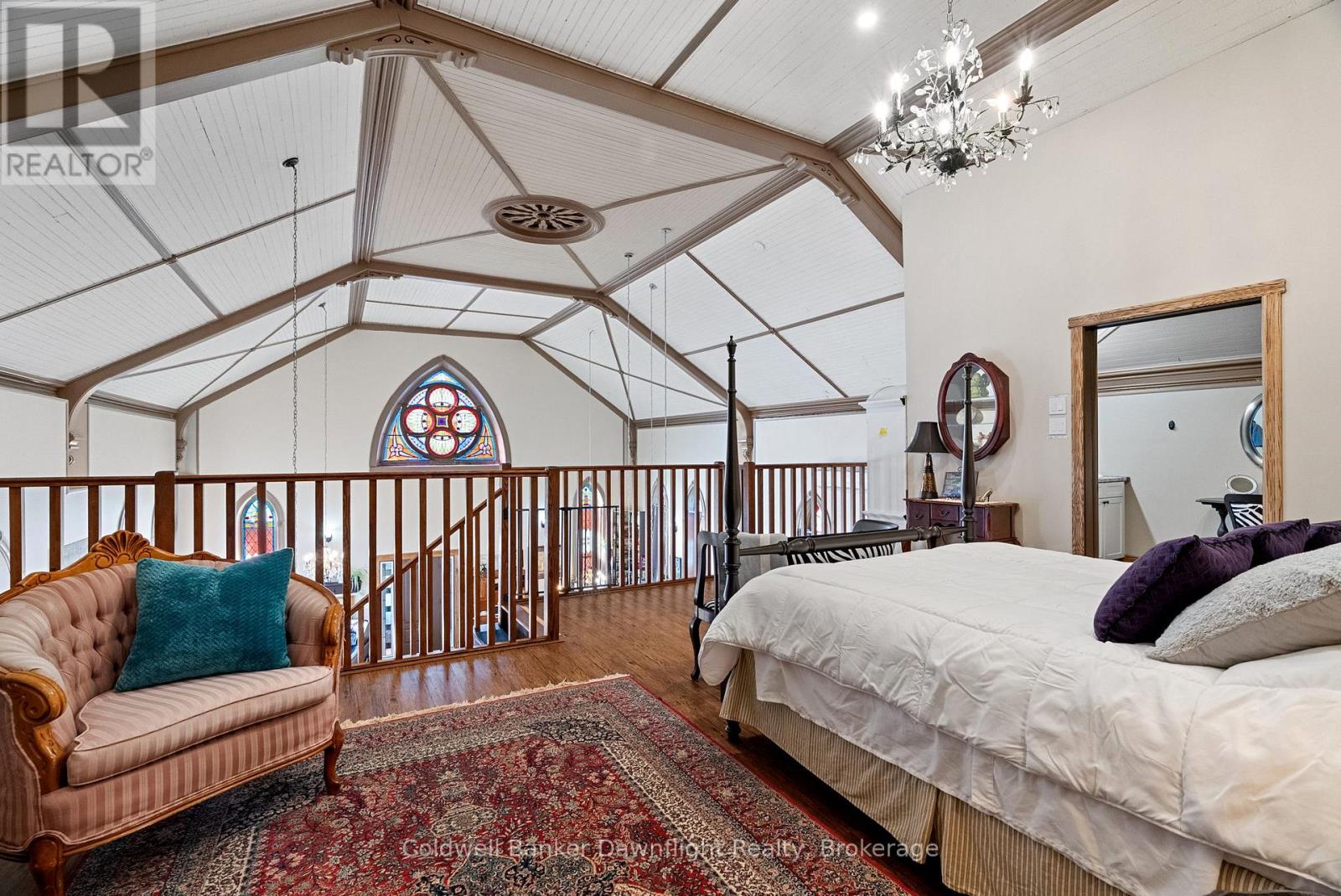 Once a place of worship, now a one of a kind residence, this 1895 brick church has been reimagined into a warm and fully livable home while preserving the character that makes it unforgettable. The moment you enter the great room, the space opens dramatically with soaring ceilings, original stained glass and an open layout designed for gathering. The main floor blends kitchen, dining and living into one impressive space anchored by a large island and framed with historic trim and arches. Also on this level is a bedroom, a 4 piece bath and main floor laundry. Upstairs, the loft style primary bedroom overlooks the main floor and features an ensuite with a double vanity and tiled walk in shower, with space for a generous wardrobe.The basement offers future potential with high ceilings, new windows, drywall started, rough ins for an additional bathroom and bedrooms and a separate entry from the front foyer which is ideal for multi use or future rental potential. Outside, the fenced yard is landscaped and offers a firepit area, storage shed with lean to and parking. The home sits in the hamlet of Whitechurch, minutes to Lucknow and Wingham for amenities and about 20 minutes to the beaches of Lake Huron.The property has also been operated as an Airbnb and has been a well loved stop for travellers and quiet getaways. The seller is open to selling it fully furnished, allowing a new owner to step into a turnkey residence or continue the Airbnb use immediately. For someone looking for more than a house, something with history, and long term potential, this converted church is a rare offering. (id:51300)