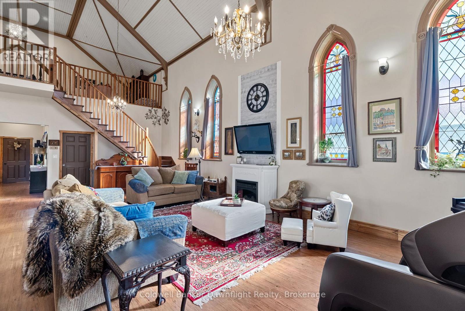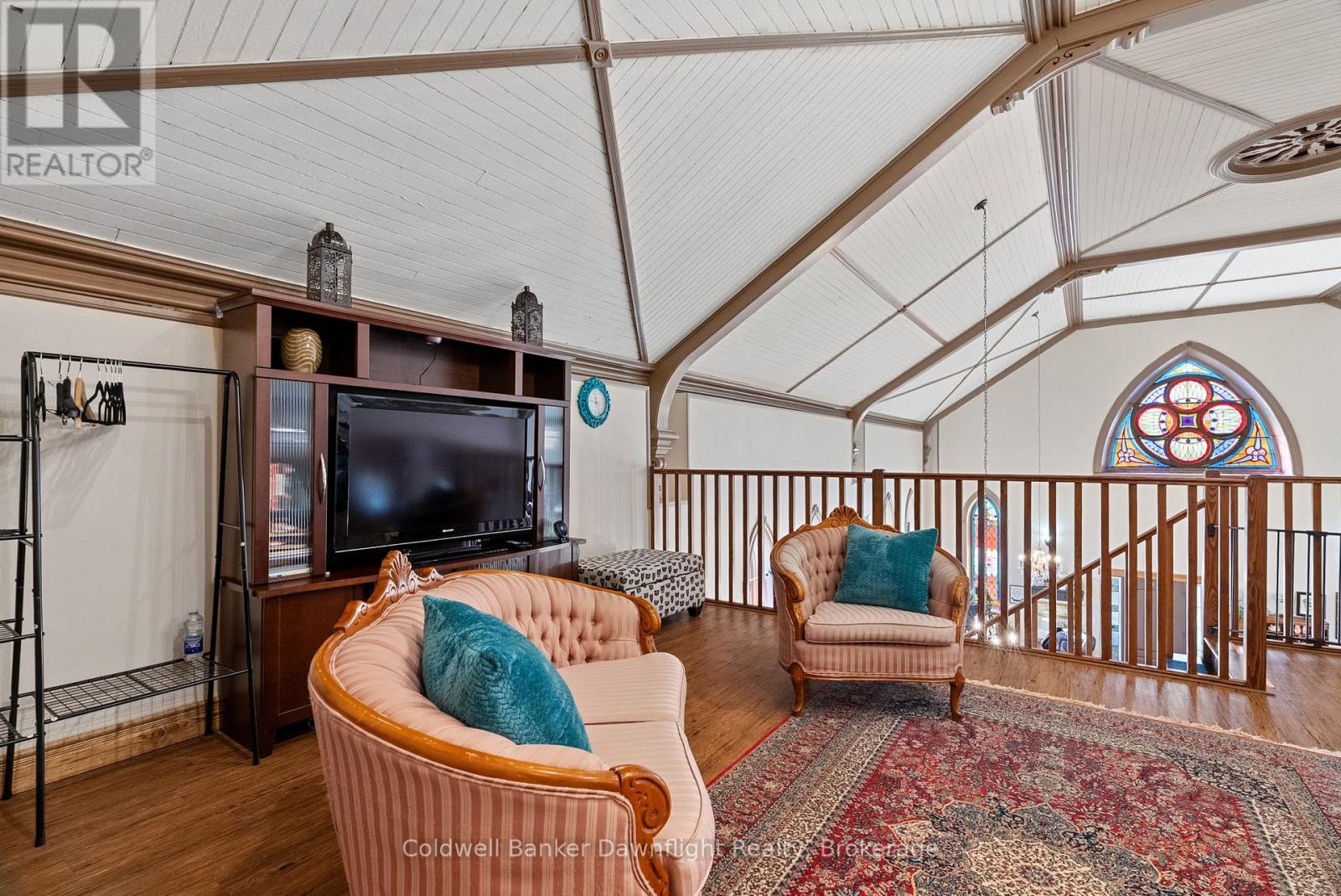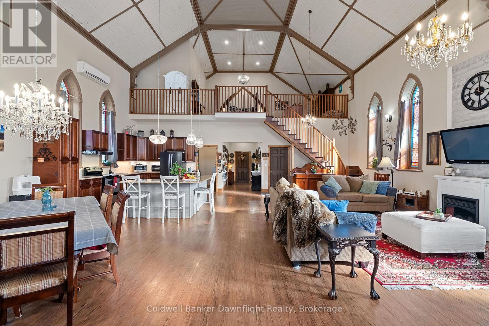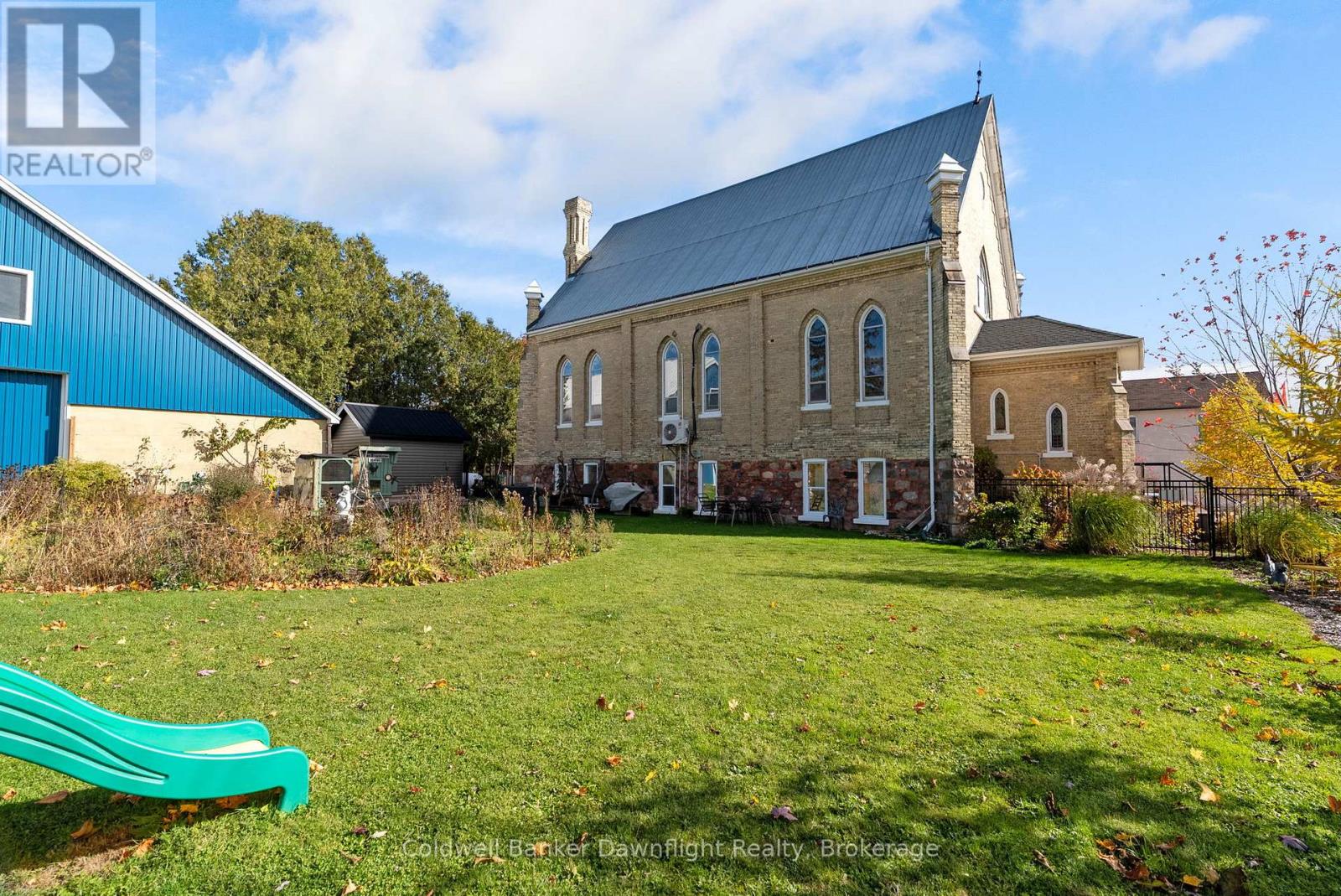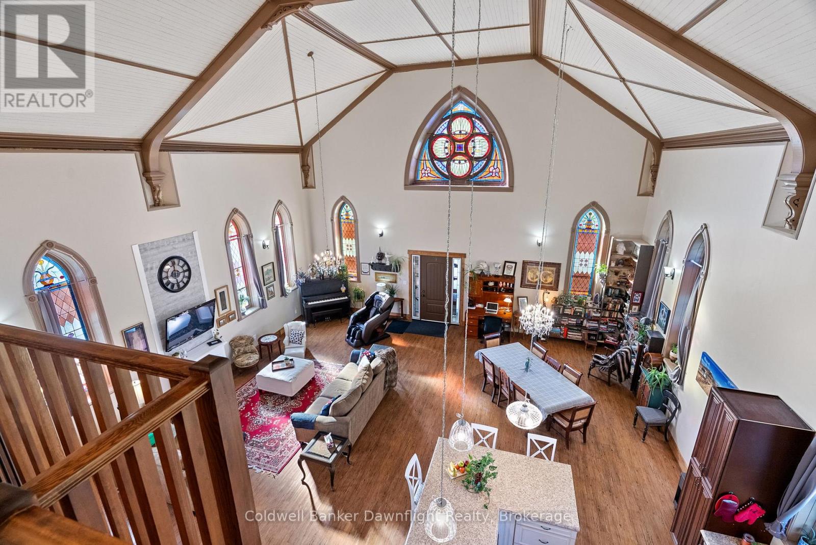 Once a place of worship, now a one of a kind residence, this 1895 brick church has been reimagined into a warm and fully livable home while preserving the character that makes it unforgettable. The moment you enter the great room, the space opens dramatically with soaring ceilings, original stained glass and an open layout designed for gathering. The main floor blends kitchen, dining and living into one impressive space anchored by a large island and framed with historic trim and arches. Also on this level is a bedroom, a 4 piece bath and main floor laundry. Upstairs, the loft style primary bedroom overlooks the main floor and features an ensuite with a double vanity and tiled walk in shower, with space for a generous wardrobe.The basement offers future potential with high ceilings, new windows, drywall started, rough ins for an additional bathroom and bedrooms and a separate entry from the front foyer which is ideal for multi use or future rental potential. Outside, the fenced yard is landscaped and offers a firepit area, storage shed with lean to and parking. The home sits in the hamlet of Whitechurch, minutes to Lucknow and Wingham for amenities and about 20 minutes to the beaches of Lake Huron.The property has also been operated as an Airbnb and has been a well loved stop for travellers and quiet getaways. The seller is open to selling it fully furnished, allowing a new owner to step into a turnkey residence or continue the Airbnb use immediately. For someone looking for more than a house, something with history, and long term potential, this converted church is a rare offering. (id:51300)