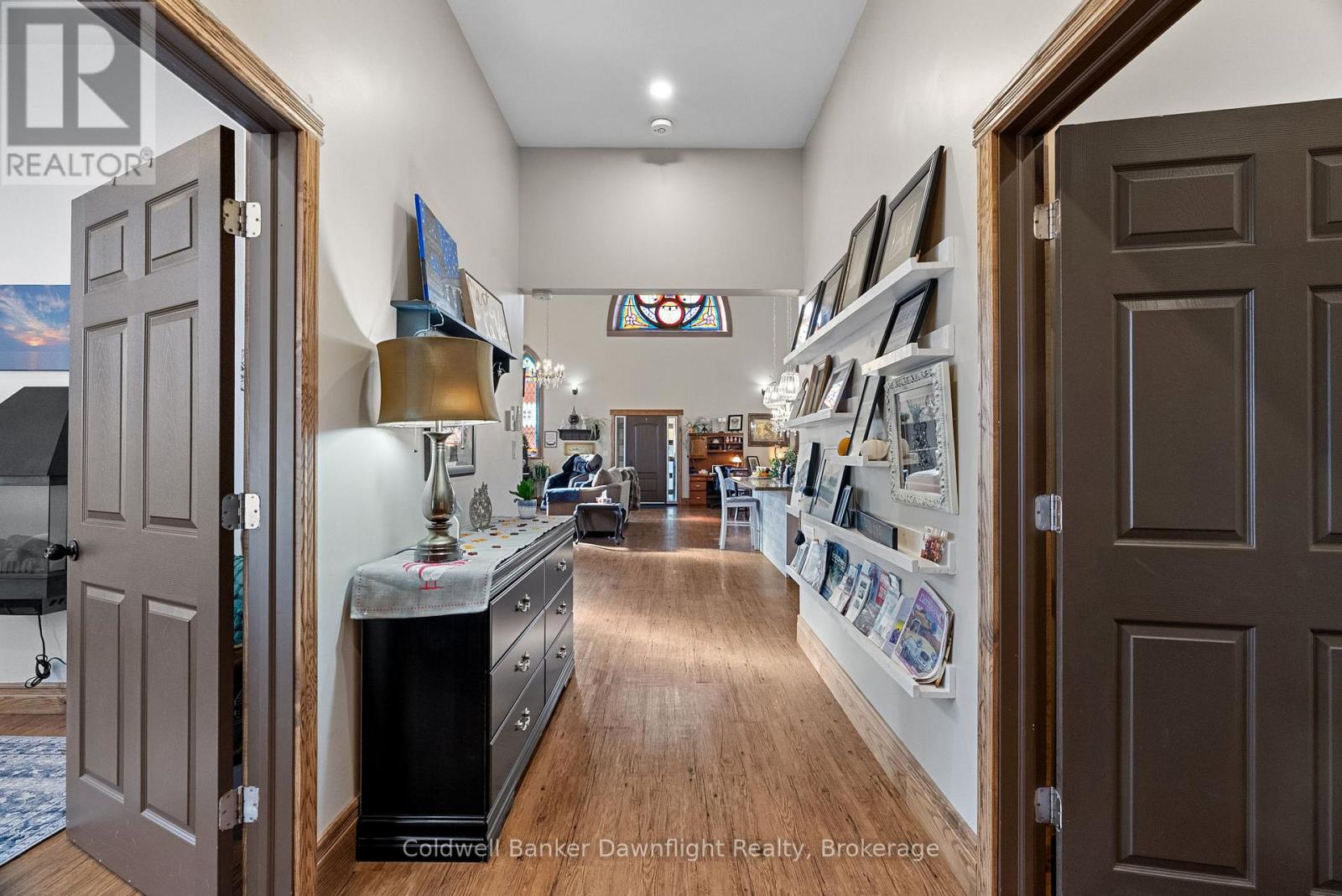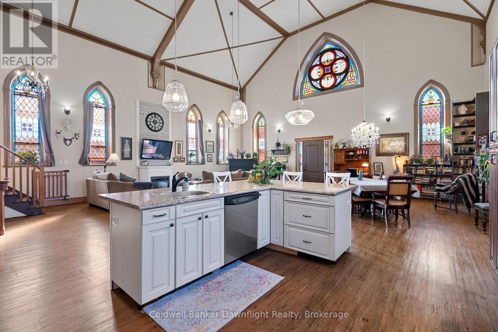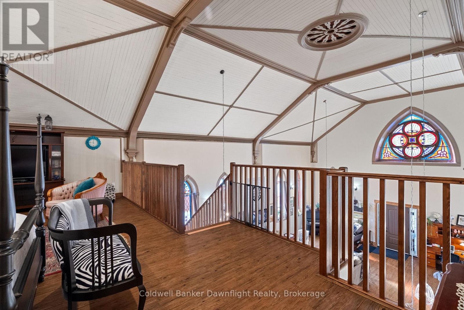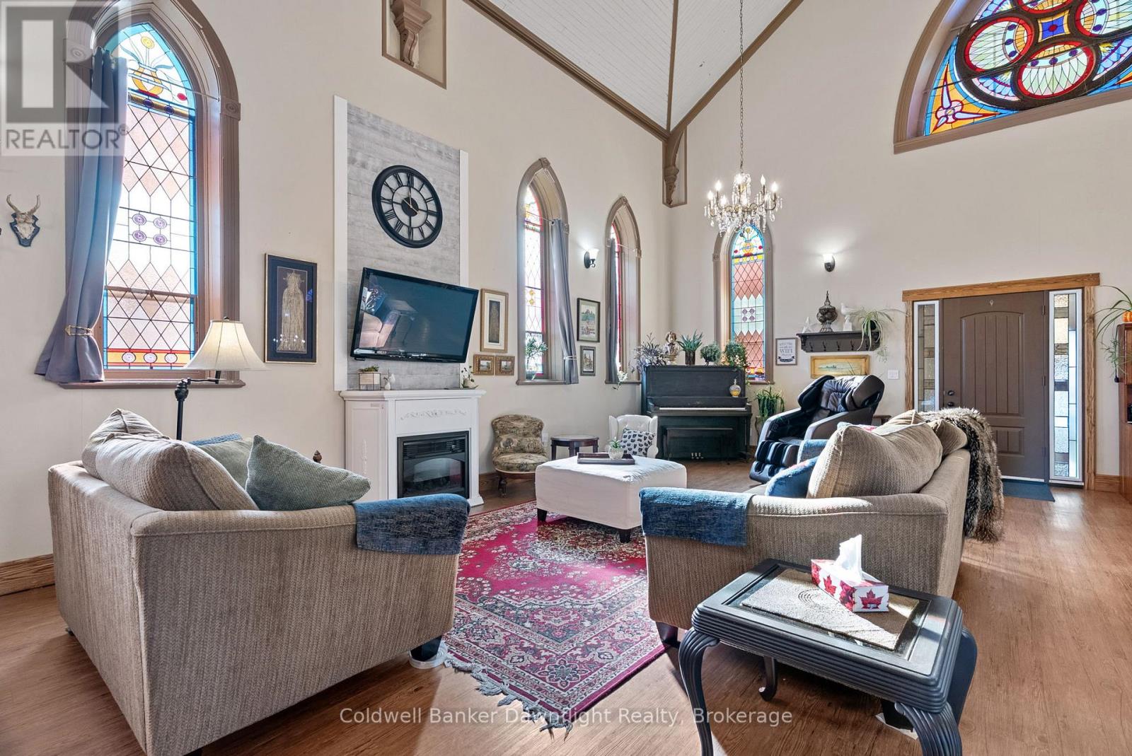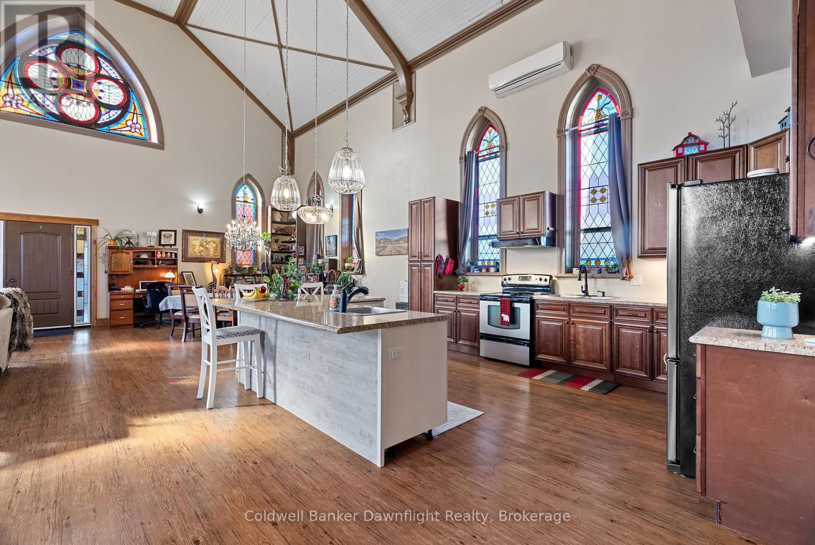 Once a place of worship, now a one of a kind residence, this 1895 brick church has been reimagined into a warm and fully livable home while preserving the character that makes it unforgettable. The moment you enter the great room, the space opens dramatically with soaring ceilings, original stained glass and an open layout designed for gathering. The main floor blends kitchen, dining and living into one impressive space anchored by a large island and framed with historic trim and arches. Also on this level is a bedroom, a 4 piece bath and main floor laundry. Upstairs, the loft style primary bedroom overlooks the main floor and features an ensuite with a double vanity and tiled walk in shower, with space for a generous wardrobe.The basement offers future potential with high ceilings, new windows, drywall started, rough ins for an additional bathroom and bedrooms and a separate entry from the front foyer which is ideal for multi use or future rental potential. Outside, the fenced yard is landscaped and offers a firepit area, storage shed with lean to and parking. The home sits in the hamlet of Whitechurch, minutes to Lucknow and Wingham for amenities and about 20 minutes to the beaches of Lake Huron.The property has also been operated as an Airbnb and has been a well loved stop for travellers and quiet getaways. The seller is open to selling it fully furnished, allowing a new owner to step into a turnkey residence or continue the Airbnb use immediately. For someone looking for more than a house, something with history, and long term potential, this converted church is a rare offering. (id:51300)