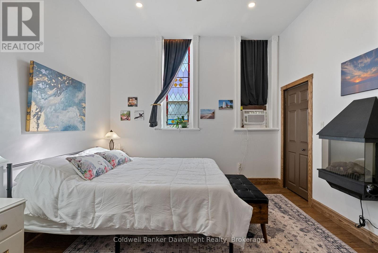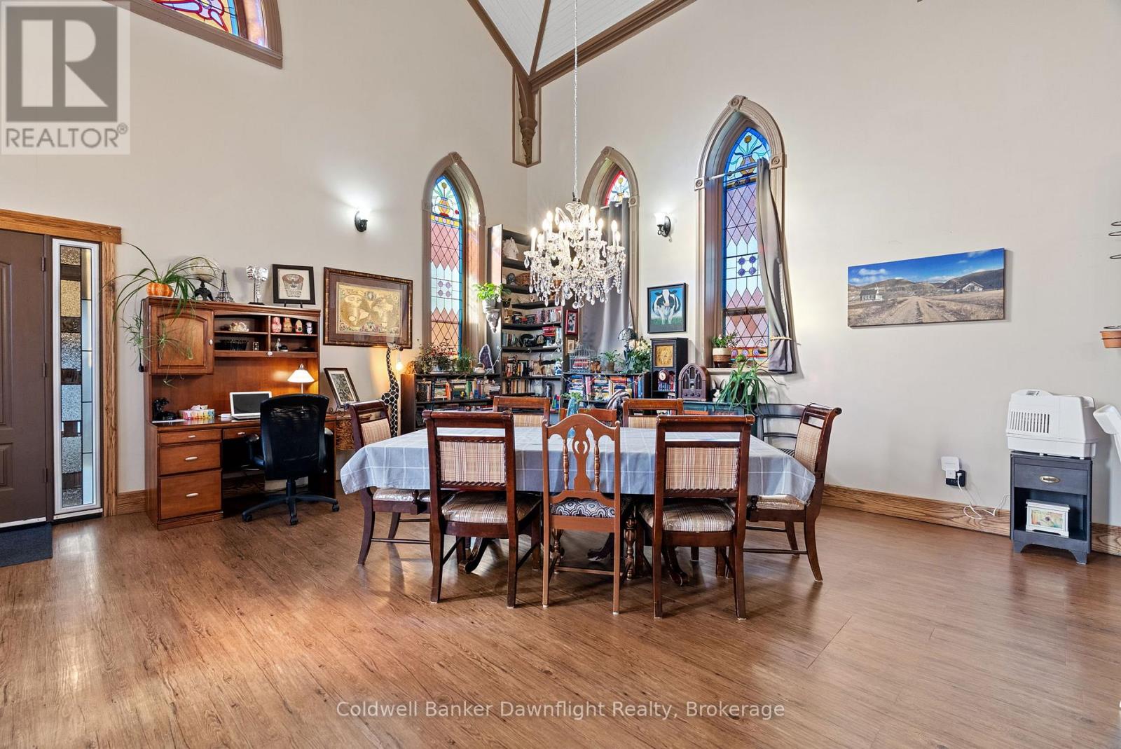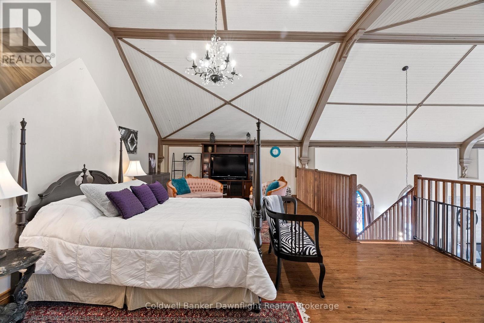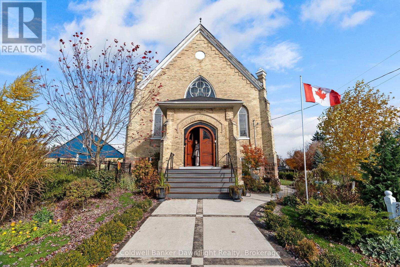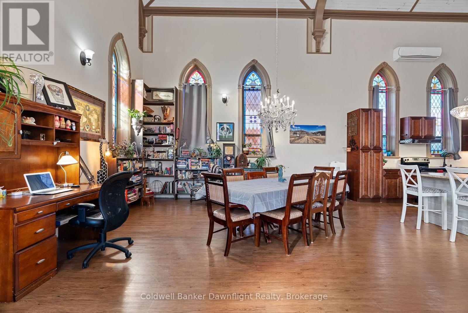 Once a place of worship, now a one of a kind residence, this 1895 brick church has been reimagined into a warm and fully livable home while preserving the character that makes it unforgettable. The moment you enter the great room, the space opens dramatically with soaring ceilings, original stained glass and an open layout designed for gathering. The main floor blends kitchen, dining and living into one impressive space anchored by a large island and framed with historic trim and arches. Also on this level is a bedroom, a 4 piece bath and main floor laundry. Upstairs, the loft style primary bedroom overlooks the main floor and features an ensuite with a double vanity and tiled walk in shower, with space for a generous wardrobe.The basement offers future potential with high ceilings, new windows, drywall started, rough ins for an additional bathroom and bedrooms and a separate entry from the front foyer which is ideal for multi use or future rental potential. Outside, the fenced yard is landscaped and offers a firepit area, storage shed with lean to and parking. The home sits in the hamlet of Whitechurch, minutes to Lucknow and Wingham for amenities and about 20 minutes to the beaches of Lake Huron.The property has also been operated as an Airbnb and has been a well loved stop for travellers and quiet getaways. The seller is open to selling it fully furnished, allowing a new owner to step into a turnkey residence or continue the Airbnb use immediately. For someone looking for more than a house, something with history, and long term potential, this converted church is a rare offering. (id:51300)
