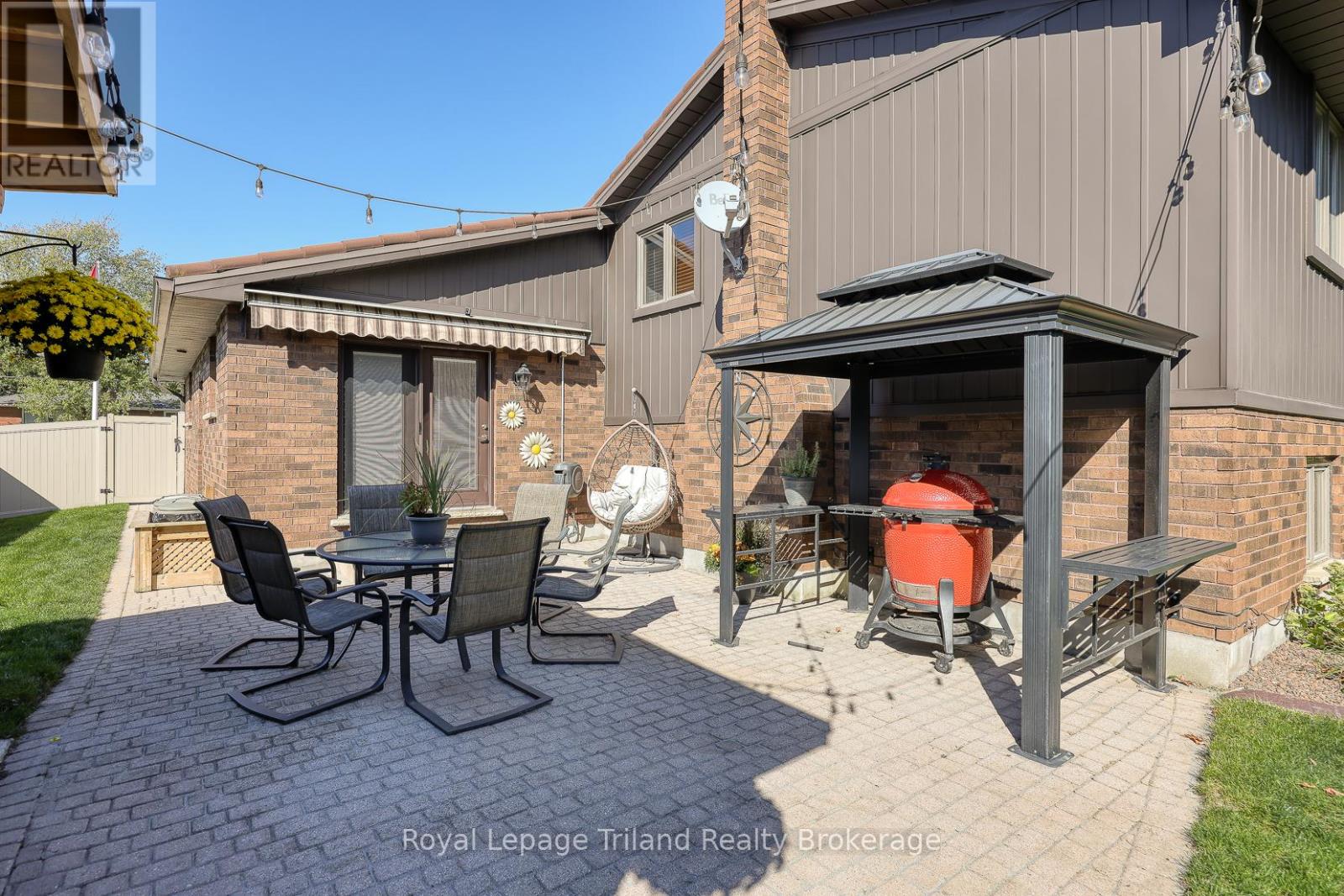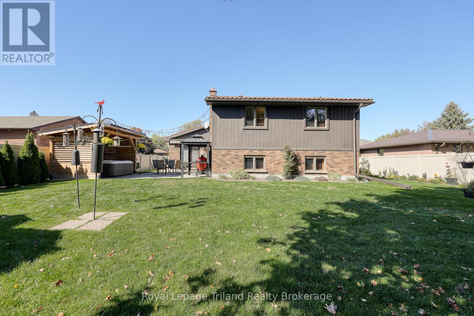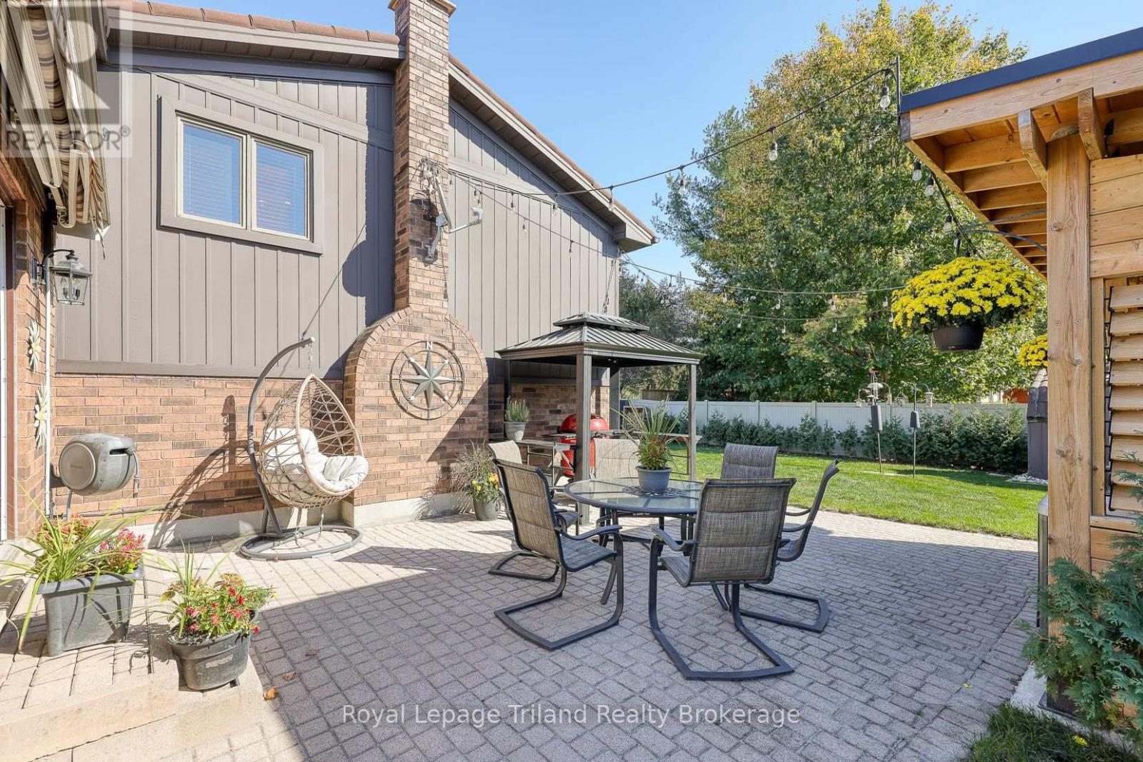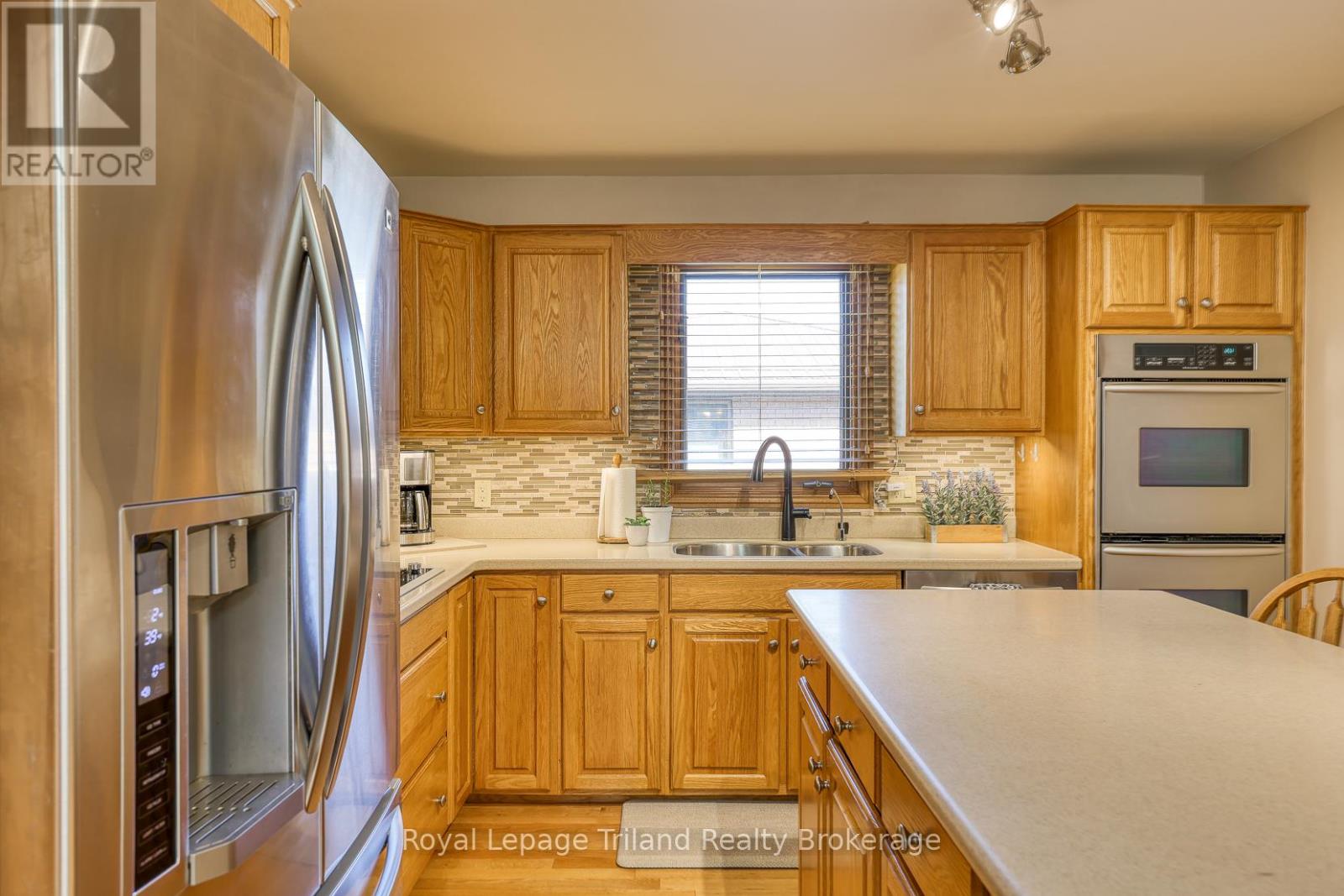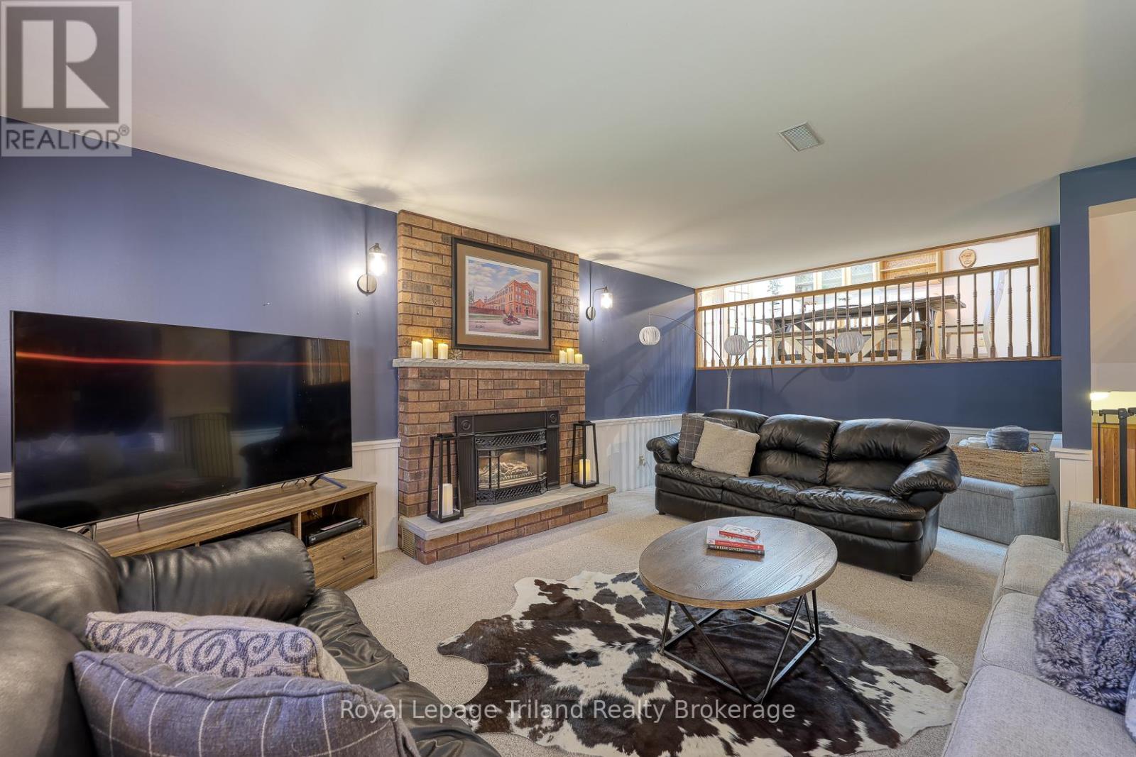 Back Split Beauty on Brock! Small-town charm meets family-friendly function. This 2-bath, 3-bedroom, 4-level brick back split blends comfort, character & curb appeal - plus an exceptional heated 2-car garage! Set on an oversized 78 x 132 ft lot, the manicured landscaping & welcoming porch make a picture-perfect first impression. Inside, 2856 SF of thoughtful design & custom quality shine! Solid wood doors run throughout & hardwood flows from the foyer to the open kitchen, dining & sunroom - a bright, connected space as functional as it is inviting. The living rm, accented by a bay window, offers a separate spot for conversation/relaxation. The kitchen is the heart of the home - oak cabinetry, solid-surface counters, built-in SS appliances (double wall ovens) & a large island with breakfast bar anchor the space. You'll love the custom coffee station and skylights that flood the dining area with light. From here, sightlines extend over the family room below, giving the home its open, airy flow. French doors lead to a standout sunroom/flex space with garden doors to the patio & inside access from the garage - a stylish drop zone, play space or work-from-home haven. Upstairs, 3 comfortable bedrooms share a 4-pce bath with a privilege door to the primary. The lower level features a bright family room with fireplace, games/bar area, & a 3-pce bath-perfect for gatherings of any size. One level down, discover 9.5-ft ceilings, a flex room ready as a gym, rec space or future 4th bdrm, & a workshop/storage area with walk-up to the finished, heated garage with epoxy flooring - a showstopper for hobbyists or auto buffs! Step outside & exhale. The private yard offers newer vinyl fencing, patio, newer hot tub in a privacy gazebo, & fire-pit zone made for laughter & late nights. Steel roof, parking for 6 & in-law potential - a complete family package! 15 min to London or Woodstock, an easy stroll to parks, arena, library & amenities. A property that fits family life beautifully. (id:51300)
