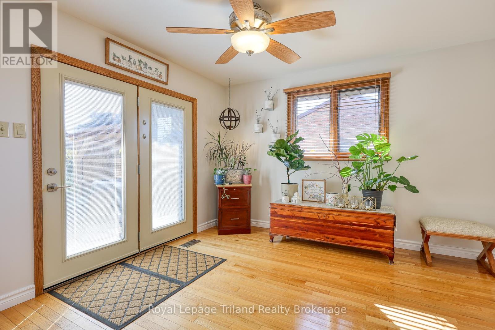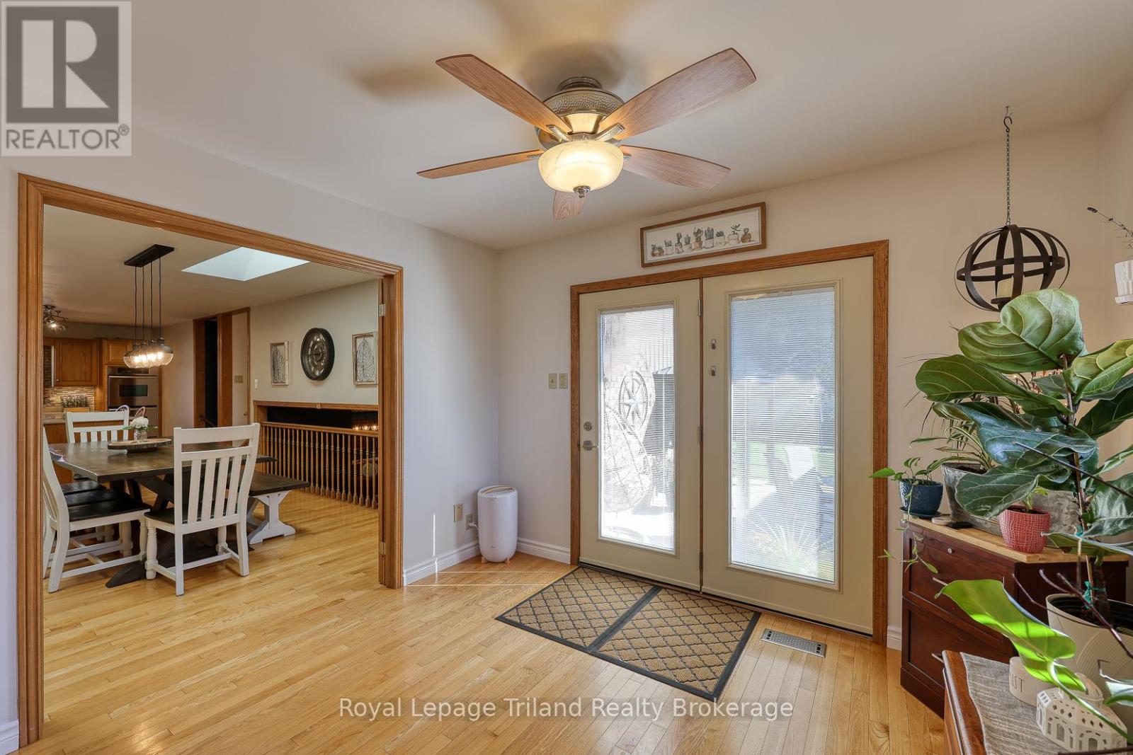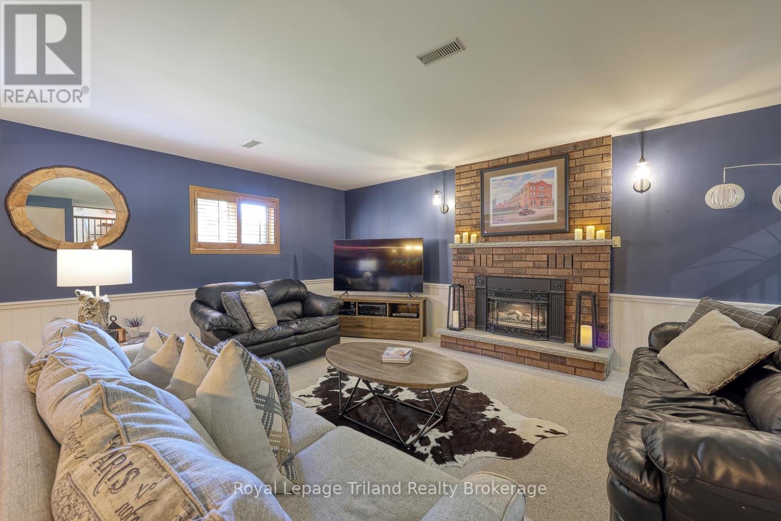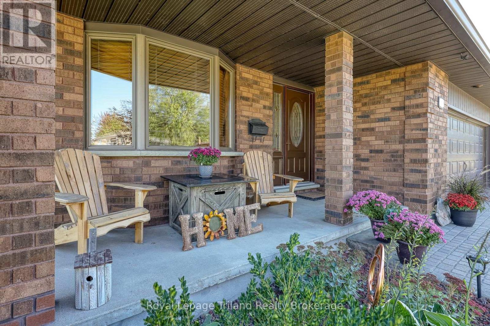 Back Split Beauty on Brock! Small-town charm meets family-friendly function. This 2-bath, 3-bedroom, 4-level brick back split blends comfort, character & curb appeal - plus an exceptional heated 2-car garage! Set on an oversized 78 x 132 ft lot, the manicured landscaping & welcoming porch make a picture-perfect first impression. Inside, 2856 SF of thoughtful design & custom quality shine! Solid wood doors run throughout & hardwood flows from the foyer to the open kitchen, dining & sunroom - a bright, connected space as functional as it is inviting. The living rm, accented by a bay window, offers a separate spot for conversation/relaxation. The kitchen is the heart of the home - oak cabinetry, solid-surface counters, built-in SS appliances (double wall ovens) & a large island with breakfast bar anchor the space. You'll love the custom coffee station and skylights that flood the dining area with light. From here, sightlines extend over the family room below, giving the home its open, airy flow. French doors lead to a standout sunroom/flex space with garden doors to the patio & inside access from the garage - a stylish drop zone, play space or work-from-home haven. Upstairs, 3 comfortable bedrooms share a 4-pce bath with a privilege door to the primary. The lower level features a bright family room with fireplace, games/bar area, & a 3-pce bath-perfect for gatherings of any size. One level down, discover 9.5-ft ceilings, a flex room ready as a gym, rec space or future 4th bdrm, & a workshop/storage area with walk-up to the finished, heated garage with epoxy flooring - a showstopper for hobbyists or auto buffs! Step outside & exhale. The private yard offers newer vinyl fencing, patio, newer hot tub in a privacy gazebo, & fire-pit zone made for laughter & late nights. Steel roof, parking for 6 & in-law potential - a complete family package! 15 min to London or Woodstock, an easy stroll to parks, arena, library & amenities. A property that fits family life beautifully. (id:51300)