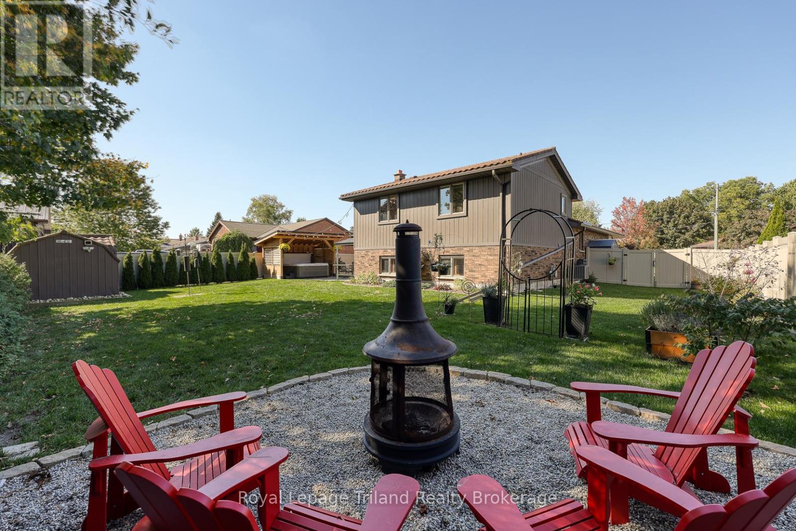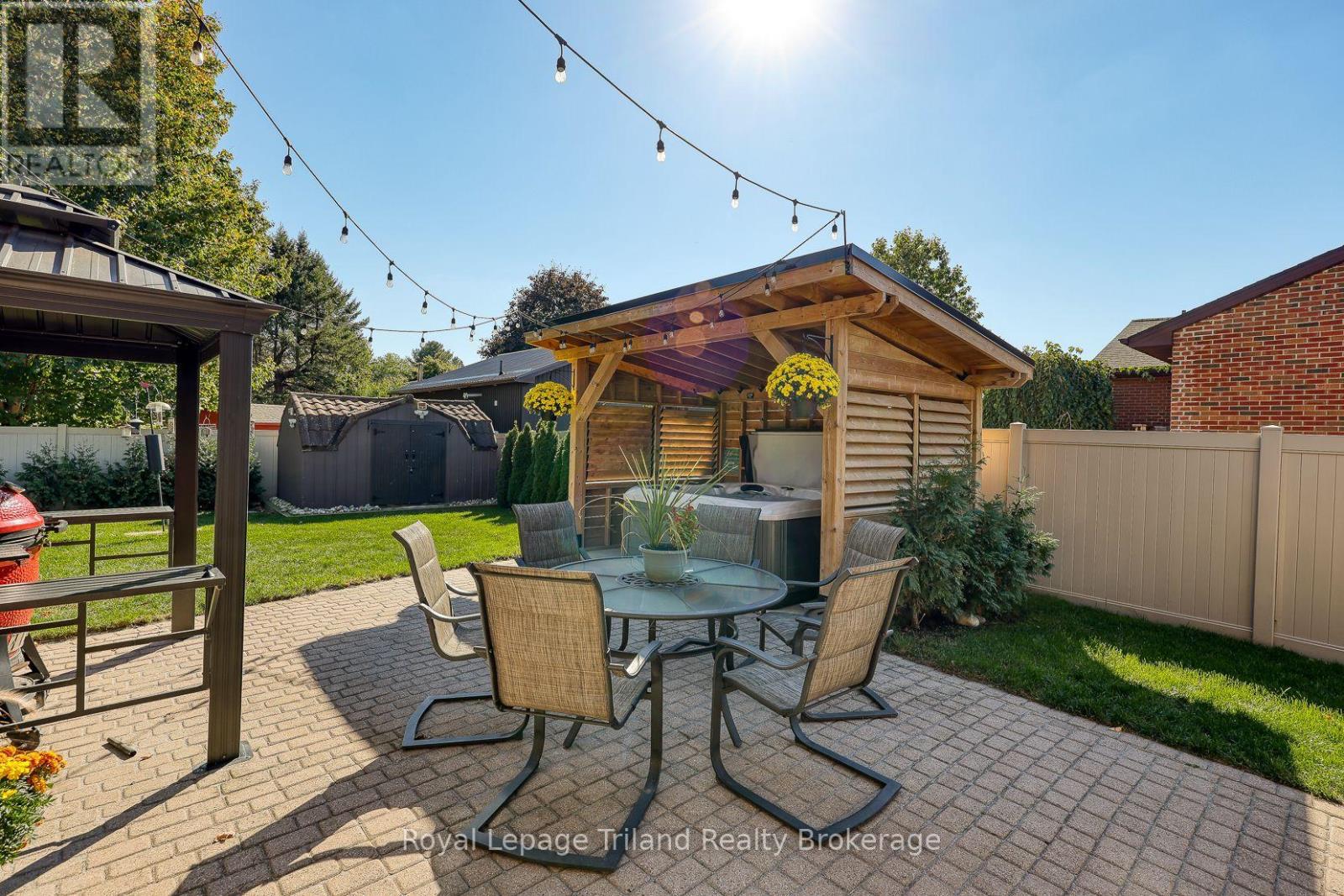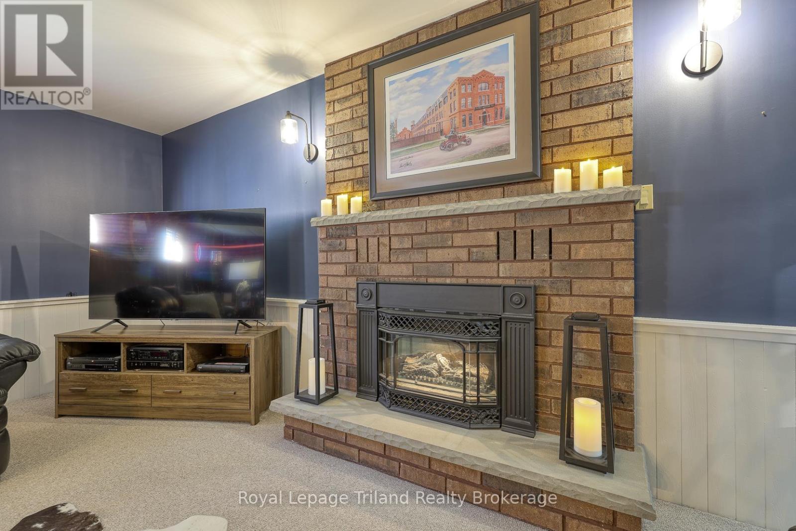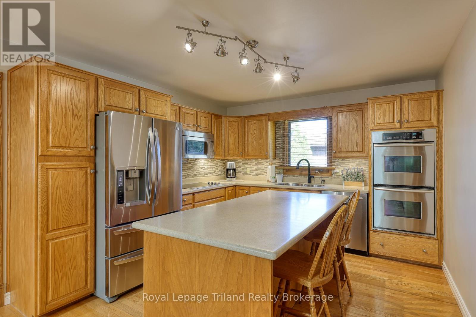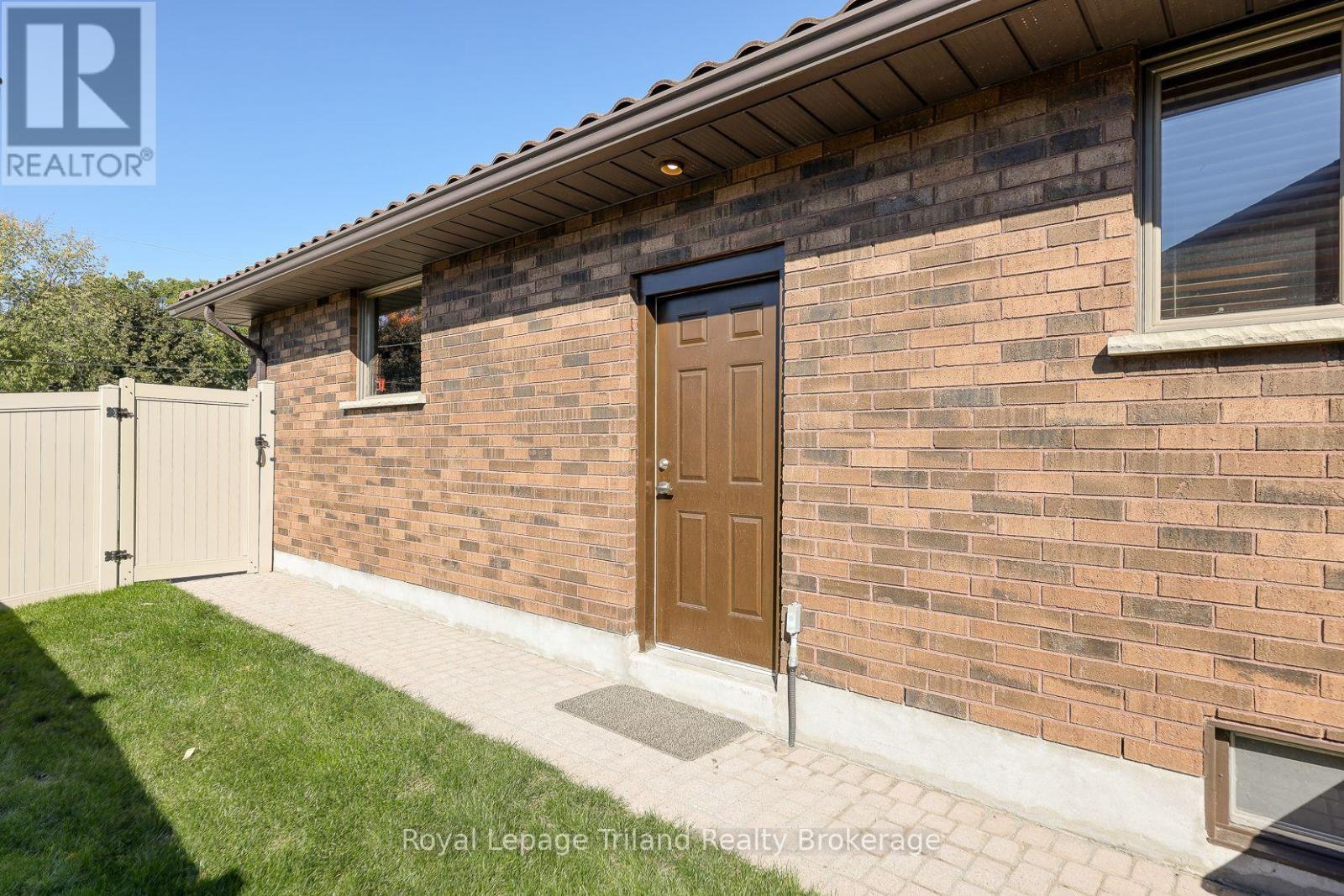 Back Split Beauty on Brock! Small-town charm meets family-friendly function. This 2-bath, 3-bedroom, 4-level brick back split blends comfort, character & curb appeal - plus an exceptional heated 2-car garage! Set on an oversized 78 x 132 ft lot, the manicured landscaping & welcoming porch make a picture-perfect first impression. Inside, 2856 SF of thoughtful design & custom quality shine! Solid wood doors run throughout & hardwood flows from the foyer to the open kitchen, dining & sunroom - a bright, connected space as functional as it is inviting. The living rm, accented by a bay window, offers a separate spot for conversation/relaxation. The kitchen is the heart of the home - oak cabinetry, solid-surface counters, built-in SS appliances (double wall ovens) & a large island with breakfast bar anchor the space. You'll love the custom coffee station and skylights that flood the dining area with light. From here, sightlines extend over the family room below, giving the home its open, airy flow. French doors lead to a standout sunroom/flex space with garden doors to the patio & inside access from the garage - a stylish drop zone, play space or work-from-home haven. Upstairs, 3 comfortable bedrooms share a 4-pce bath with a privilege door to the primary. The lower level features a bright family room with fireplace, games/bar area, & a 3-pce bath-perfect for gatherings of any size. One level down, discover 9.5-ft ceilings, a flex room ready as a gym, rec space or future 4th bdrm, & a workshop/storage area with walk-up to the finished, heated garage with epoxy flooring - a showstopper for hobbyists or auto buffs! Step outside & exhale. The private yard offers newer vinyl fencing, patio, newer hot tub in a privacy gazebo, & fire-pit zone made for laughter & late nights. Steel roof, parking for 6 & in-law potential - a complete family package! 15 min to London or Woodstock, an easy stroll to parks, arena, library & amenities. A property that fits family life beautifully. (id:51300)