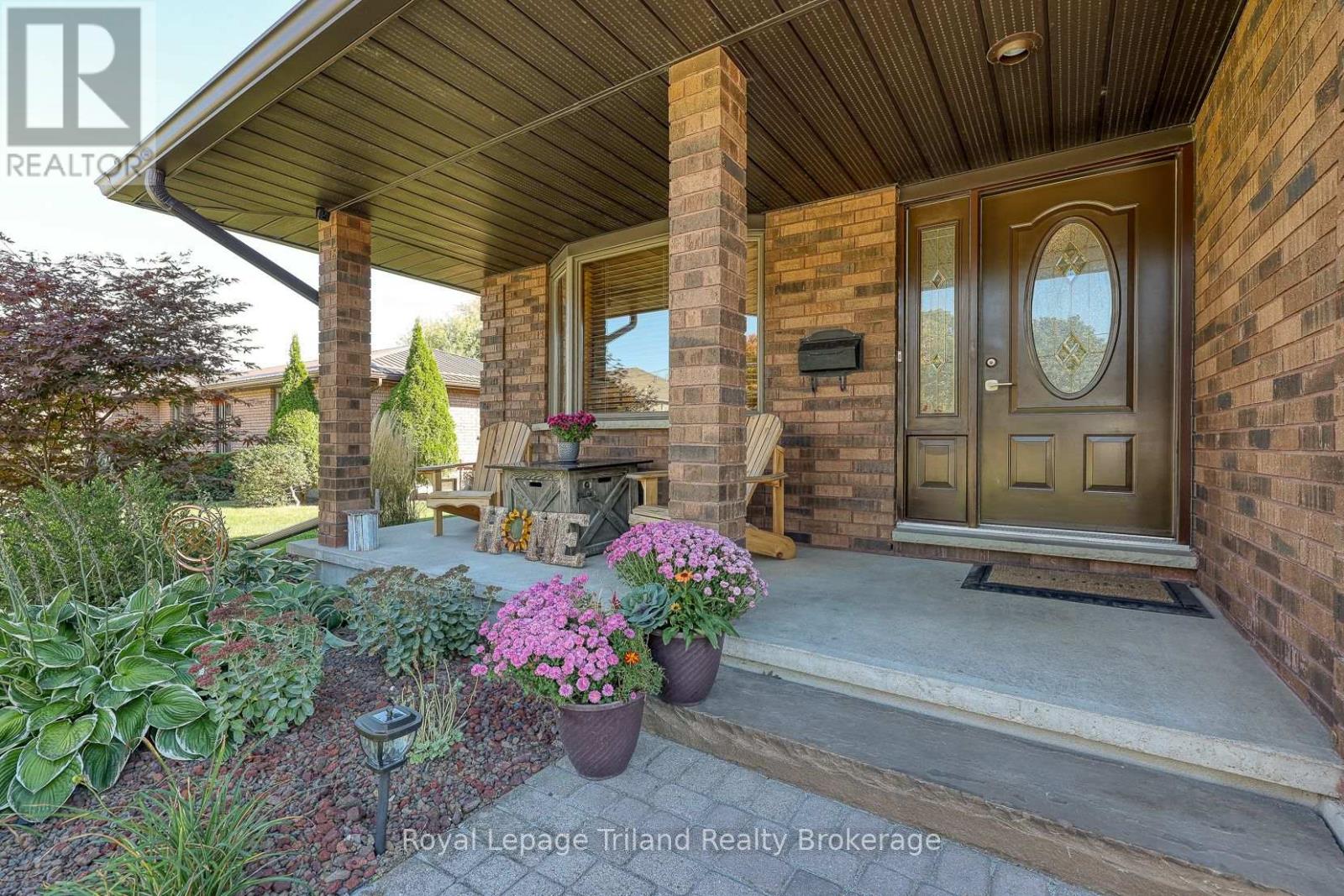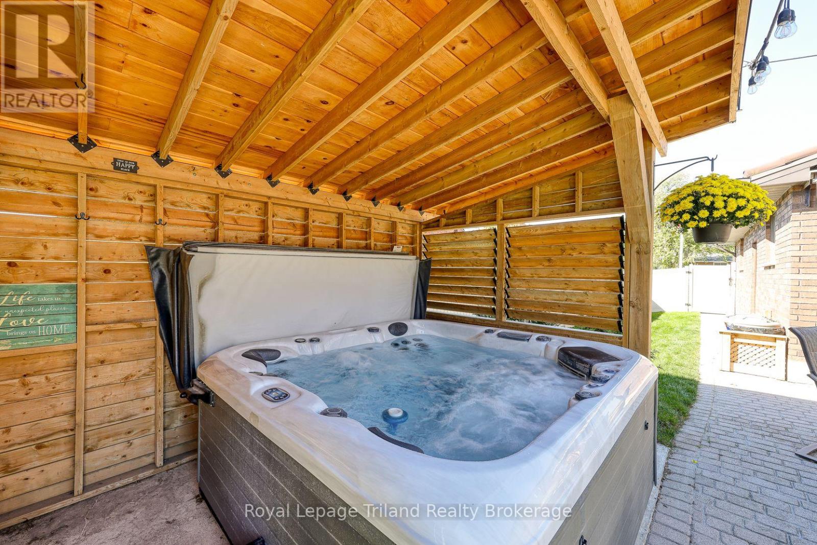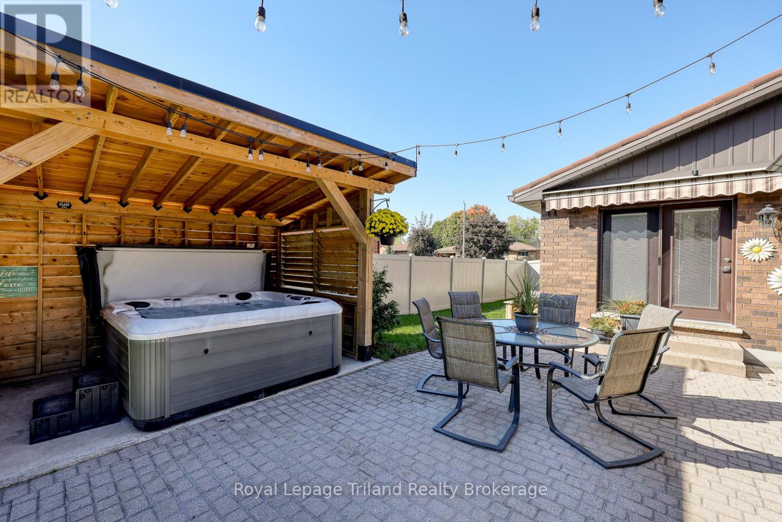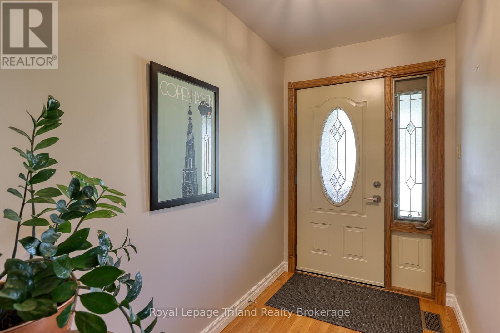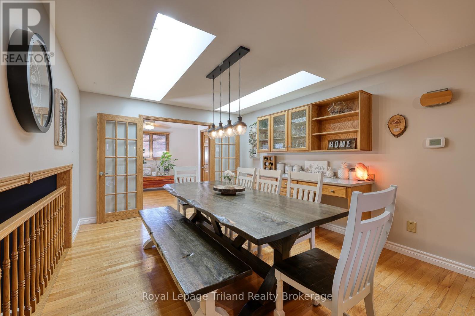 Back Split Beauty on Brock! Small-town charm meets family-friendly function. This 2-bath, 3-bedroom, 4-level brick back split blends comfort, character & curb appeal - plus an exceptional heated 2-car garage! Set on an oversized 78 x 132 ft lot, the manicured landscaping & welcoming porch make a picture-perfect first impression. Inside, 2856 SF of thoughtful design & custom quality shine! Solid wood doors run throughout & hardwood flows from the foyer to the open kitchen, dining & sunroom - a bright, connected space as functional as it is inviting. The living rm, accented by a bay window, offers a separate spot for conversation/relaxation. The kitchen is the heart of the home - oak cabinetry, solid-surface counters, built-in SS appliances (double wall ovens) & a large island with breakfast bar anchor the space. You'll love the custom coffee station and skylights that flood the dining area with light. From here, sightlines extend over the family room below, giving the home its open, airy flow. French doors lead to a standout sunroom/flex space with garden doors to the patio & inside access from the garage - a stylish drop zone, play space or work-from-home haven. Upstairs, 3 comfortable bedrooms share a 4-pce bath with a privilege door to the primary. The lower level features a bright family room with fireplace, games/bar area, & a 3-pce bath-perfect for gatherings of any size. One level down, discover 9.5-ft ceilings, a flex room ready as a gym, rec space or future 4th bdrm, & a workshop/storage area with walk-up to the finished, heated garage with epoxy flooring - a showstopper for hobbyists or auto buffs! Step outside & exhale. The private yard offers newer vinyl fencing, patio, newer hot tub in a privacy gazebo, & fire-pit zone made for laughter & late nights. Steel roof, parking for 6 & in-law potential - a complete family package! 15 min to London or Woodstock, an easy stroll to parks, arena, library & amenities. A property that fits family life beautifully. (id:51300)