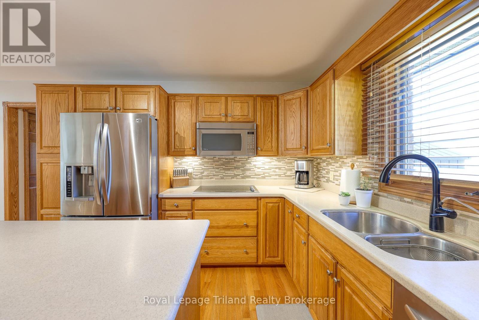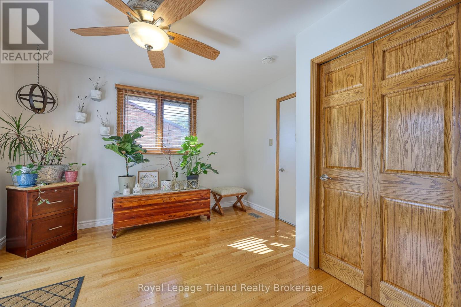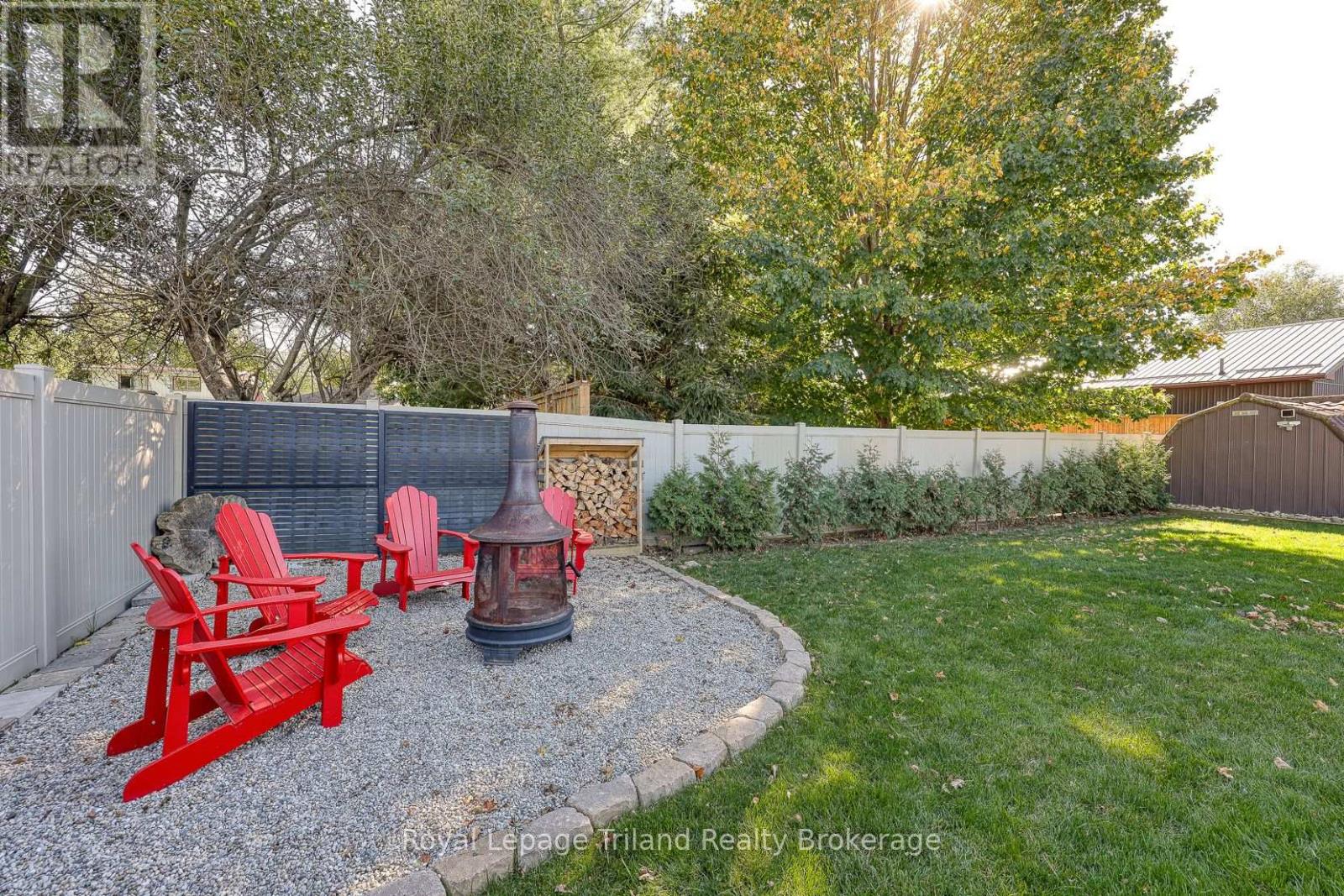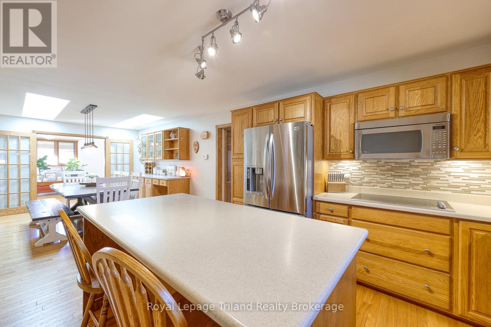 Back Split Beauty on Brock! Small-town charm meets family-friendly function. This 2-bath, 3-bedroom, 4-level brick back split blends comfort, character & curb appeal - plus an exceptional heated 2-car garage! Set on an oversized 78 x 132 ft lot, the manicured landscaping & welcoming porch make a picture-perfect first impression. Inside, 2856 SF of thoughtful design & custom quality shine! Solid wood doors run throughout & hardwood flows from the foyer to the open kitchen, dining & sunroom - a bright, connected space as functional as it is inviting. The living rm, accented by a bay window, offers a separate spot for conversation/relaxation. The kitchen is the heart of the home - oak cabinetry, solid-surface counters, built-in SS appliances (double wall ovens) & a large island with breakfast bar anchor the space. You'll love the custom coffee station and skylights that flood the dining area with light. From here, sightlines extend over the family room below, giving the home its open, airy flow. French doors lead to a standout sunroom/flex space with garden doors to the patio & inside access from the garage - a stylish drop zone, play space or work-from-home haven. Upstairs, 3 comfortable bedrooms share a 4-pce bath with a privilege door to the primary. The lower level features a bright family room with fireplace, games/bar area, & a 3-pce bath-perfect for gatherings of any size. One level down, discover 9.5-ft ceilings, a flex room ready as a gym, rec space or future 4th bdrm, & a workshop/storage area with walk-up to the finished, heated garage with epoxy flooring - a showstopper for hobbyists or auto buffs! Step outside & exhale. The private yard offers newer vinyl fencing, patio, newer hot tub in a privacy gazebo, & fire-pit zone made for laughter & late nights. Steel roof, parking for 6 & in-law potential - a complete family package! 15 min to London or Woodstock, an easy stroll to parks, arena, library & amenities. A property that fits family life beautifully. (id:51300)