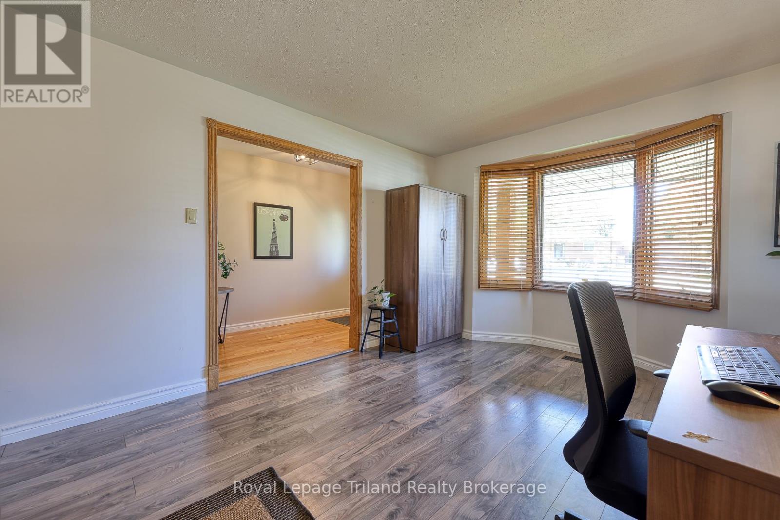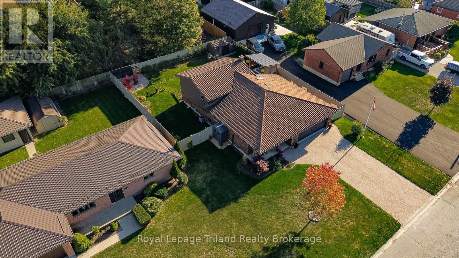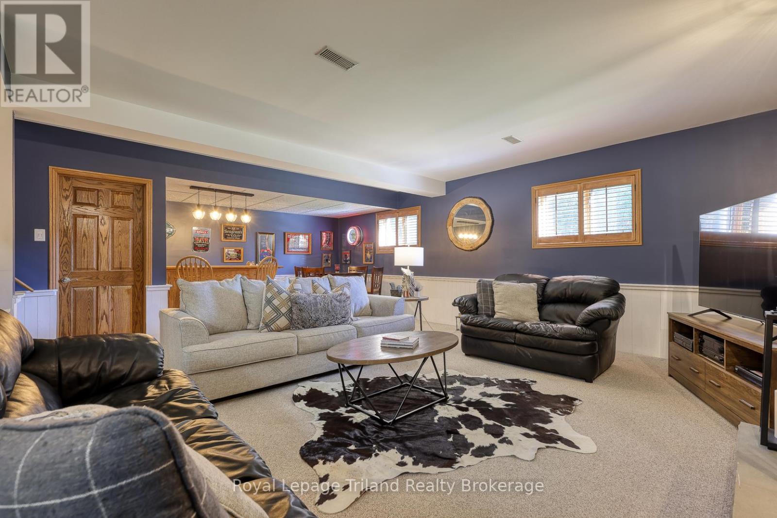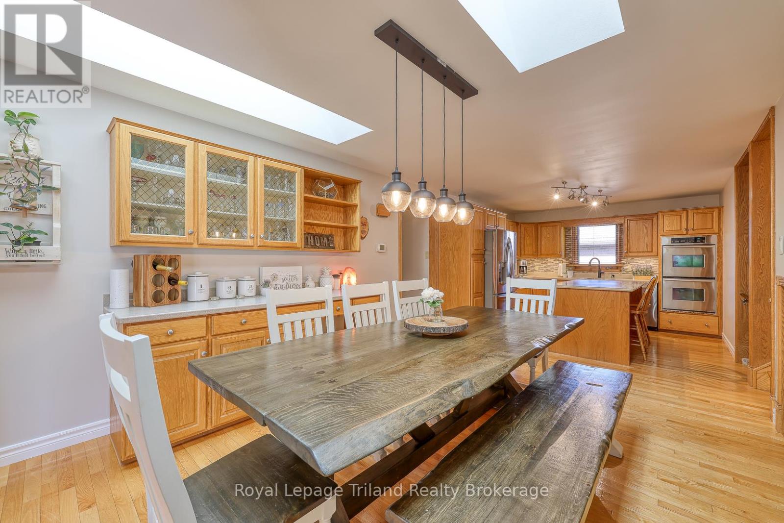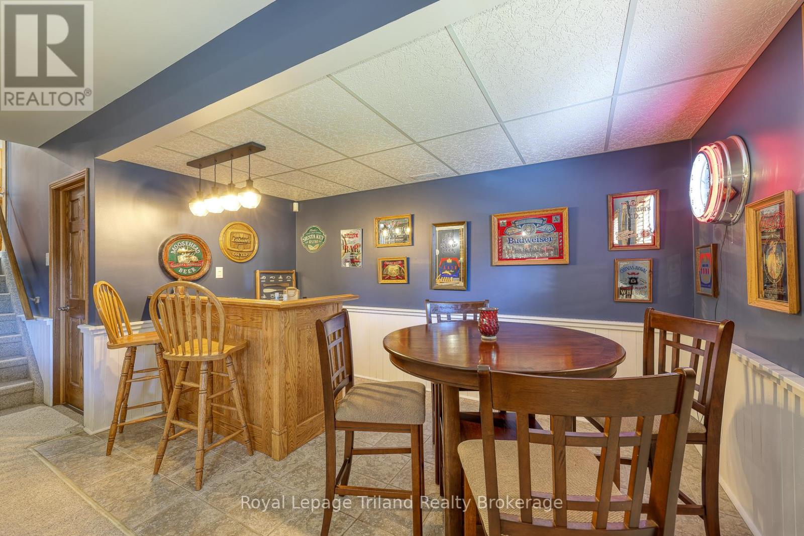 Back Split Beauty on Brock! Small-town charm meets family-friendly function. This 2-bath, 3-bedroom, 4-level brick back split blends comfort, character & curb appeal - plus an exceptional heated 2-car garage! Set on an oversized 78 x 132 ft lot, the manicured landscaping & welcoming porch make a picture-perfect first impression. Inside, 2856 SF of thoughtful design & custom quality shine! Solid wood doors run throughout & hardwood flows from the foyer to the open kitchen, dining & sunroom - a bright, connected space as functional as it is inviting. The living rm, accented by a bay window, offers a separate spot for conversation/relaxation. The kitchen is the heart of the home - oak cabinetry, solid-surface counters, built-in SS appliances (double wall ovens) & a large island with breakfast bar anchor the space. You'll love the custom coffee station and skylights that flood the dining area with light. From here, sightlines extend over the family room below, giving the home its open, airy flow. French doors lead to a standout sunroom/flex space with garden doors to the patio & inside access from the garage - a stylish drop zone, play space or work-from-home haven. Upstairs, 3 comfortable bedrooms share a 4-pce bath with a privilege door to the primary. The lower level features a bright family room with fireplace, games/bar area, & a 3-pce bath-perfect for gatherings of any size. One level down, discover 9.5-ft ceilings, a flex room ready as a gym, rec space or future 4th bdrm, & a workshop/storage area with walk-up to the finished, heated garage with epoxy flooring - a showstopper for hobbyists or auto buffs! Step outside & exhale. The private yard offers newer vinyl fencing, patio, newer hot tub in a privacy gazebo, & fire-pit zone made for laughter & late nights. Steel roof, parking for 6 & in-law potential - a complete family package! 15 min to London or Woodstock, an easy stroll to parks, arena, library & amenities. A property that fits family life beautifully. (id:51300)