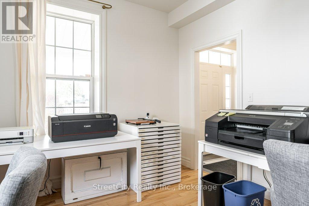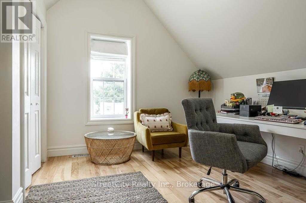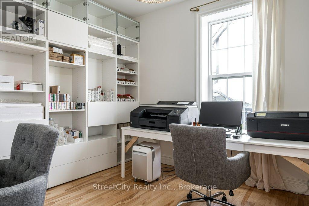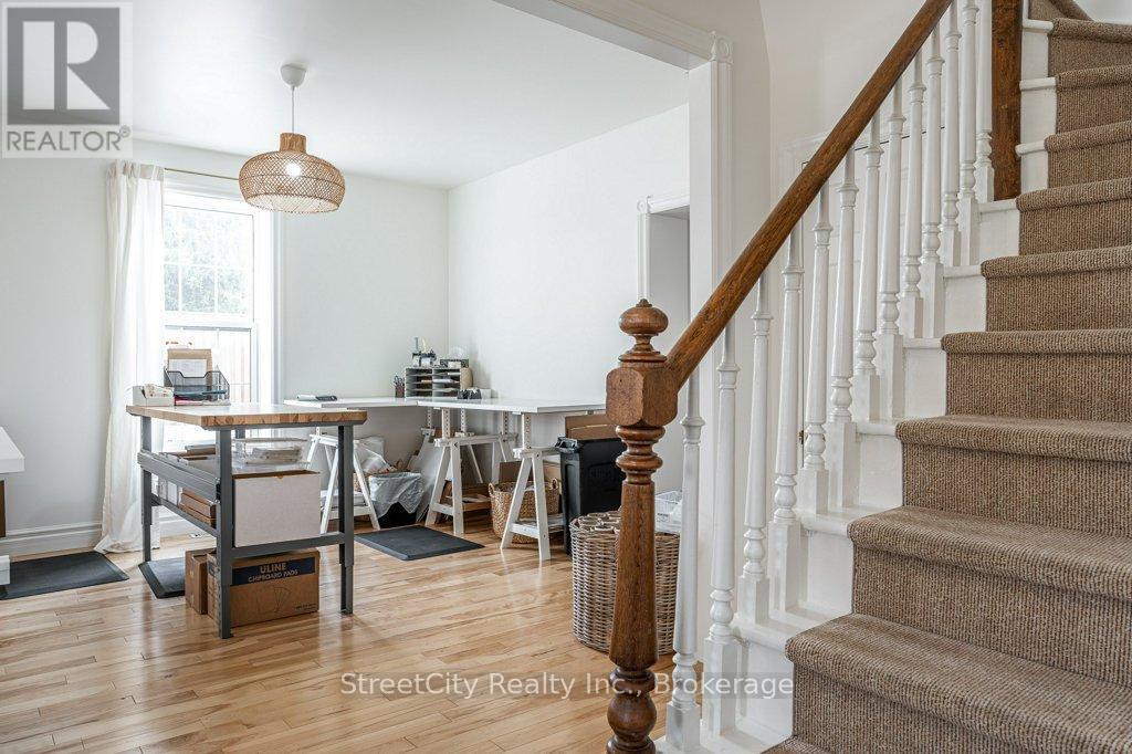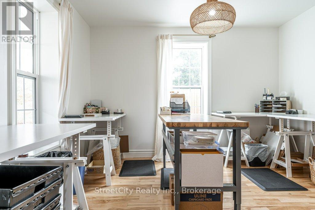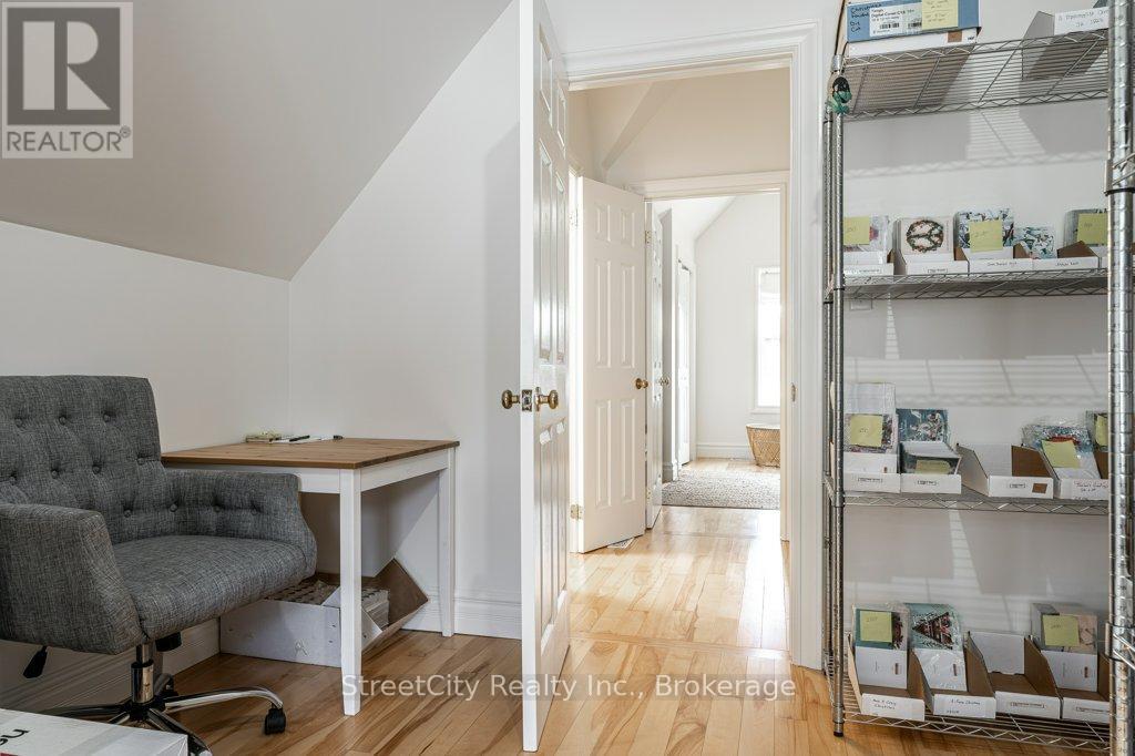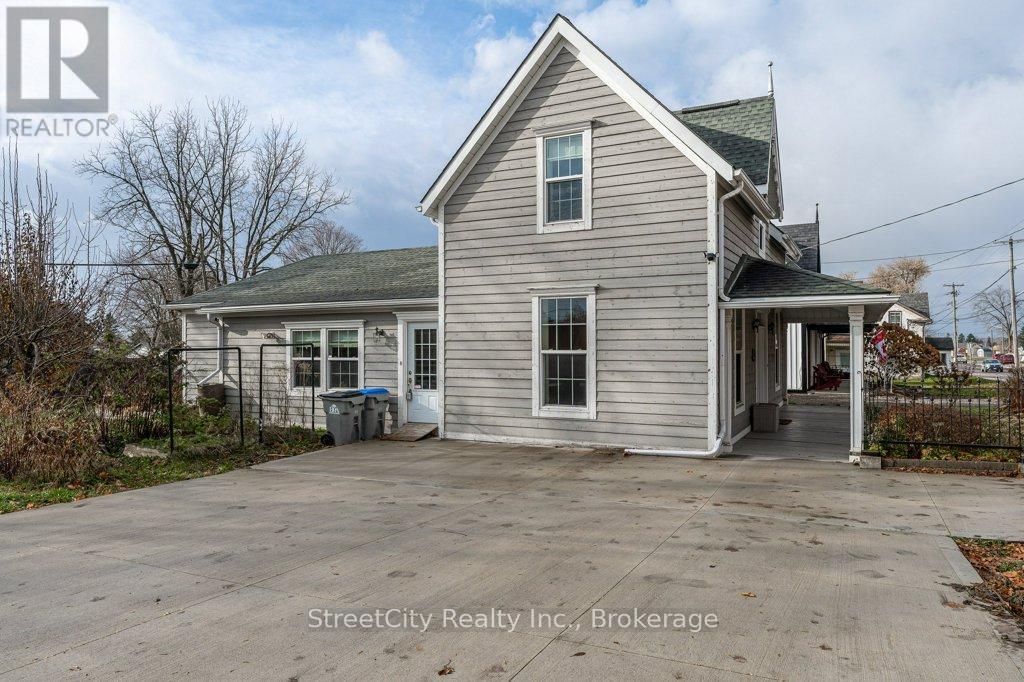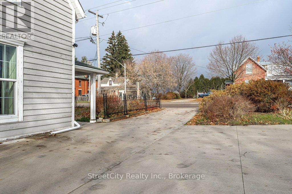 .Are you looking for a serene, updated, comfortable and casual commercial space ideally suited for professional office, service or retail? Are you looking for a gorgeous update of a classic century 1.5 storey to make your home? Or are you looking for a perfect affordable work/live space? This charming Shakespeare property checks all of the boxes. Flexible commercial zoning allows for a variety of commercial uses as well as permitted single detached residential use. Phenomenal exposure located on highway corridor between Stratford & Kitchener w/ ample parking in the newly poured concrete driveway/parking area. The interior is freshly renovated throughout w/ numerous updates including spalted maple hardwood flooring, ceramic tile, windows, furnace/AC & more. A flexible interior space offers a traditional floor plan with generous principal rooms on the main level, a large eat-in kitchen w/ island, a 3pc bath, huge mudroom, main floor laundry. The second level offers 2 large bedrooms & a 2 pc bath. The light colour palette and large windows create an airy & bright feel throughout the interior. Oodles of curb appeal w/ traditional wood siding, a welcoming covered front porch (on grade for accessibility), wrought iron fencing encapsulating mature landscaping & gardens, a fenced rear yard w/ raised vegetable gardens & several fruit trees. Ample parking on freshly poured concrete driveway/parking area. Exterior side entry access through the mudroom adds to the versatility of the mixed use potential for the property. An excellent opportunity for a Buyer looking for specific requirements for their commercial property or a Buyer who is looking for a charming, affordable home to make their own. Call for more information or to schedule a private showing. (id:51300)