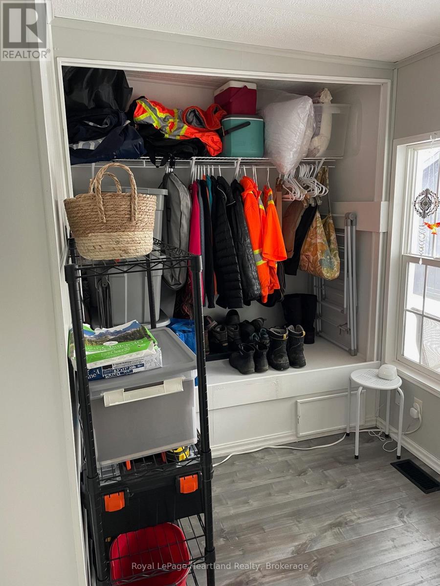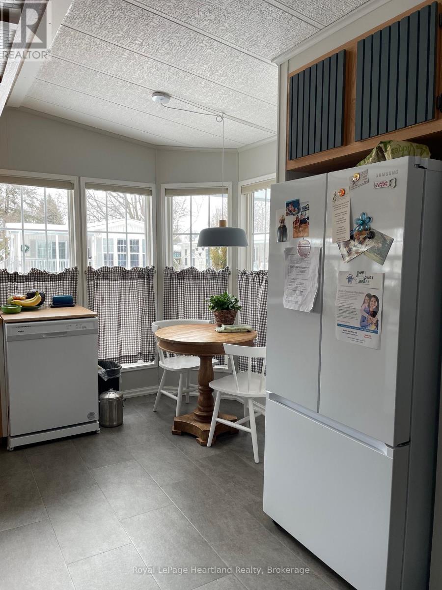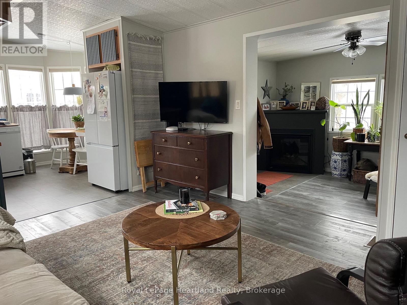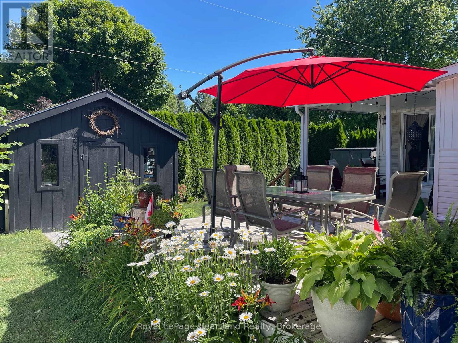 Welcome to this affordable, well maintained home located in Northwood Beach Resort, 55+ adult lifestyle community. Minutes from the Village of Bayfield where you will find great restaurants, shopping, marina, sandy beaches & a golf course right across the road. This up-to-date home has a spacious entrance/sitting area with a new gas fireplace, a bright eat-in kitchen that opens to a cozy living room. The primary bedroom with built-in cabinets, a large clothes closet and patio doors that lead to a large deck is a great spot for morning coffee. A second bedroom also opens to the deck, doubles as a functional storage room with an optional built-in single bed, great for an overnight guest. The lovely backyard is lined with mature trees ensuring privacy, perennial gardens surround the brand new grey concrete slate walkway and the new black privacy fence on the large deck is the perfect space for summer entertaining. A new 10'x12' insulated shed with electricity and an extra garden shed provides plenty of storage. Northwood Beach offers a beautiful updated community centre, large outdoor pool & amazing sunsets at the lakeside park. If downsizing, low maintenance & lakeside living are what you are looking for, this is the home for you! (id:51300)