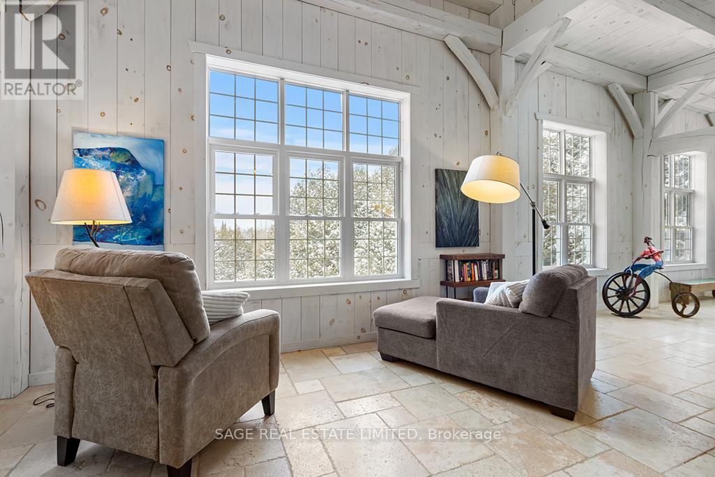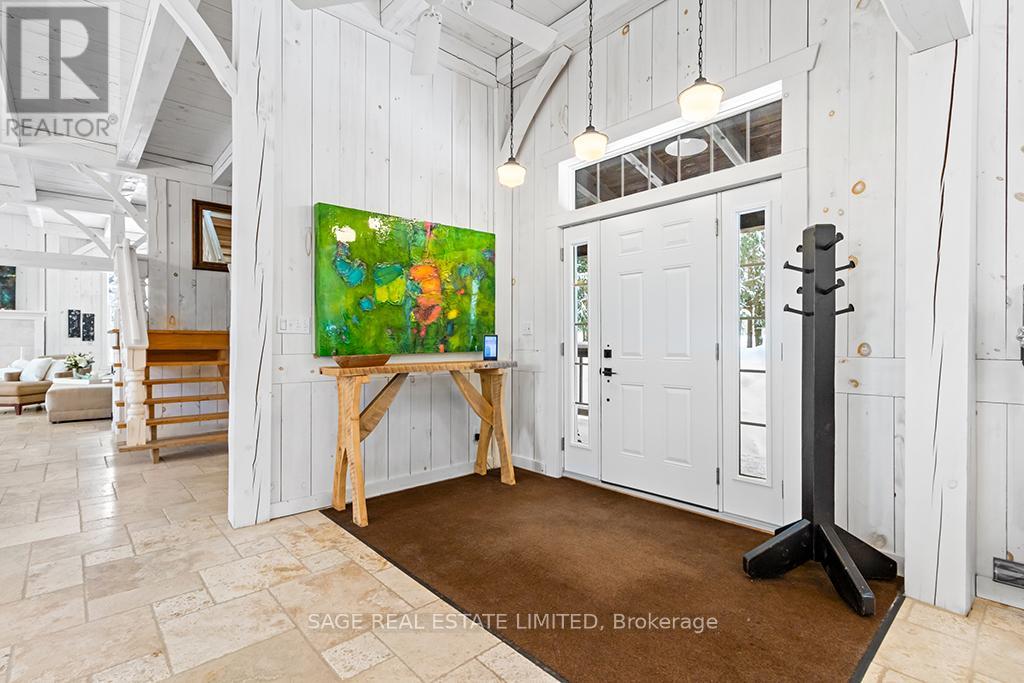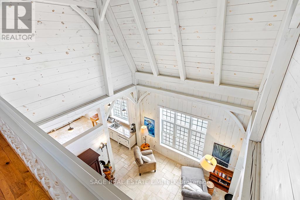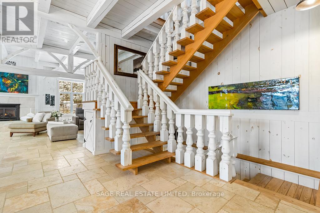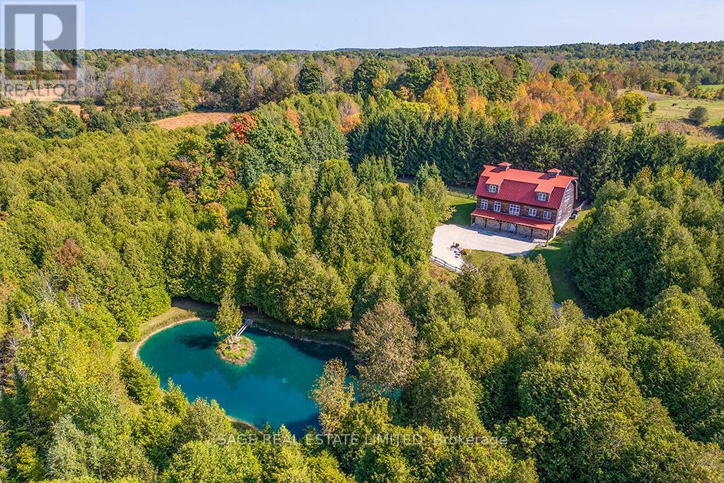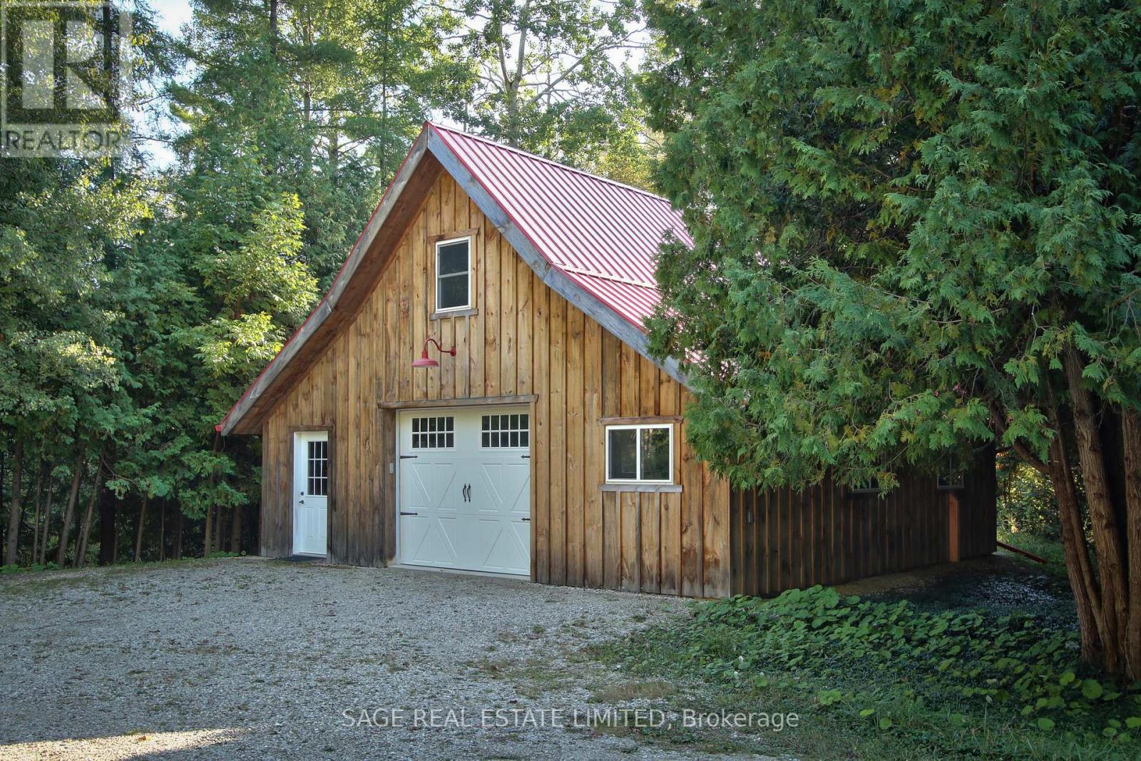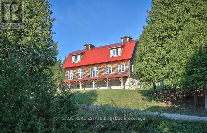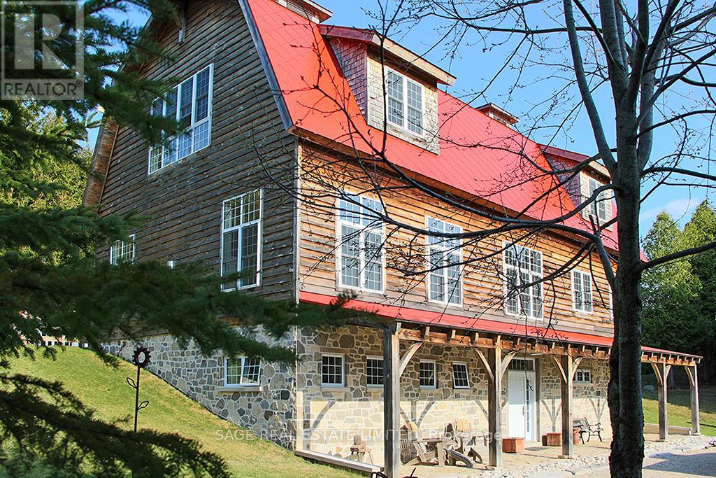 Imagine yourself arriving at your private country hideaway. You enter the gate and follow a winding, forested lane, crossing a gentle stream and passing a spring-fed swimming pond that guides you to your personal retreat. Leave the stress of the day at the roadside-you have arrived home.You are drawn to the striking post-and-beam residence, designed and built by master craftspeople who brought this dream home to life with uncompromising quality and extraordinary attention to detail.As you approach the front entrance, you're greeted by stunning stonework crafted from local aggregate. Step inside, and a limestone and pine entry hall envelops you in warmth and character. This level offers immediate access to two spacious rooms, a spa-like bathroom, a custom-finished walk-in coat closet, pantry, laundry, and utility spaces-each thoughtfully designed for both beauty and function.A solid wood staircase leads to the sun-drenched great room, where soaring 30-foot ceilings and panoramic views overlook your secluded forested estate. An exquisite marble fireplace invites you to linger, while the open-concept living and dining areas flow effortlessly, offering endless possibilities for creating inviting and intimate spaces.The bespoke grand kitchen is equally suited for large gatherings or quiet evenings at home. With ample space for multiple cooks, it features custom-built cabinetry, granite and live-edge countertops, premium appliances, and a sprawling natural wood island-each element showcasing the impeccable craftsmanship found throughout the home.The uppermost level is a private sanctuary-the pinnacle of space, comfort, and tranquility. The expansive primary bedroom and moon-lit bath offer a serene retreat, where you can see out, yet remain entirely unseen.All of this is beautifully encapsulated beneath a crimson red gambrel roof, complemented by classic shiplap pine cladding-an unforgettable country estate that feels both timeless and deeply personal. (id:51300)