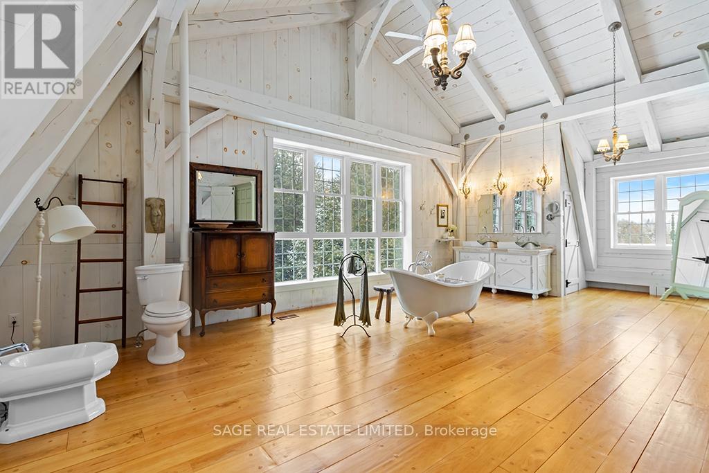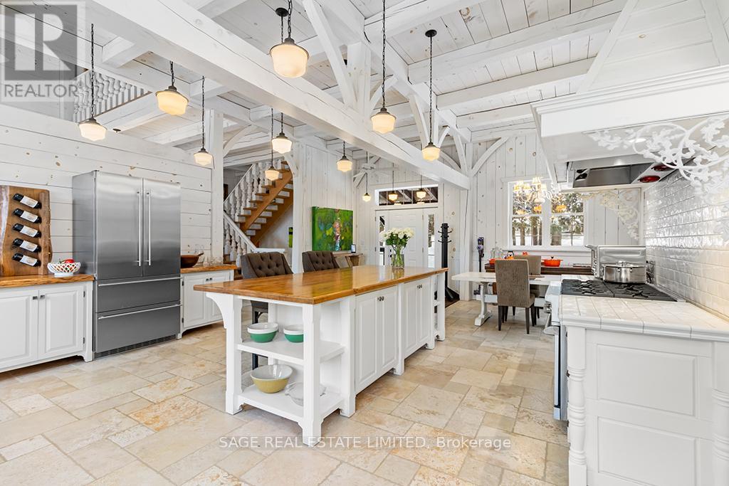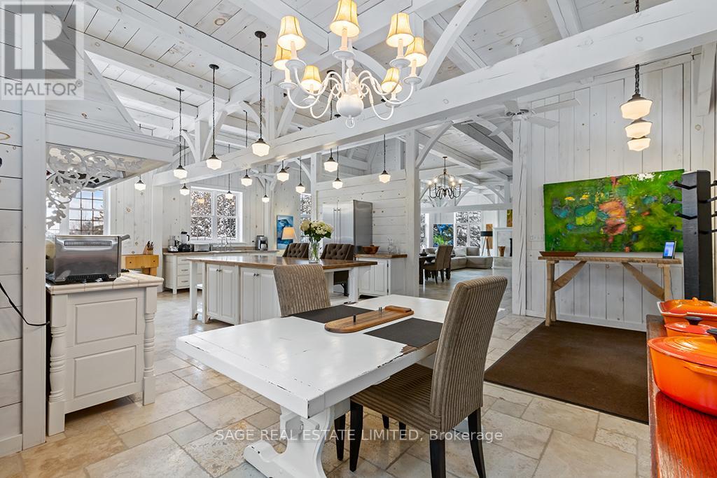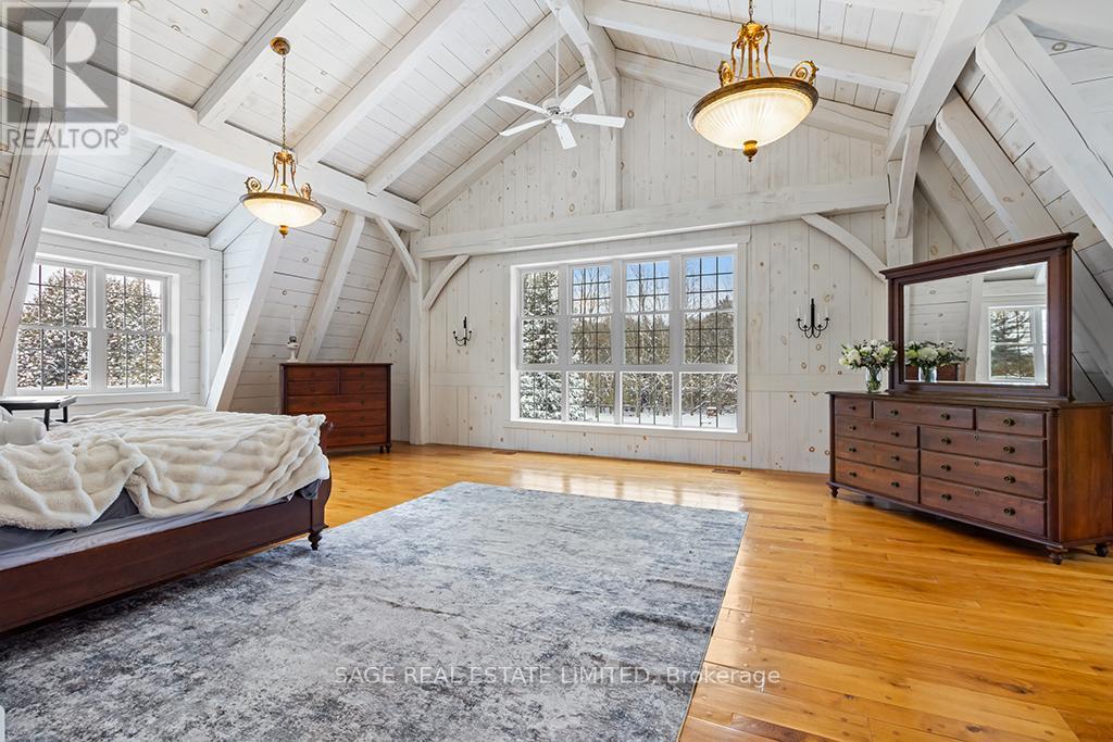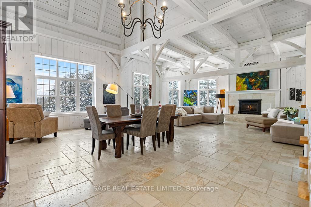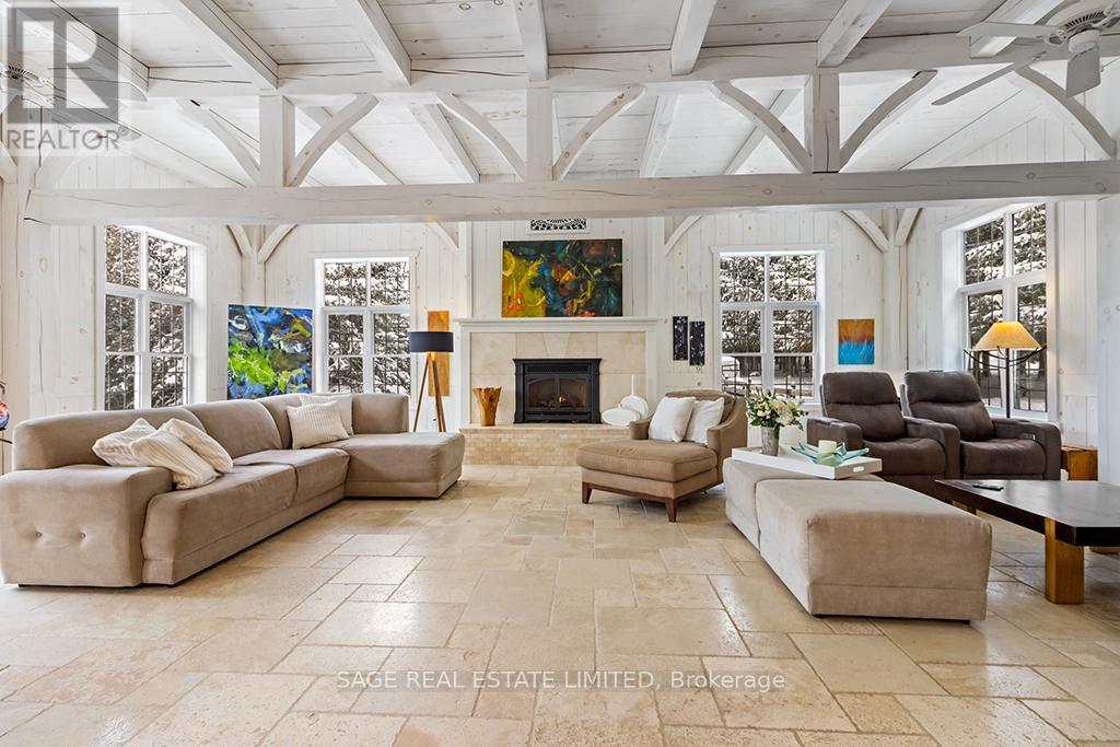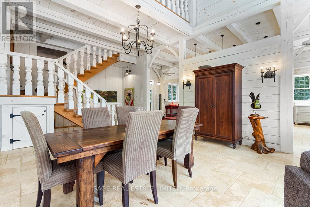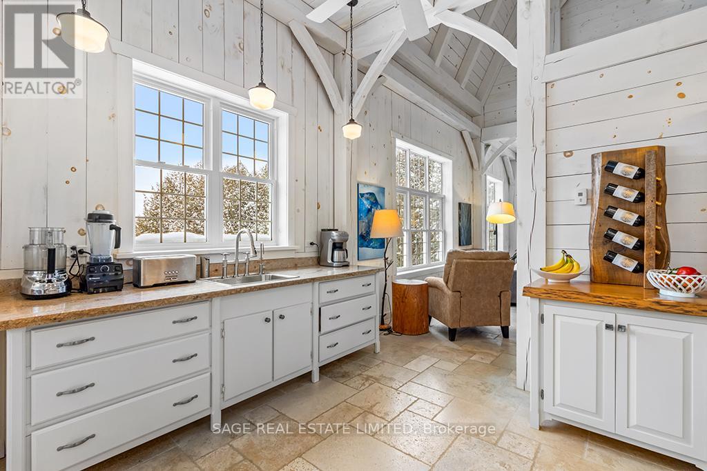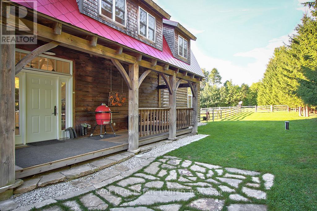 Imagine yourself arriving at your private country hideaway. You enter the gate and follow a winding, forested lane, crossing a gentle stream and passing a spring-fed swimming pond that guides you to your personal retreat. Leave the stress of the day at the roadside-you have arrived home.You are drawn to the striking post-and-beam residence, designed and built by master craftspeople who brought this dream home to life with uncompromising quality and extraordinary attention to detail.As you approach the front entrance, you're greeted by stunning stonework crafted from local aggregate. Step inside, and a limestone and pine entry hall envelops you in warmth and character. This level offers immediate access to two spacious rooms, a spa-like bathroom, a custom-finished walk-in coat closet, pantry, laundry, and utility spaces-each thoughtfully designed for both beauty and function.A solid wood staircase leads to the sun-drenched great room, where soaring 30-foot ceilings and panoramic views overlook your secluded forested estate. An exquisite marble fireplace invites you to linger, while the open-concept living and dining areas flow effortlessly, offering endless possibilities for creating inviting and intimate spaces.The bespoke grand kitchen is equally suited for large gatherings or quiet evenings at home. With ample space for multiple cooks, it features custom-built cabinetry, granite and live-edge countertops, premium appliances, and a sprawling natural wood island-each element showcasing the impeccable craftsmanship found throughout the home.The uppermost level is a private sanctuary-the pinnacle of space, comfort, and tranquility. The expansive primary bedroom and moon-lit bath offer a serene retreat, where you can see out, yet remain entirely unseen.All of this is beautifully encapsulated beneath a crimson red gambrel roof, complemented by classic shiplap pine cladding-an unforgettable country estate that feels both timeless and deeply personal. (id:51300)