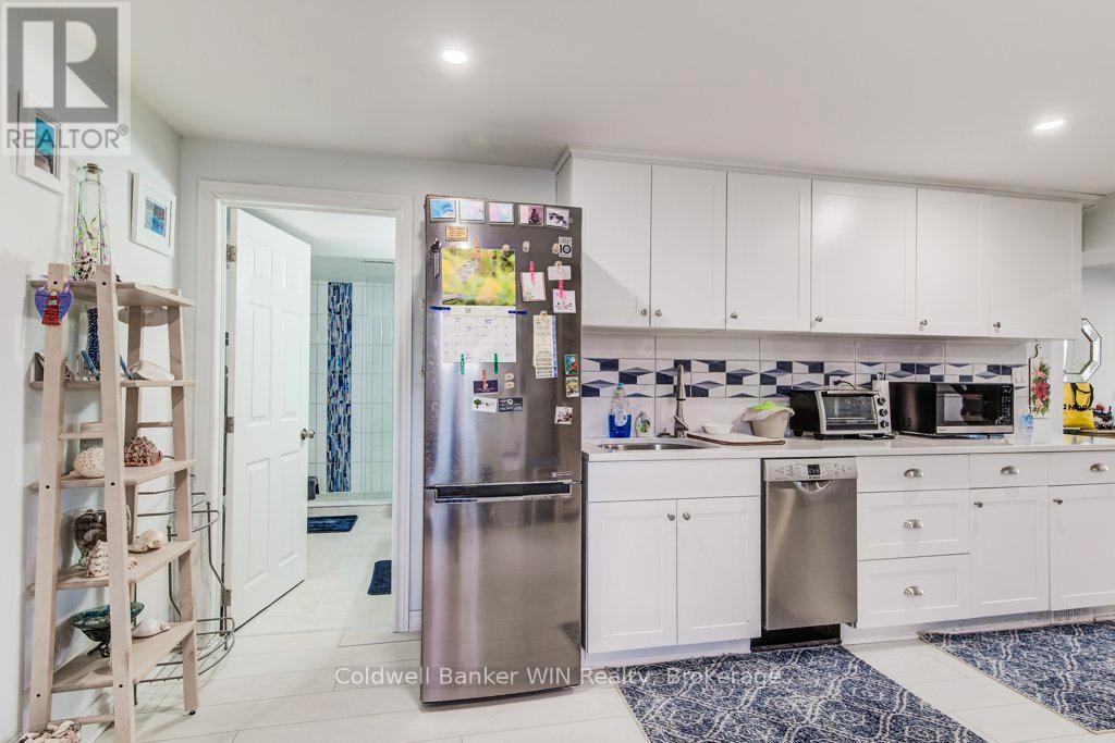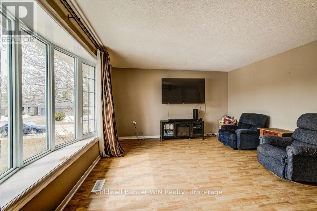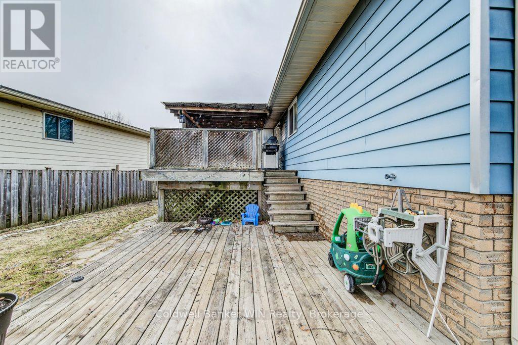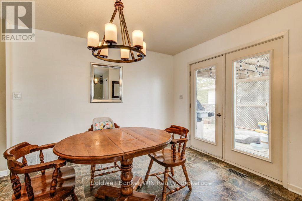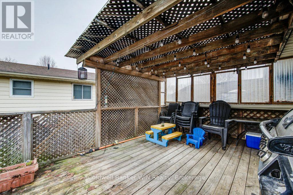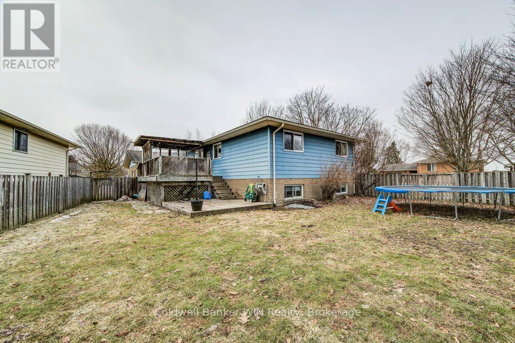 Tucked away on a quiet dead-end cul-de-sac in the heart of Mount Forest, this well-maintained raised bungalow offers comfort, versatility, and an ideal family-friendly location. Featuring a single-car attached garage, this home is perfect for those seeking both convenience and privacy. The bright and inviting main floor showcases a spacious living room, along with a functional kitchen and dining area complete with French doors leading out to a partially covered, two-tier deck which is perfect for entertaining or relaxing outdoors. Three generously sized bedrooms and a 4-piece bathroom complete the main level. Downstairs, the fully renovated (2020) in-law suite offers excellent potential for multigenerational living. This space includes a cozy living room, eat-in kitchenette, recreation room, a bedroom, and a modern 3-piece bathroom with a tiled shower and cheater ensuite access. Thanks to the raised bungalow design, the basement enjoys large windows that fill the space with natural light. A shared utility room with laundry adds to the home's practicality. Outside, the fully fenced yard provides a safe and private space for children and pets to play. Just steps away, you'll find a fantastic multi-use municipal outdoor area featuring a walking track, baseball diamonds, soccer fields, a playground, and a splash pad that is perfect for enjoying those warm summer days. This is a wonderful opportunity to own a versatile home in a peaceful setting, close to all the amenities that make Mount Forest such a great place to live. (id:51300)