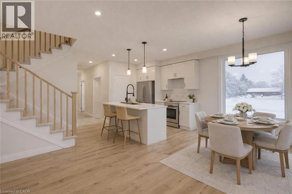 Welcome to The Town Collection at Maitland Meadows — The Homestead model is where modern farmhouse charm meets calm, connected living. This bright end unit offers 1,810 sq ft of thoughtfully designed space, filled with natural light and upscale finishes. With 9' ceilings and an open concept layout, the main floor feels airy and inviting — from the flexible front room (perfect for a home office or playroom) to the kitchen’s quartz island that anchors the dining and living areas. Upstairs, the spacious primary suite features a walk-in closet and private ensuite, while two additional bedrooms and second floor laundry make family life effortless. Energy efficient construction helps keep costs low and comfort high, and the full basement offers room to grow. Complete with a deck, appliances, and stylish finishes, this home is move-in ready, and if you're looking for that attached garage feature, it's here too! Designed for those who love the modern conveniences of new construction and the peaceful rhythm of small town life. For a full list of features and inclusions visit our Model Home located at 122 Bean Street in Harriston. (id:51300)