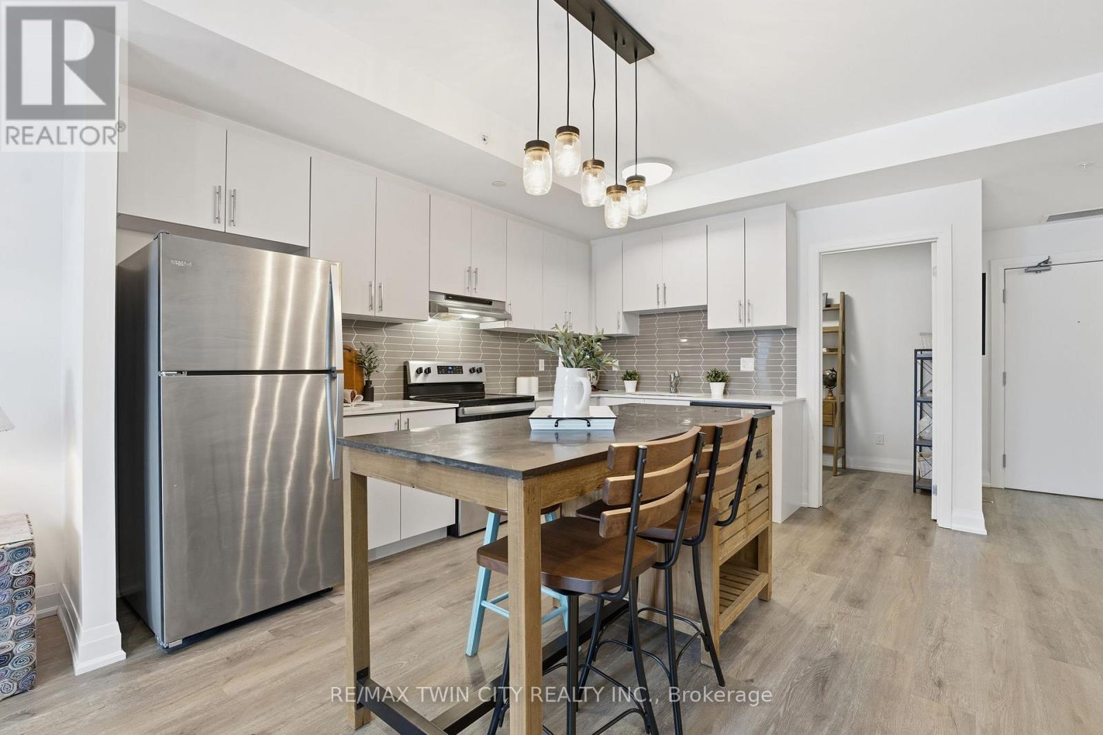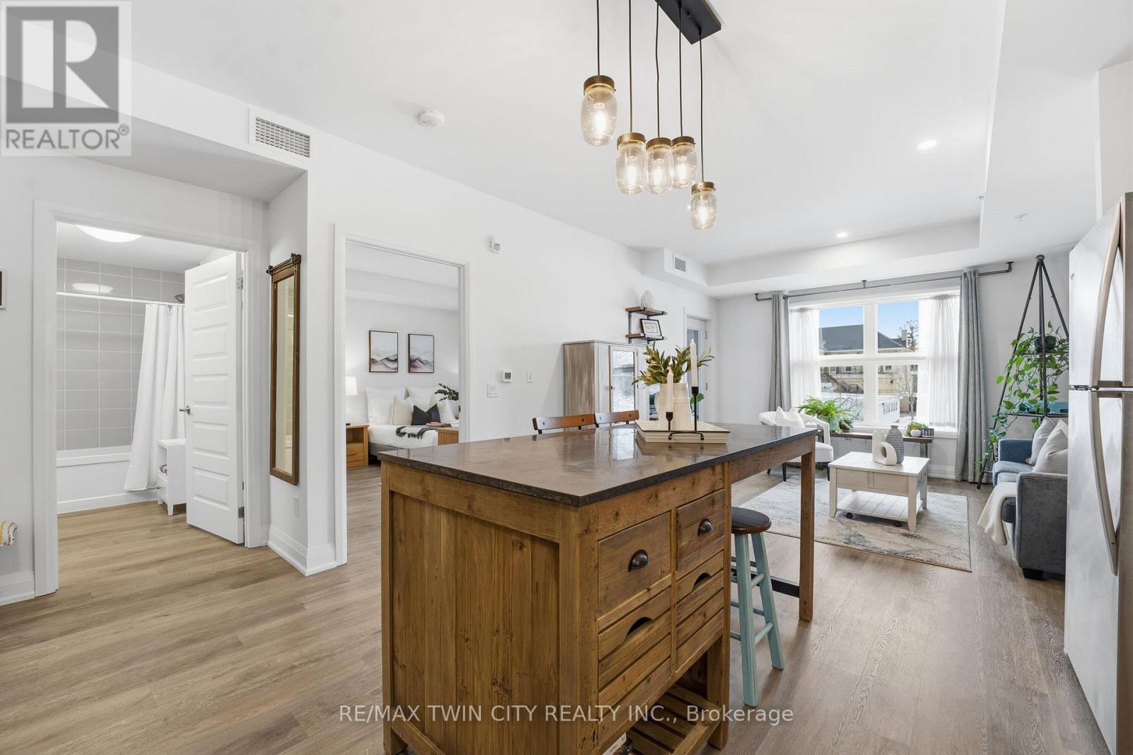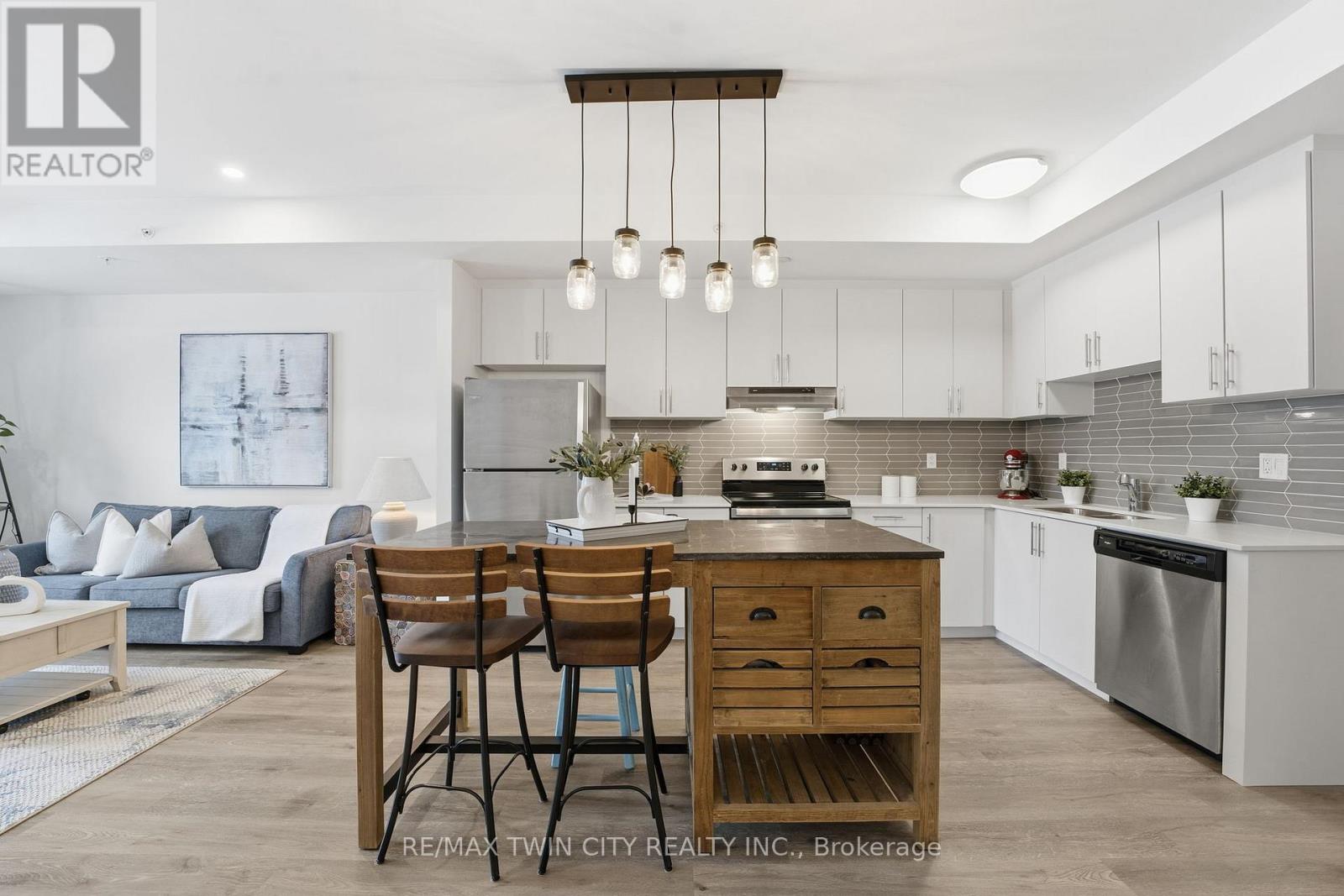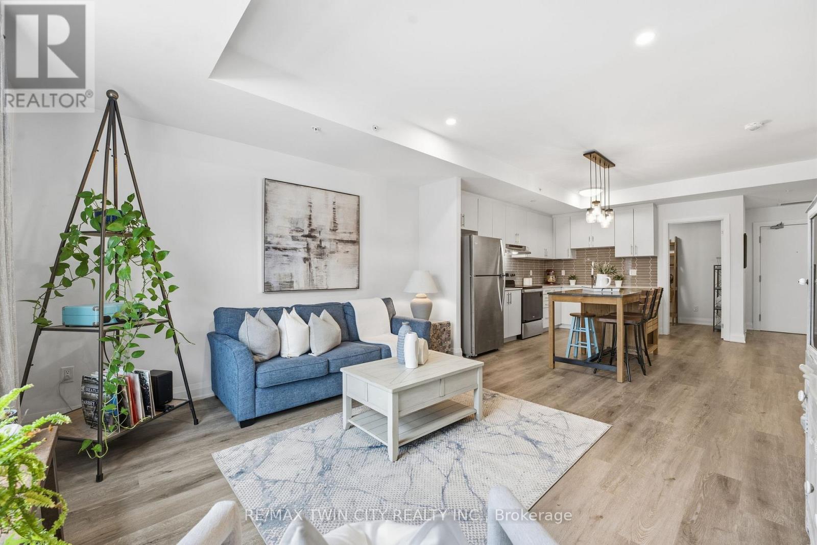 Welcome to condo living in Ayr at Piper's Grove! This modern mid-rise community offers an ideal opportunity for first-time buyers, downsizers, or savvy investors looking for a low-maintenance lifestyle in a growing, well-connected town. This bright and spacious suite features 1 bedroom plus a versatile den, 1 bathroom, and 885 sq ft of thoughtfully designed living space, along with a private 84 sq ft balcony - perfect for enjoying your morning coffee or unwinding at the end of the day. The open-concept kitchen, dining, and living area is flooded with natural light and showcases contemporary finishes throughout. The kitchen is both stylish and functional, featuring sleek white cabinetry extending to the ceiling, a neutral backsplash, quartz countertops and a striking designer lighting over the dining area. The primary bedroom offers convenient access to the 4-piece bathroom, creating a comfortable and efficient layout. Additional highlights include luxury vinyl plank flooring throughout and in-suite laundry for everyday convenience. Residents enjoy a secure building entrance with intercom system, as well as a welcoming main-level amenity room complete with a kitchenette and washroom - ideal for gatherings or entertaining. One parking space is included. Located at the end of Gibson Street in downtown Ayr, Piper's Grove is just steps from parks and walking trails and offers easy access to Cambridge, Kitchener, Paris, Brantford, and Woodstock. Combining modern finishes, smart design, and a friendly community atmosphere, this is condo living at its best. (id:51300)