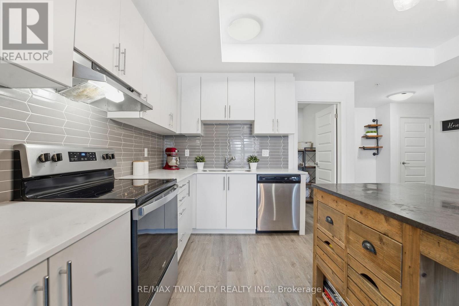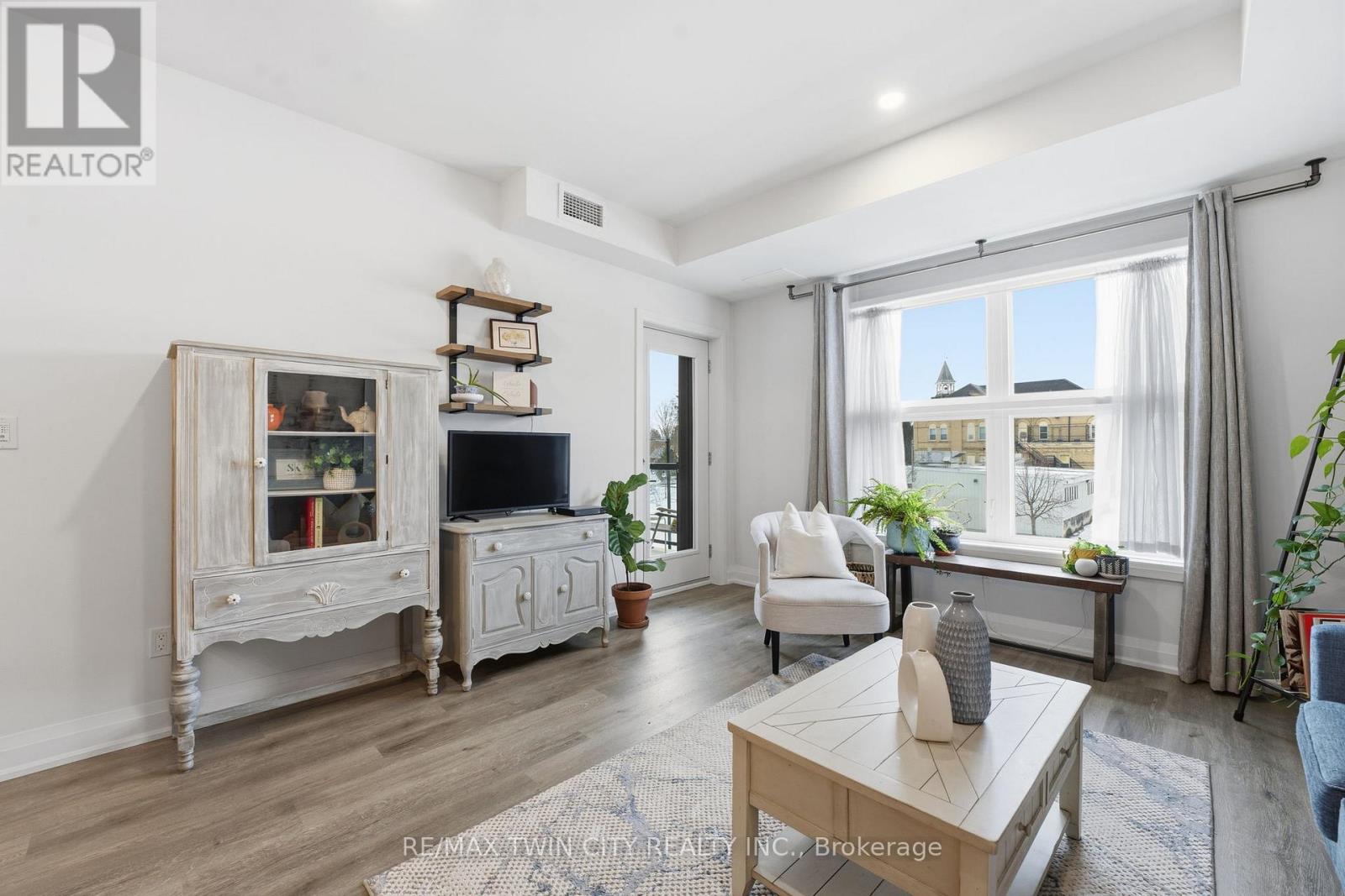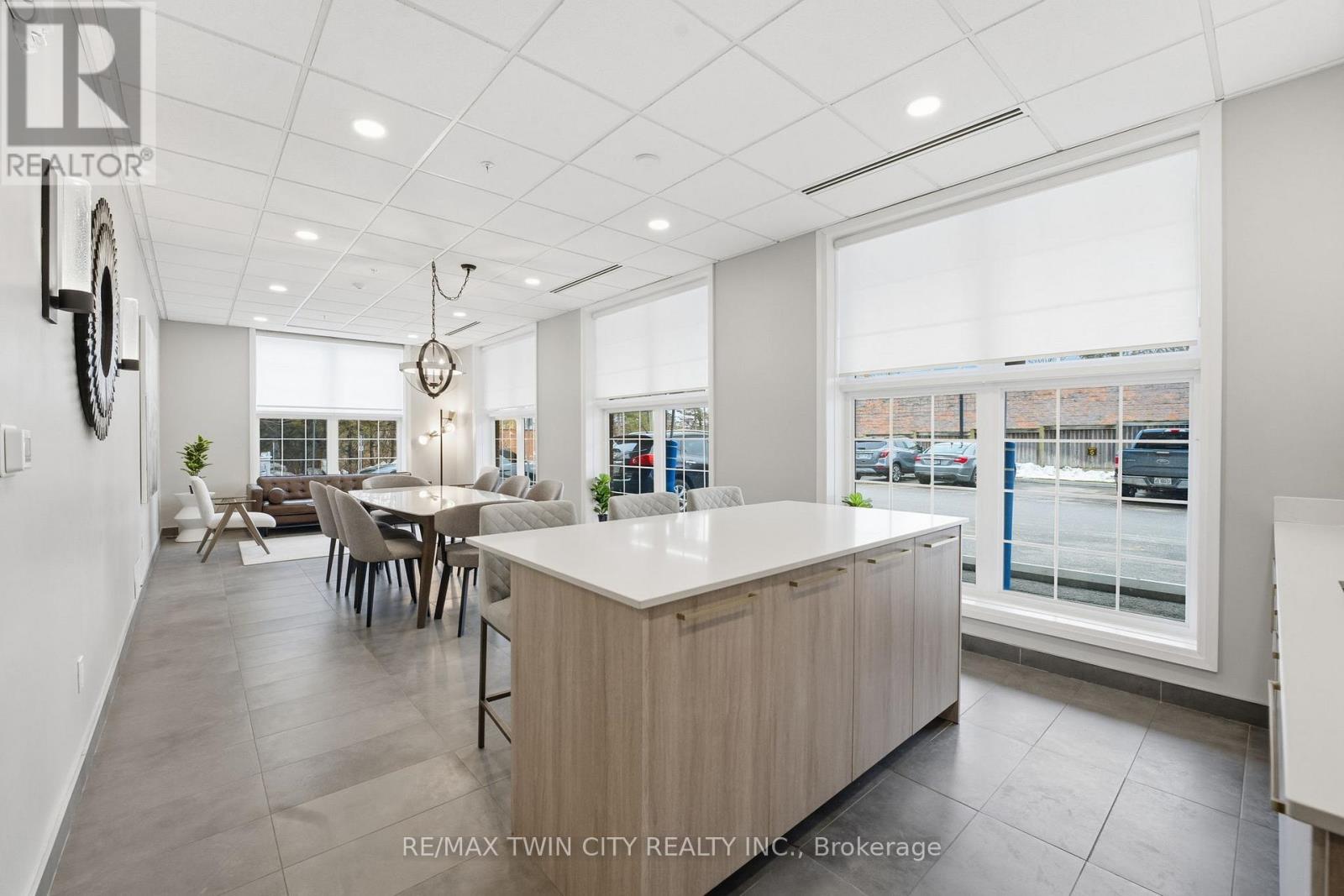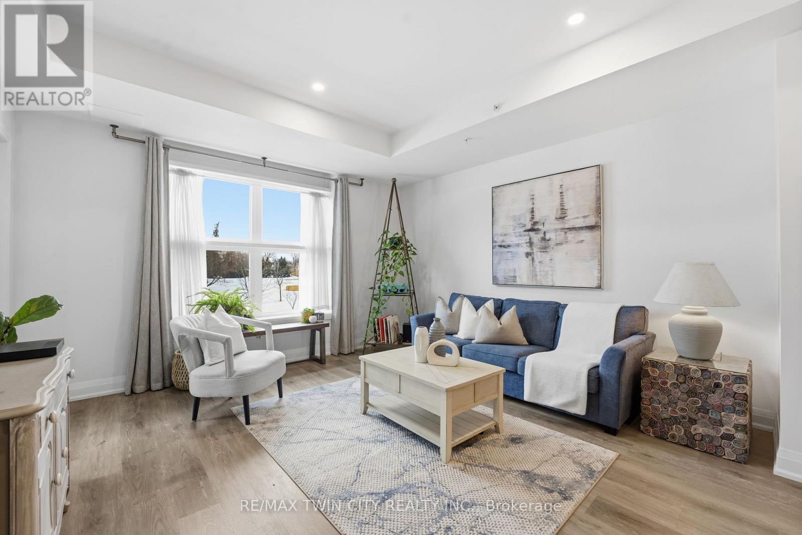 Welcome to condo living in Ayr at Piper's Grove! This modern mid-rise community offers an ideal opportunity for first-time buyers, downsizers, or savvy investors looking for a low-maintenance lifestyle in a growing, well-connected town. This bright and spacious suite features 1 bedroom plus a versatile den, 1 bathroom, and 885 sq ft of thoughtfully designed living space, along with a private 84 sq ft balcony - perfect for enjoying your morning coffee or unwinding at the end of the day. The open-concept kitchen, dining, and living area is flooded with natural light and showcases contemporary finishes throughout. The kitchen is both stylish and functional, featuring sleek white cabinetry extending to the ceiling, a neutral backsplash, quartz countertops and a striking designer lighting over the dining area. The primary bedroom offers convenient access to the 4-piece bathroom, creating a comfortable and efficient layout. Additional highlights include luxury vinyl plank flooring throughout and in-suite laundry for everyday convenience. Residents enjoy a secure building entrance with intercom system, as well as a welcoming main-level amenity room complete with a kitchenette and washroom - ideal for gatherings or entertaining. One parking space is included. Located at the end of Gibson Street in downtown Ayr, Piper's Grove is just steps from parks and walking trails and offers easy access to Cambridge, Kitchener, Paris, Brantford, and Woodstock. Combining modern finishes, smart design, and a friendly community atmosphere, this is condo living at its best. (id:51300)