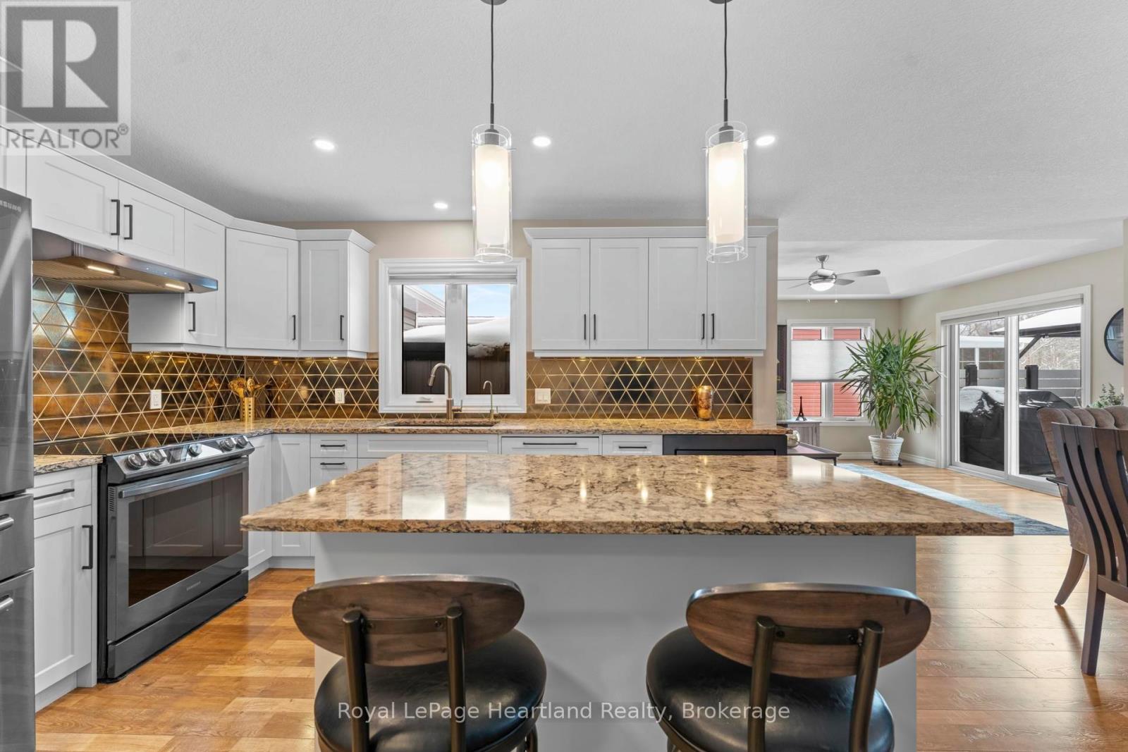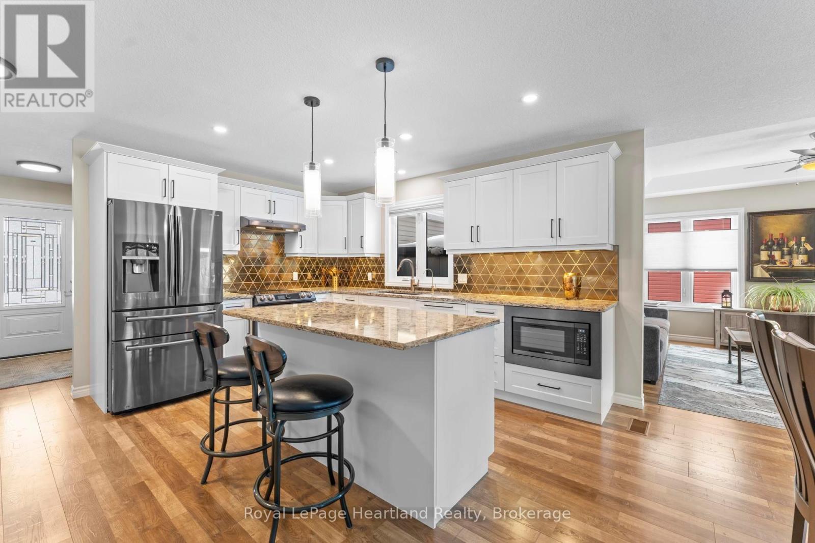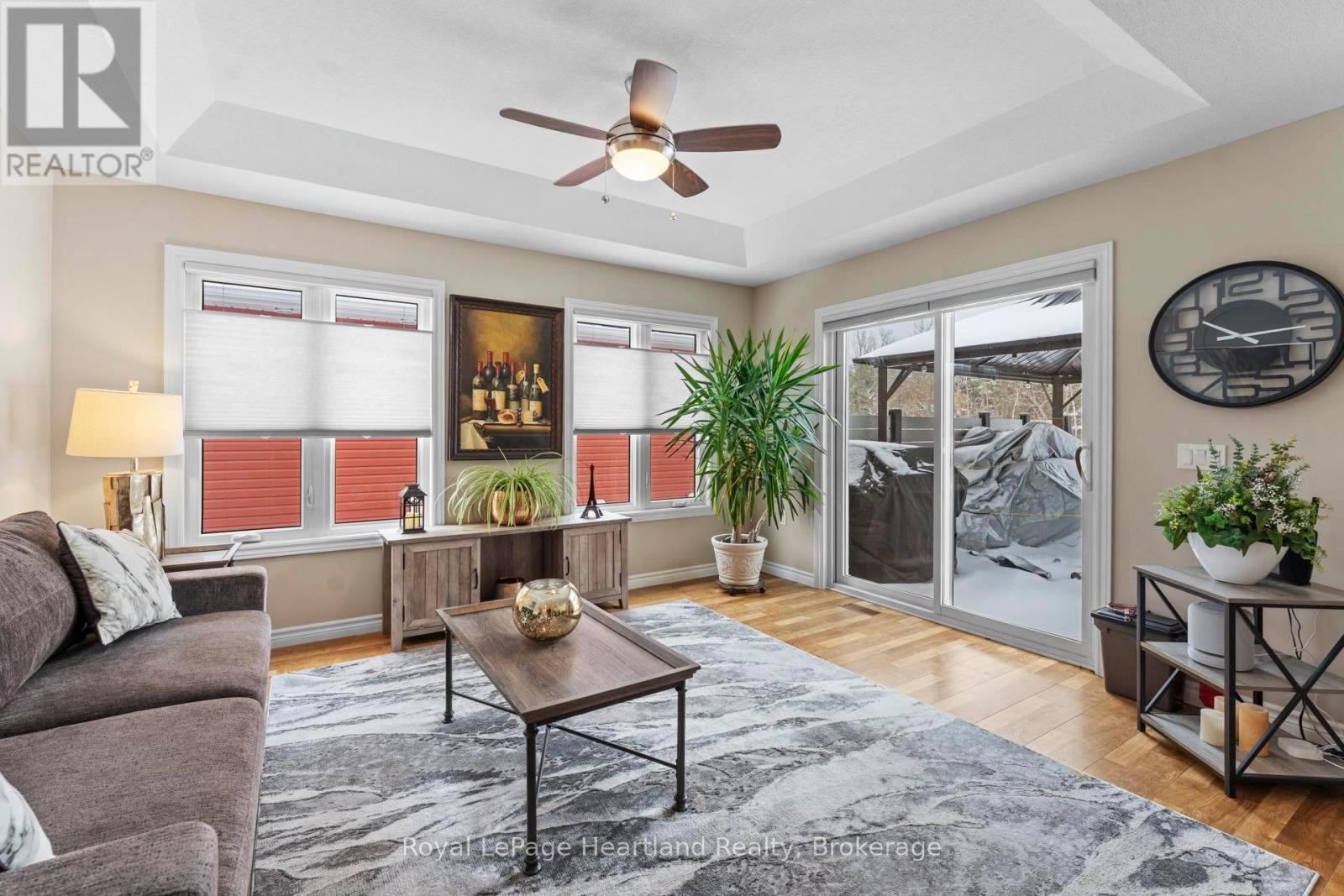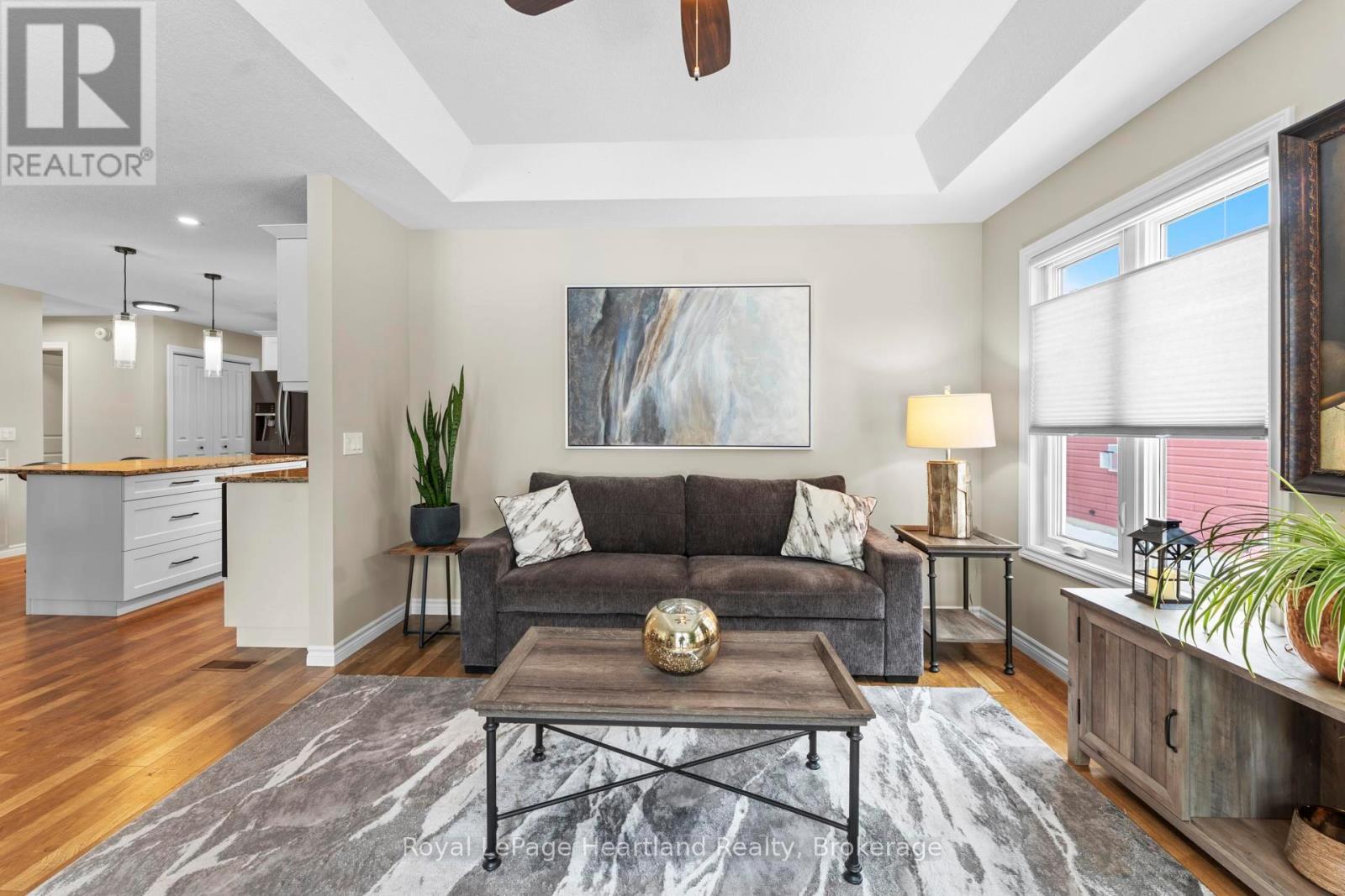 Prime location near the lake! Set in the highly sought-after Bluffs at Huron, this immaculate bungalow backs onto an open field and natural environment, offering a peaceful backdrop and privacy, while still being a short stroll to the community rec centre, lake access, and all the lifestyle perks that make this waterfront neighbourhood so desirable. This impressive "Lakeside with Sunroom" model offers approx. 1,455 sq ft of designed living space and a long list of quality upgrades. Curb appeal shines with manicured landscaping, mature trees and an inviting front porch. Inside, the bright, welcoming layout is finished with high-end continuous flooring and upgraded lighting. The custom kitchen is a standout with abundant cabinetry topped with crown moulding, soft-close doors, quartz countertops, tile backsplash, under-cabinet lighting, an enlarged centre island, built-in microwave, high-capacity range hood fan, Bosch panel dishwasher, and induction stove. The kitchen flows seamlessly into the dining area and sunroom featuring a tray ceiling and patio doors to the outdoors. Step outside to a spacious south-facing composite deck complete with gazebo, privacy wall, and a professionally installed 16' x 16' stone patio-perfect for entertaining or quiet evenings. The generous primary bedroom offers a walk-in closet and 3-piece ensuite. A second bedroom and a stylish 4-piece main bath complete the main level; both baths are upgraded with quartz counters, tile details and glass sliding shower doors. Relax in the living room beside the contemporary low-profile Solas gas fireplace with remote. Enjoy plenty of storage with multiple closets, a full crawl space, and an attached two-car garage. Bonus: six appliances included. Located in an upscale land lease community with a private recreation centre and indoor pool, close to shopping and several golf courses. Book your private showing today! (id:51300)