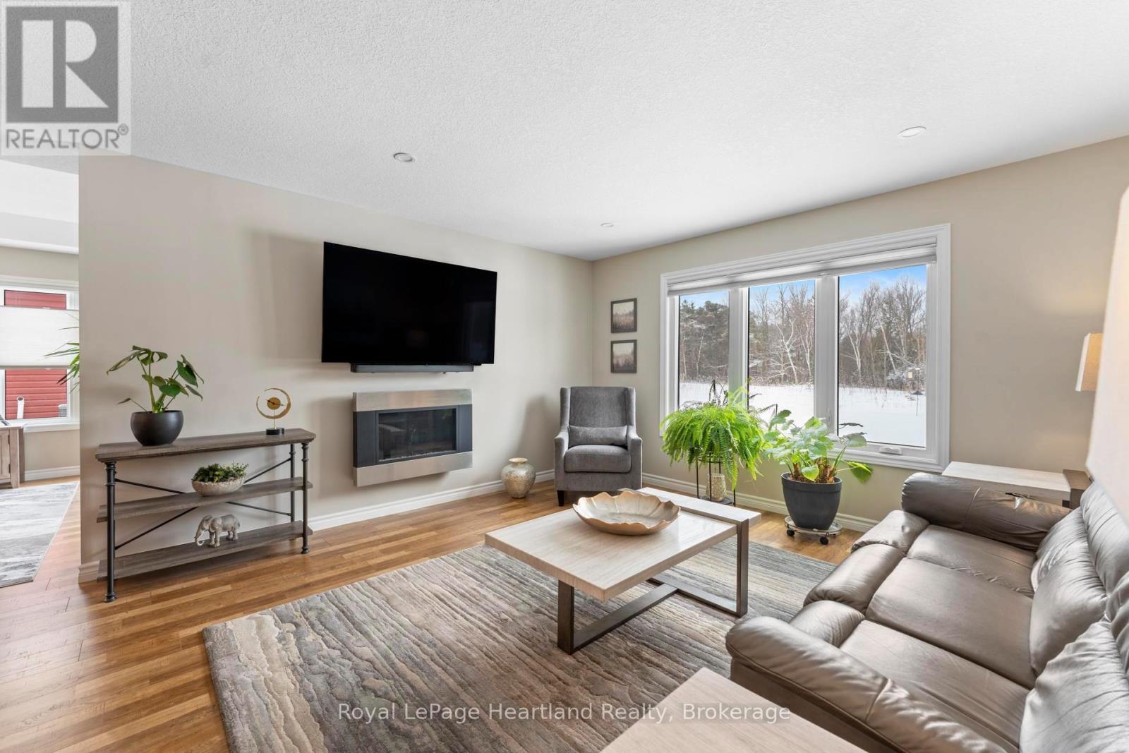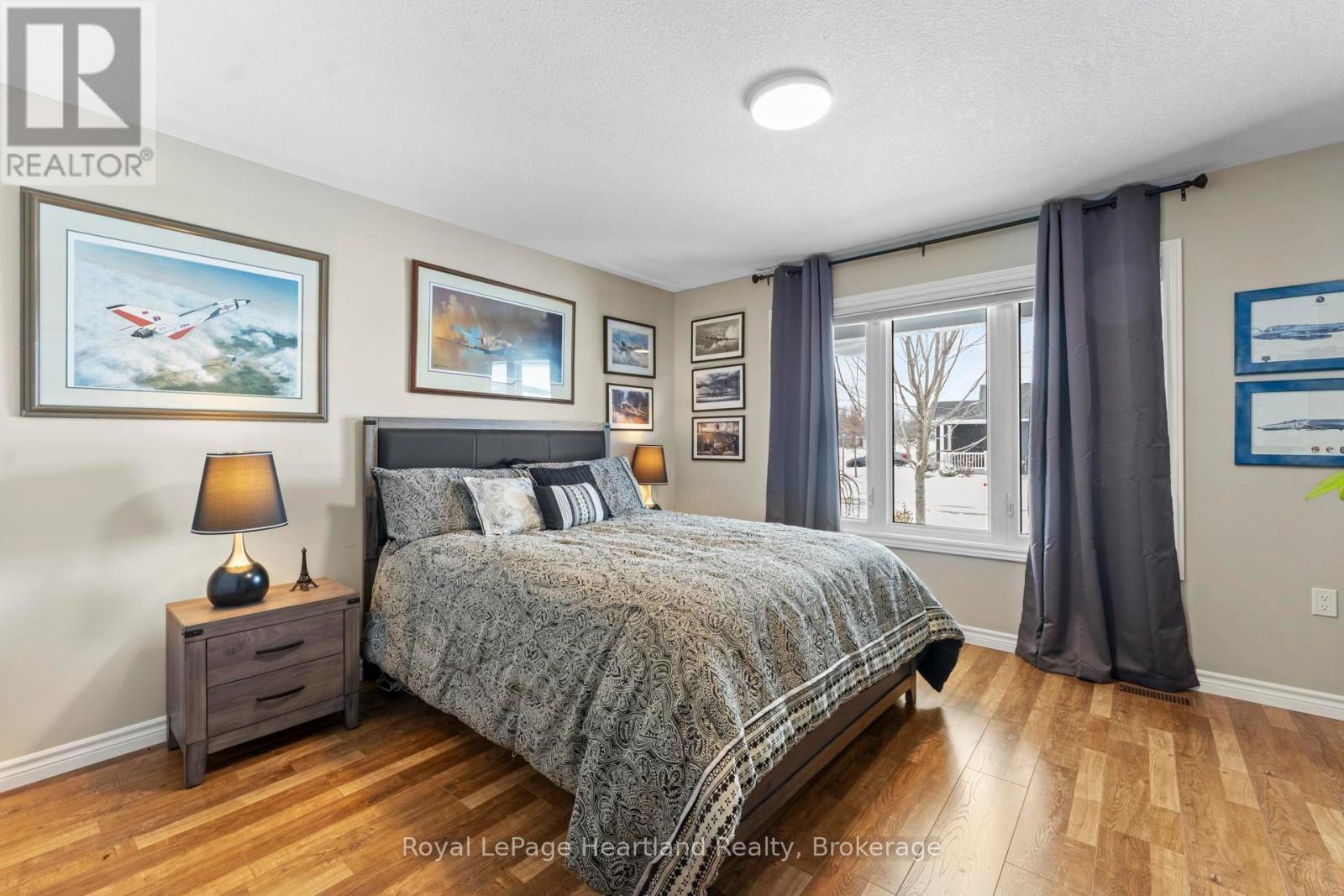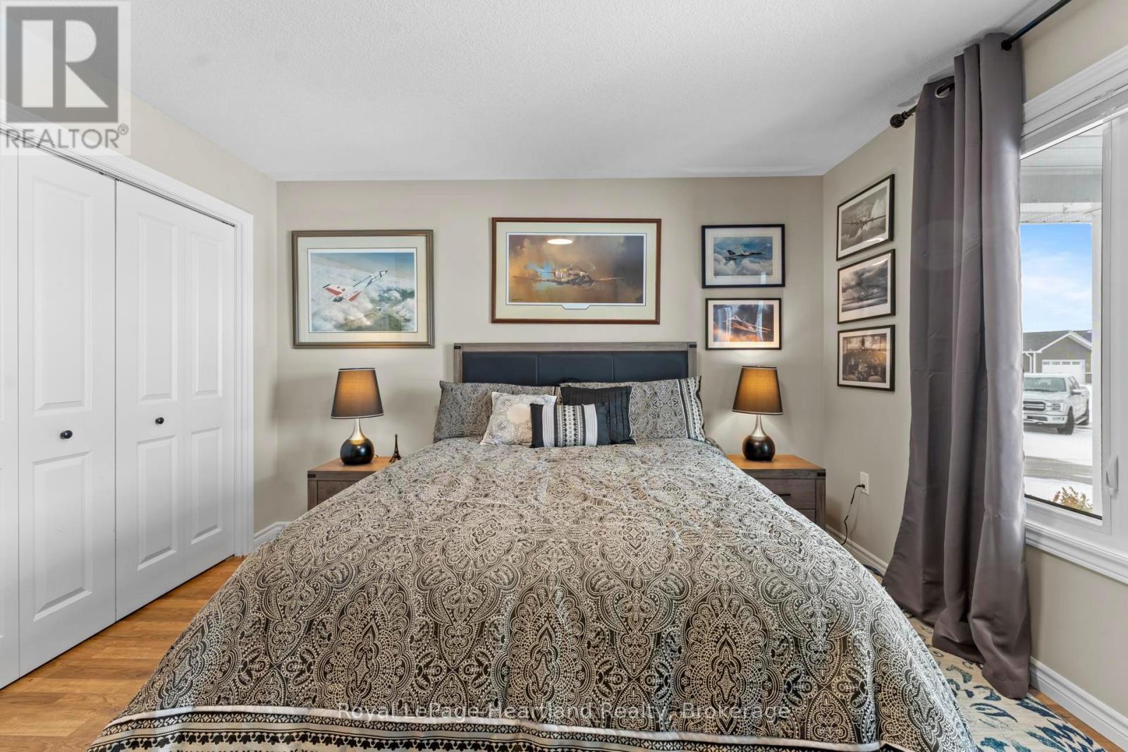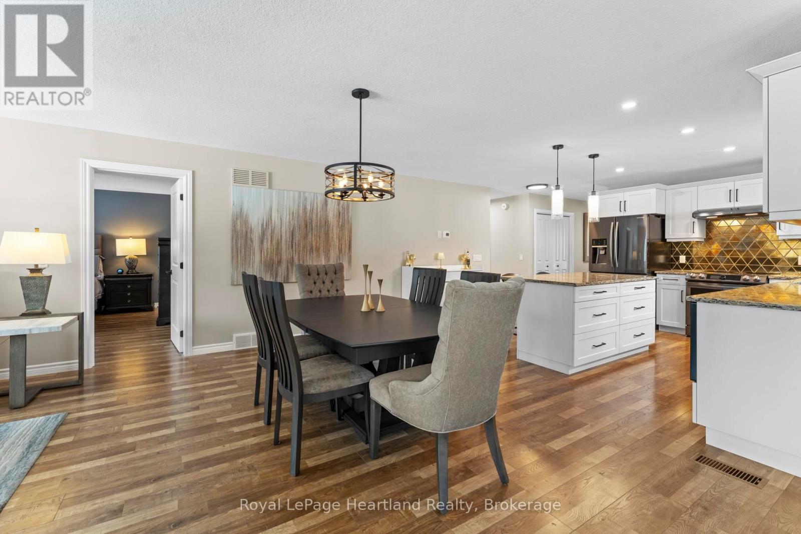 Prime location near the lake! Set in the highly sought-after Bluffs at Huron, this immaculate bungalow backs onto an open field and natural environment, offering a peaceful backdrop and privacy, while still being a short stroll to the community rec centre, lake access, and all the lifestyle perks that make this waterfront neighbourhood so desirable. This impressive "Lakeside with Sunroom" model offers approx. 1,455 sq ft of designed living space and a long list of quality upgrades. Curb appeal shines with manicured landscaping, mature trees and an inviting front porch. Inside, the bright, welcoming layout is finished with high-end continuous flooring and upgraded lighting. The custom kitchen is a standout with abundant cabinetry topped with crown moulding, soft-close doors, quartz countertops, tile backsplash, under-cabinet lighting, an enlarged centre island, built-in microwave, high-capacity range hood fan, Bosch panel dishwasher, and induction stove. The kitchen flows seamlessly into the dining area and sunroom featuring a tray ceiling and patio doors to the outdoors. Step outside to a spacious south-facing composite deck complete with gazebo, privacy wall, and a professionally installed 16' x 16' stone patio-perfect for entertaining or quiet evenings. The generous primary bedroom offers a walk-in closet and 3-piece ensuite. A second bedroom and a stylish 4-piece main bath complete the main level; both baths are upgraded with quartz counters, tile details and glass sliding shower doors. Relax in the living room beside the contemporary low-profile Solas gas fireplace with remote. Enjoy plenty of storage with multiple closets, a full crawl space, and an attached two-car garage. Bonus: six appliances included. Located in an upscale land lease community with a private recreation centre and indoor pool, close to shopping and several golf courses. Book your private showing today! (id:51300)