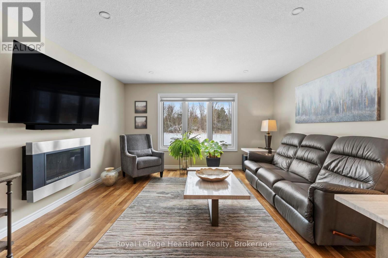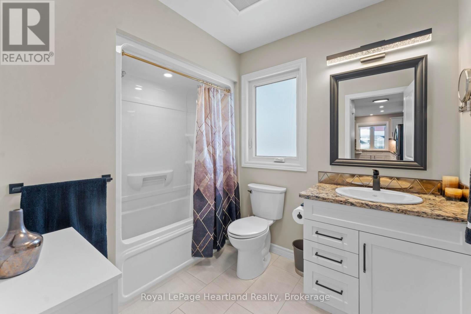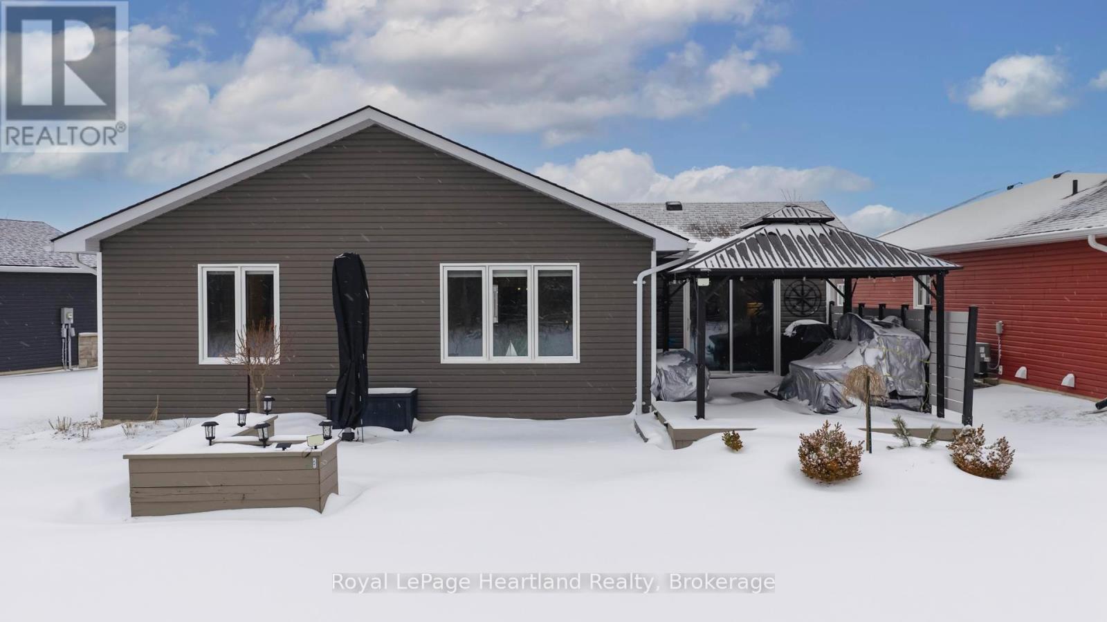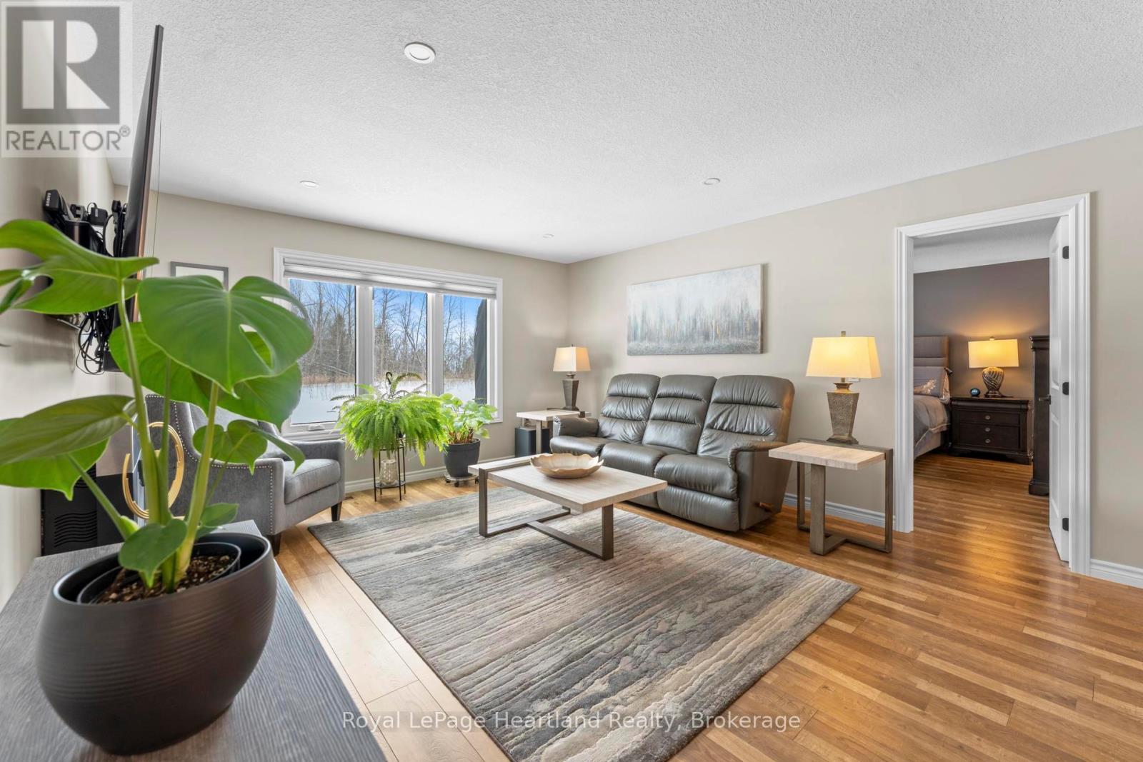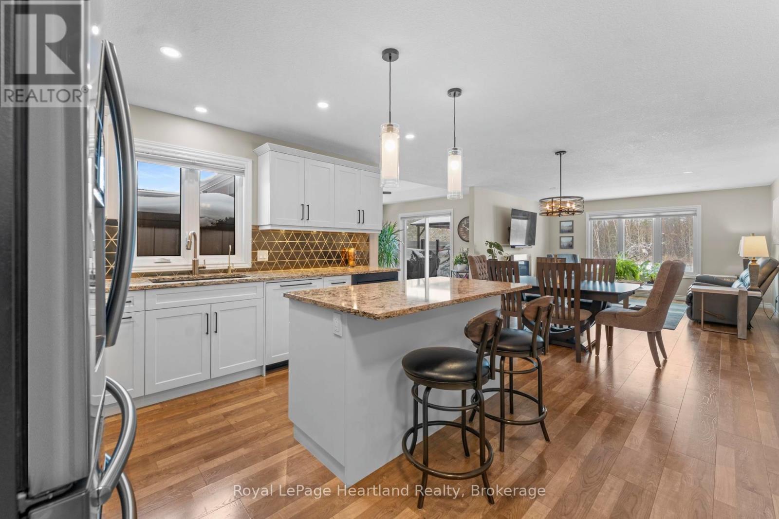 Prime location near the lake! Set in the highly sought-after Bluffs at Huron, this immaculate bungalow backs onto an open field and natural environment, offering a peaceful backdrop and privacy, while still being a short stroll to the community rec centre, lake access, and all the lifestyle perks that make this waterfront neighbourhood so desirable. This impressive "Lakeside with Sunroom" model offers approx. 1,455 sq ft of designed living space and a long list of quality upgrades. Curb appeal shines with manicured landscaping, mature trees and an inviting front porch. Inside, the bright, welcoming layout is finished with high-end continuous flooring and upgraded lighting. The custom kitchen is a standout with abundant cabinetry topped with crown moulding, soft-close doors, quartz countertops, tile backsplash, under-cabinet lighting, an enlarged centre island, built-in microwave, high-capacity range hood fan, Bosch panel dishwasher, and induction stove. The kitchen flows seamlessly into the dining area and sunroom featuring a tray ceiling and patio doors to the outdoors. Step outside to a spacious south-facing composite deck complete with gazebo, privacy wall, and a professionally installed 16' x 16' stone patio-perfect for entertaining or quiet evenings. The generous primary bedroom offers a walk-in closet and 3-piece ensuite. A second bedroom and a stylish 4-piece main bath complete the main level; both baths are upgraded with quartz counters, tile details and glass sliding shower doors. Relax in the living room beside the contemporary low-profile Solas gas fireplace with remote. Enjoy plenty of storage with multiple closets, a full crawl space, and an attached two-car garage. Bonus: six appliances included. Located in an upscale land lease community with a private recreation centre and indoor pool, close to shopping and several golf courses. Book your private showing today! (id:51300)