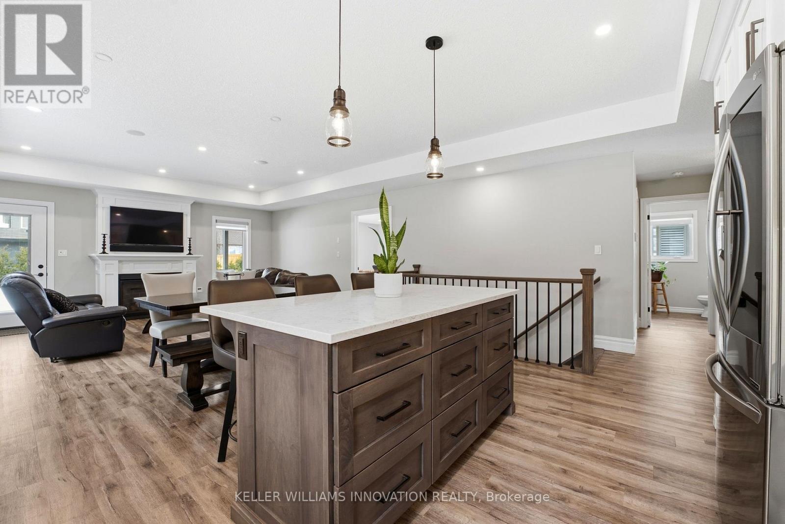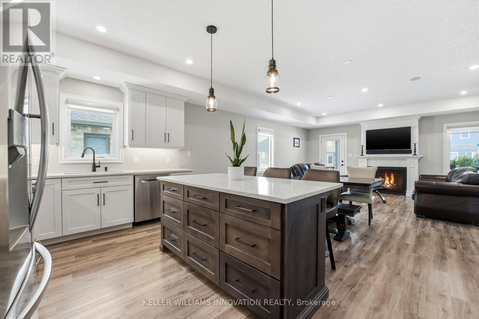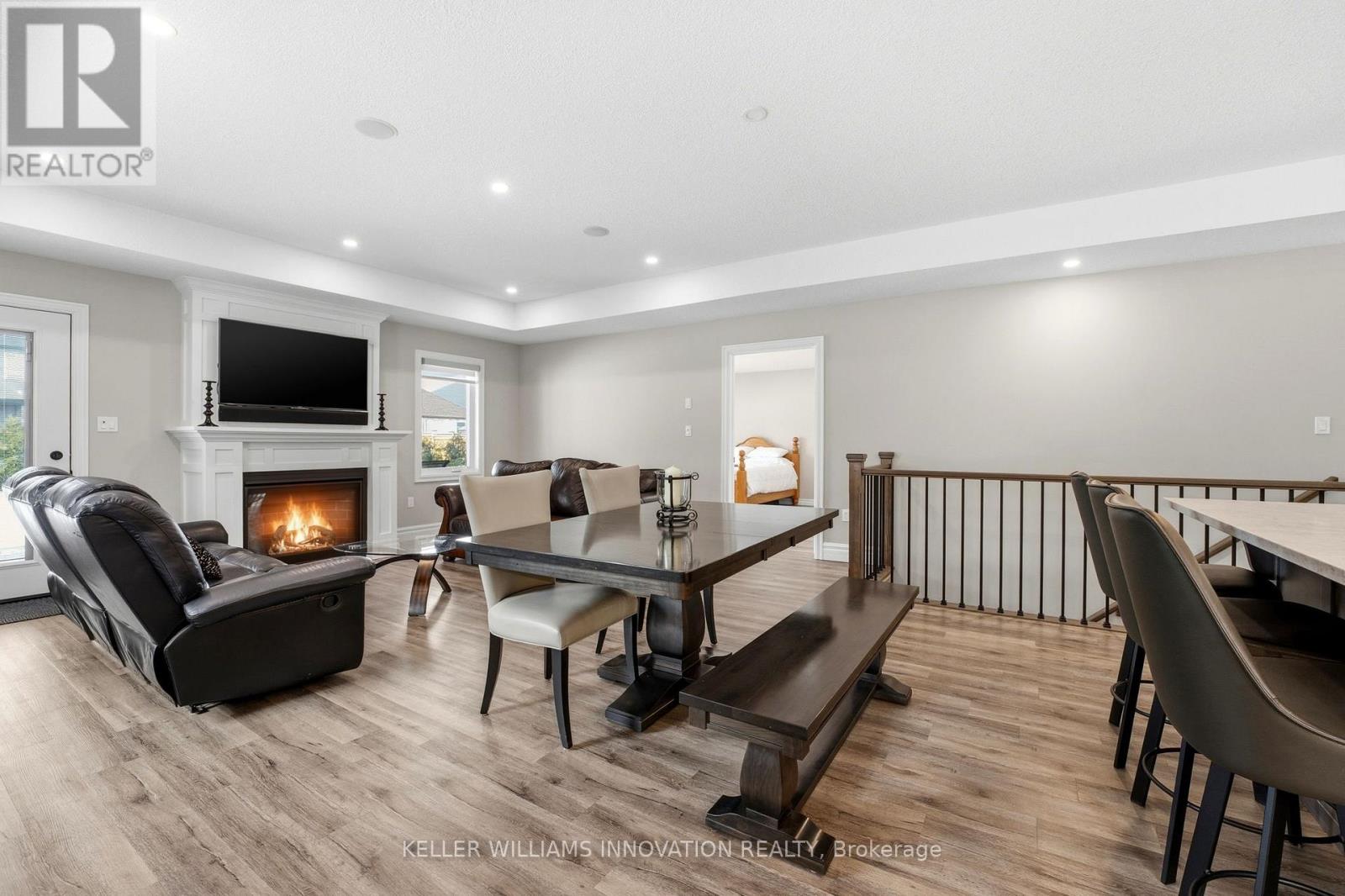 ACCESSIBLE RAMP, ROLL-IN SHOWER, ROLL-UNDER SINK. Enter through wide 36-inch doors into an open-concept living space where the kitchen, dining, and living areas flow effortlessly. The kitchen offers quartz countertops and abundant cabinetry and the living room has a gas fireplace. Main floor laundry makes daily routines simple, and a wheelchair ramp from the oversized garage ensures easy access. The main level includes two bedrooms and an accessible primary bathroom with a pocket door, roll-in shower, roll-under sink, and heated floors. Downstairs, the basement rec room features its own fireplace , a second bedroom, and full bathroom. In the backyard there is a covered Trex deck for relaxed outdoor living with the sun rising behind the home. The home has a stunning curb appeal with a front porch and parking for up to four cars. This home offers comfort and everyday ease in a welcoming community. (id:51300)