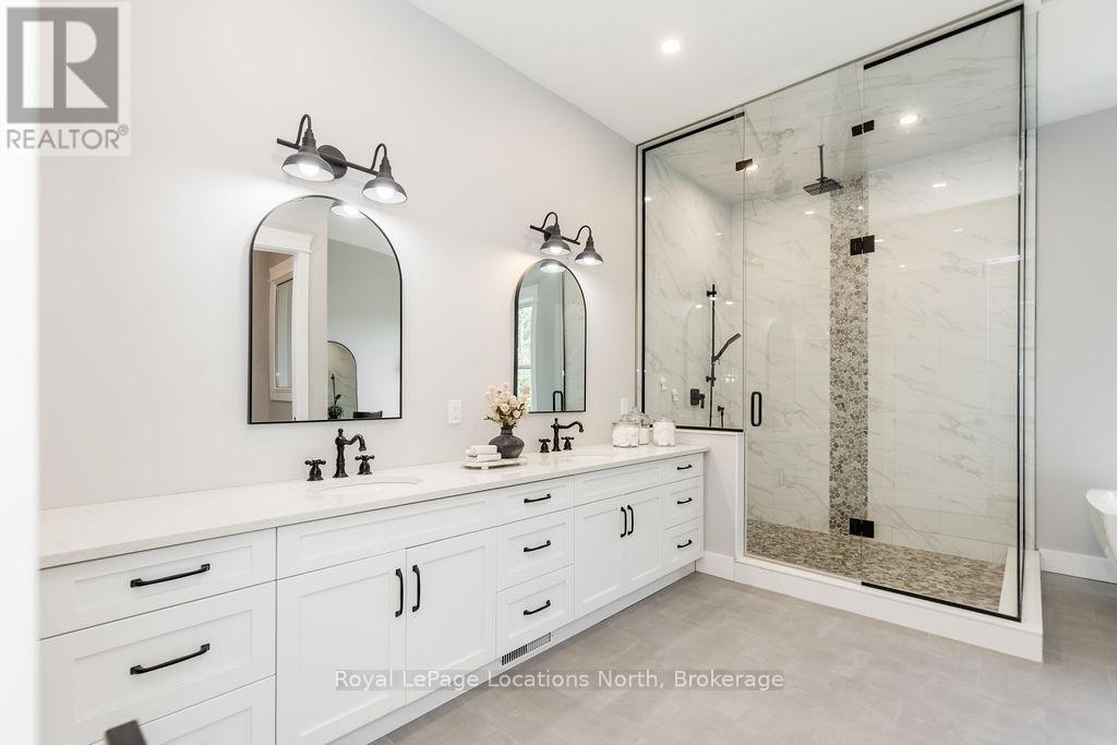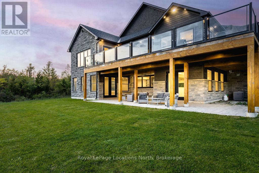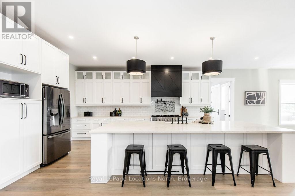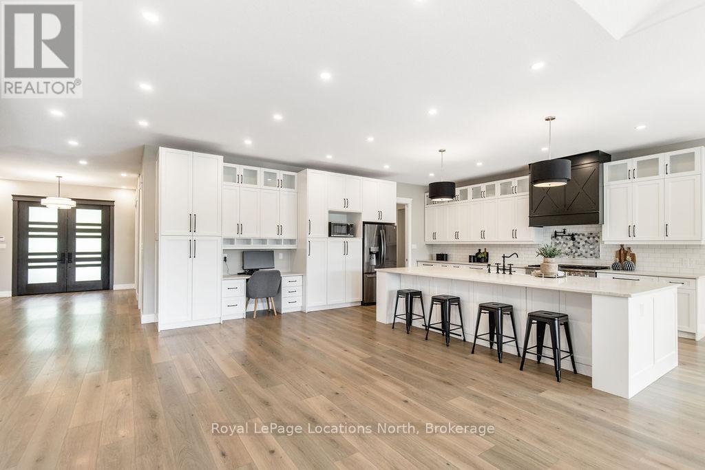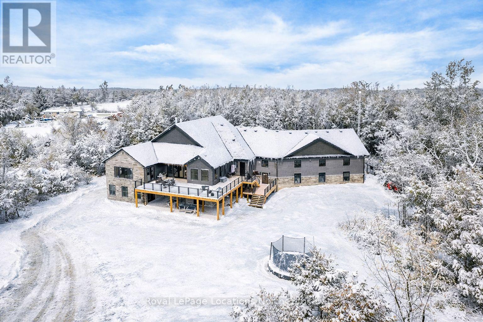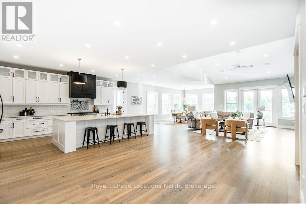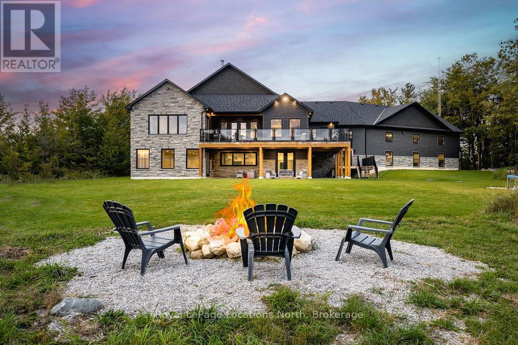 Welcome to a truly rare private estate set on 92 acres of pristine countryside with kilometres of private trails, mature forest, and an operational sugar shack built from on-site harvested timber with 300 maple taps. This 8,000+ total sq ft custom-built luxury home offers potential for 7-8 bedrooms plus an in-law suite, ideal for a multi-generational family compound, luxury retreat, or estate property.Designed for comfort and efficiency, the home features in-floor radiant heating throughout, two furnaces, and an oversized 3-car garage with inside entry to a spacious mudroom, mezzanine storage, and workshop area. The grand open-concept living space showcases vaulted ceilings, wide-plank flooring, pot lights, and large custom windows overlooking the property.The custom kitchen features a commercial-grade 46" Kucht gas range with 8 burners, oversized island, quartz countertops, custom hood, designer pendant lighting, butler's pantry, large laundry/pantry room, and built-in desk workspace. The home offers 3+2 bedrooms and 5 full plus 2 half bathrooms, all finished with quartz counters, custom vanities, tile surrounds, and designer lighting. A formal office with French doors supports remote work with strong high-speed internet.The primary suite includes its own heating zone, walk-in closet, and spa-inspired ensuite with floating tub, glass shower, and double vanity. The lower level offers 9-ft ceilings, a bar with folding window for indoor-outdoor entertaining, double-sided stone fireplace, wired theatre room, games room, gym with walkout, and a separate garage entrance with future locker or mudroom potential. Integrated sound system throughout the home, deck, and gym.Outside, enjoy a covered front porch with glass railings, armour stone steps, gardens, vegetable beds, and a cleared area for campouts or future use. The 3,000 sq ft heated shop features radiant floors, 16-ft ceilings, its own propane tank, and oversized garage doors. (id:51300)