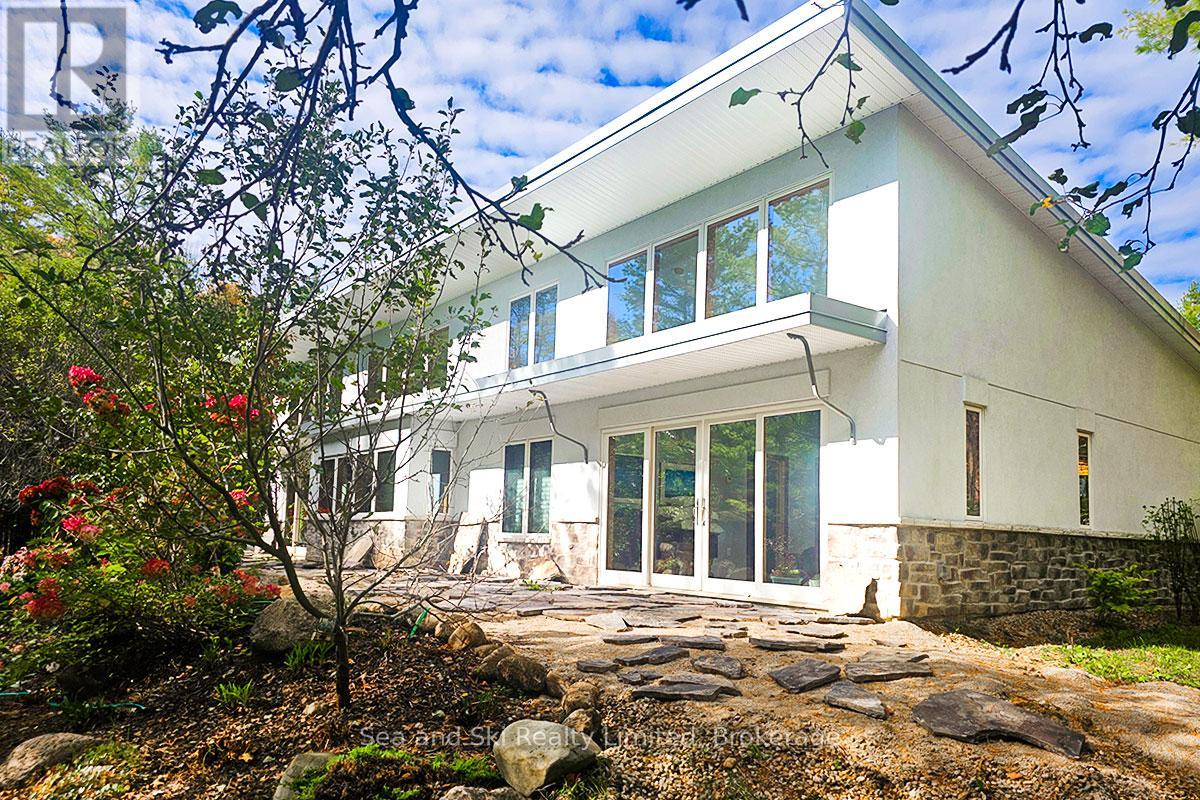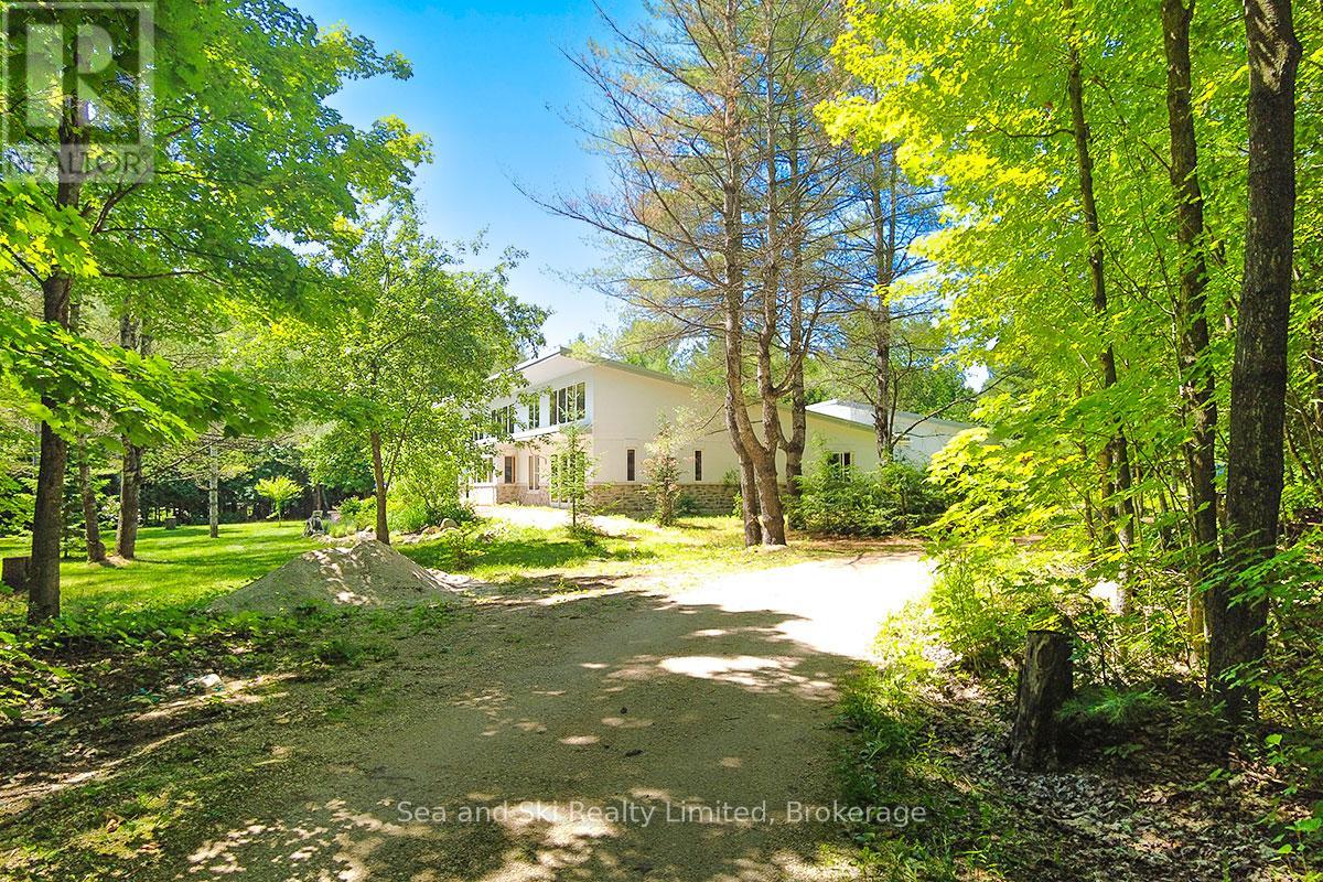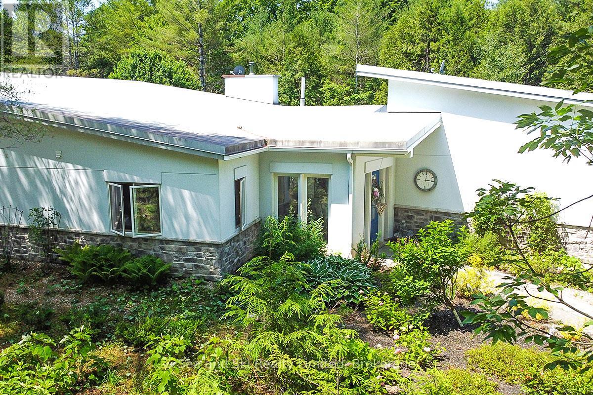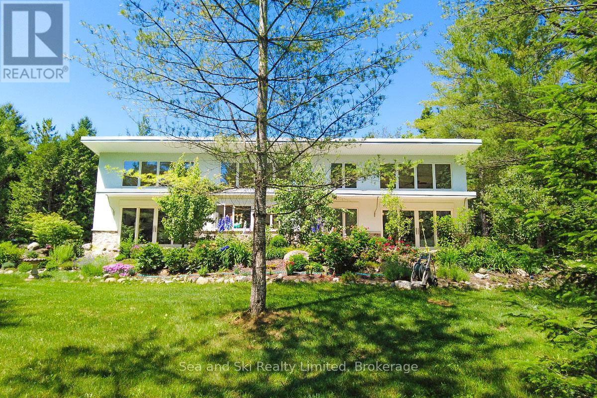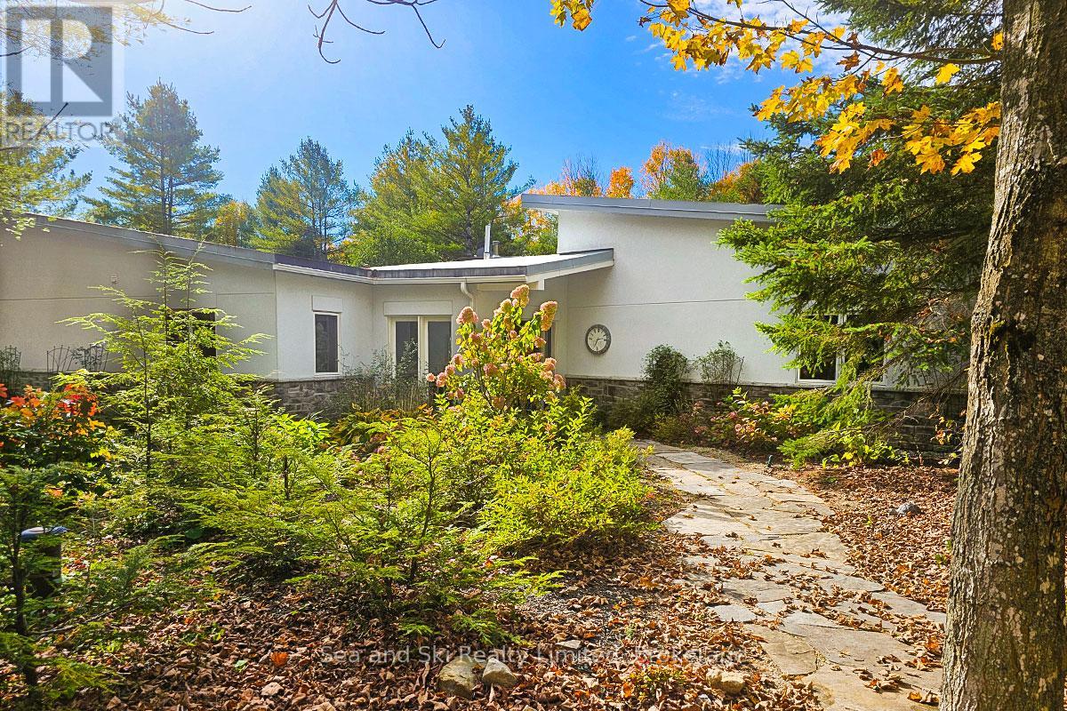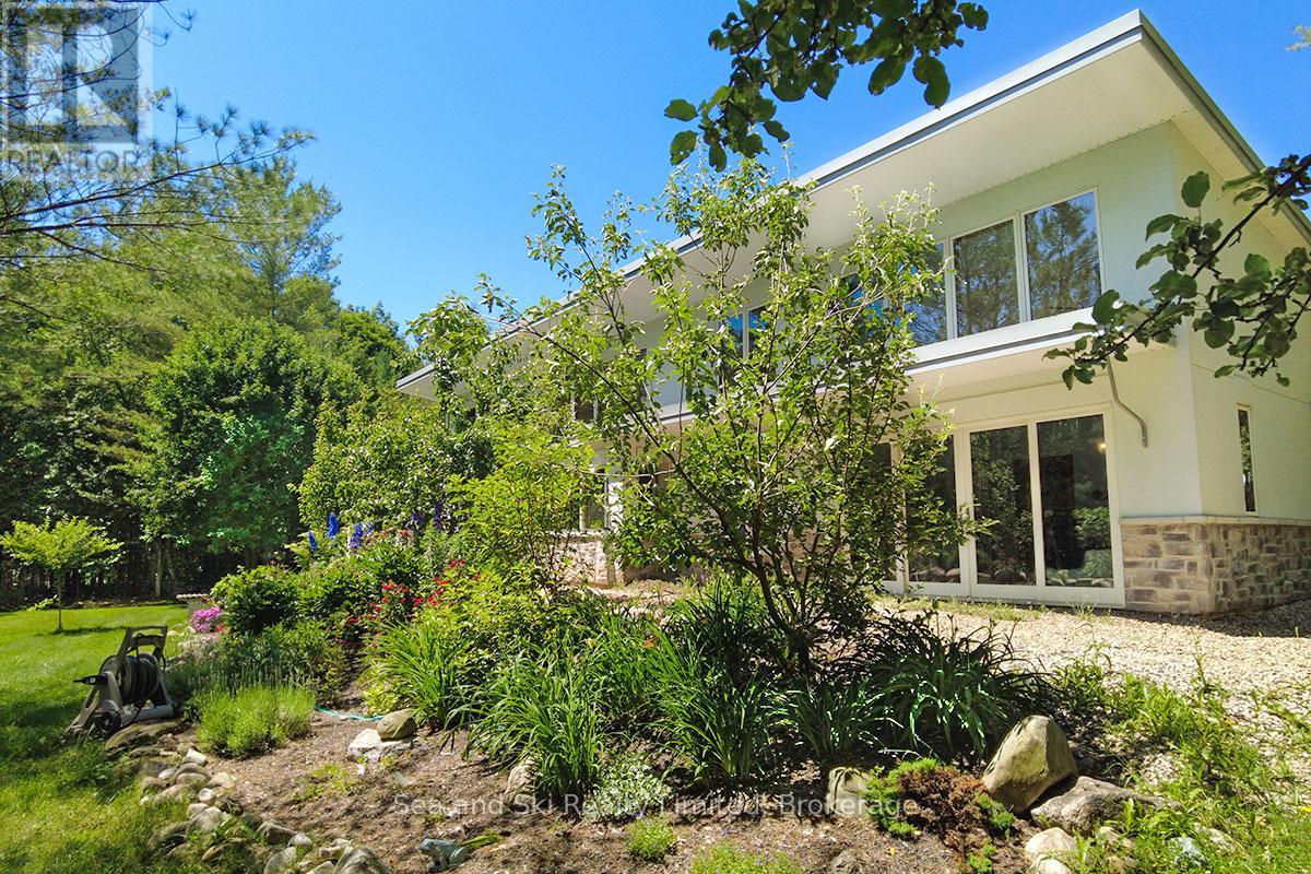 Modern Country Home on 4+ Acres. Contemporary Living Meets Natural Beauty! Discover the perfect blend of modern design and peaceful country living in this stunning custom-built Contemporary Style home, set on just over 4 private wooded acres. Thoughtfully designed with clean contemporary lines, soaring ceilings, and a wall of south-facing windows, this open-concept main floor living home captures natural light and passive solar heat throughout the winter months. The spacious primary suite offers a luxurious escape with a large walk-in closet and a spa-like walk-in shower. The sleek kitchen features Granite countertops and a stylish, functional layout ideal for entertaining or everyday living. In-floor hot air heating ensures year-round comfort and peace of mind. The oversized 2-car garage is built for more than just vehicles, boasting heated floors and a spacious storage loft, perfect for hobbyists or additional gear. Outside, enjoy a large fire pit, a private, well-treed lot with winding trails, a large garden/storage shed, and landscaping materials including multiple skids of flag stone ready for your finishing touches. Located just outside of Markdale, 15 minutes to the Beaver Valley, 40 minutes from Blue Mountain, 2 hours from the GTA, and minutes from hiking, cross-country skiing, ATV trails, and dozens of lakes and rivers for fishing and paddling, this is the ultimate four-season escape package. (id:51300)