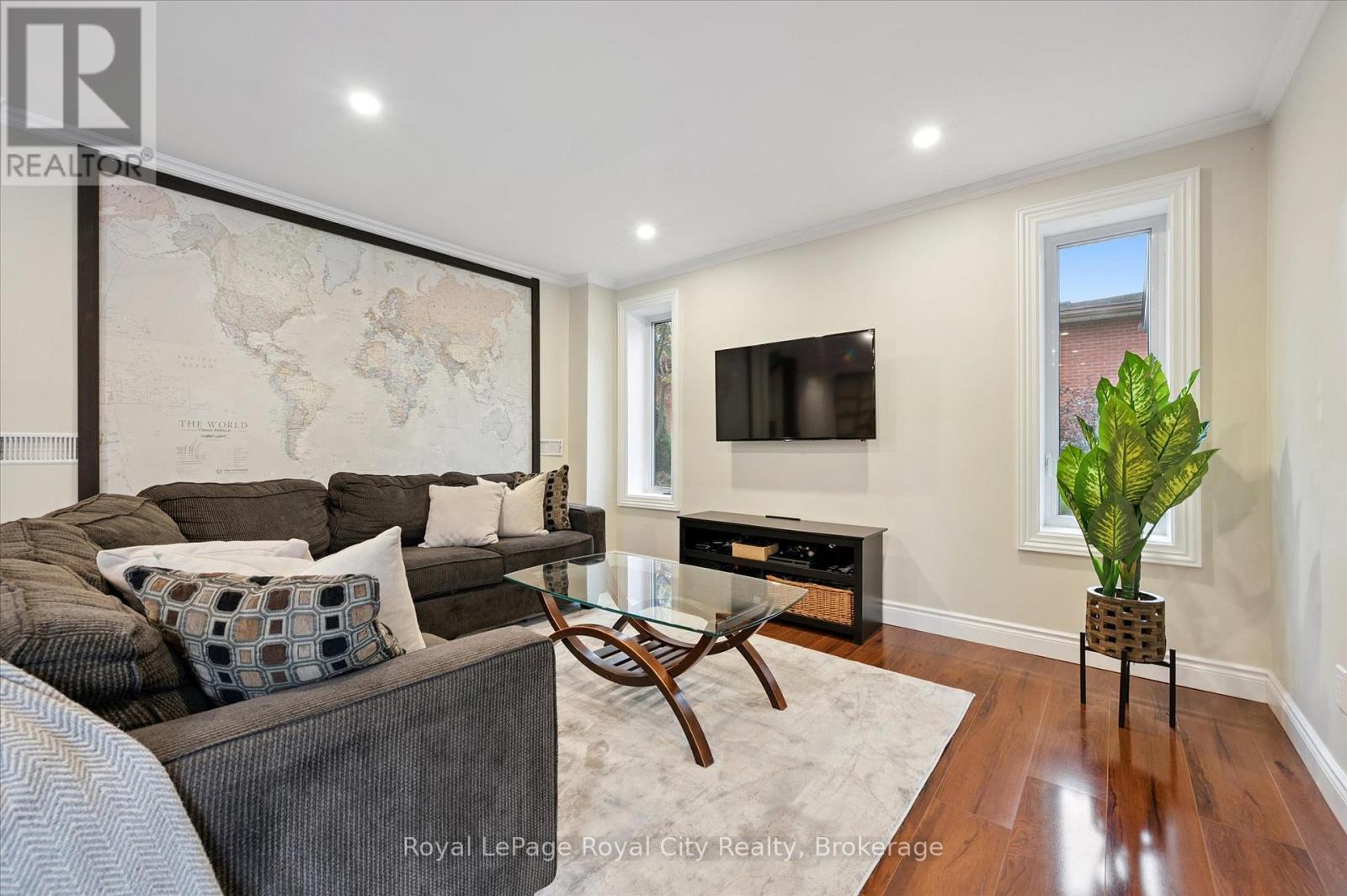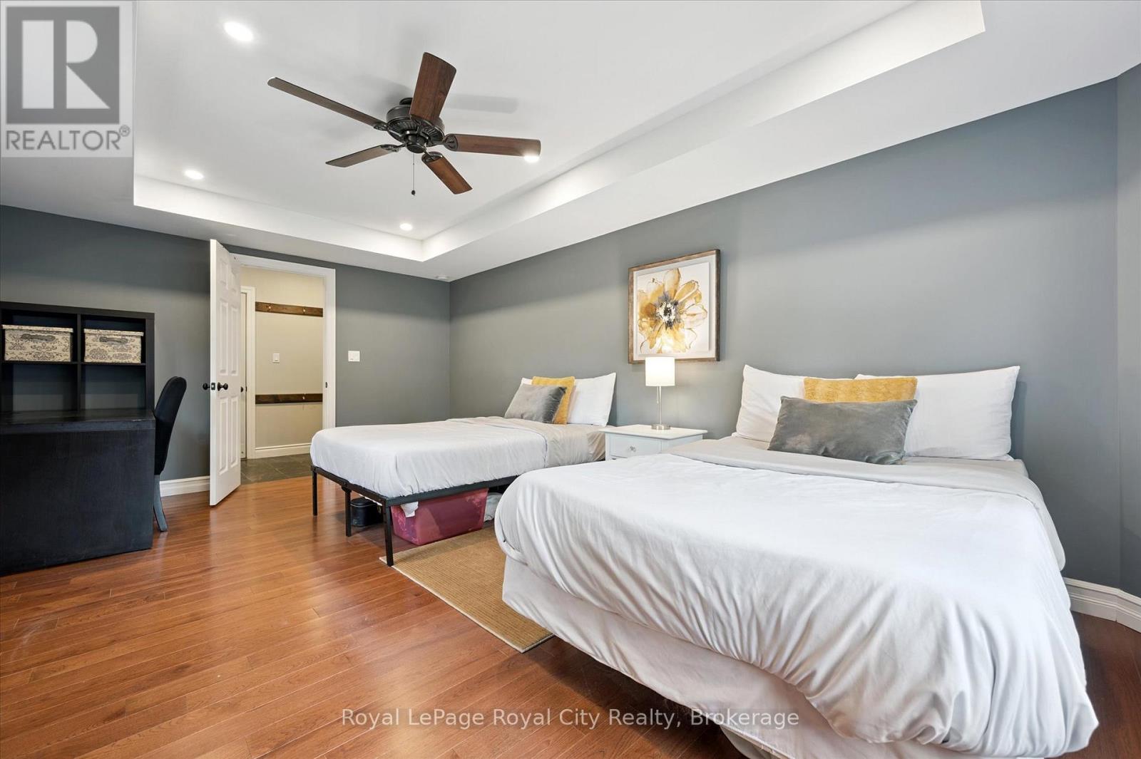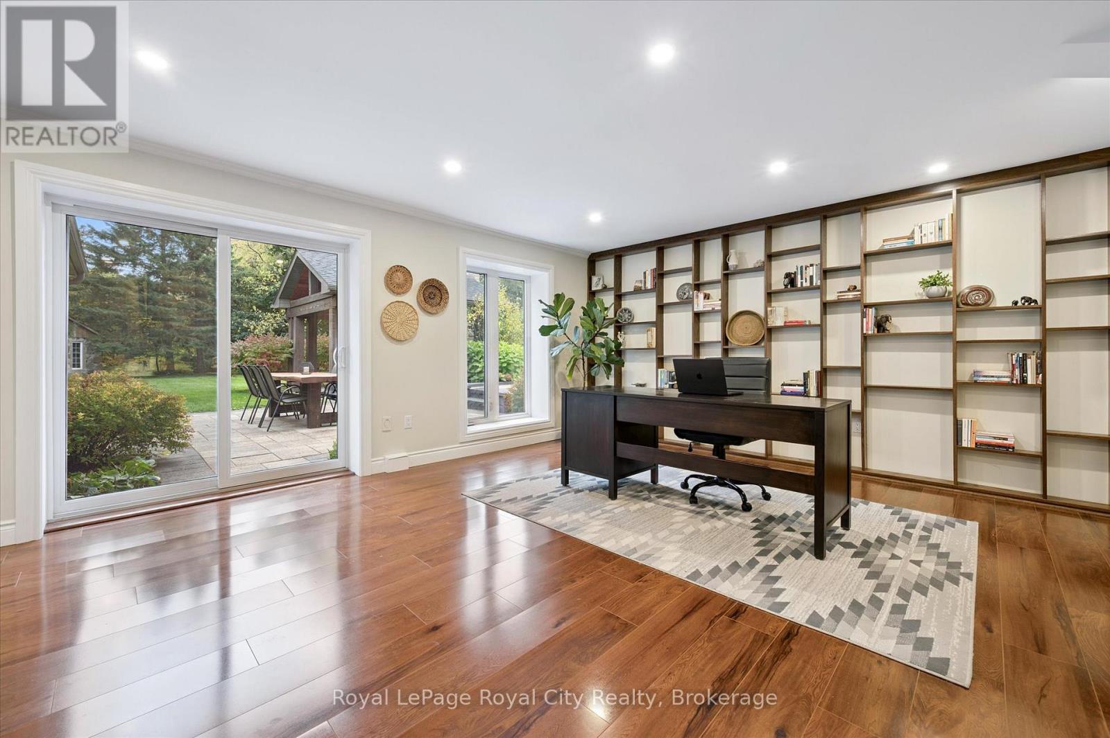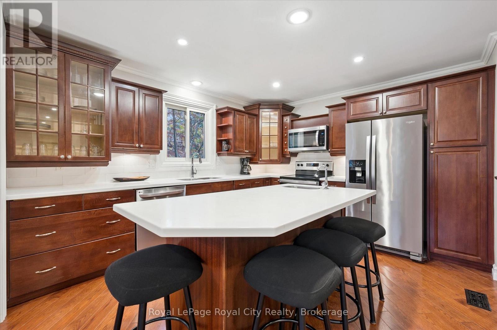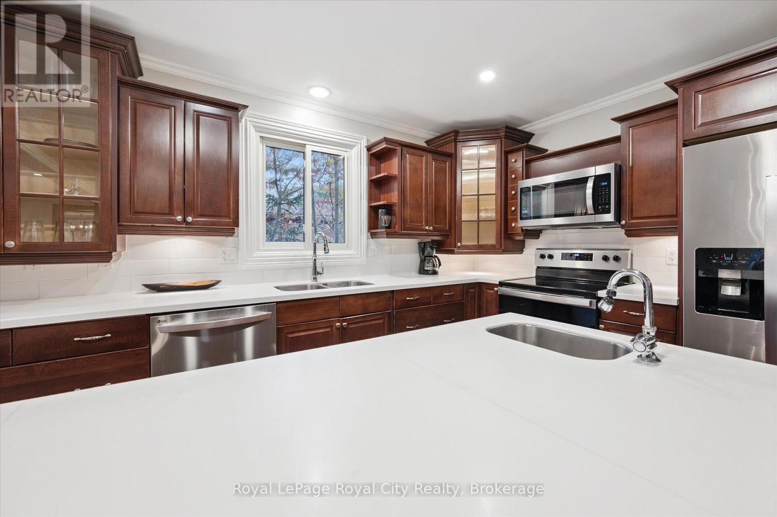 Tucked away on over an acre of peaceful, tree-lined property, this thoughtfully designed multi-level home offers a rare blend of space, style, and soul. From its inviting front porch to the rustic entertaining space out back, every inch of this 5-bedroom, 3-bathroom property invites connection with family, friends, and the natural beauty that surrounds it. Upon entrance, you will quickly fall in love with the open-concept design, enhanced by gleaming hardwood flooring. The chef-inspired kitchen showcases sleek Corian countertops, custom cabinetry, and a functional island that flows perfectly into the combined living/dining room, creating an elegant space for entertaining. A sizable main floor bedroom is ideal for guests or a home office, while a well-equipped mudroom supports busy family living. Descend to the show-stopping lower-level family room, anchored by an attractive fireplace, and flaunting vaulted ceilings, engineered hardwood, skylights, and floor-to-ceiling windows capturing breathtaking backyard views. The adjoining games/rec area is designed for fun and function, complete with heated floors, backyard access, and a modern 3pc bathroom. Upstairs, the 2nd level provides 2 generous bedrooms and a loft space, perfect for a reading nook or study, alongside an updated 4pc bathroom. The private, 3rd level offers a primary suite with a walk-in closet and a 5pc ensuite, as well as a 5th spacious bedroom. The finished basement extends a versatile living or recreational space, complemented by a dedicated laundry room and storage/utility room. Step outside and prepare to be captivated: a 2-tier stone patio frames alfresco dining and a rejuvenating hot tub area, while the rustic post-and-beam gazebo with a striking stone fireplace promises memorable evenings under the stars. Surrounded by mature trees and lush green space, this property evokes the feel of a private resort retreat- just minutes from essential amenities and ready to welcome your next chapter. (id:51300)