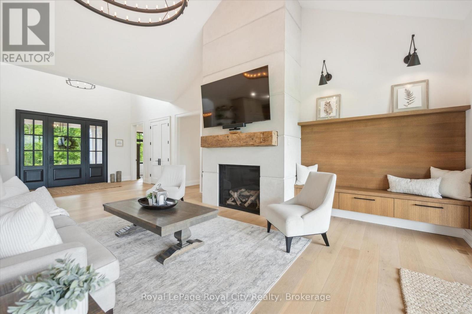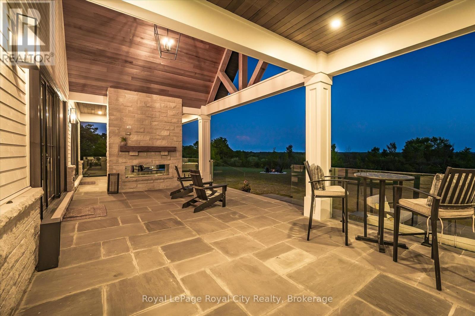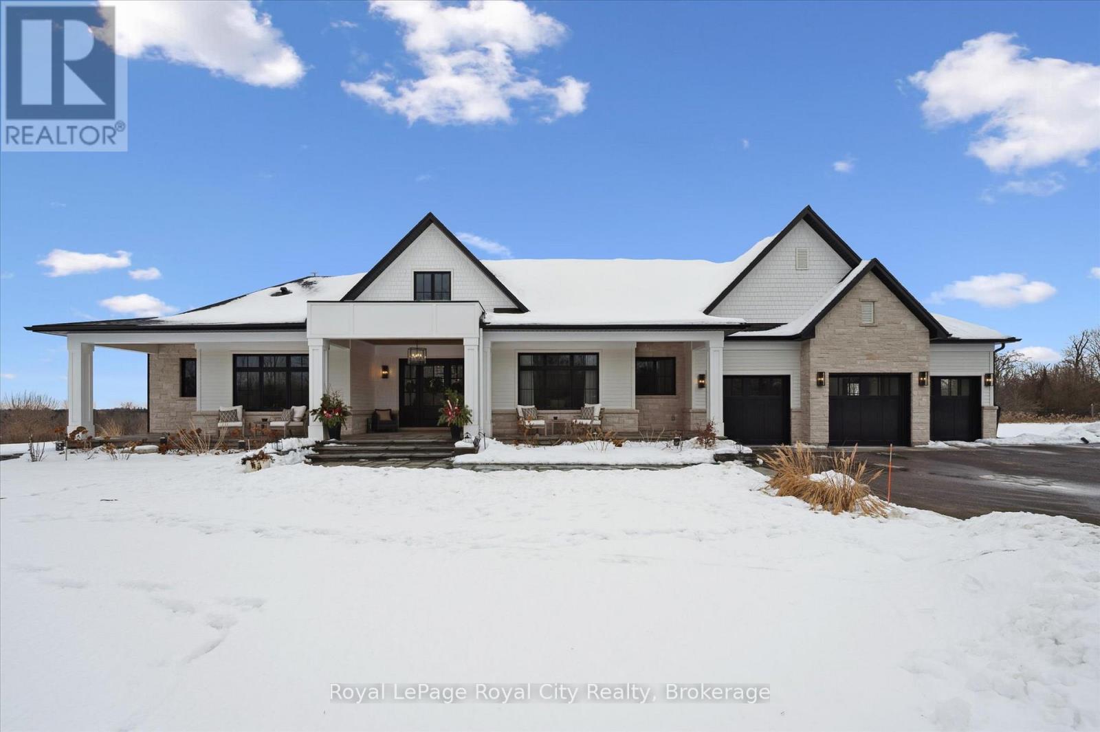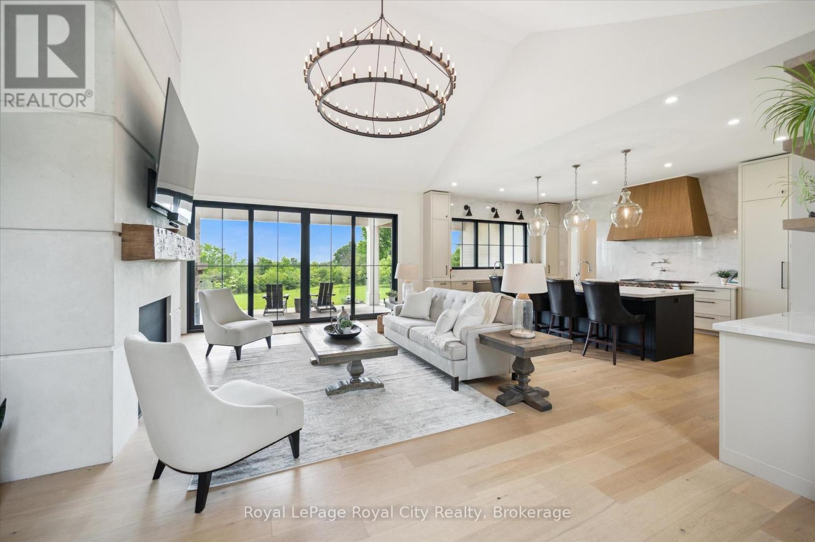 Custom-Built Luxury Bungalow on 2.4 Private Acres with Escarpment Views. Welcome to this one-of-a-kind custom-built bungalow offering 3,400 sq. ft. of refined main floor living space, perfectly nestled on 2.4 acres of serene countryside. With panoramic views of the escarpment and set well back from the road, this residence offers exceptional privacy while being just 20 minutes from the 401. Designed with luxury and functionality in mind, the home boasts soaring ceilings and oversized windows, creating an expansive, airy ambiance throughout allowing the natural landscape in and flooding the home with light. The main level features a seamless open-concept layout anchored by a great room and primary bedroom with oversized sliding doors opening to an extended outdoor living space with a two sided fire place, hot tub, and an abundance of entertaining space. The heart of the home is a chefs dream kitchen outfitted with top-tier Wolf, SubZero, and Cove appliances, complemented by a stylish servery just off the formal dining room. Retreat to the spacious primary suite, a true sanctuary offering an oversized spa-inspired ensuite complete with heated floors, a large walk-in shower, water closet, luxurious soaker tub, dual sinks with an extended vanity, and a generously sized walk-in closet. Two additional bedrooms on the main floor each enjoy their own private ensuites. Downstairs, the wow factor continues. The 10-foot ceilings and expansive windows make the finished basement feel anything but below grade. Designed for versatility, the lower level includes a full gym, sauna, and a private entry from the oversized 3-car garage making it perfect for an in-law suite. This separate living space features a bedroom, full bath, and kitchenette with a fridge, sink, and microwave. Every detail has been thoughtfully considered. Truly, this is a rare opportunity to own a stunning estate home where luxury, privacy, and convenience converge. (id:51300)