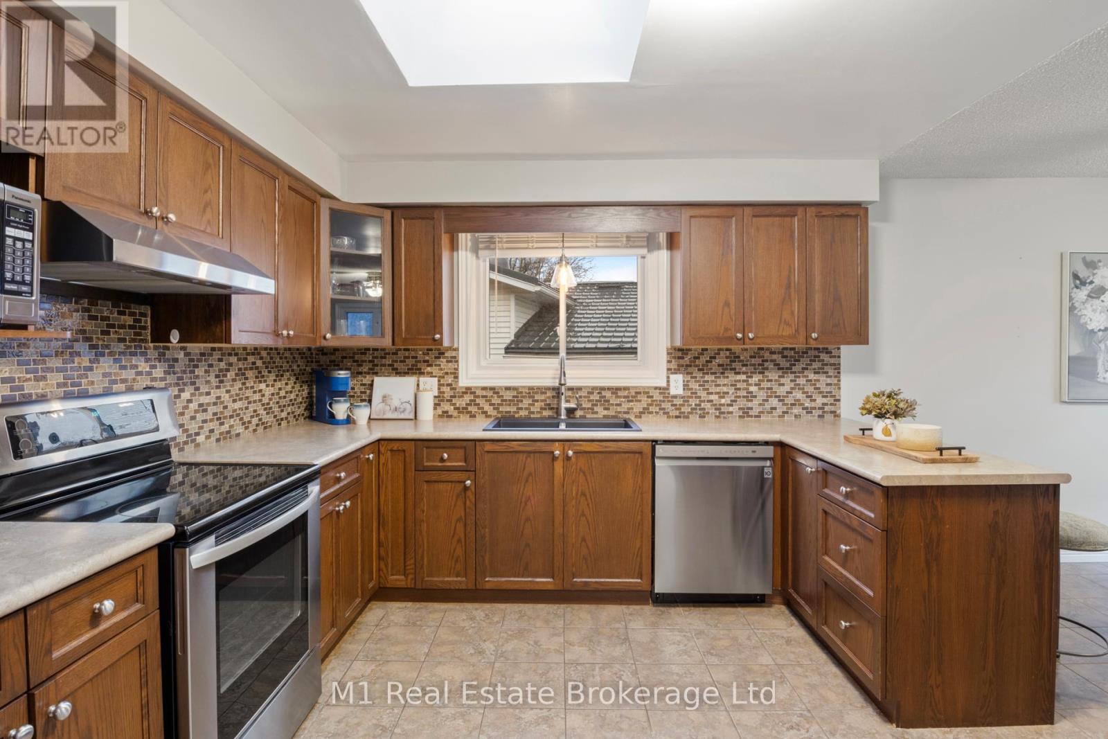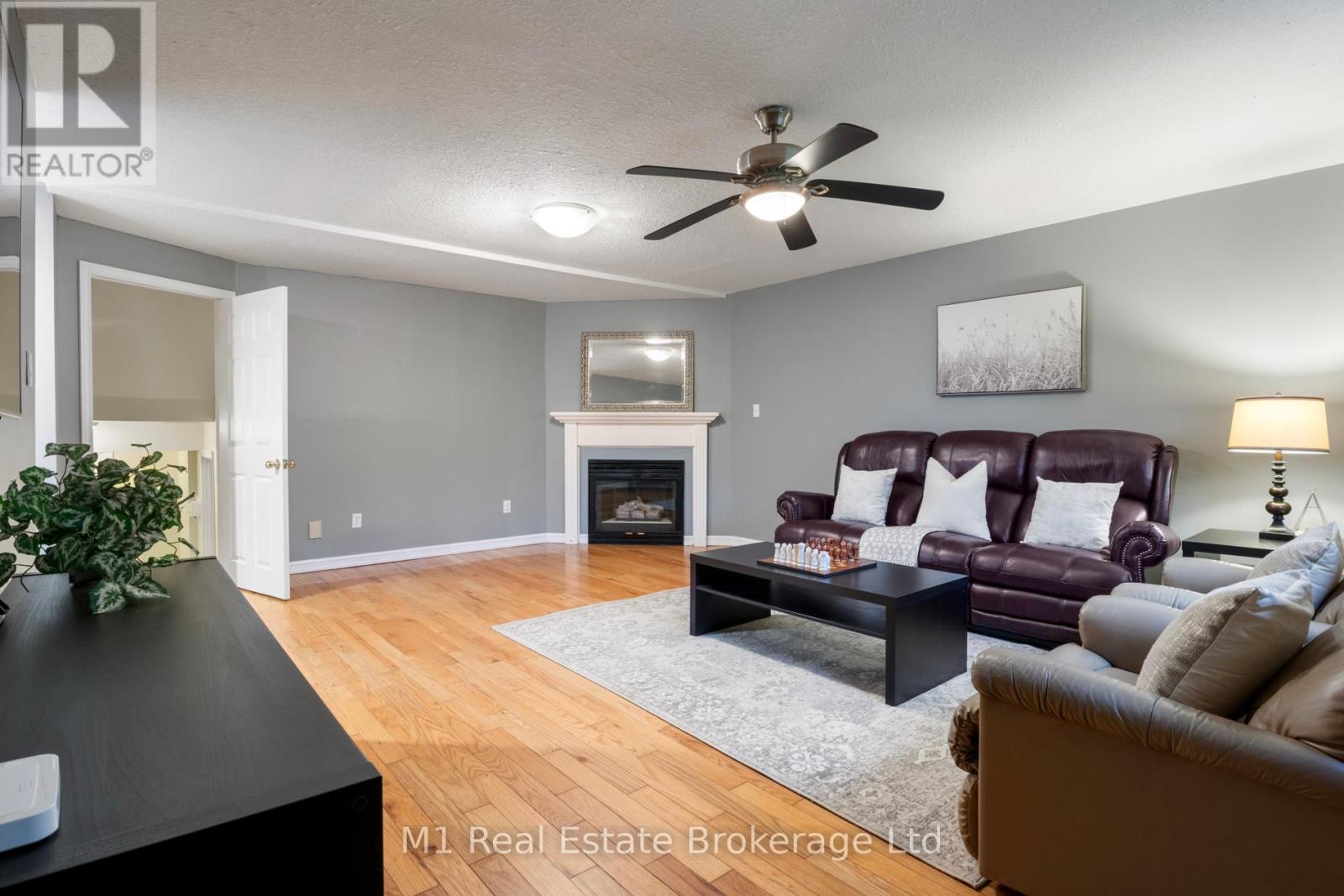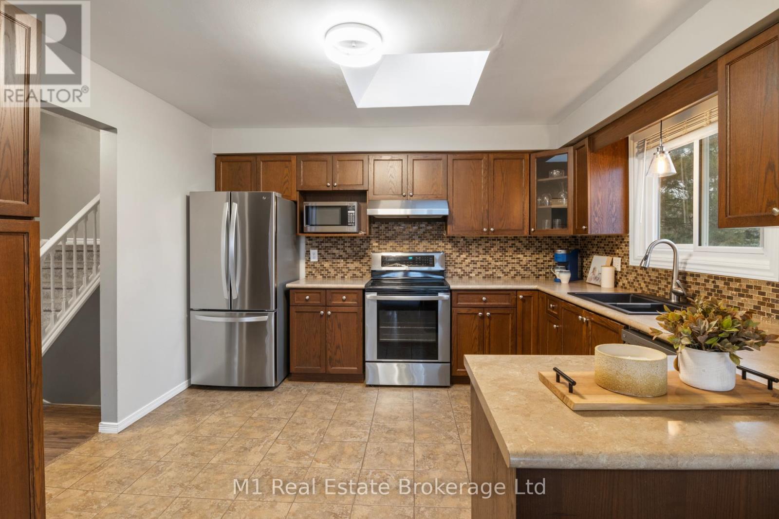 Spacious backsplit in a mature Fergus neighbourhood offering over 2,000 sq. ft. of finished living space and a great family-friendly layout across four levels. Three bedrooms upstairs plus a fourth on the lower level, along with three bathrooms including a 3-piece ensuite. Bright kitchen with 2020 appliances opens to the dining area with large windows and a skylight. The main living room walks out to the large backyard, while the lower-level family room features a gas fireplace and a separate entrance-ideal for extended family or in-law potential. Major updates include: furnace (2019), A/C (2020), carpet (2020), water softener (2020), roof (2022), ensuite (2021), main bath (2024), and water heater (2024 - rental). Convenient location close to downtown Fergus, the Grand River, trails, Sportsplex, schools, and an easy commute toward Guelph. (id:51300)