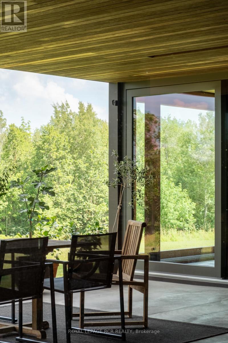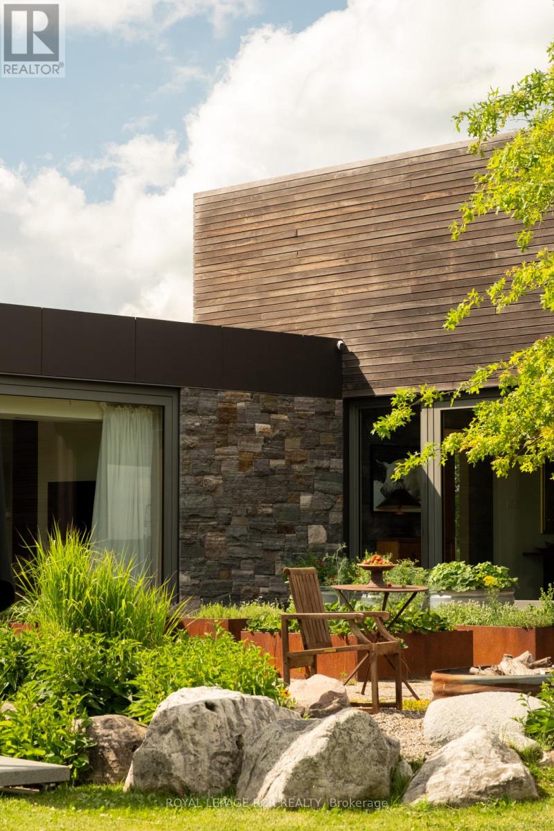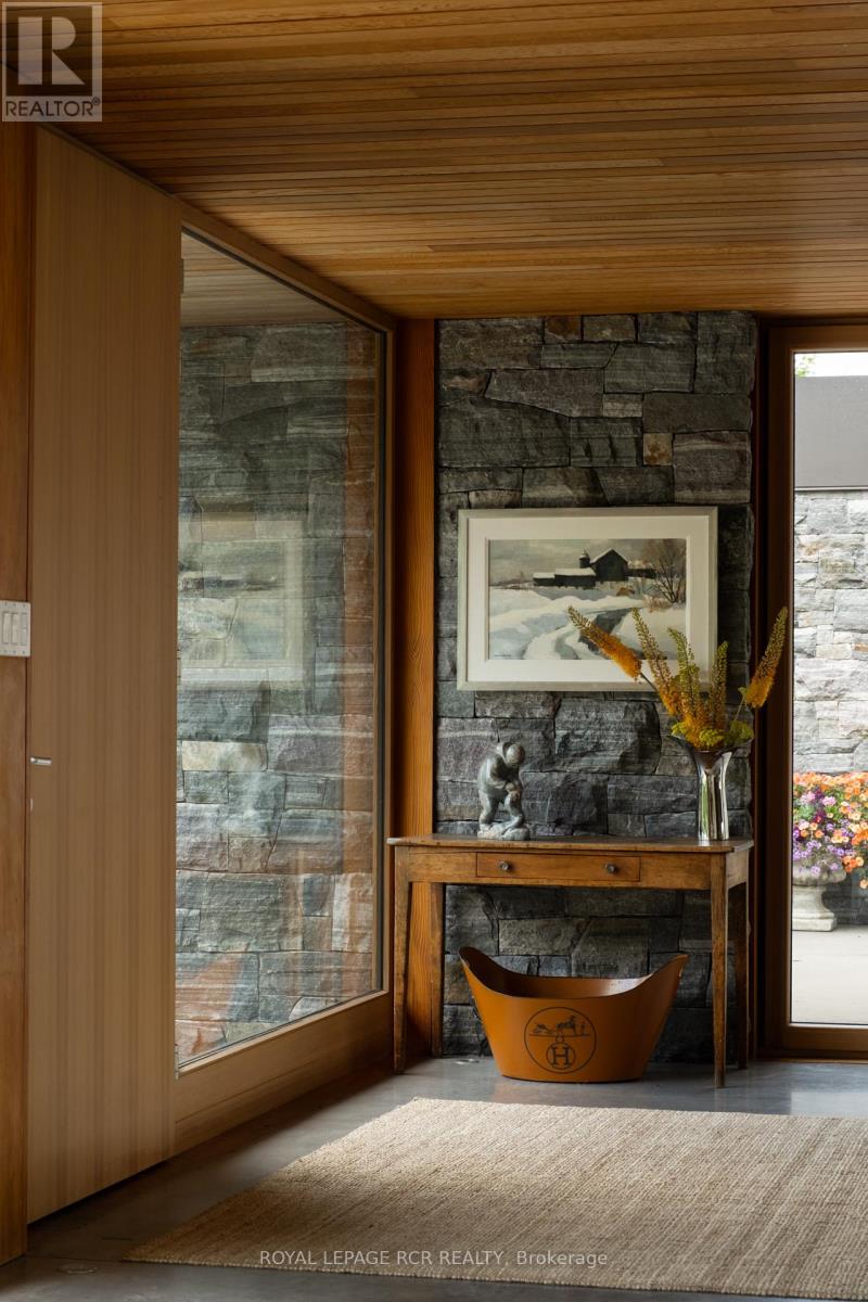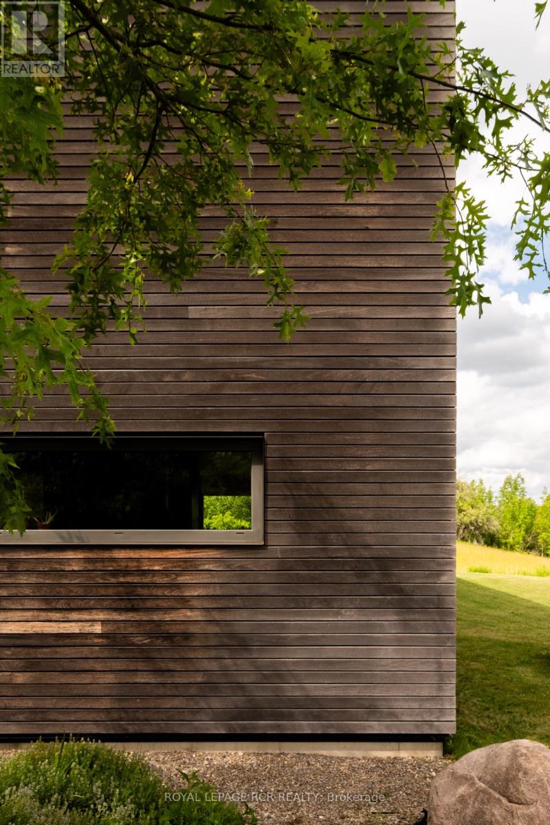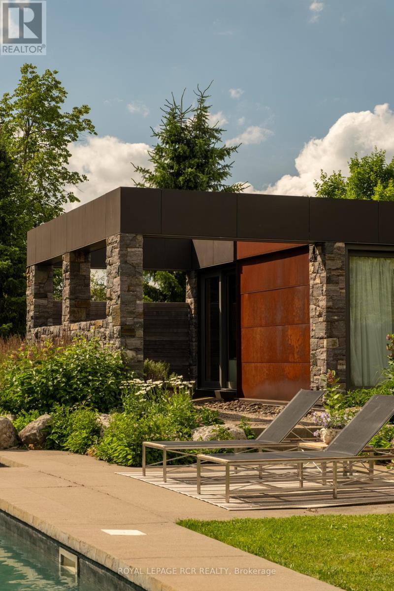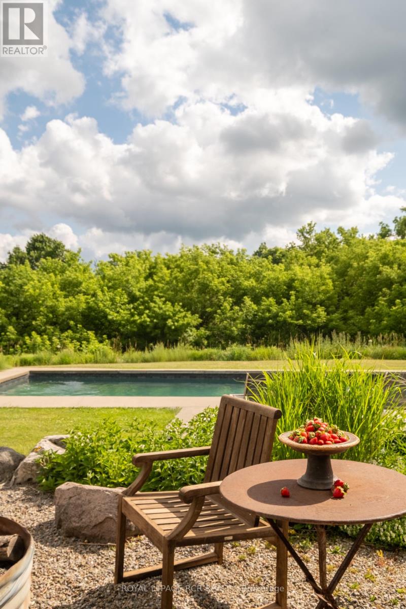 A soulful modern residence designed to sync with the rhythm of the sun, offering incredible vistas from all spaces & making an effortless connection between indoors & out. Nestled on approx. 98 acres in the bucolic countryside of Erin, bordering Caledon, a long heritage stone wall lined driveway leads to a striking modern masterpiece. Surrounded by organic farmland & woodlands w/ acres of groomed trails, it's a rare find w/ a spectacular 40' pool overlooking the lush landscape & gardens. This remarkable large-footprint family home unfolds w/ a series of dynamic living spaces. 5 bedrooms, 6 bathrooms & over 8500 sq ft including the basement, it is defined by natural materials like heated concrete floors, douglas fir cladded ceilings & stone masonry. A fabulous balance of raw materiality w/ beauty & comfort. The kitchen & dining room are surrounded by glass, connecting the home to the properties incredible sunrises & sunsets. A handsome two-way focal fireplace is in the open-plan living area. The primary wing is a retreat w/ a spa-like ensuite, walk-in closet & a walkout to a garden terrace & the pool. On the other side of the home, several gorgeous sized bedrooms each w/ expansive windows & their own special view. The lower level is a world of its own w/ a separate entrance, home gym, additional family room, & workshop. A thoughtfully designed mudroom w/ custom lockers provides a discreet & organized hub for all gear, from equestrian to ski equipment. Two full baths, including a second primary suite w/ ensuite, create a sanctuary for family or guests. Advanced details include retractable Doepfner windows w/ low emissivity glazing, 6 zone radiant floor heating and central air, geothermal pumps for heating & cooling, PU-foamed wall cavities, commercial grade reflective membrane roof, & a propane powered generator w/ automatic switch. Magnificent in every way, a sanctuary of impeccable design, a place where artistry & comfort come together that truly inspires. (id:51300)