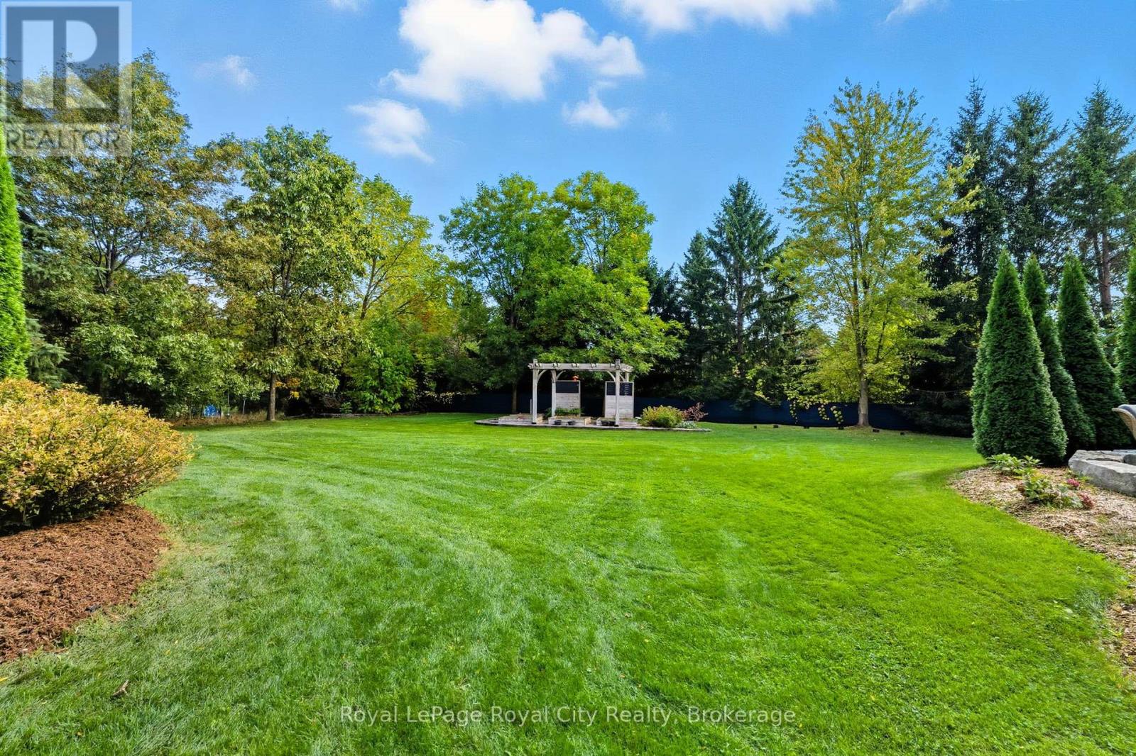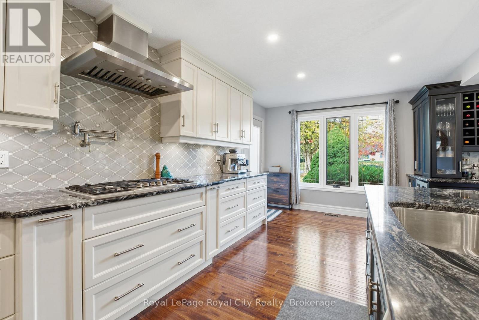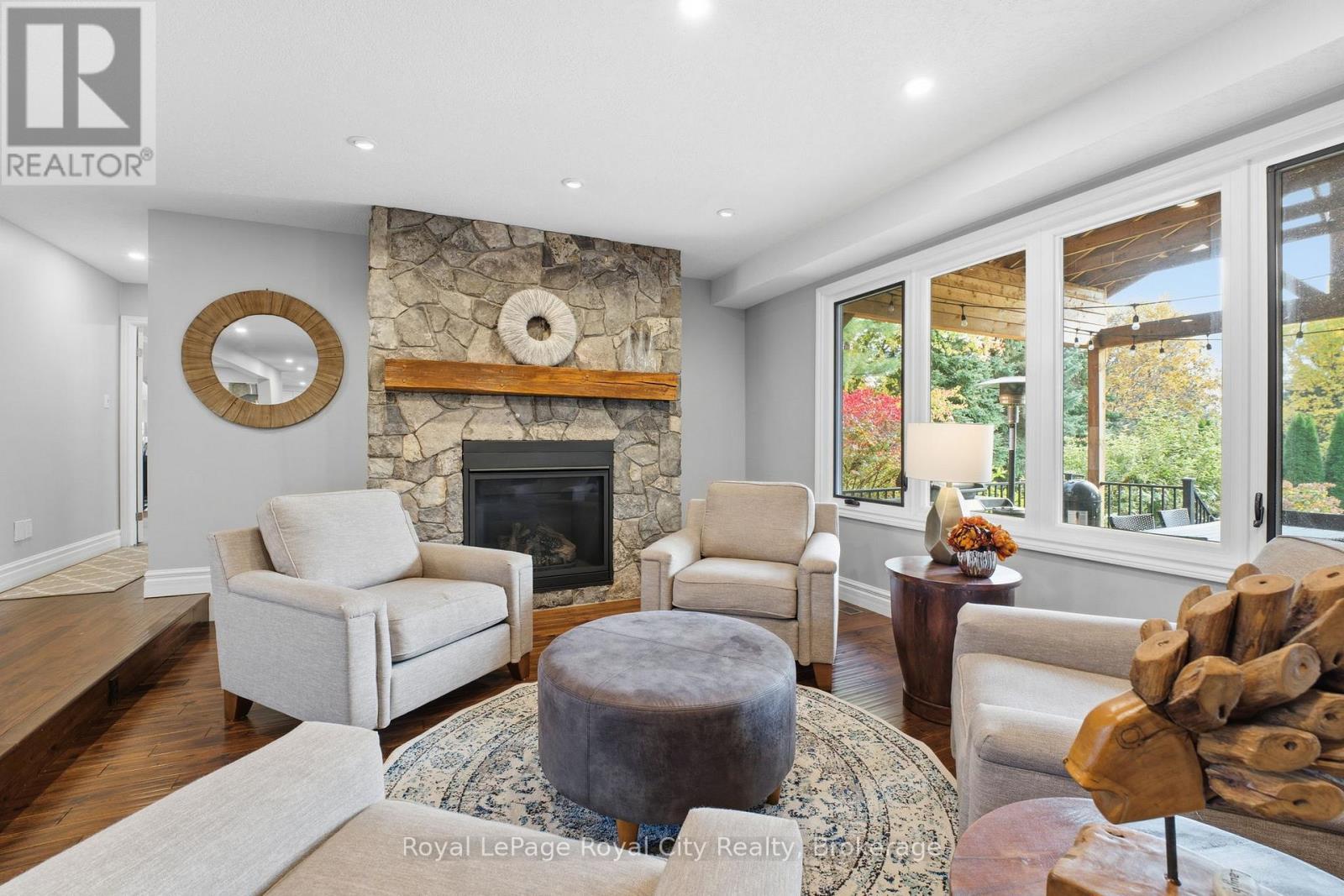 Welcome to a rare offering in one of the area's most coveted neighbourhoods.Set on a mature, tree-lined lot with towering maples and a circular drive, this exceptional 1.5-storey home blends timeless character with refined modern living. The reclaimed brick exterior hints at the craftsmanship within, while the private, resort-style backyard is truly one of the finest in the community.Step outside and prepare to be impressed. A saltwater pool anchors the outdoor oasis, complete with a charming pool cabana featuring a gas fireplace and multiple seating areas that invite relaxation and entertaining. A two-level composite deck, newly covered by a stunning pavilion boasts a hot tub overlooking a second stone patio with firepit and gazebo. Lush perennial gardens surround the entire yard, ensuring colour and beauty year round.Inside, the home is equally impressive. The main floor is designed for both connection and comfort, open concept ,yet thoughtfully defined. Large principal rooms, framed by generous windows, fill the space with natural light. The living room features a stone fireplace handcrafted by a local mason, paired with a rich timber mantle that becomes the heart of the home.The grand main-floor primary suite is a sanctuary of its own, offering an oversized bedroom, a dedicated dressing room, and serene views of the grounds. The versatile kitchen is ideal for both everyday living and entertaining, complete with gas cooktop, double ovens, granite island, walk-in pantry, and a beverage station. Upstairs, two additional bedrooms share a full bath.The fully finished walk-up basement adds exceptional functionality with a billiards area, bar for entertaining, TV/media space, games room, and three additional bedrooms-perfect for extended family or guests.A rare opportunity to own a home that combines craftsmanship, luxury, and resort-style outdoor living all minutes to the amenities and conveniences of the South End of Guelph and quick access for commuters. Impressive. (id:51300)