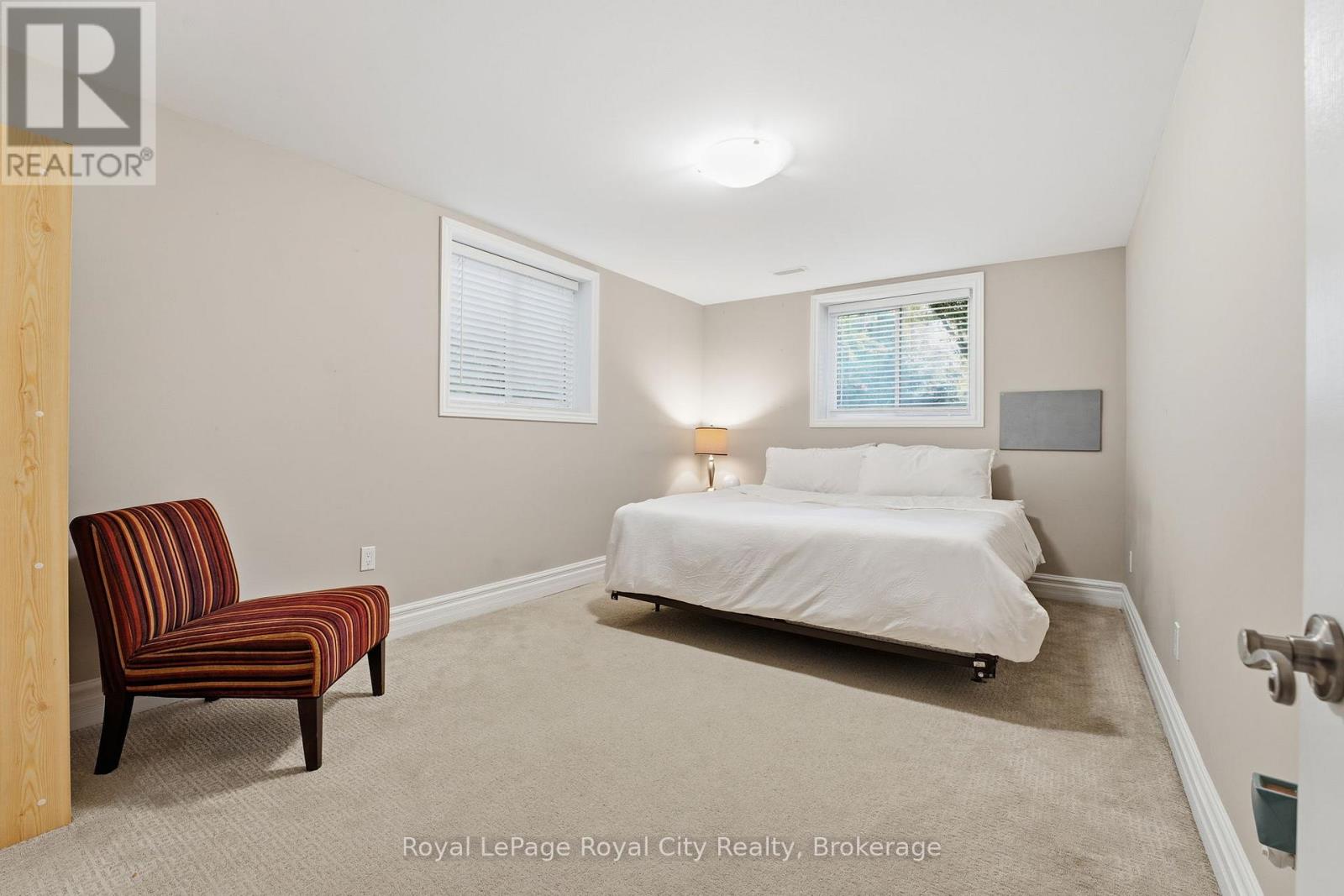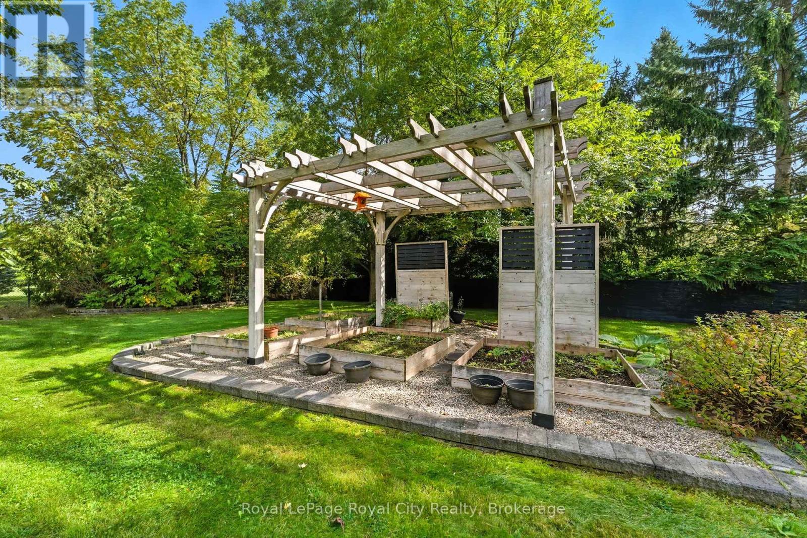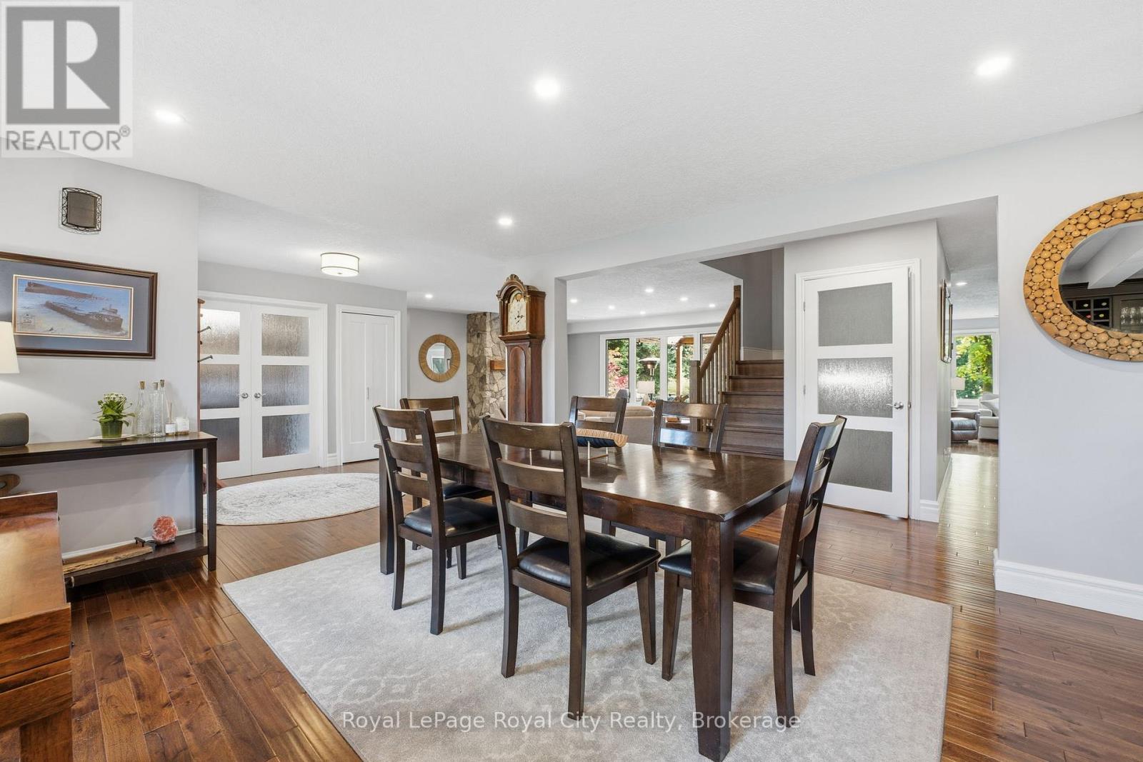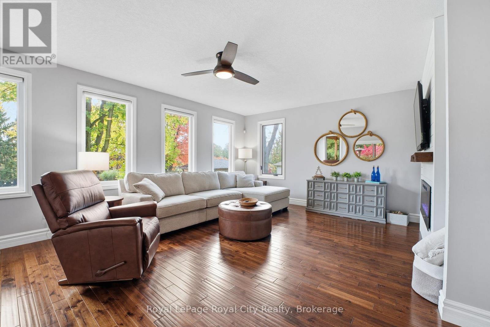 Welcome to a rare offering in one of the area's most coveted neighbourhoods.Set on a mature, tree-lined lot with towering maples and a circular drive, this exceptional 1.5-storey home blends timeless character with refined modern living. The reclaimed brick exterior hints at the craftsmanship within, while the private, resort-style backyard is truly one of the finest in the community.Step outside and prepare to be impressed. A saltwater pool anchors the outdoor oasis, complete with a charming pool cabana featuring a gas fireplace and multiple seating areas that invite relaxation and entertaining. A two-level composite deck, newly covered by a stunning pavilion boasts a hot tub overlooking a second stone patio with firepit and gazebo. Lush perennial gardens surround the entire yard, ensuring colour and beauty year round.Inside, the home is equally impressive. The main floor is designed for both connection and comfort, open concept ,yet thoughtfully defined. Large principal rooms, framed by generous windows, fill the space with natural light. The living room features a stone fireplace handcrafted by a local mason, paired with a rich timber mantle that becomes the heart of the home.The grand main-floor primary suite is a sanctuary of its own, offering an oversized bedroom, a dedicated dressing room, and serene views of the grounds. The versatile kitchen is ideal for both everyday living and entertaining, complete with gas cooktop, double ovens, granite island, walk-in pantry, and a beverage station. Upstairs, two additional bedrooms share a full bath.The fully finished walk-up basement adds exceptional functionality with a billiards area, bar for entertaining, TV/media space, games room, and three additional bedrooms-perfect for extended family or guests.A rare opportunity to own a home that combines craftsmanship, luxury, and resort-style outdoor living all minutes to the amenities and conveniences of the South End of Guelph and quick access for commuters. Impressive. (id:51300)