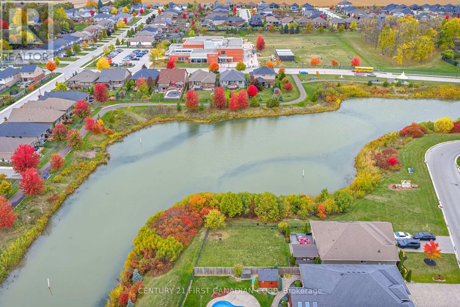 Welcome home to this fantastically positioned 3 Bedroom All-Brick Bungalow with Double Car Garage, on a RARE LOT backing onto Wye Creek Pond, right in the heart of the close-knit community of Thorndale. This home offers exceptional flow, including a spacious front foyer which leads to an open-concept floor plan, including an eat-in kitchen with tons of cupboard and counter space, together with an island and corner pantry, open to the eat-in area which overlooks picturesque views of the pond and stunning landscaping surrounding the walking trails. The dining area has a door out to the backyard deck and large fenced yard, views to enjoy while sipping your morning coffee, or host summer dinners on the deck with peace and ambiance. The main floor also showcases a vast living room area with a gas fireplace and trayed ceiling including pot lighting. The main floor is also complete with a large Primary Bedroom with 3PC ensuite, as well as two other main floor bedrooms and an additional 4PC washroom. The sprawling basement is unspoiled offering ample opportunity for another bedroom and a large family & rec room area, already framed or easily modified-plus tons of storage space! The lower level also features a good amount of sunlight with larger windows and the opportunity for another bathroom with an existing extra washroom rough-in. The water heater is owned. Thorndale offers quiet small town charm, with the convenience of being less than 15 mins to London city amenities. Excellent schools & parks in the area-just steps away from West Nissouri Public School. Garage fully insulated, as well as the garage door. Gas BBQ hook-up. (id:51300)