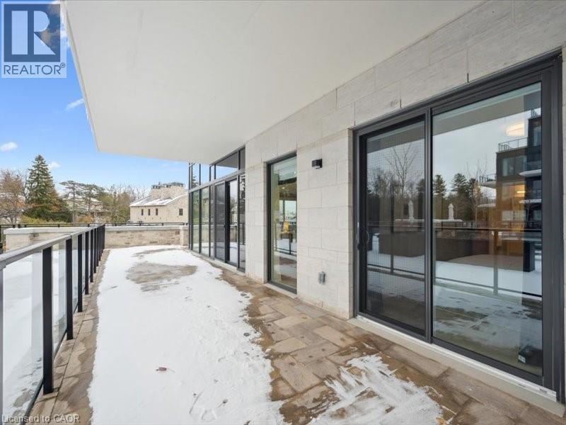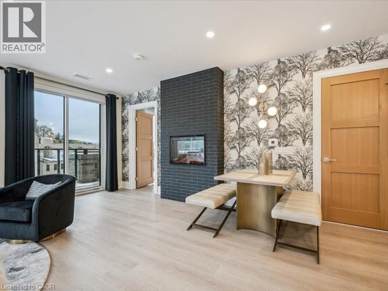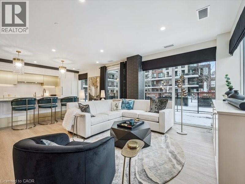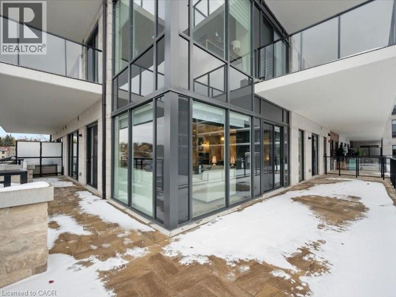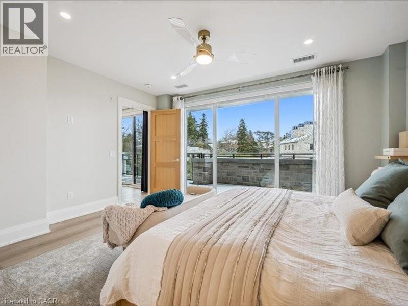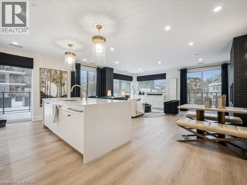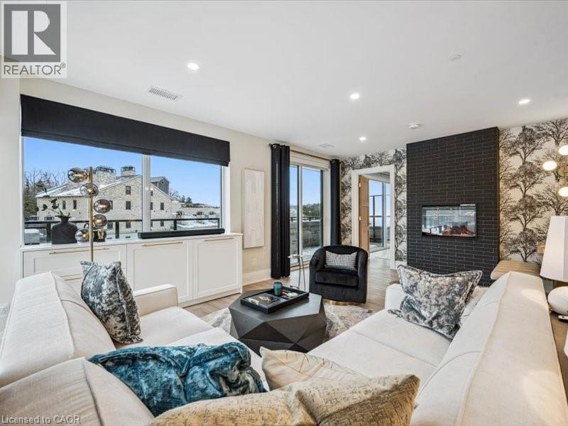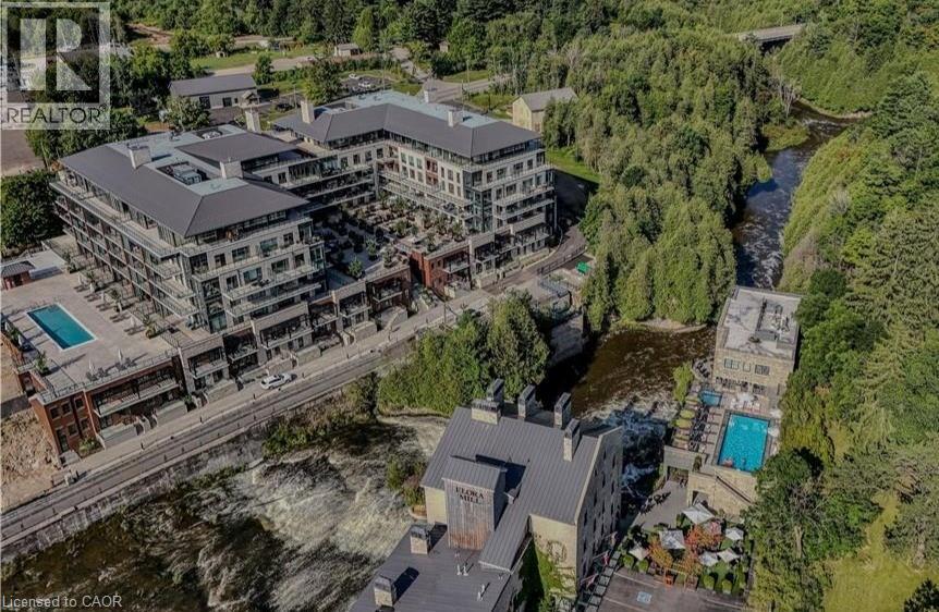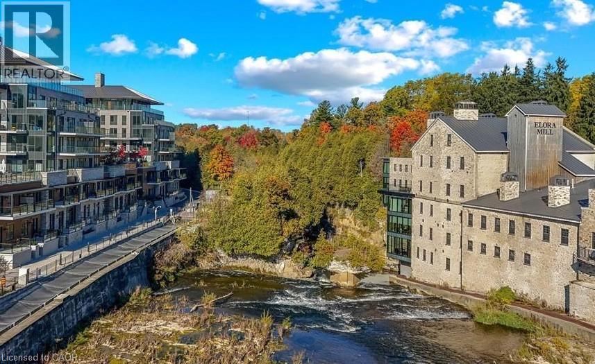Luxury Living at The Elora Mill Residences! Introducing a turn-key luxury, corner suite in one of the most prestigious locations in the region. Professionally designed and furnished (all included), this fantastic residence offers a bright, airy open-concept layout with wraparound floor-to-ceiling windows, with custom privacy screening, stunning views of the Grand River and the Elora Mill, with three walkouts to an extraordinary 734 sq ft private wraparound terrace! The expansive modern kitchen features custom cabinetry, a huge waterfall-edge island with seating, and top-tier appliances including KitchenAid and a Fisher & Paykel built-in fridge/freezer. A stylish dining area flows seamlessly into the living room, complete with an elegant fireplace feature. The luxurious primary suite offers a large walk-in closet + second closet, and a spa-inspired ensuite with heated floors, double vanity, walk-in shower, and soaker tub. A second bedroom and full bathroom (also with heated floors) make the perfect retreat for guests. Additional features include in-suite laundry (Whirlpool), electric custom blinds, EV parking, and a storage locker. Enjoy resort-style amenities: concierge, lobby coffee bar, residents’ lounge, private dining room, gym, yoga studio, fire-pit patios, and a spectacular outdoor pool and sun deck. Steps to Elora’s shops, cafés, restaurants, trails, and parks, this rare ground-level suite with walkout terrace delivers unmatched luxury, convenience, and views - a truly exceptional offering in the heart of Elora. (id:51300)