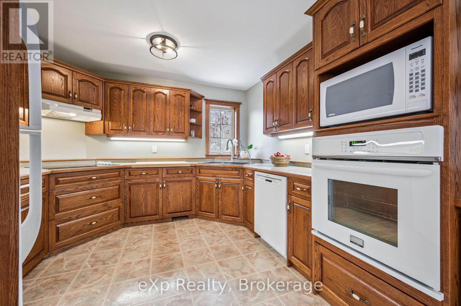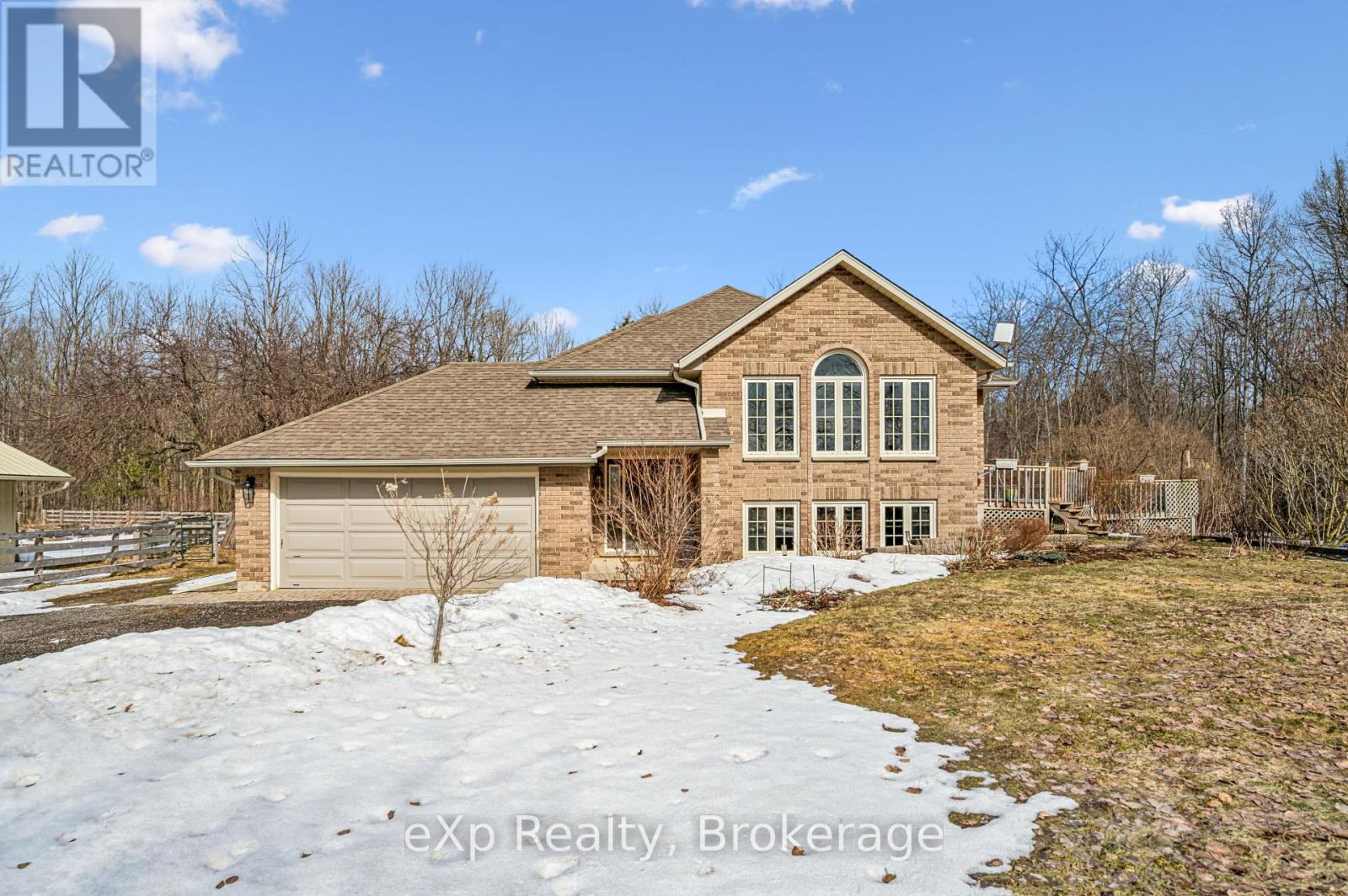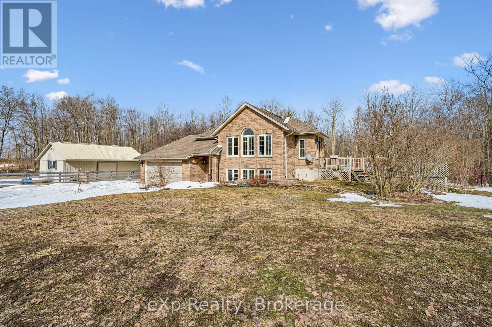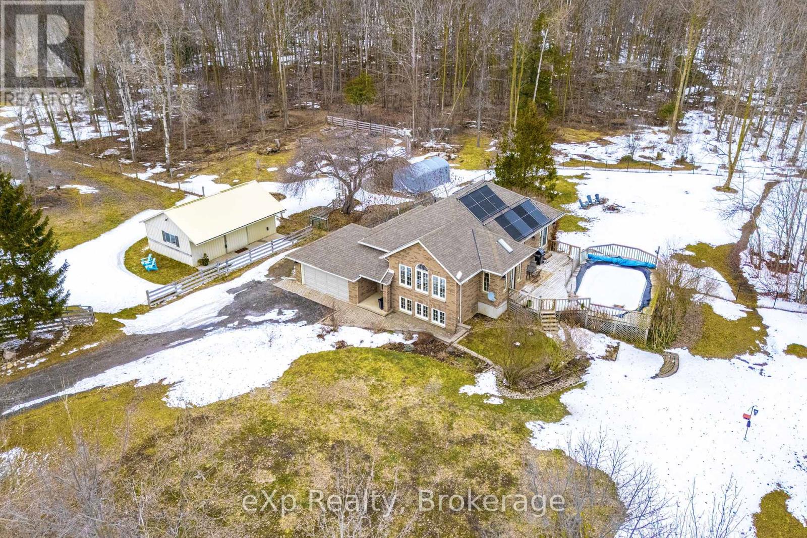 Set on a picturesque 15.28-acre parcel, 6737 Jones Baseline offers an exceptional opportunity to enjoy the best of rural living as a private retreat or hobby farm, all just 5 minutes to groceries and everyday amenities, and a short drive to downtown Fergus and Elora. Located on a quiet dead-end road, the setting is peaceful and private. This quality-built, meticulously maintained home offers over 2,400 sq ft of finished living space. Approx. 3 acres are cleared and manicured with three fully fenced and gated paddocks and a 30 x 20 ft barn with two stalls and storage/feeding room. The remaining ~12 acres offer a mature, scenic forest with groomed, flat trails ideal for walking or riding. The grounds include a garden shed, space for growing your own produce, apple and pear trees, and a mix of maples for beautiful fall colour. Inside, the home features a bright main floor with a vaulted great room with stunning sunset views, open-concept kitchen and dining, and large windows that fill the space with natural light. A walkout from the dining area leads to the deck, ideal for entertaining. The main level offers three bedrooms and a well-appointed bathroom with a generous linen closet. The fully finished basement with a separate entrance adds versatility with two additional bedrooms, a full bathroom, and a cozy fireplace, ideal for extended family or in-law potential. Outside, enjoy an above-ground pool heated by owned solar panels, plus a fully fenced backyard. Updates include bedroom carpets (2025), water filtration and RO systems (2023), central vac (2023), water softener (2023), interior/exterior lighting (2024), driveway resurfaced (2024), new well pump (2024), septic pumped (2025), filters replaced (2026), and UV light (2025). Bell TV and high-speed internet are available. A rare blend of lifestyle, privacy, and convenience. (id:51300)