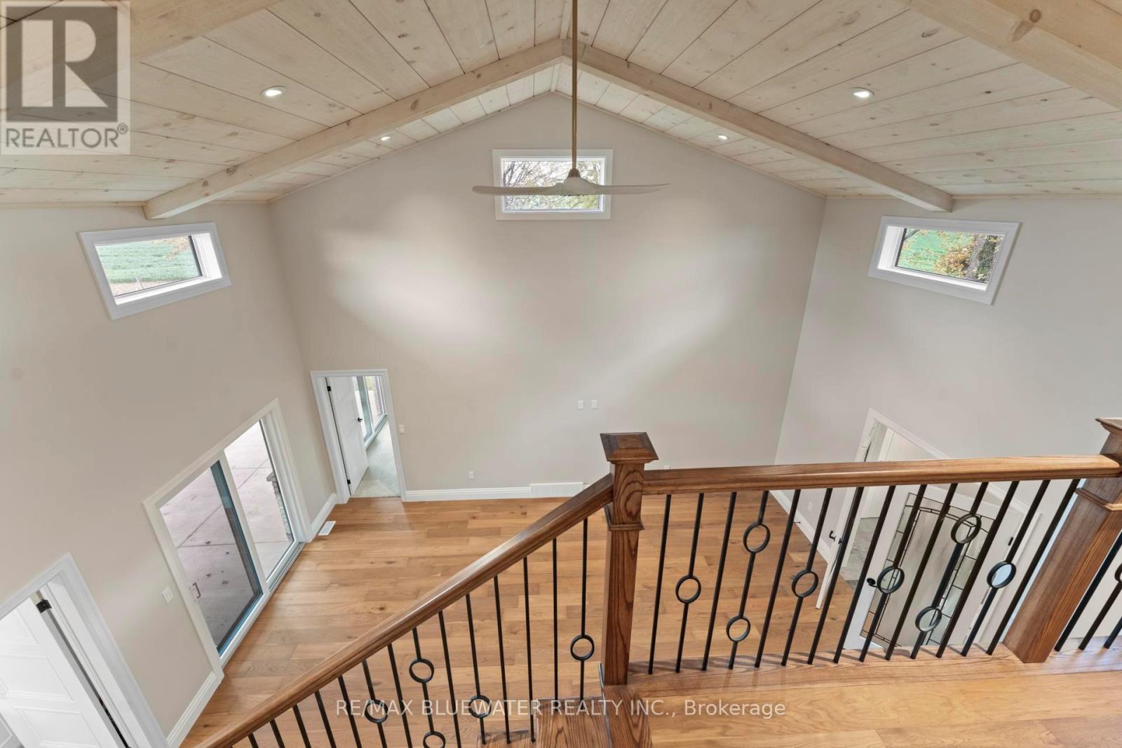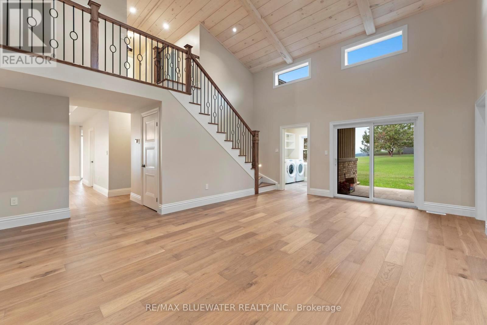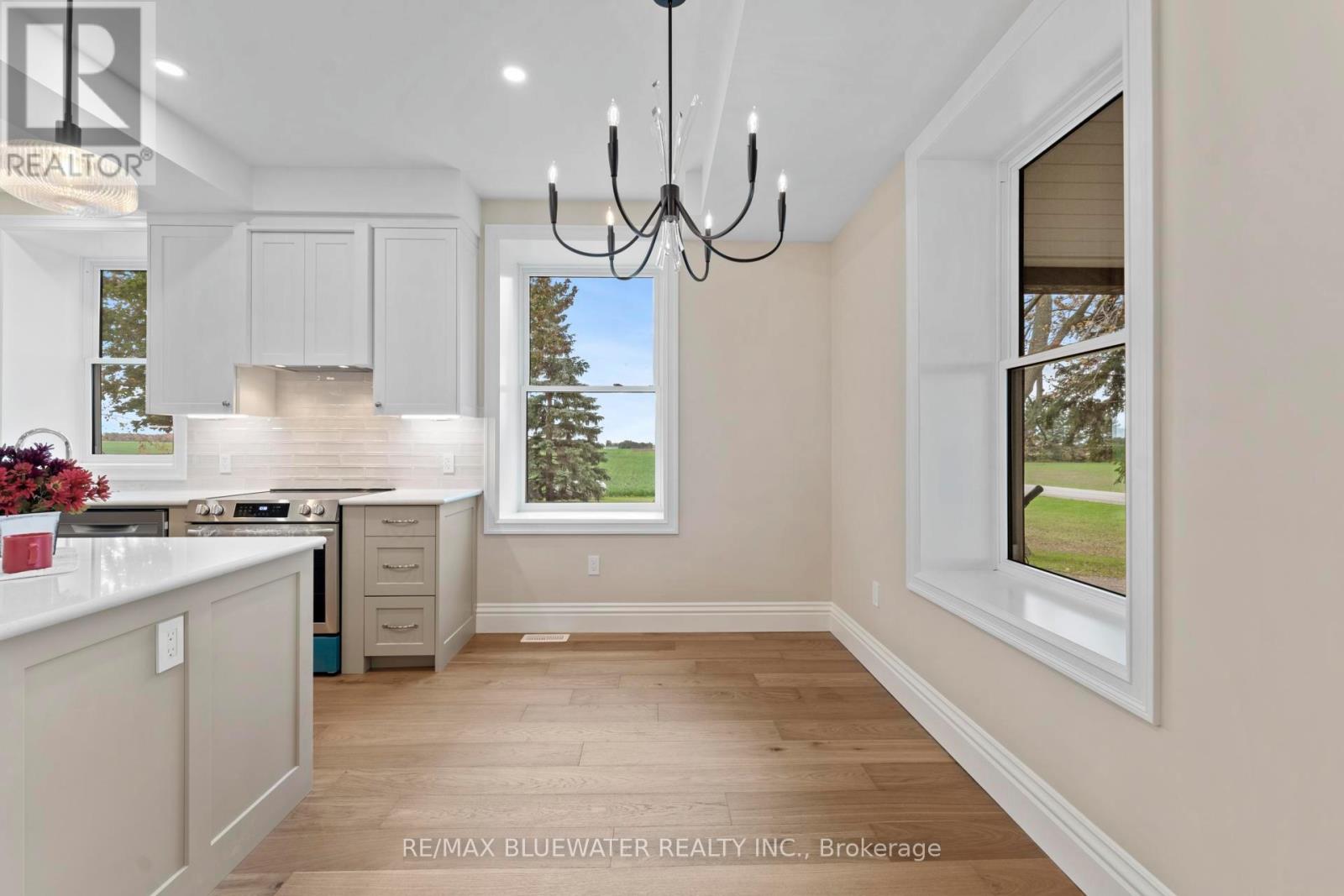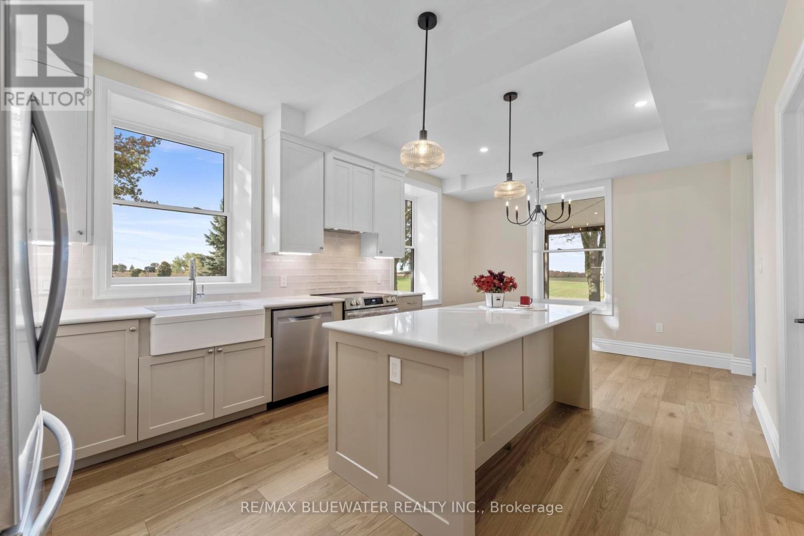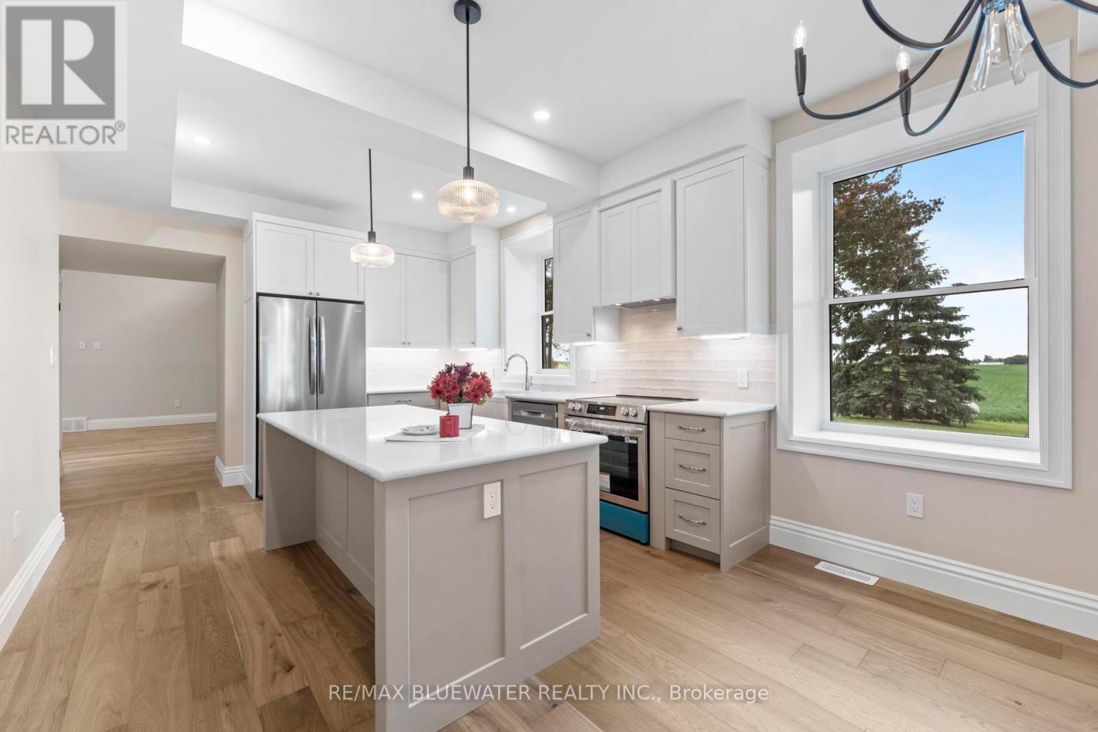 Experience refined country living in this fully renovated brick estate, where modern sophistication meets timeless elegance. Set on a show-stopping 1.6-acre lot, this home has been meticulously redesigned with an uncompromising commitment to quality and style-no detail has been overlooked. Featuring three spacious bedrooms and two and a half luxurious bathrooms, the residence offers a main-level primary suite with a spa-inspired five-piece ensuite, a four-piece bath upstairs, and a stylish two-piece powder room for guests. The lower level provides flexibility for additional bedrooms and a bathroom if desired, and includes a drywalled recreation space ready to finish to your personal taste. The gourmet eat-in kitchen is a true showpiece, adorned with quartz countertops, new high-end appliances, custom cabinetry and finishes, and a spacious pantry. Just beyond, the inviting living room centers around a charming fireplace and features an elegant coffered ceiling, creating the perfect ambiance for both quiet evenings and sophisticated entertaining. The mudroom adds everyday convenience and leads into the jaw-dropping great room, showcasing hardwood floors, 18-foot shiplap cathedral ceilings, and a stunning custom staircase. The main-floor laundry room is equally impressive-spacious, functional, and beautifully designed. No detail has been spared: a new septic system, drilled well, metal roof, furnace, central air, insulation, and fully updated mechanical systems-among many other improvements-ensure total comfort and peace of mind. Step outside to your covered front porch, finished with durable composite decking, and enjoy serene views of Lake Huron shimmering on the horizon. Whether you're sipping coffee at sunrise or hosting guests at sunset, the setting is truly breathtaking. Located just minutes from Bayfield, this home offers the perfect blend of tranquility, luxury, and convenience. Discover where elegance meets the countryside-schedule your private tour today. (id:51300)
